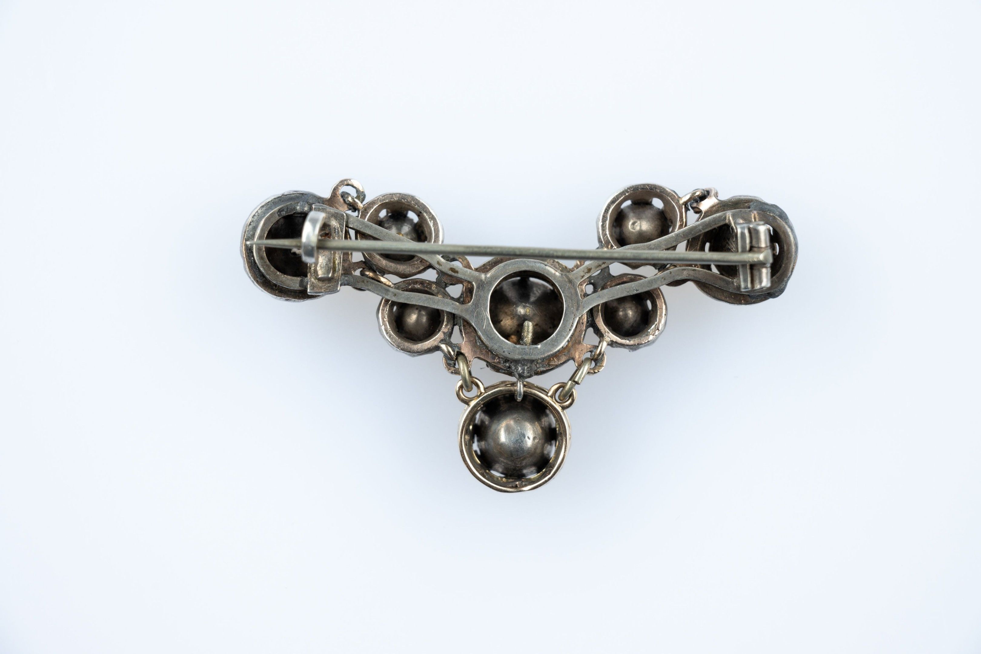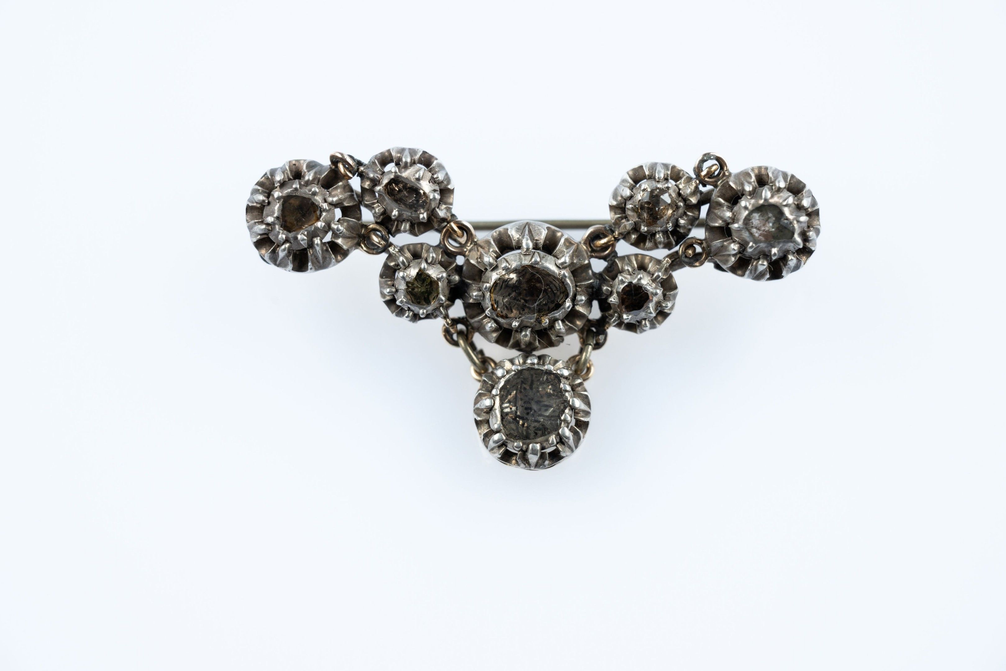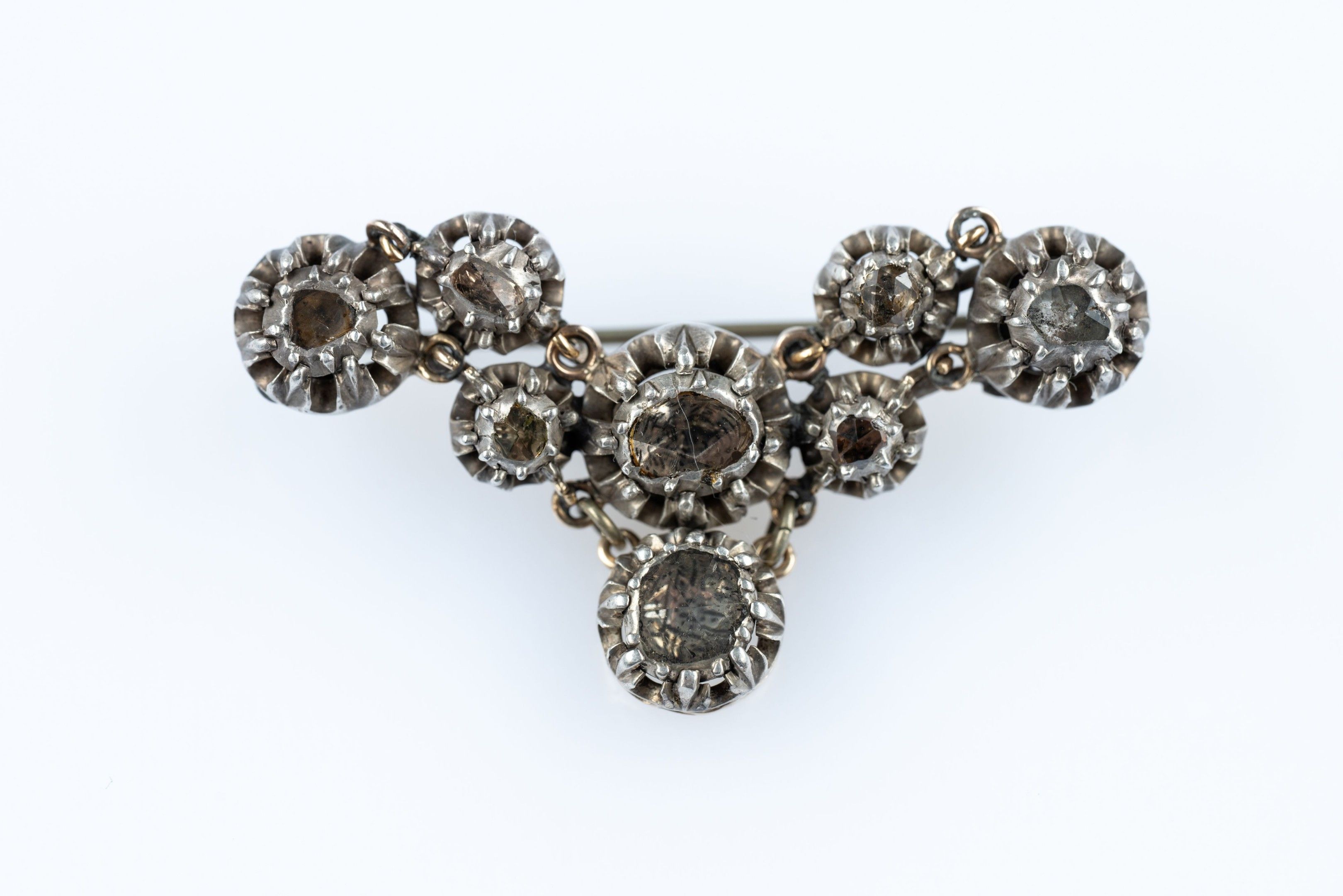 Silver and 18k (750 thousandths) yellow gold brooch set with eight rose-cut diamonds.