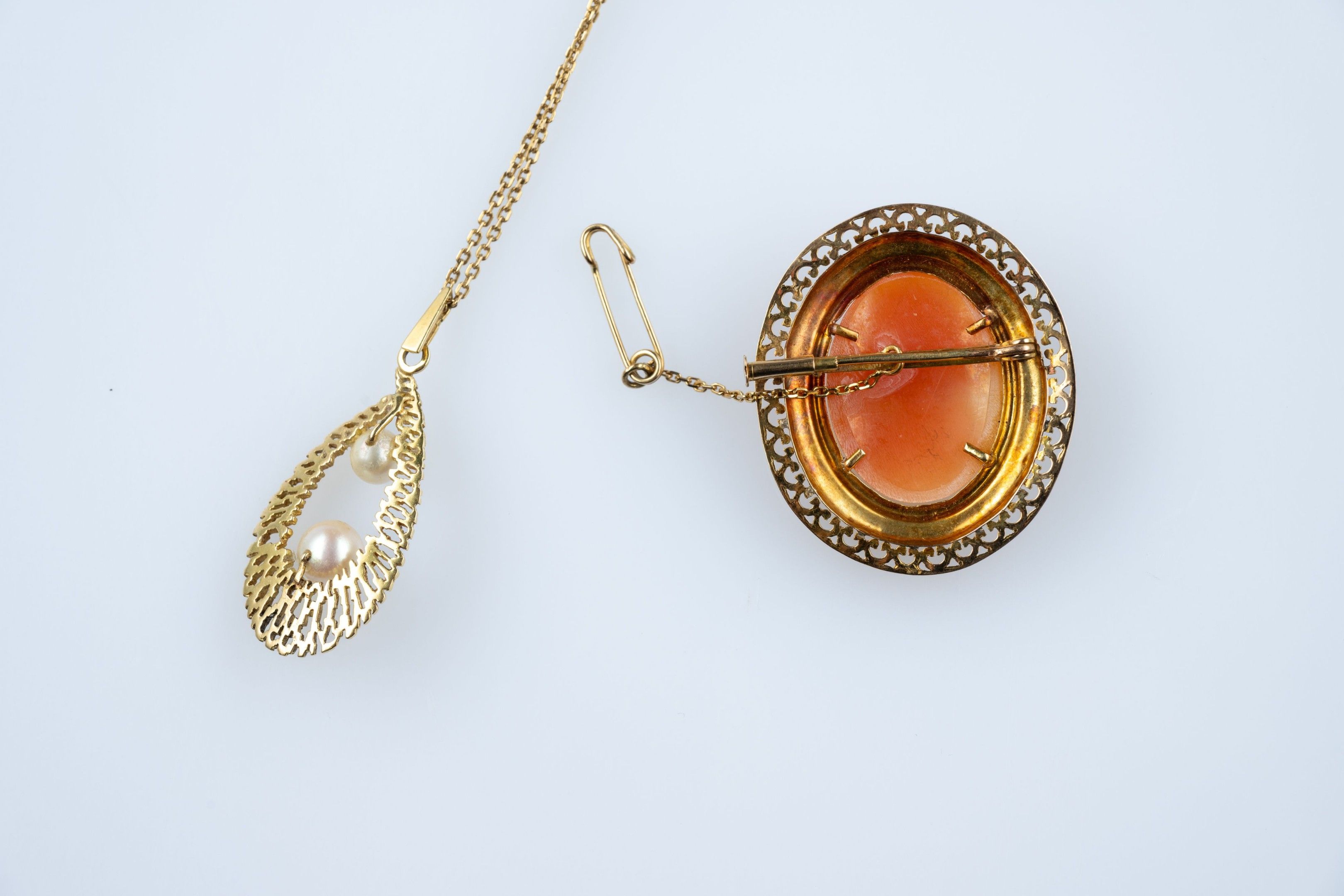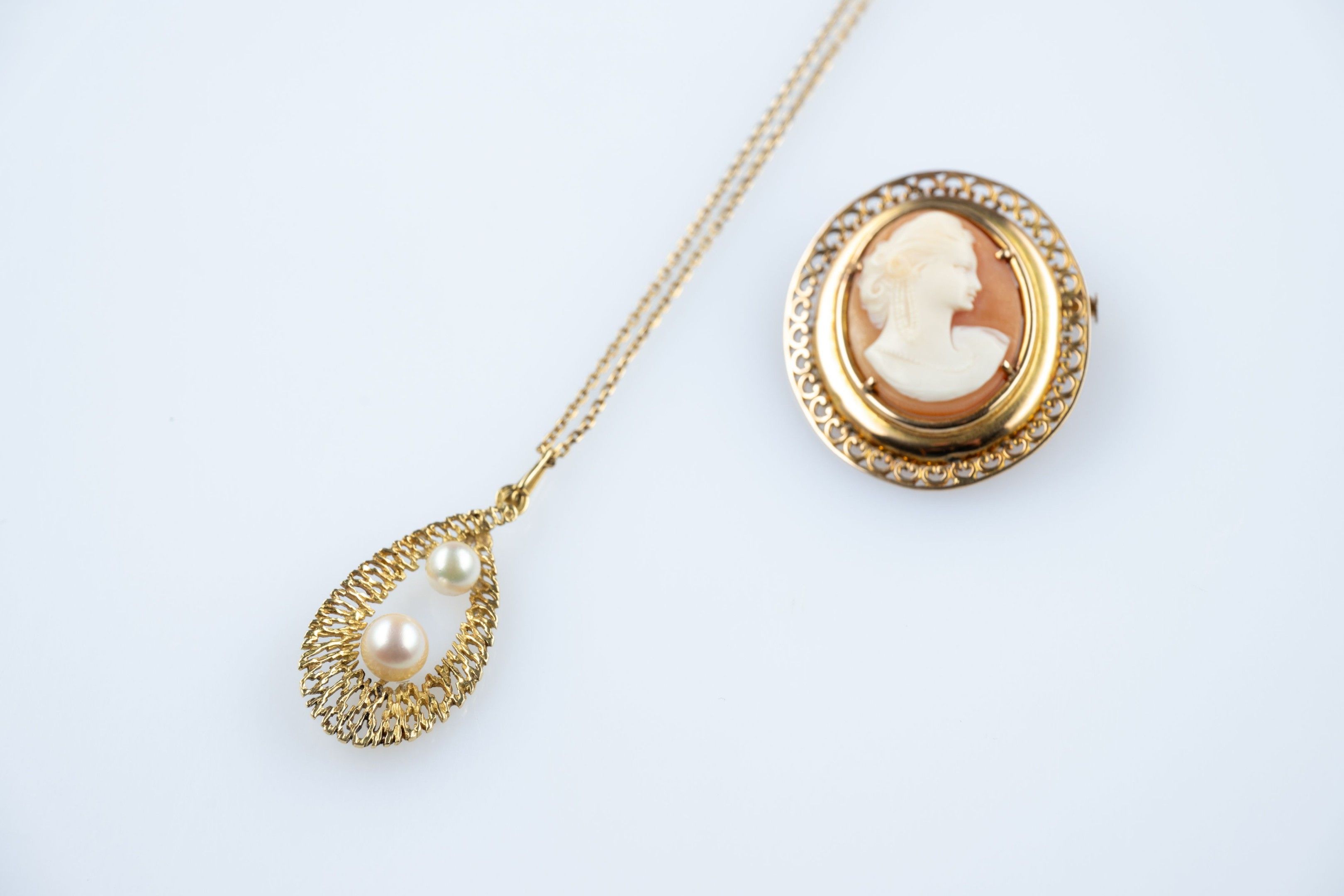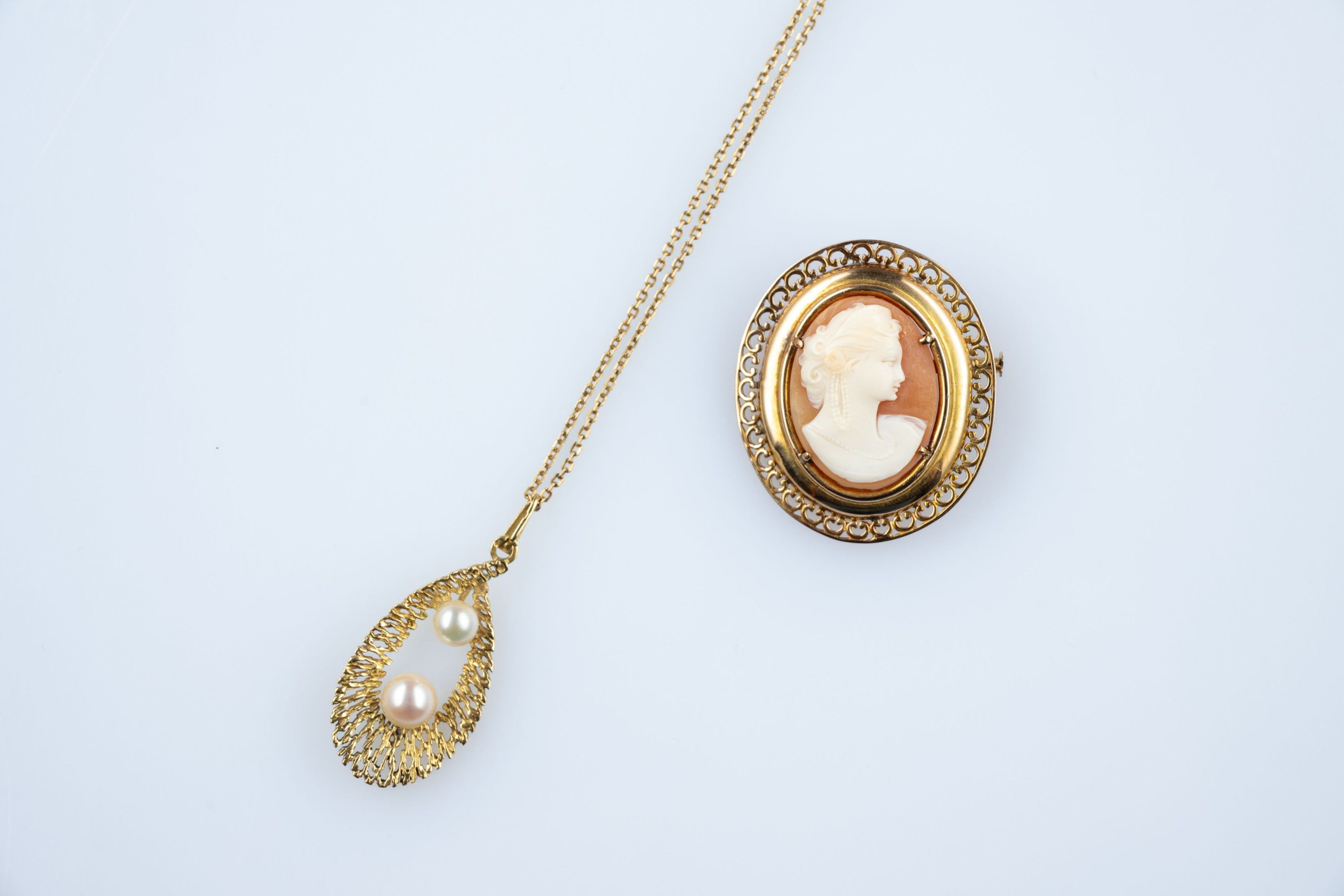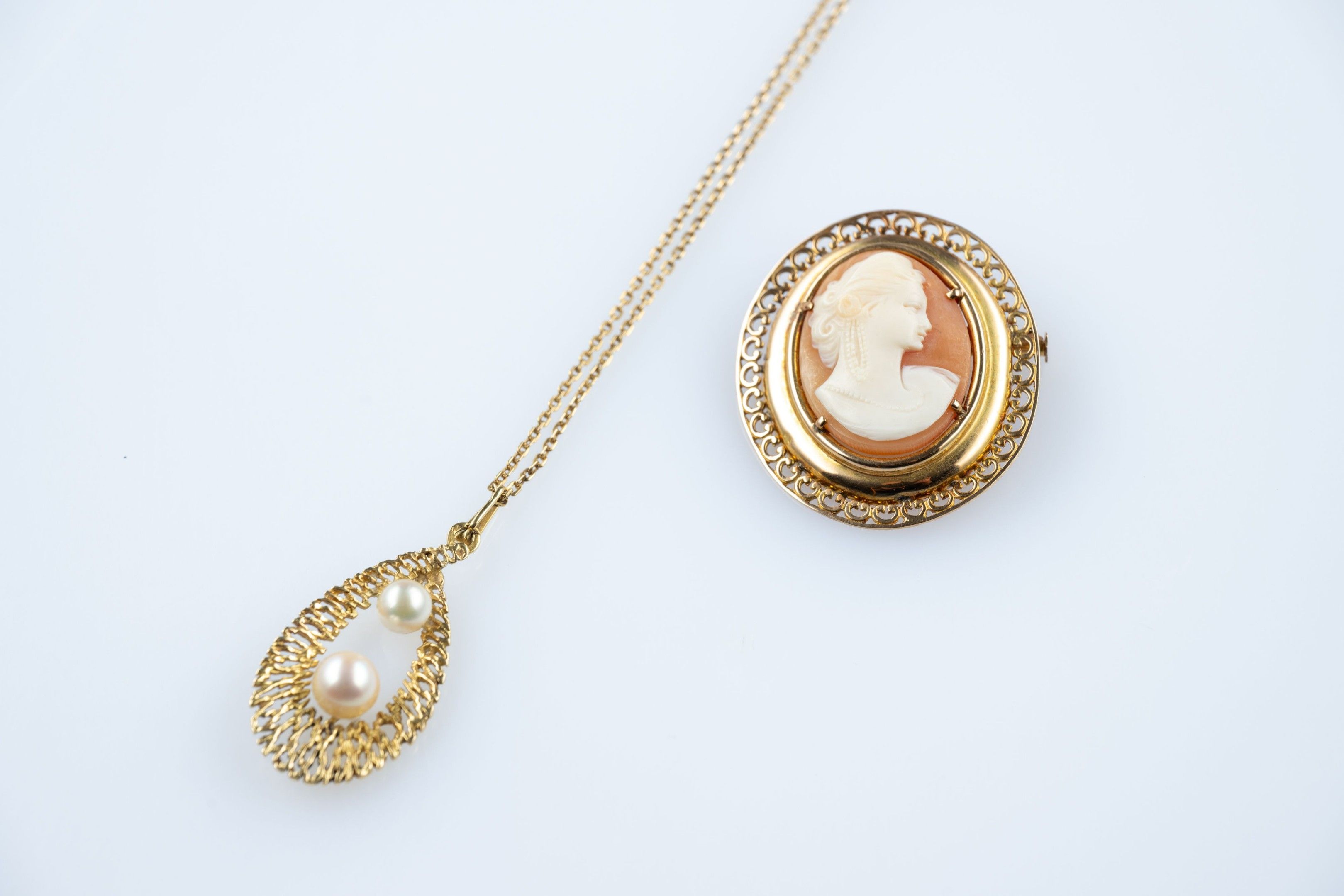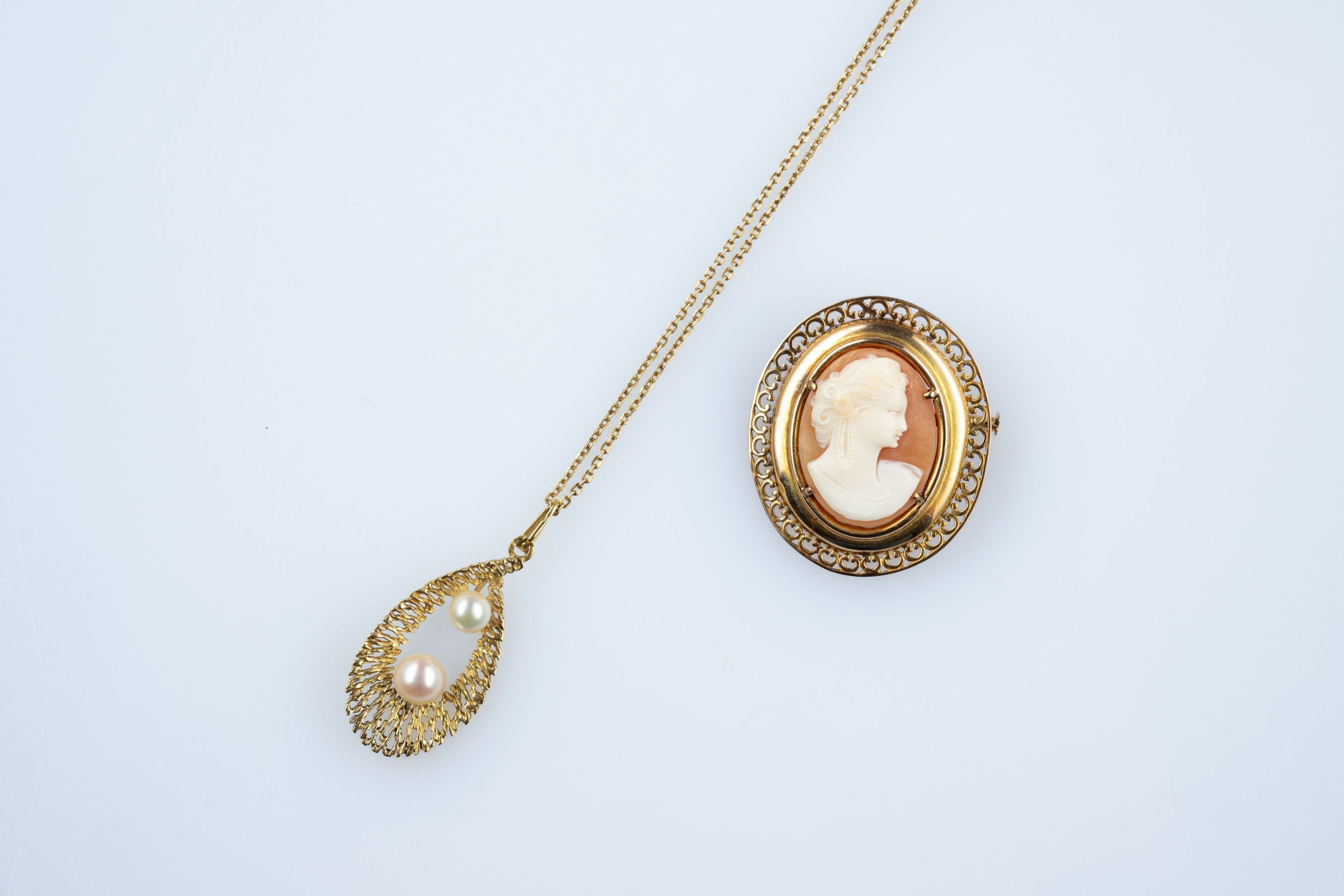 An 18k (750 thousandths) yellow gold openwork brooch holding a shell cameo depicting a female profile.