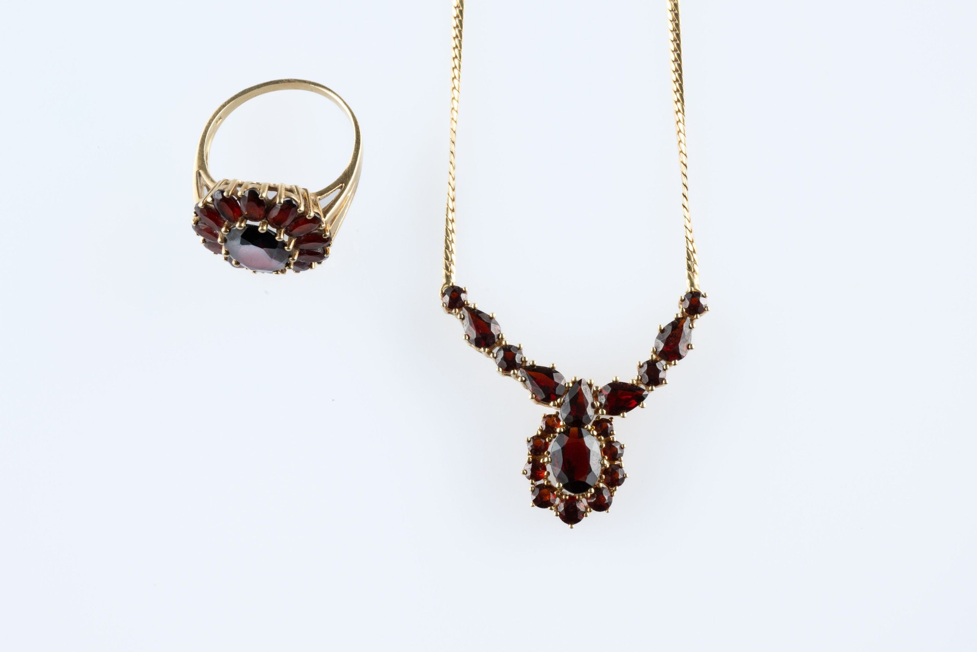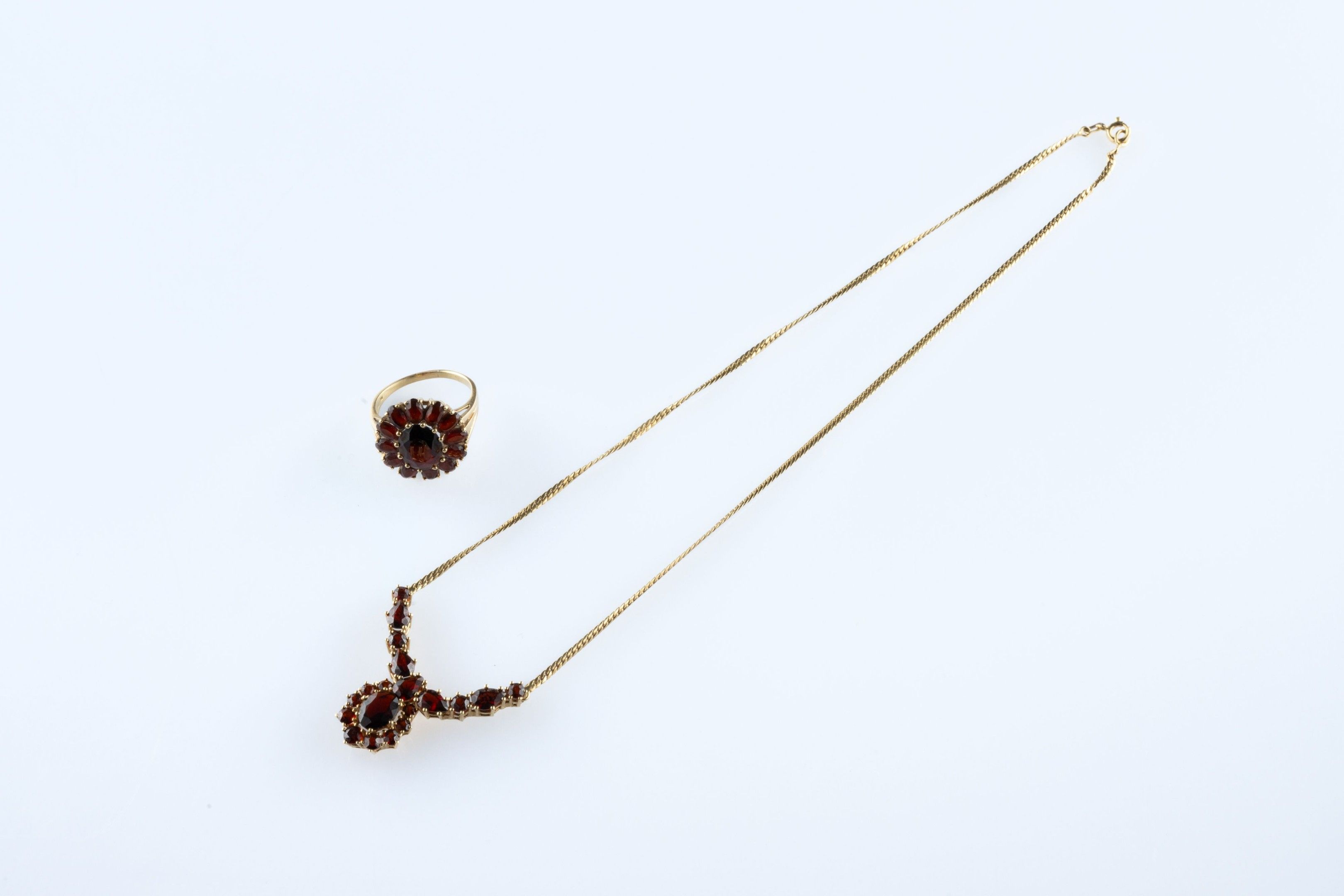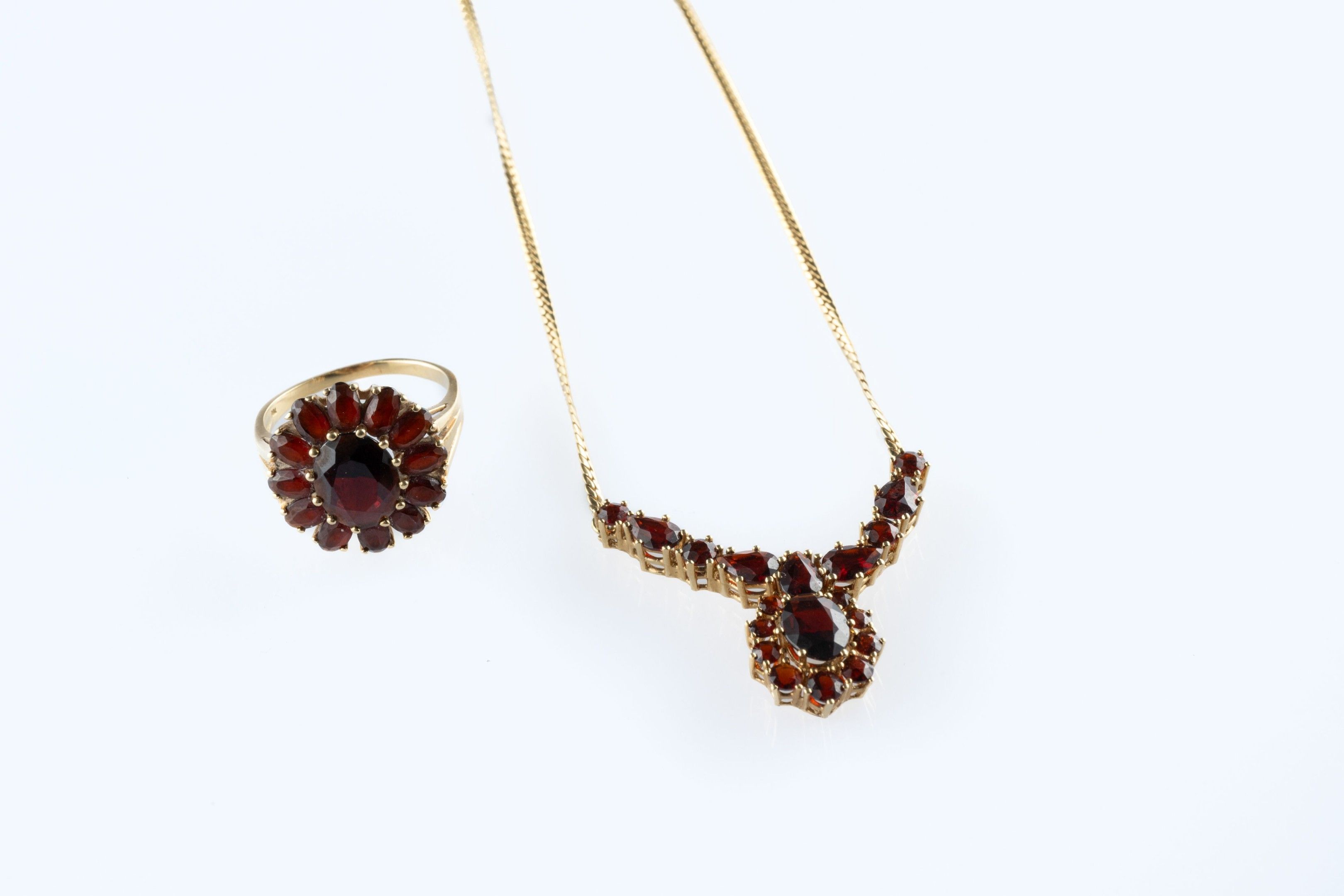 Set in 18k (750 thousandths) yellow gold studded with faceted garnets, comprising a daisy ring and a necklace centred on a collar holding a pendant daisy.