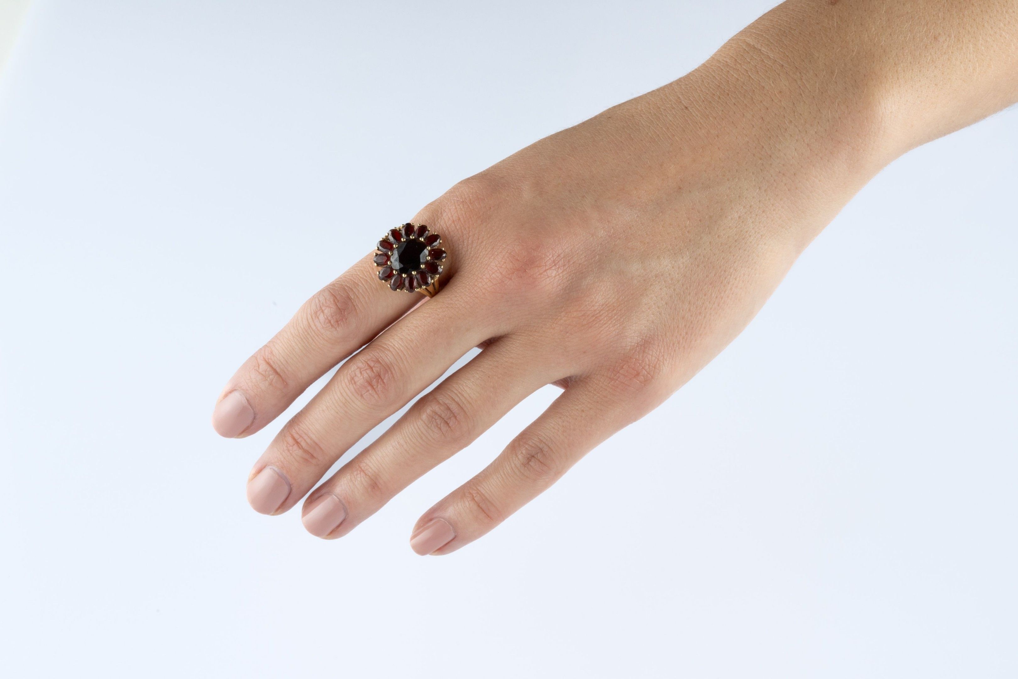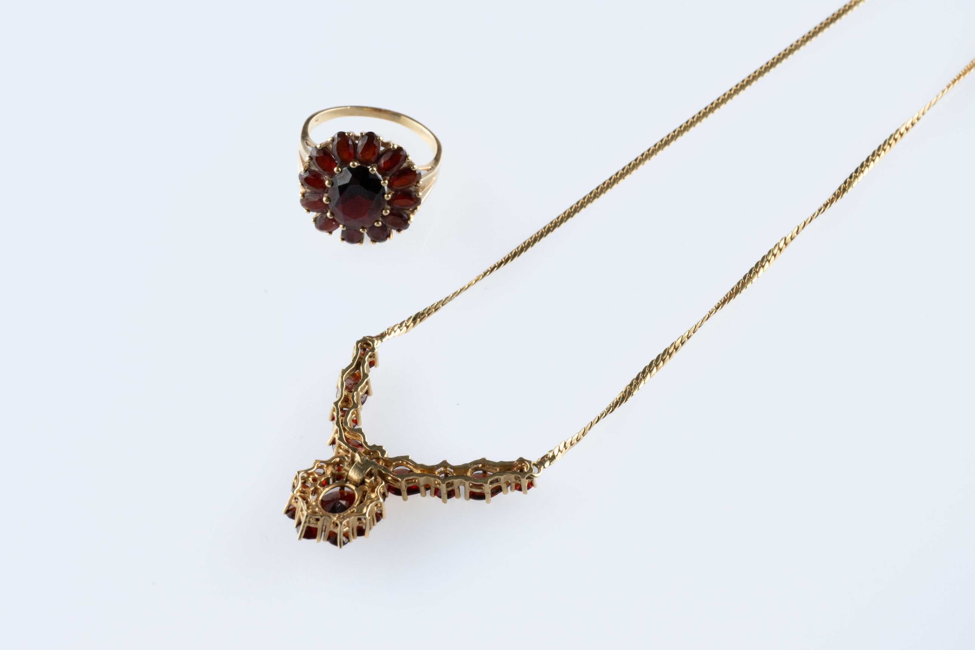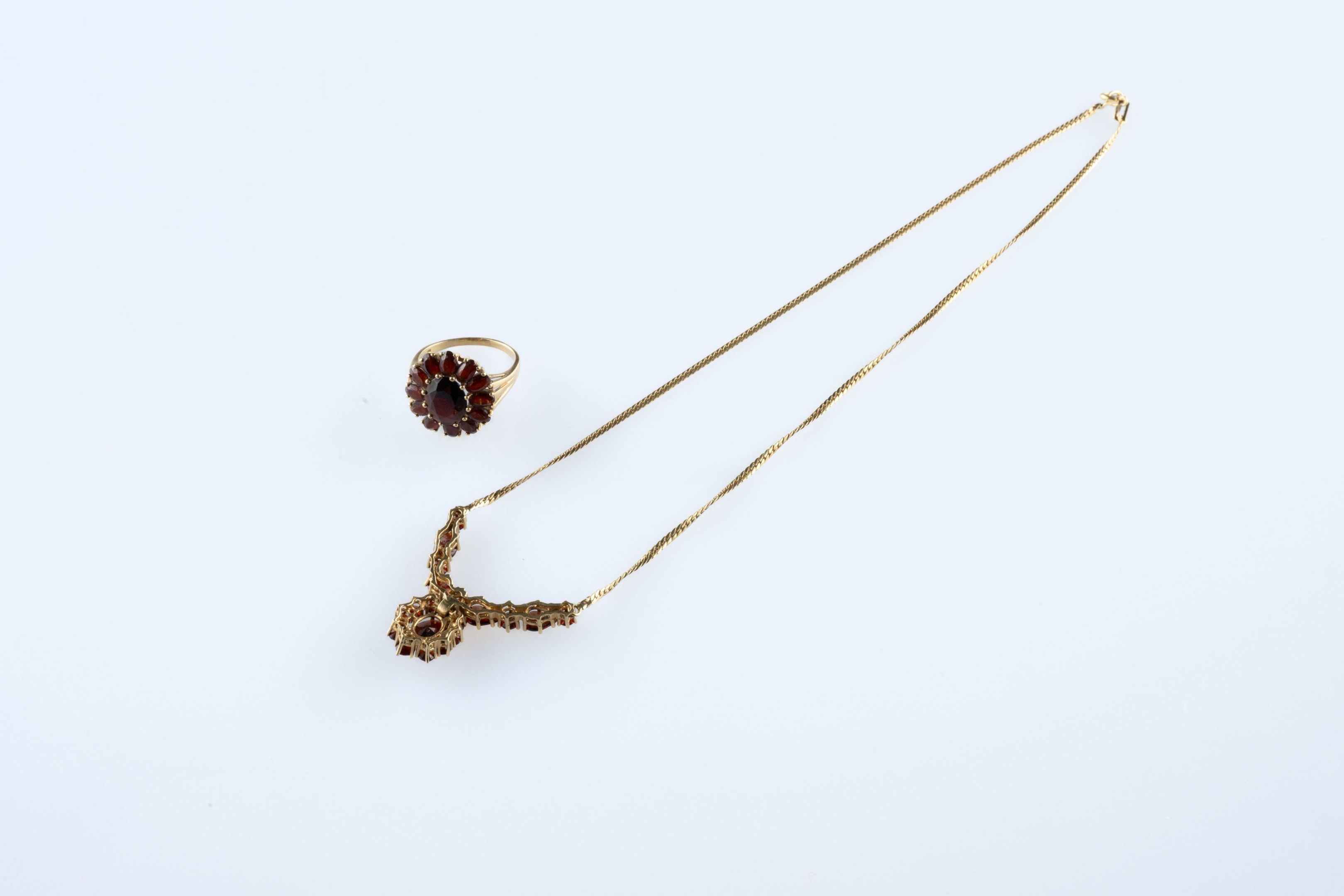 Set in 18k (750 thousandths) yellow gold studded with faceted garnets, comprising a daisy ring and a necklace centred on a collar holding a pendant daisy.