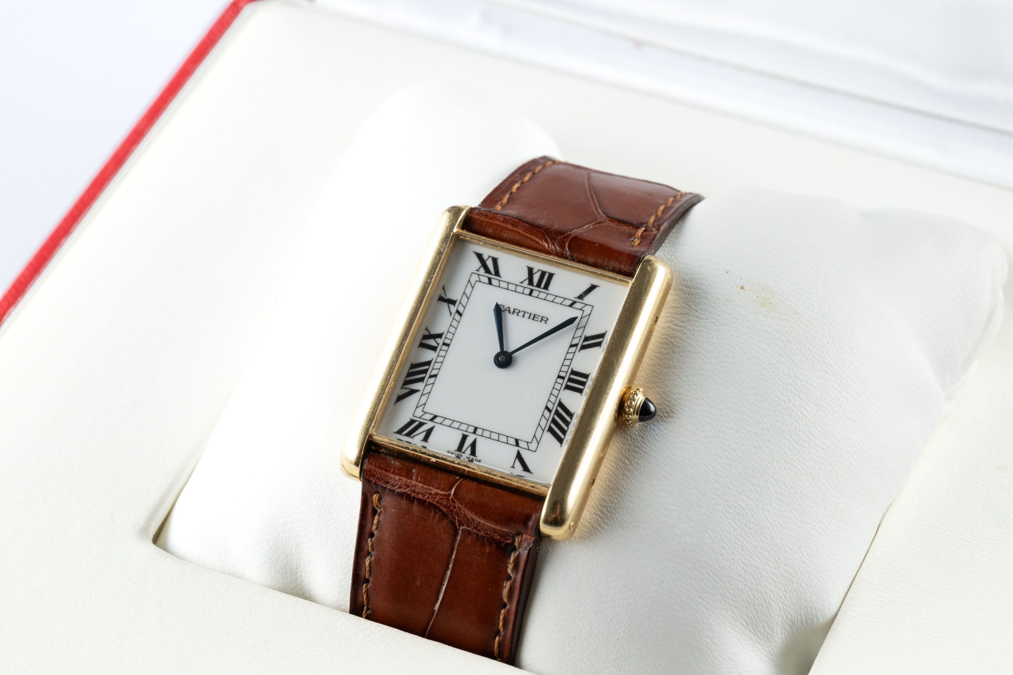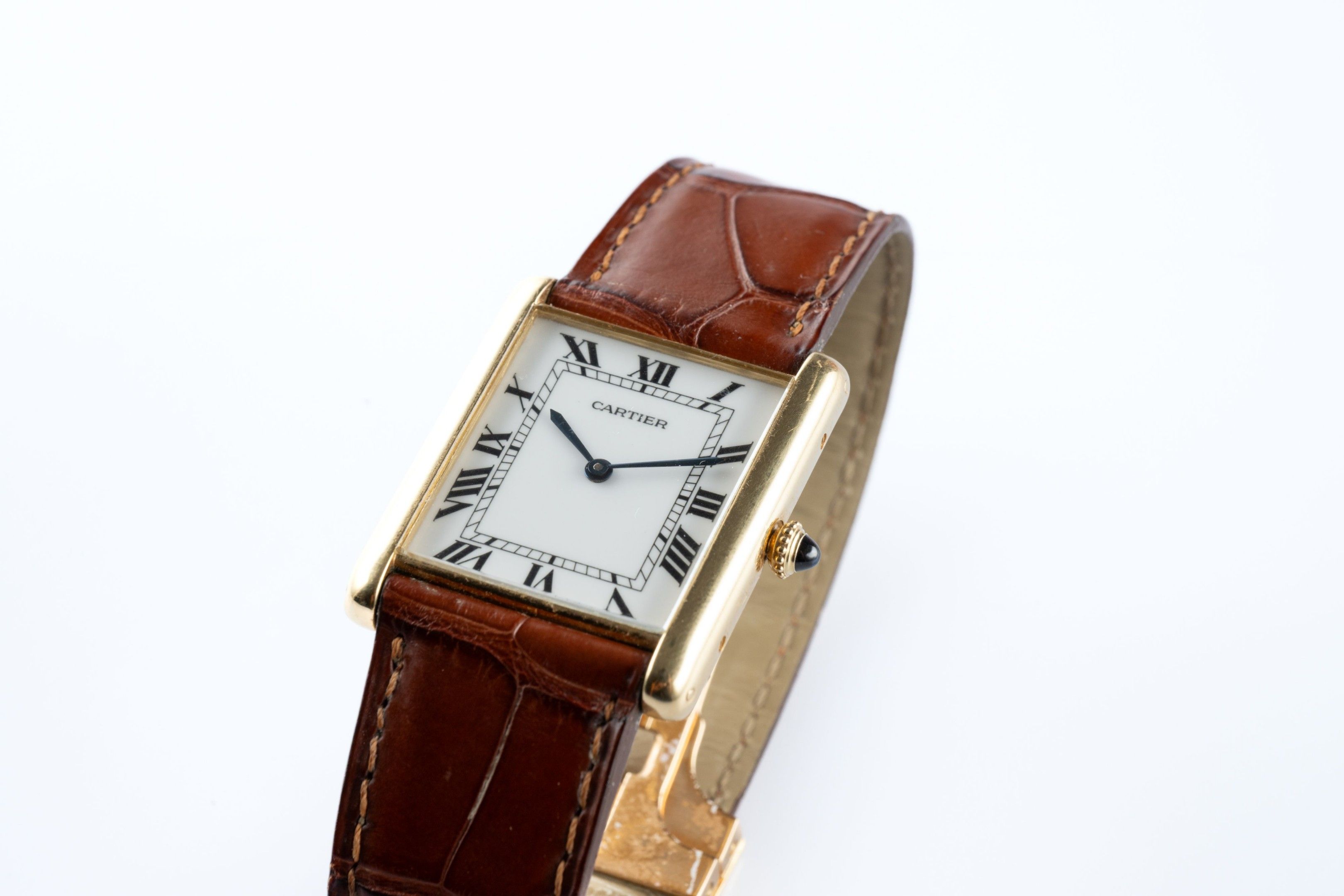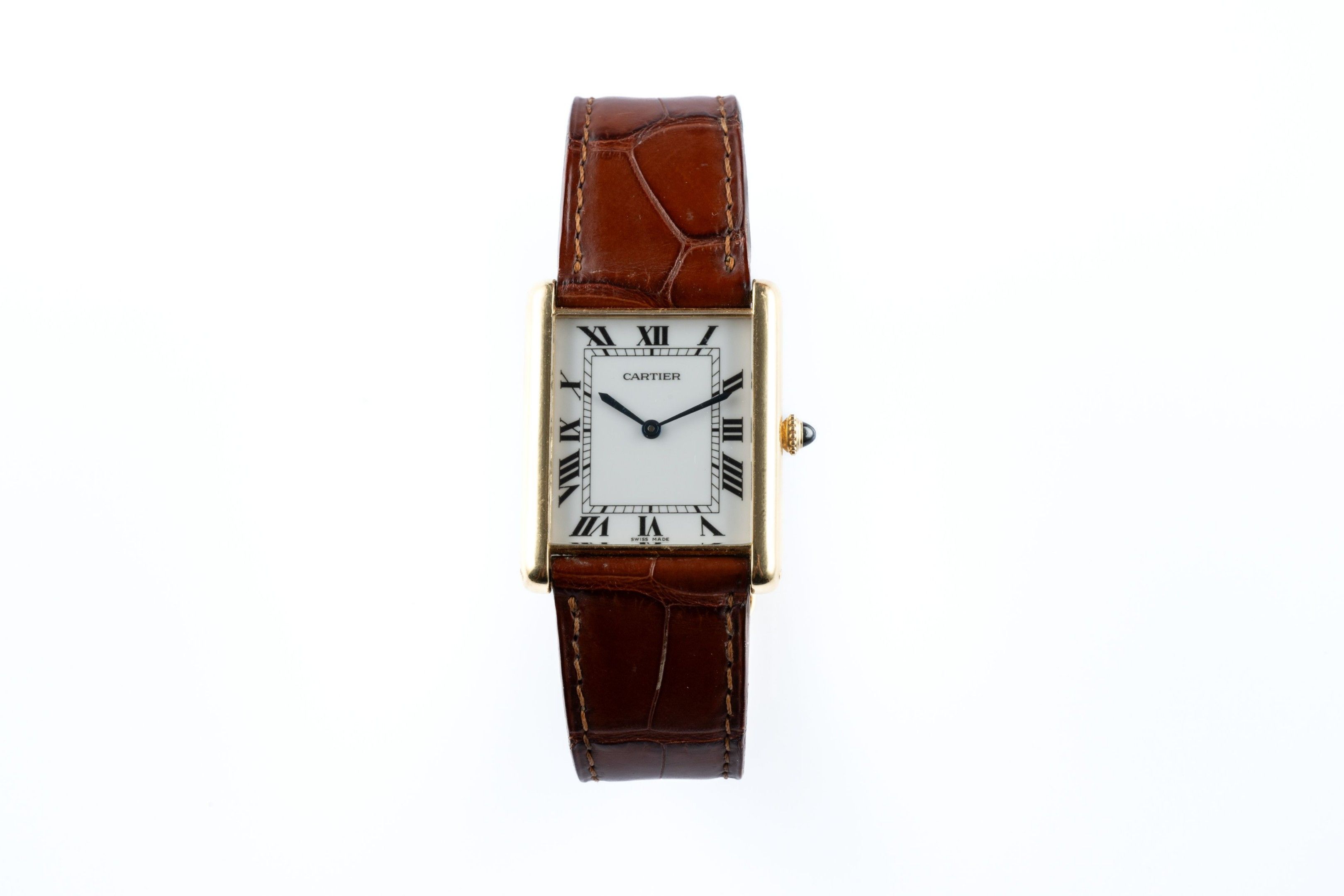 Tank Jumbo" wristwatch, rectangular case in 18k (750 thousandths) yellow gold, white dial showing the hours in Roman numerals. The winding mechanism is set with a blue stone cabochon. Cartier leather strap and original gold folding clasp.