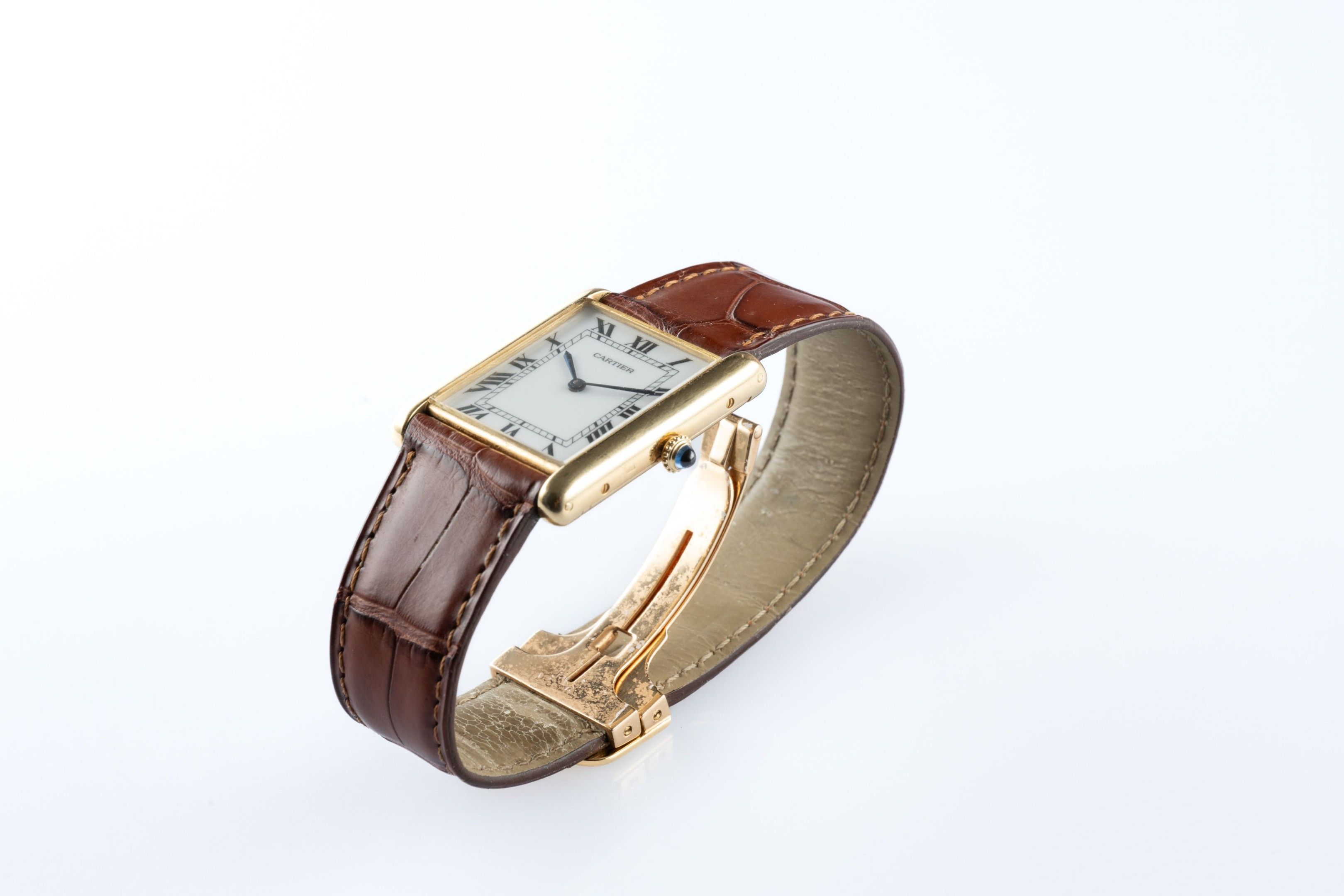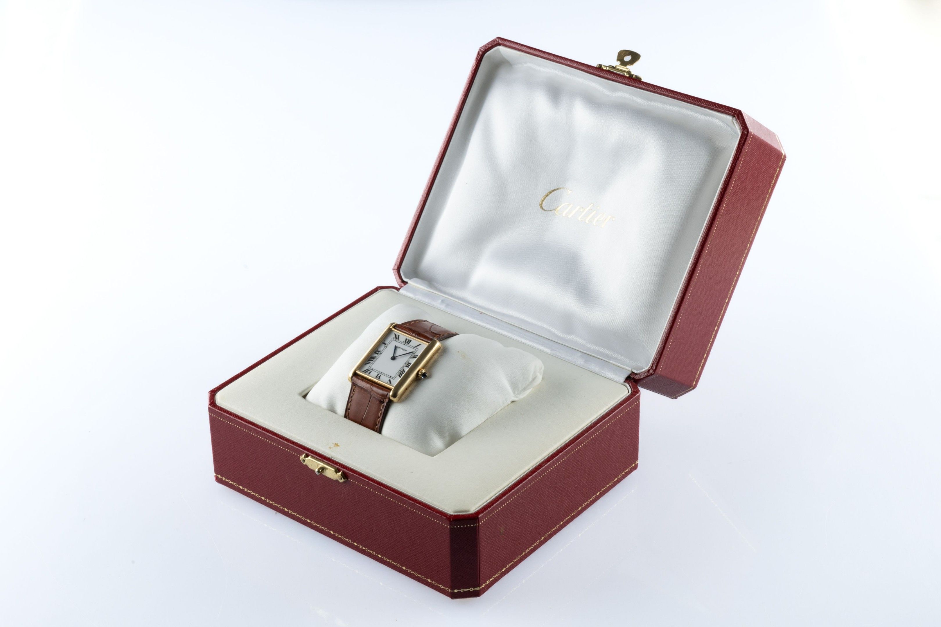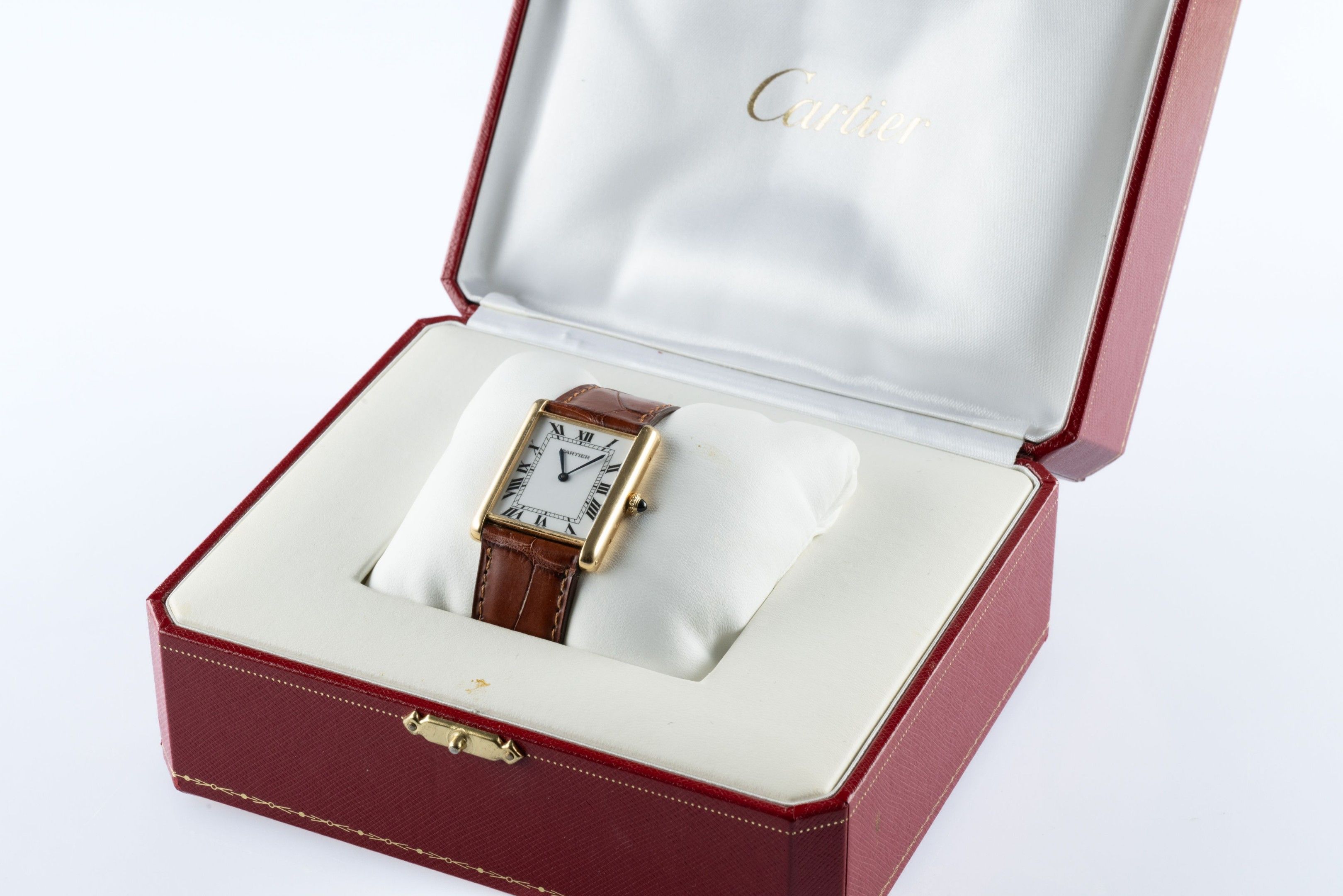 Premium CARTIER. Tank Jumbo" wristwatch, rectangular case in 18k (75…