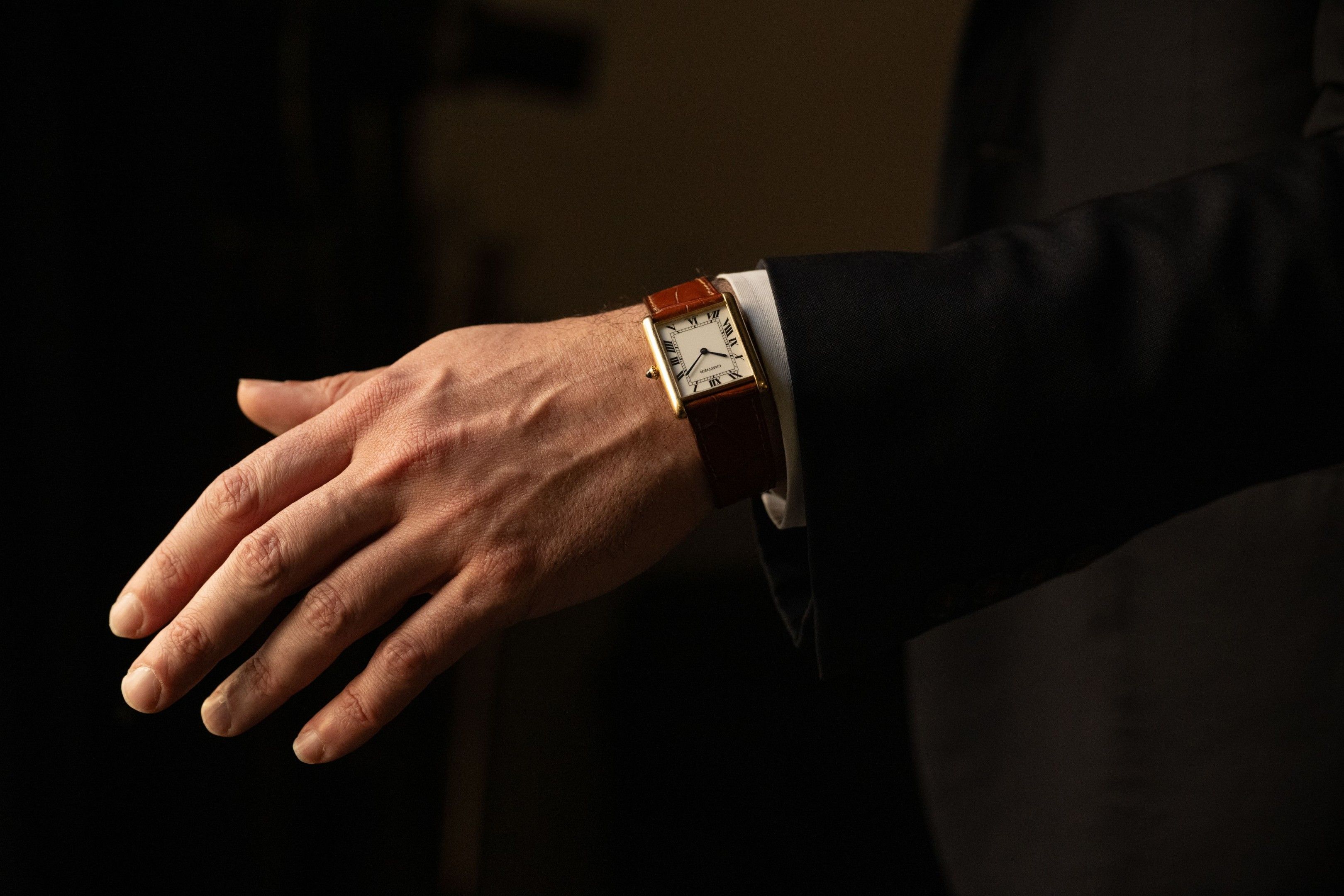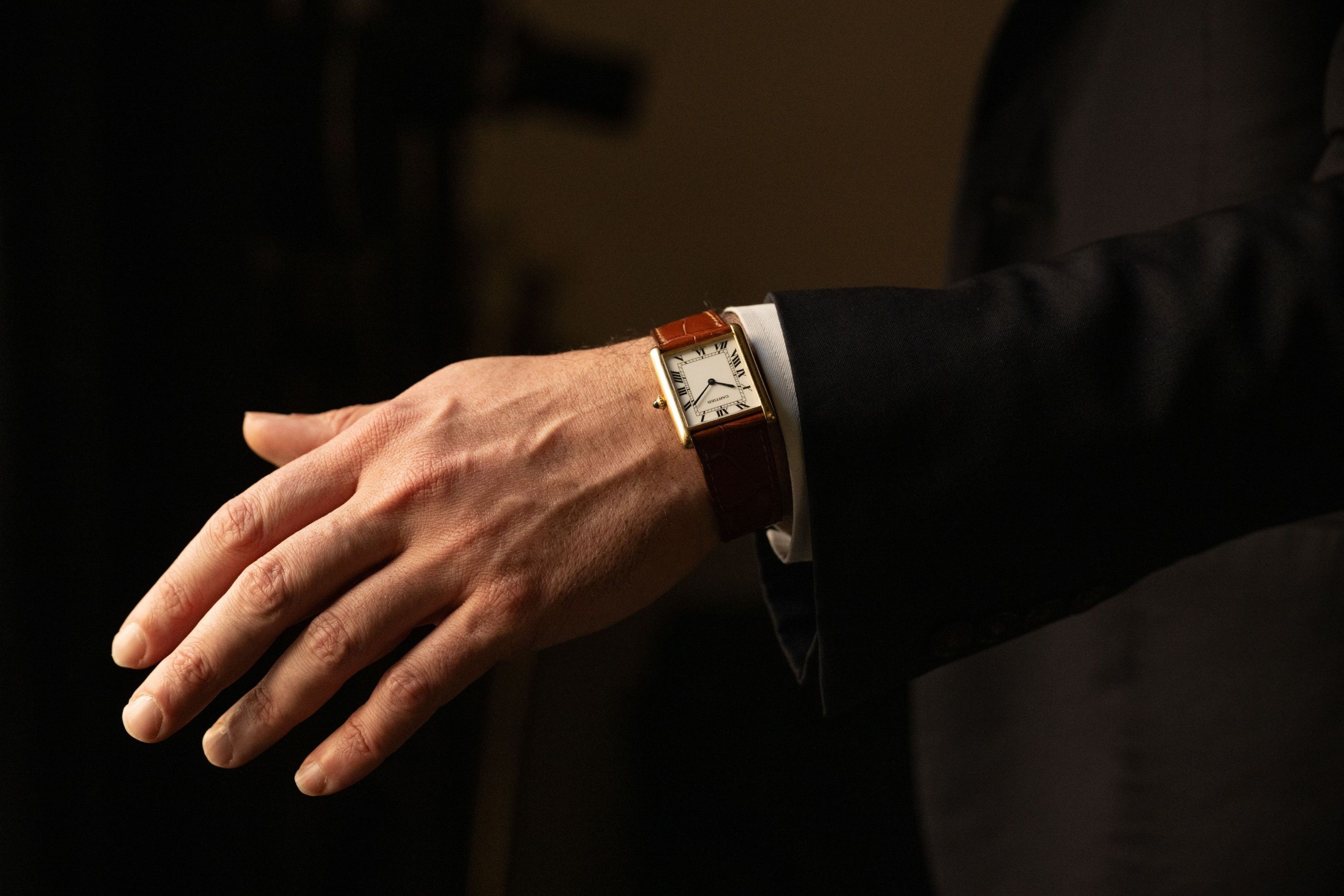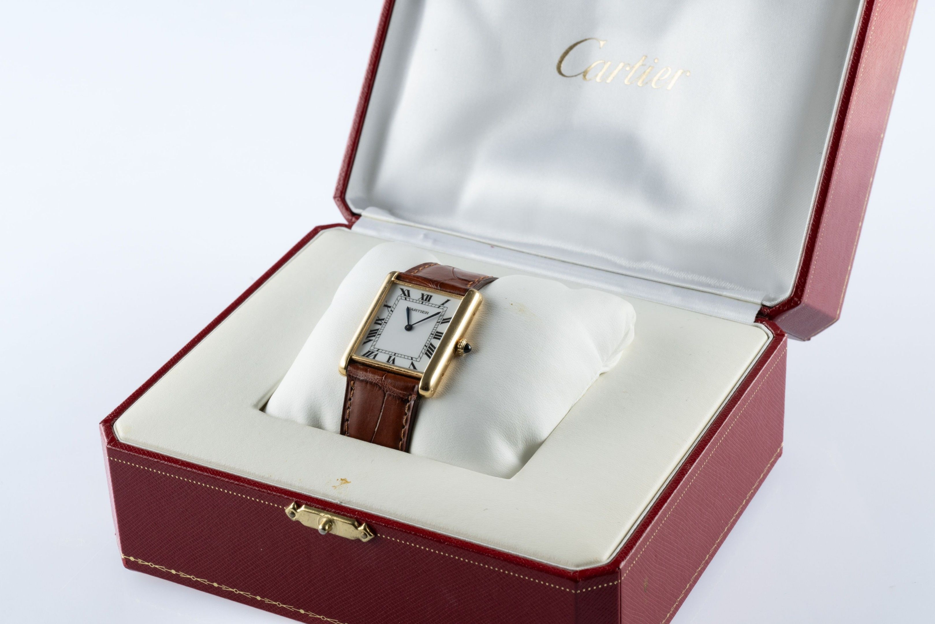 Premium CARTIER. Tank Jumbo" wristwatch, rectangular case in 18k (75…
