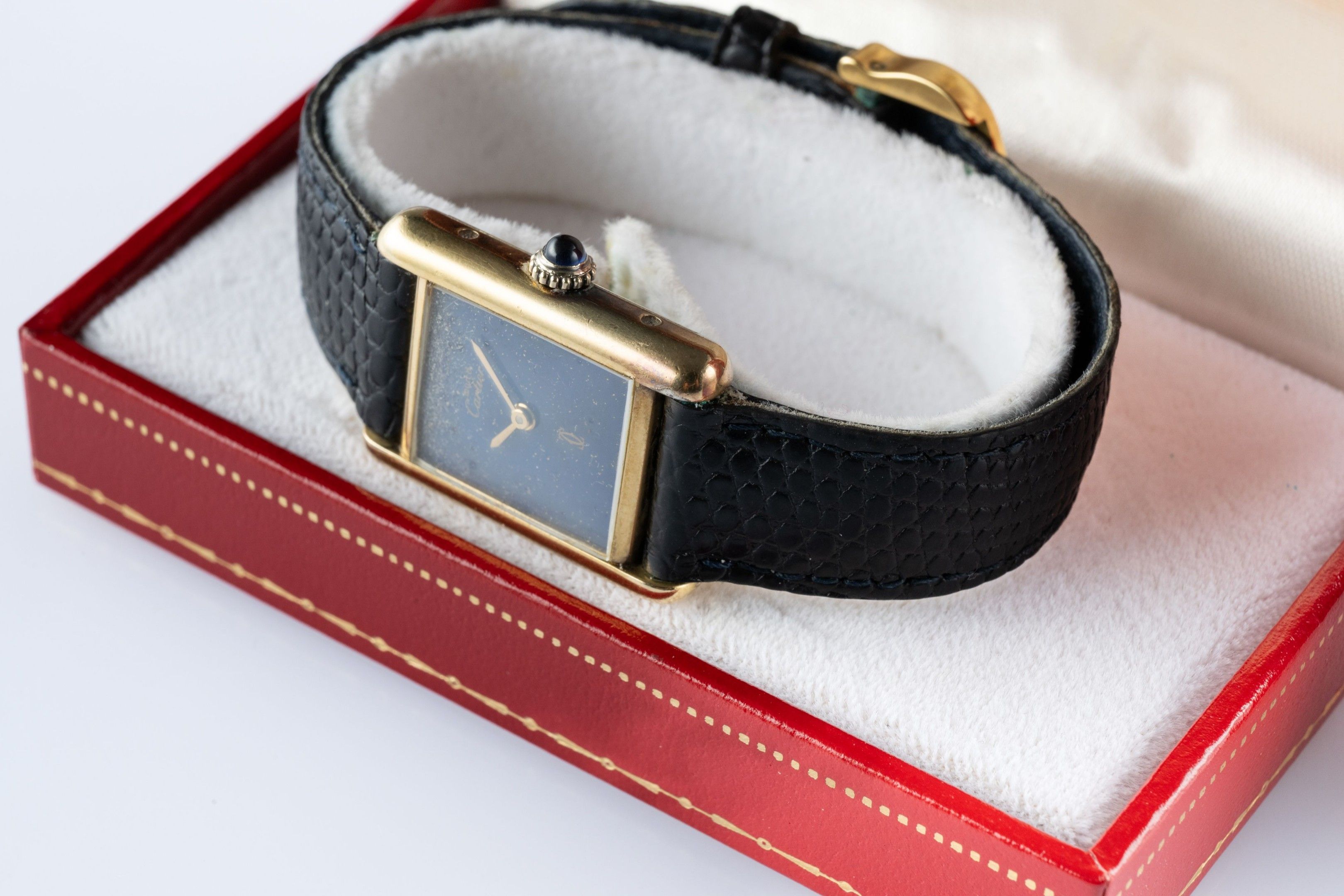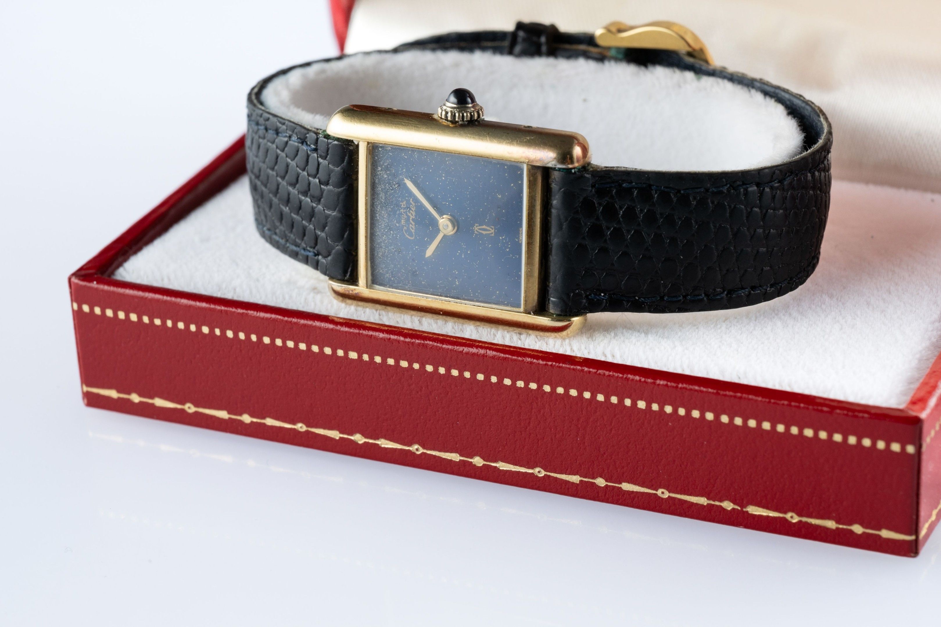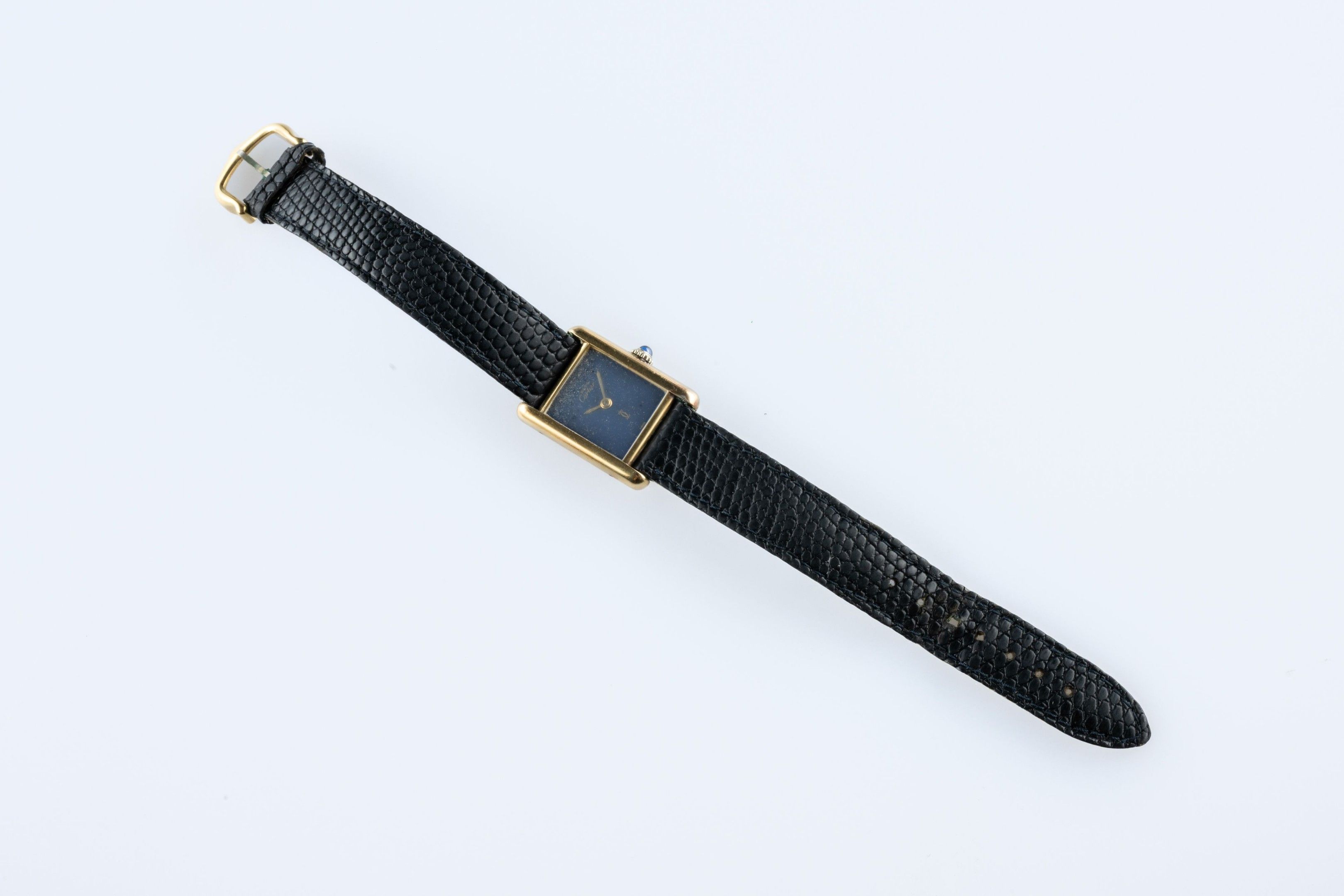 Tank" Must line wristwatch, case in gold-plated silver (925 thousandths), dial with blue background imitating lapiz lazuli. Winding mechanism adorned with a blue stone cabochon. Lizard-embossed black leather strap with gold-plated metal buckle.