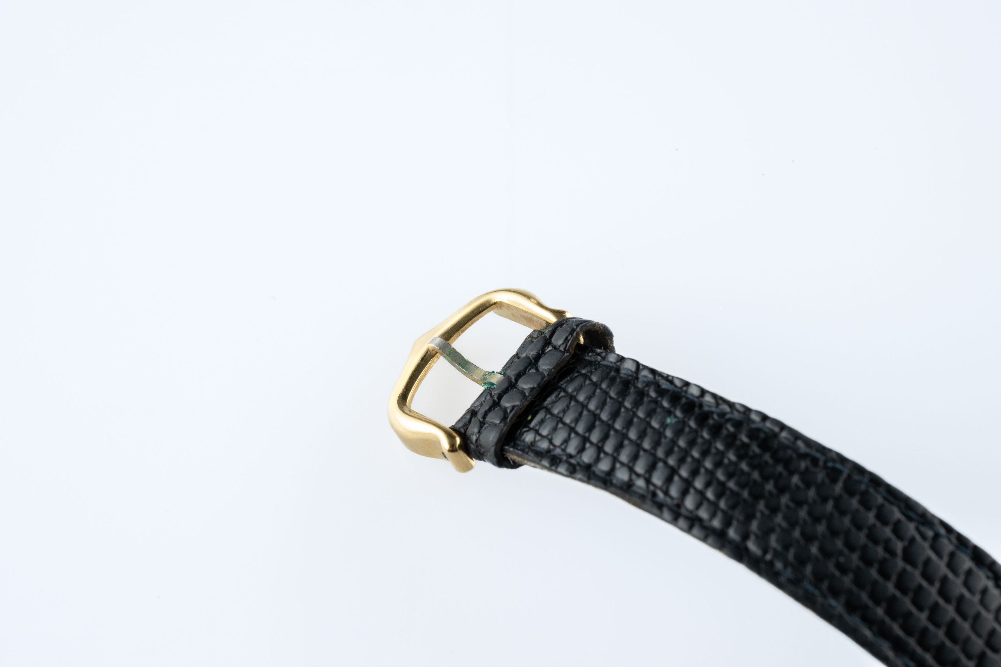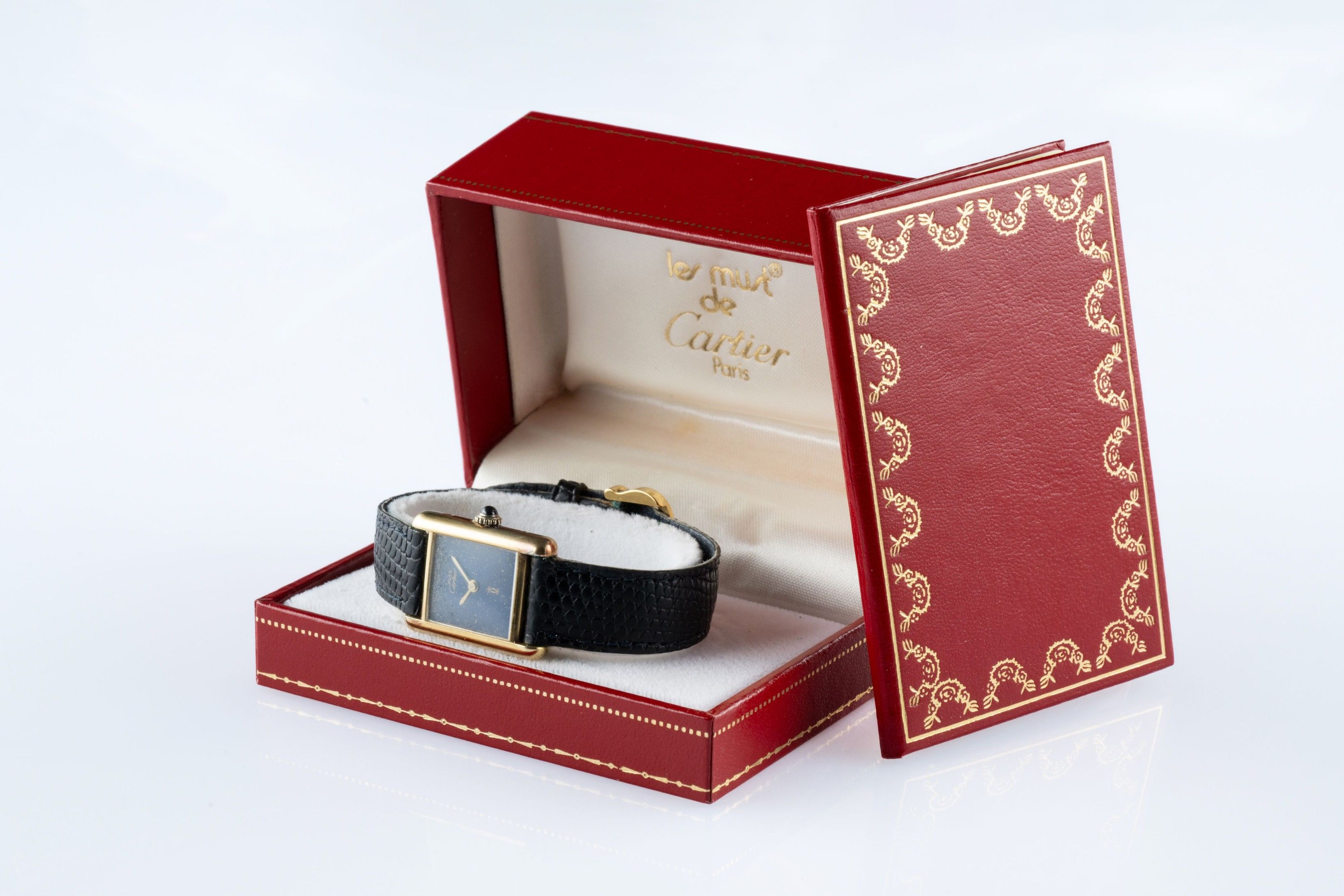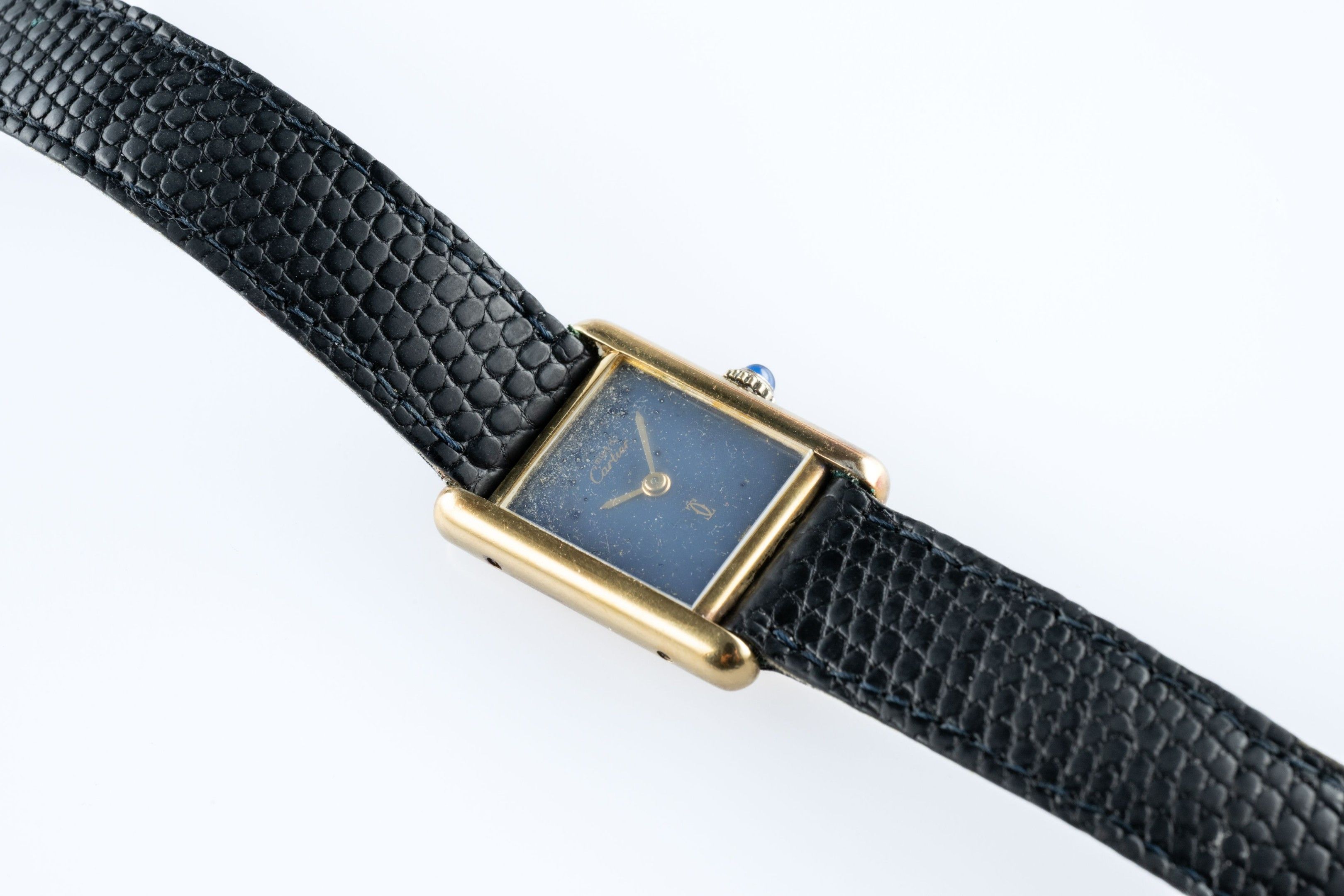 Tank" Must line wristwatch, case in gold-plated silver (925 thousandths), dial with blue background imitating lapiz lazuli. Winding mechanism adorned with a blue stone cabochon. Lizard-embossed black leather strap with gold-plated metal buckle.