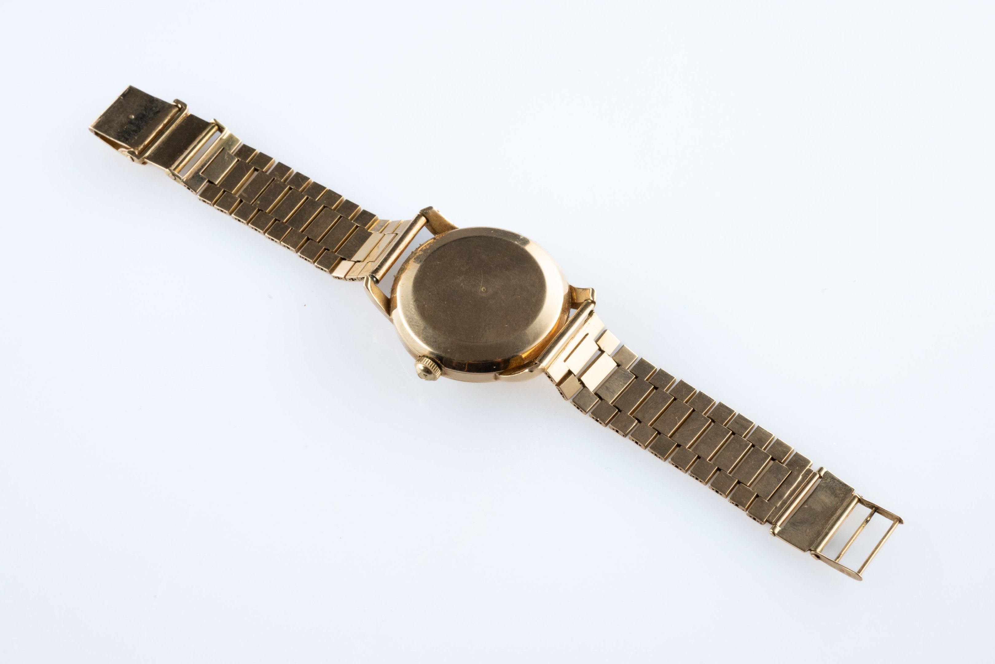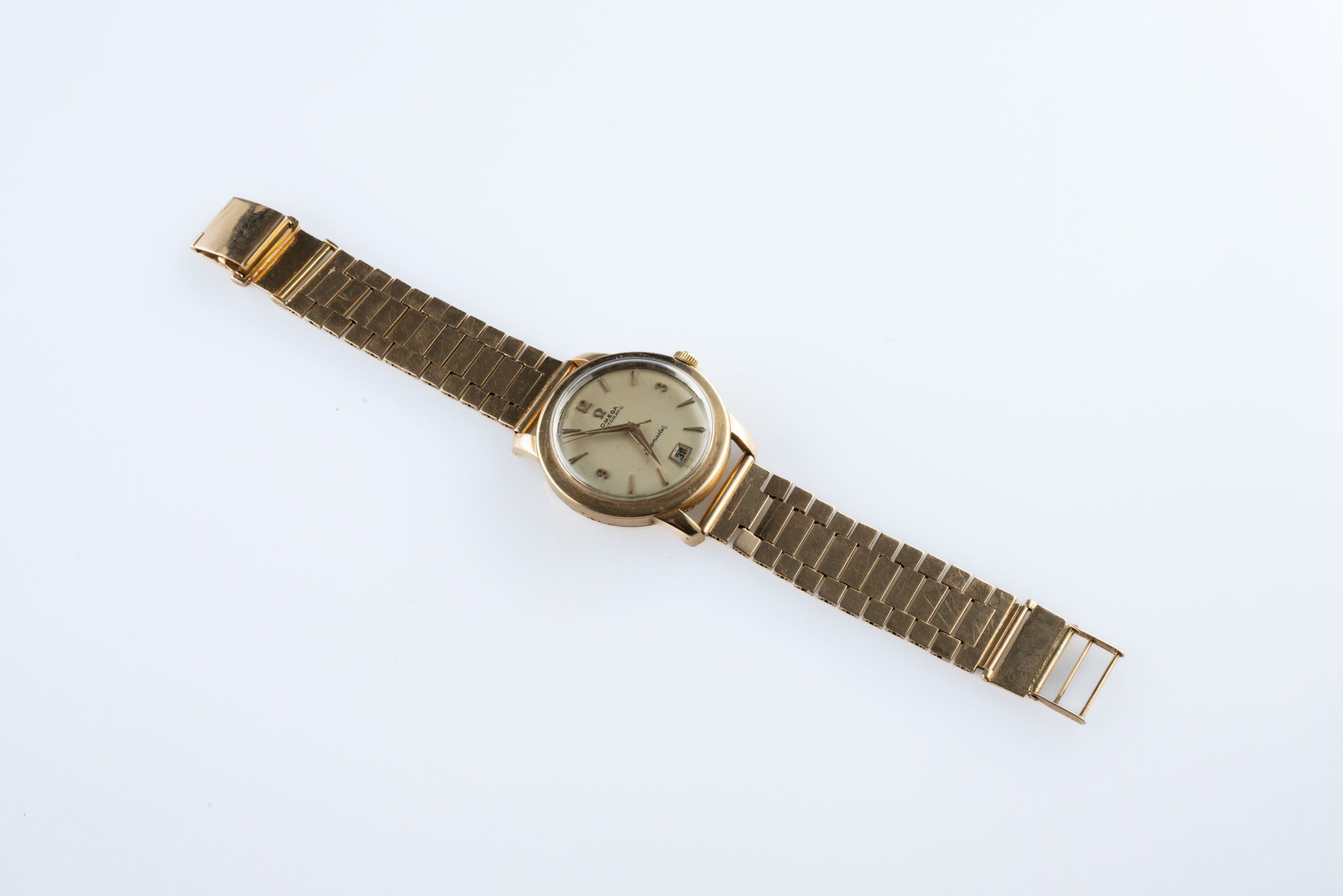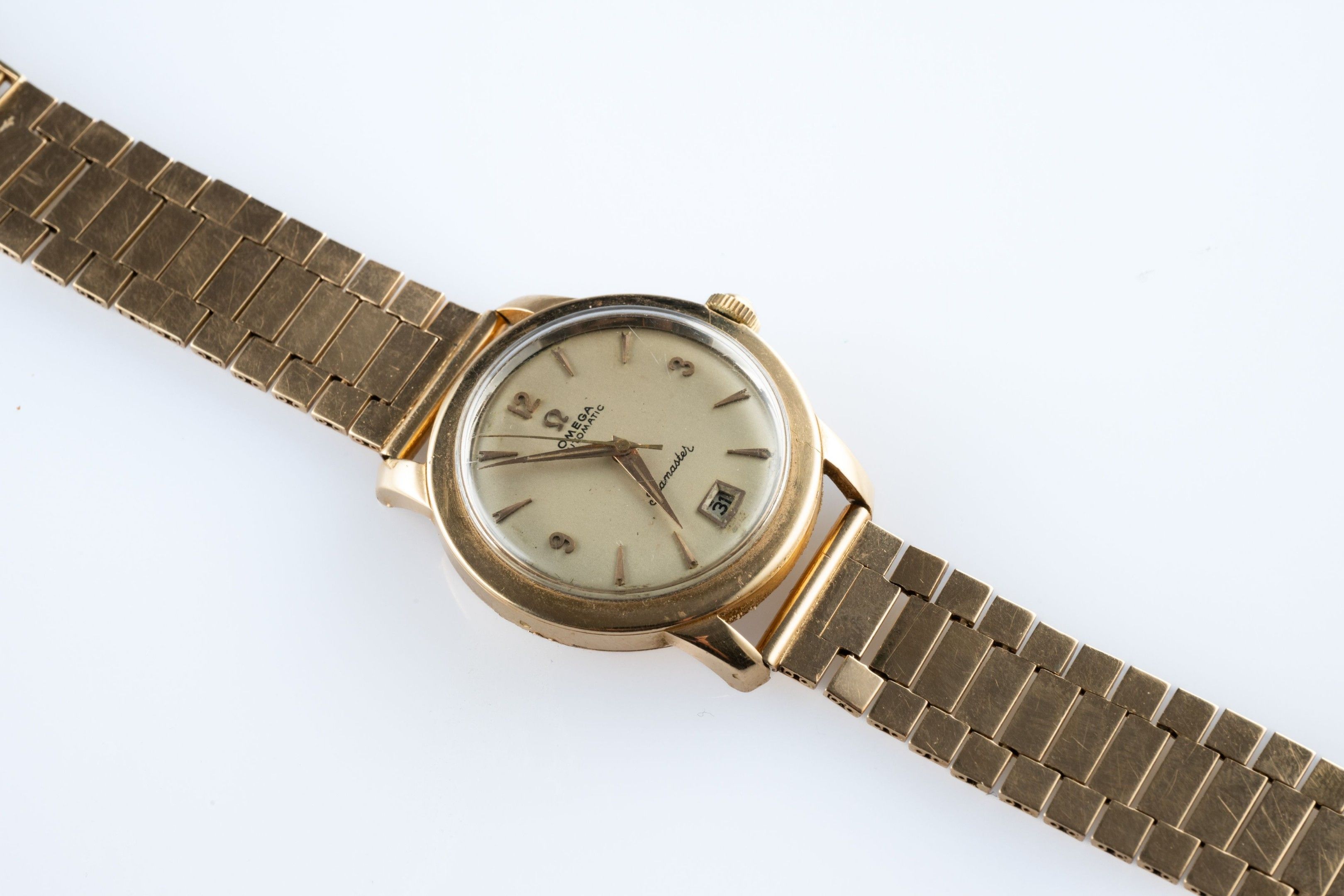 Seamaster" wristwatch in 18k (750 thousandths) yellow gold, round case, champagne dial, hours in Arabic numerals and baton hour markers, date window at six o'clock.