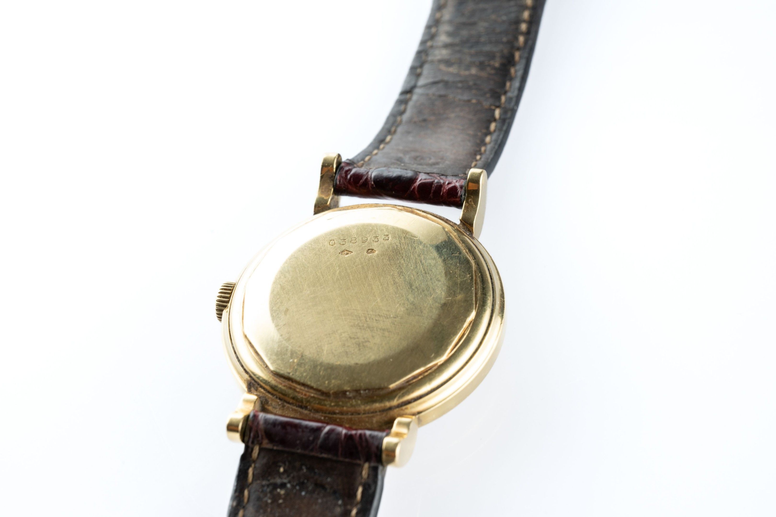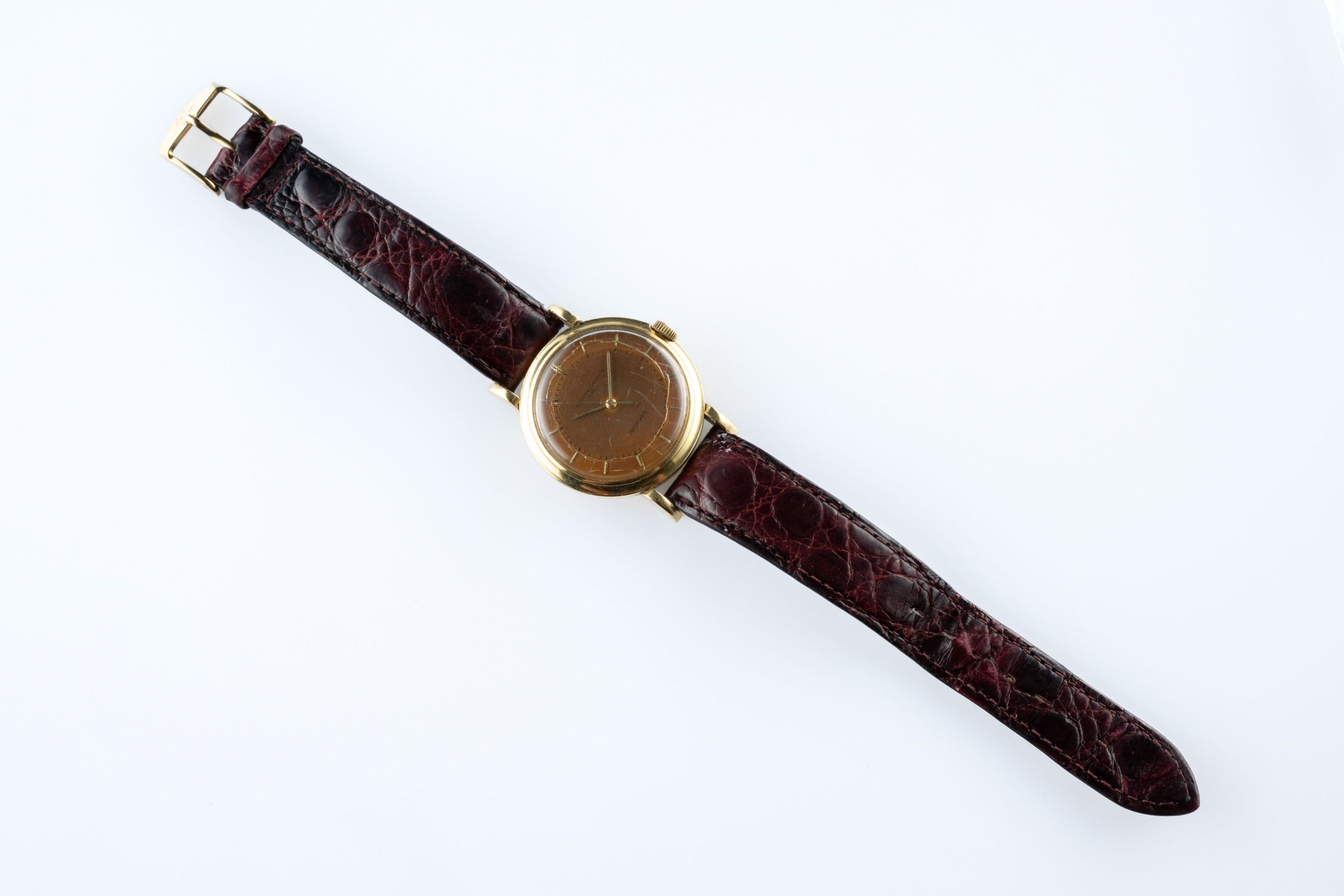 Wristwatch, round case in 18k (750 thousandths) yellow gold, copper-backed dial with baton hour-markers and minute track.