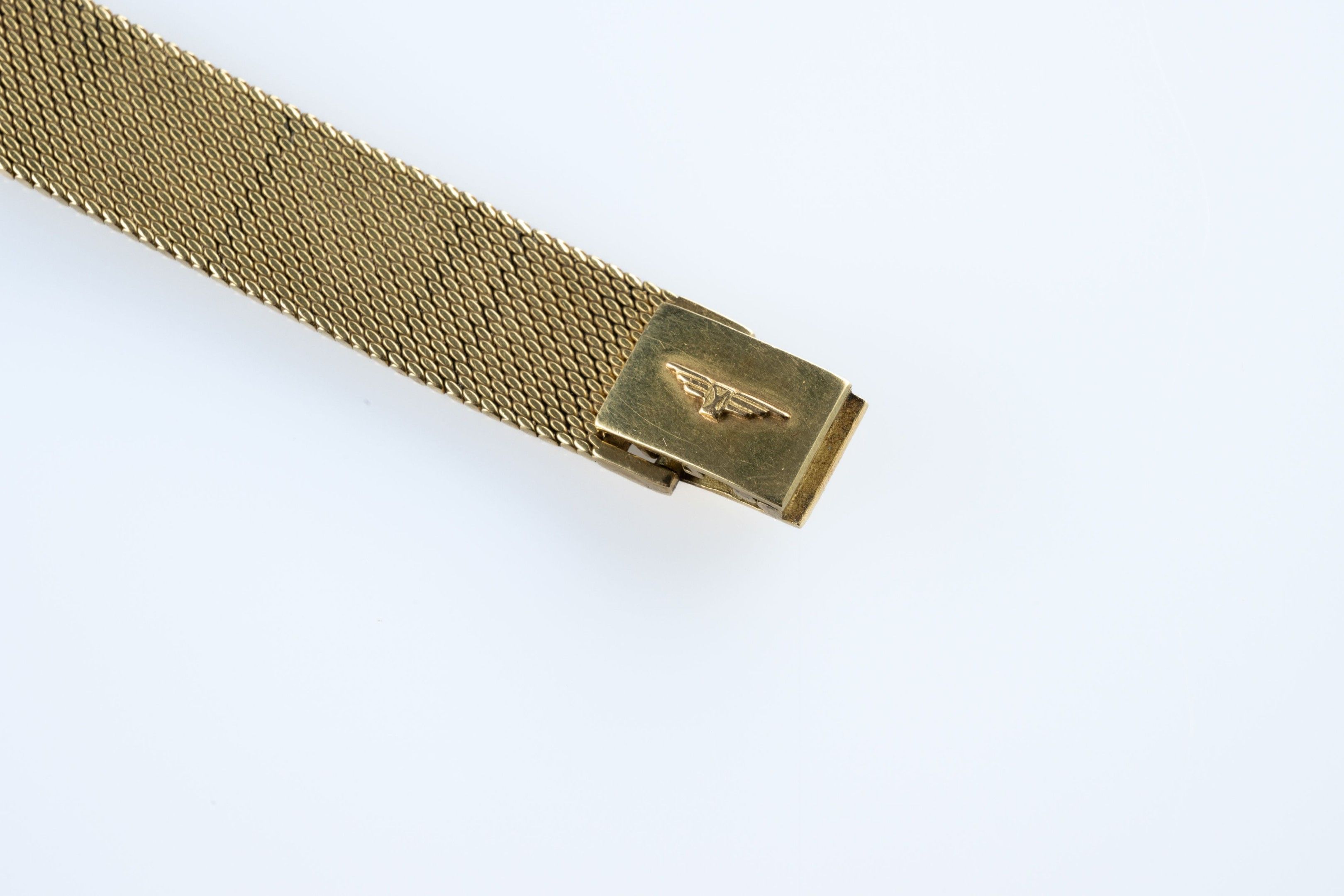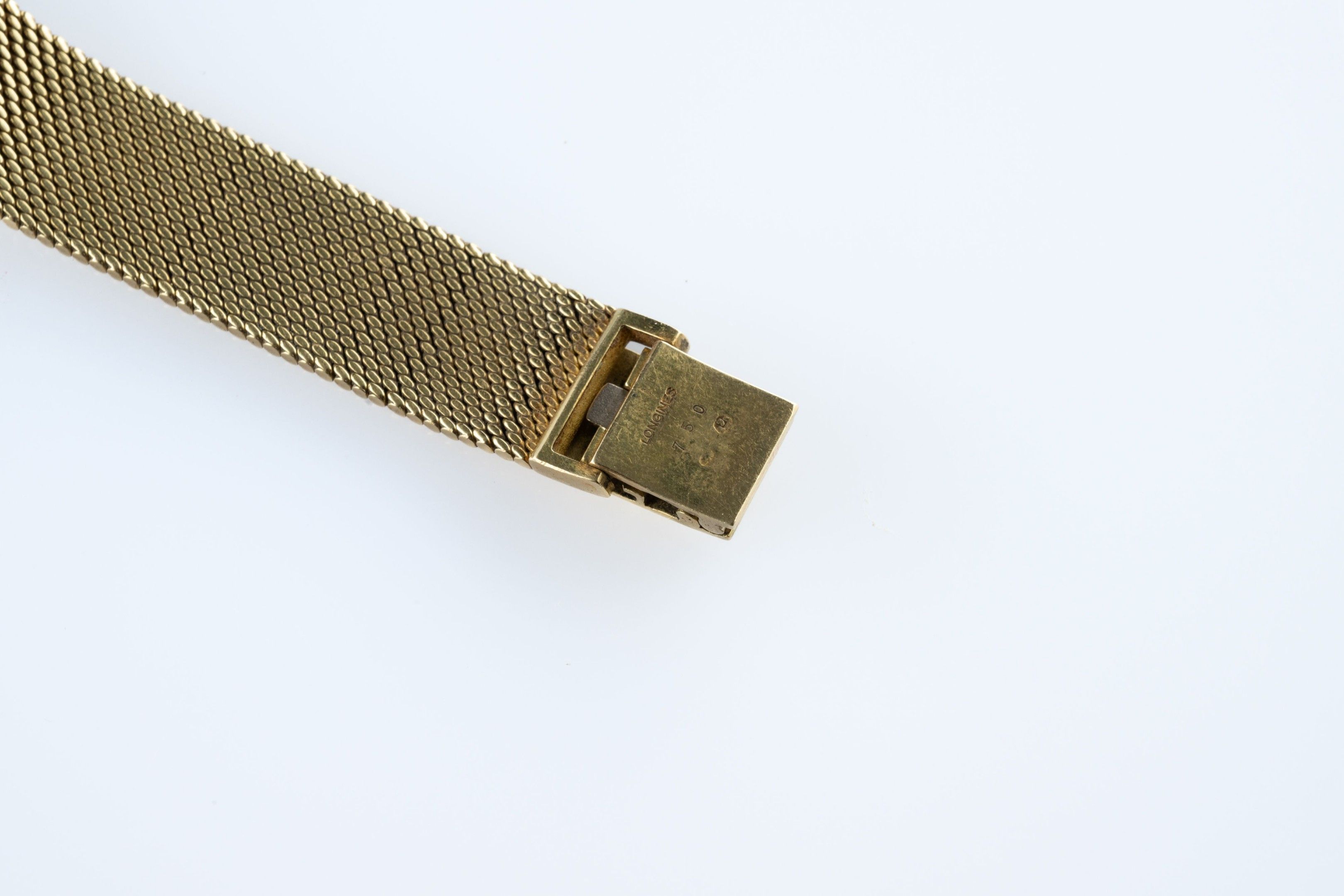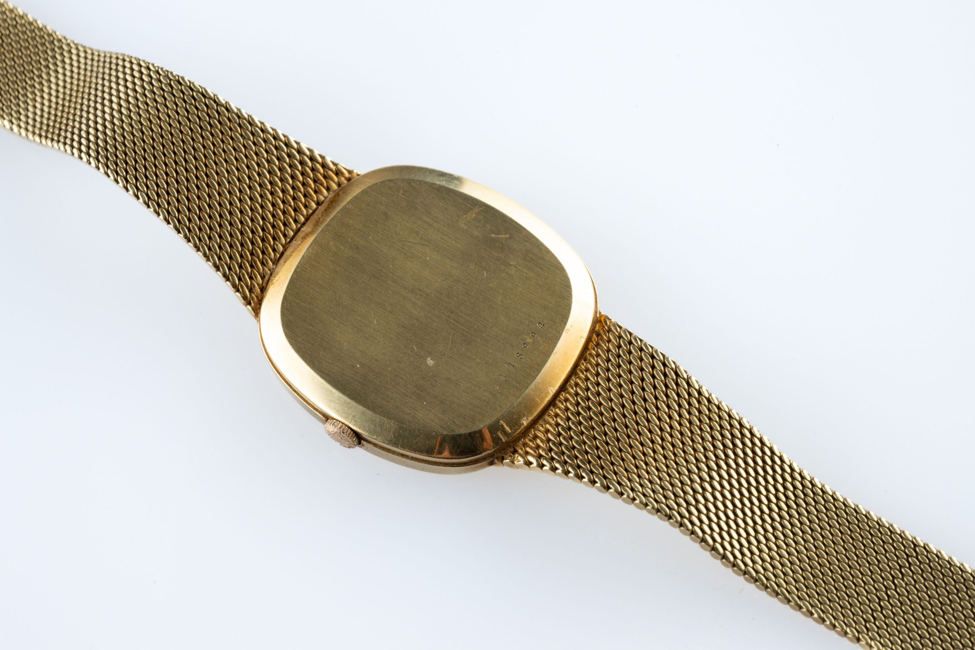 18k (750 thousandths) yellow gold wristwatch, square case with rounded corners, gilt dial with baton hour markers and date window at three o'clock. Milanese link bracelet.