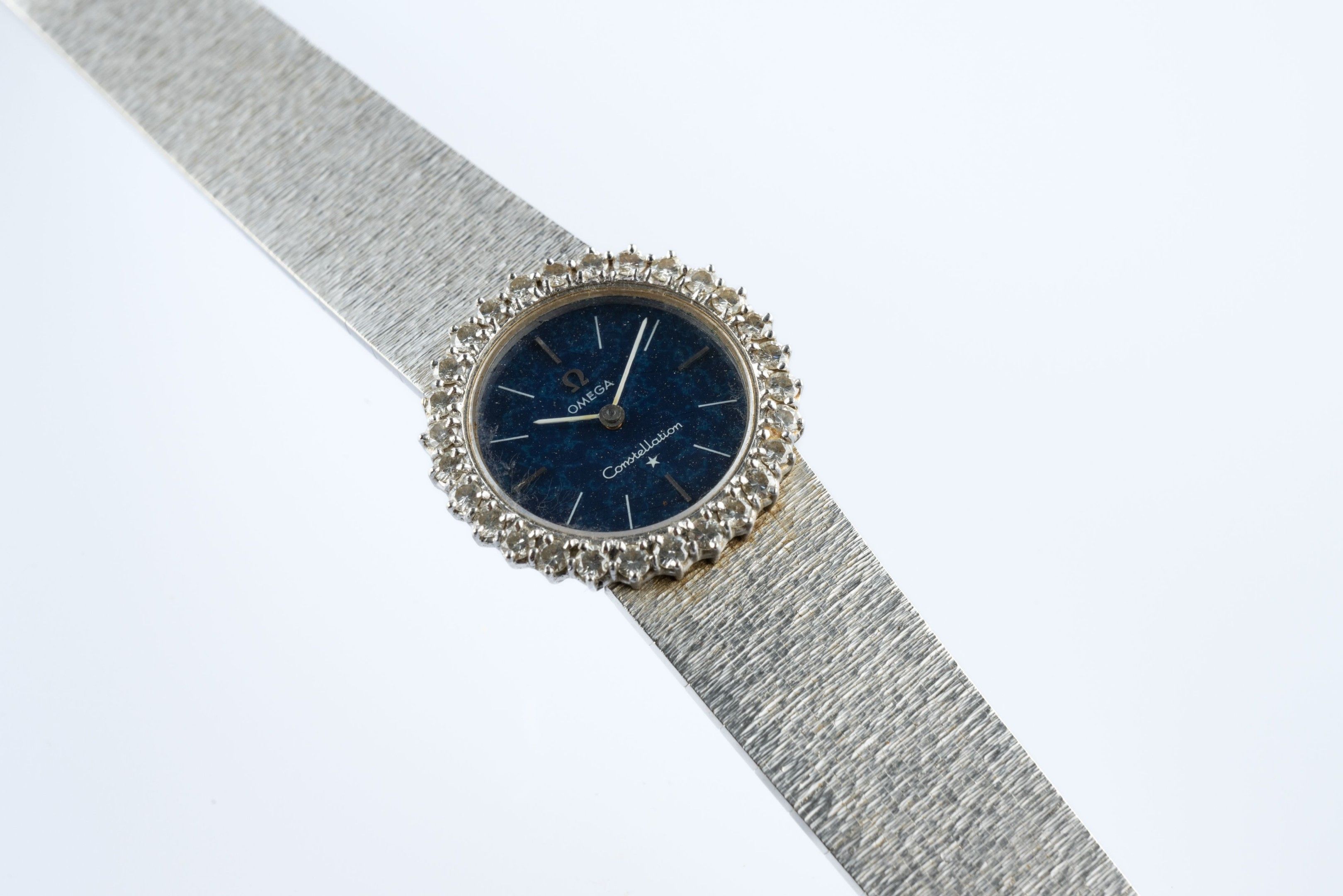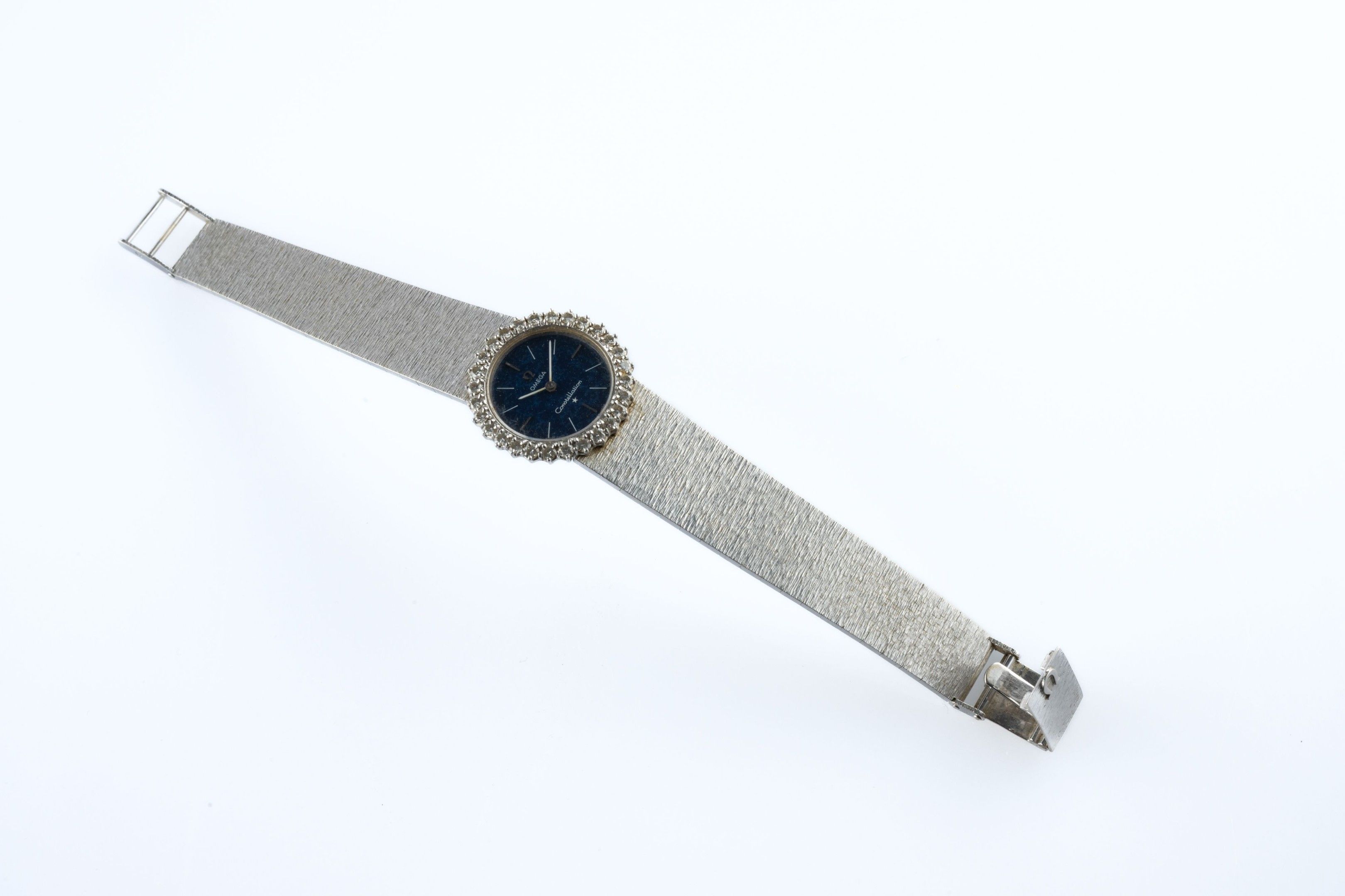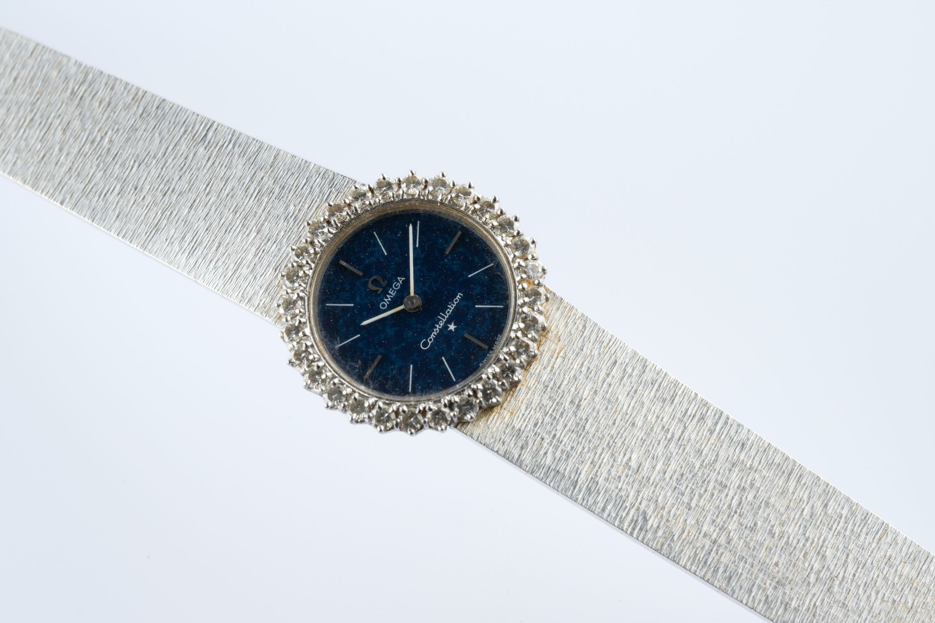 Ladies' wristwatch "Constellation" model in 18k (750 thousandths) white gold, the round case surrounded by small diamonds, the blue sequined back imitating a starry night with baton hour-markers. Amati ribbon bracelet.