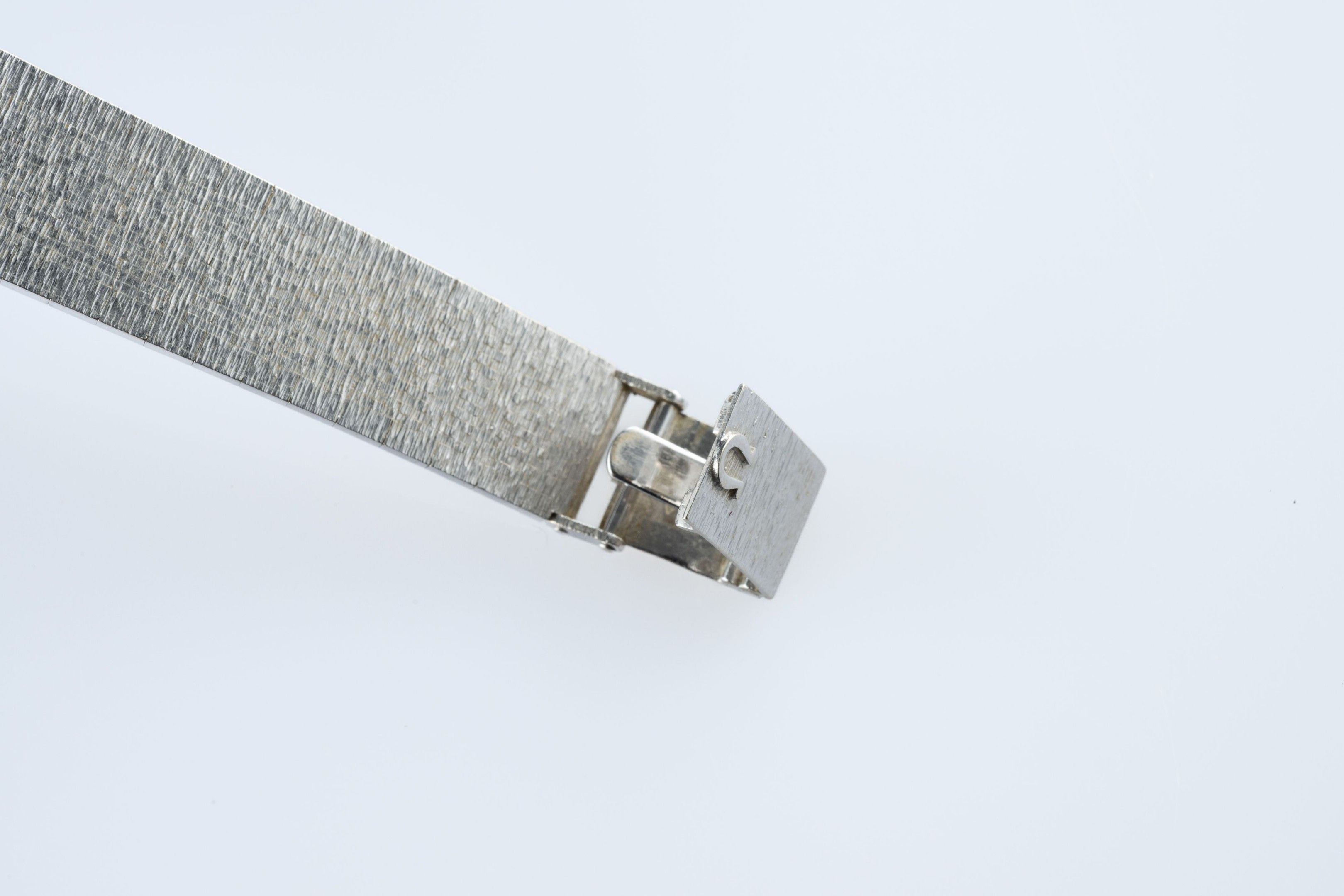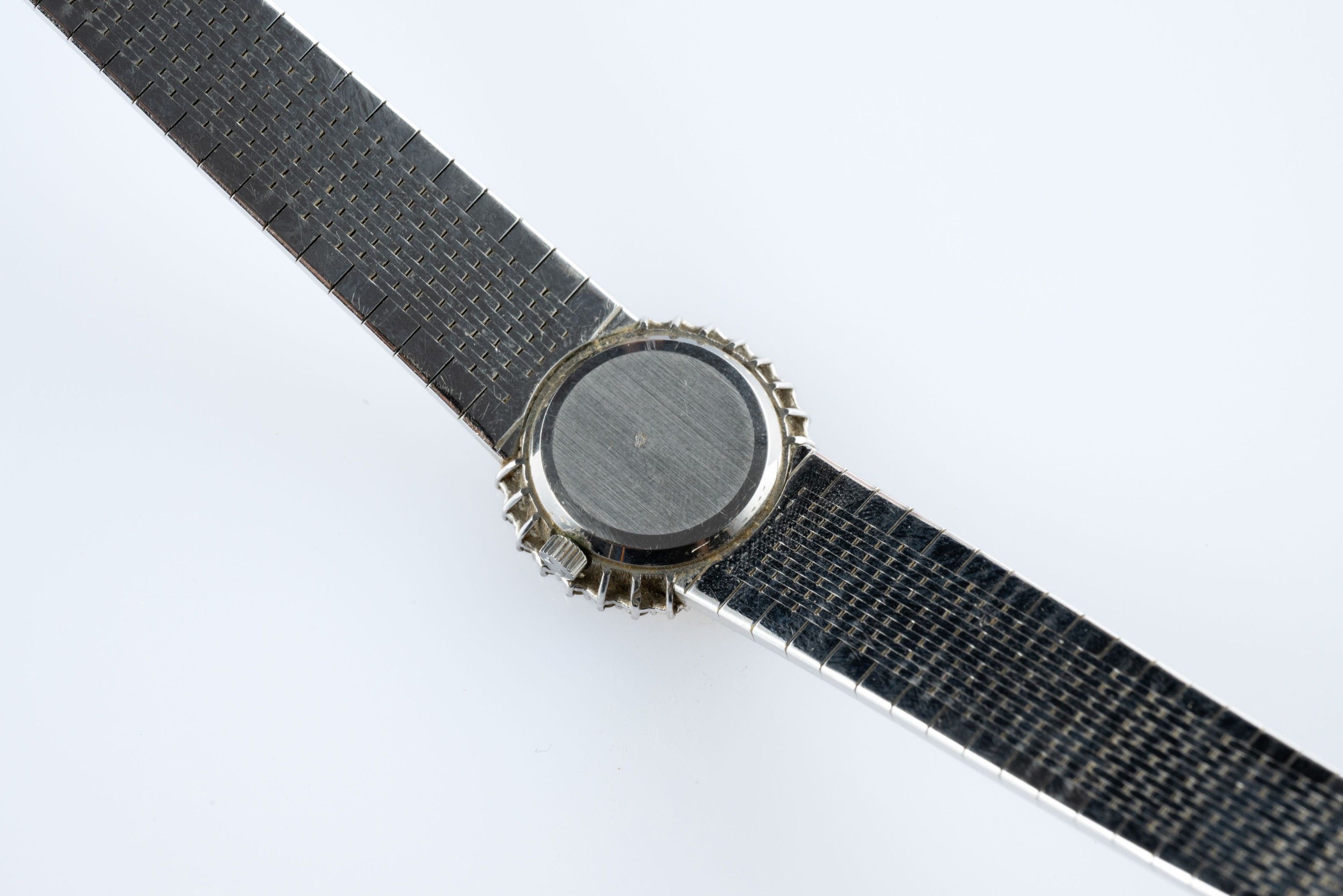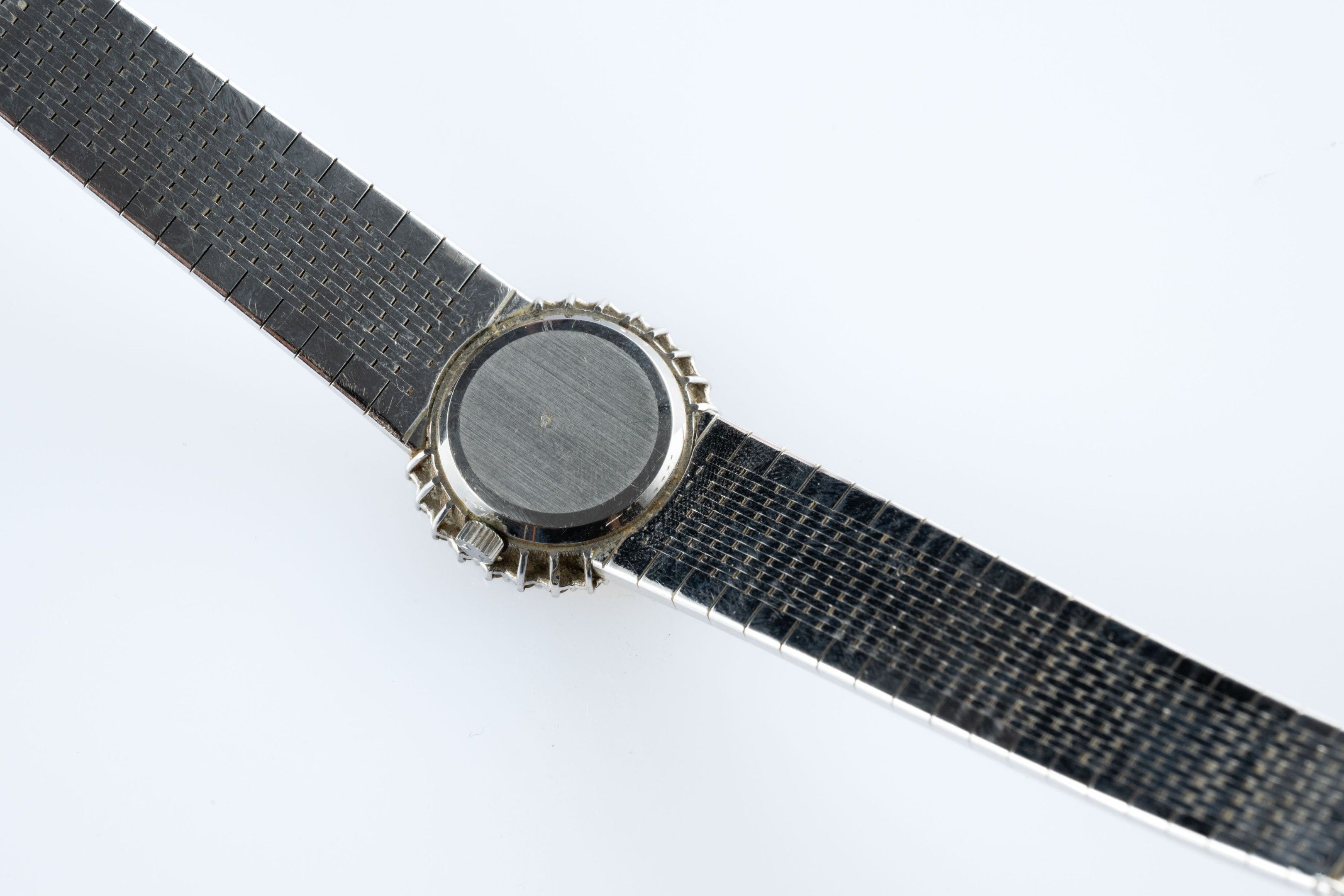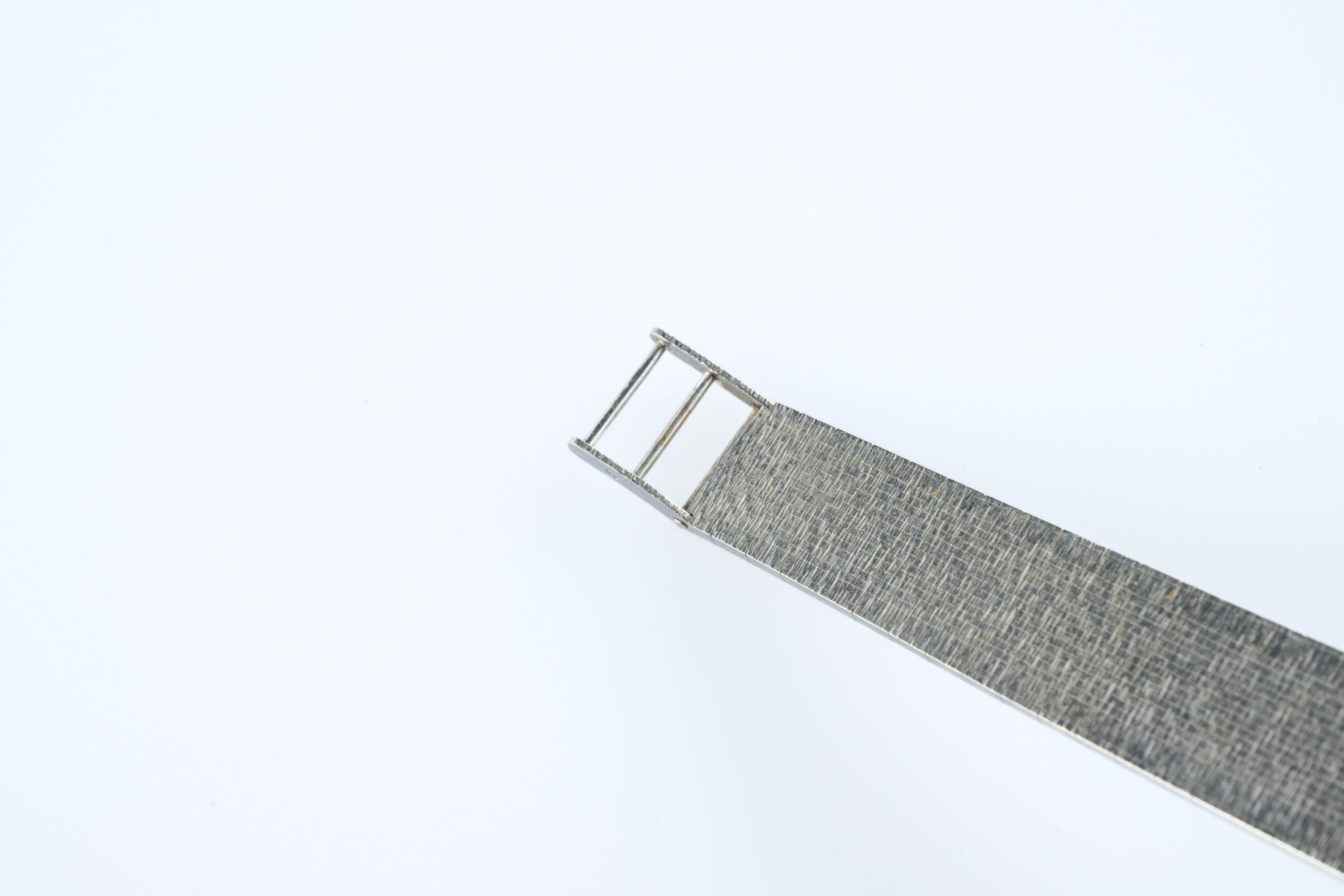 Ladies' wristwatch "Constellation" model in 18k (750 thousandths) white gold, the round case surrounded by small diamonds, the blue sequined back imitating a starry night with baton hour-markers. Amati ribbon bracelet.