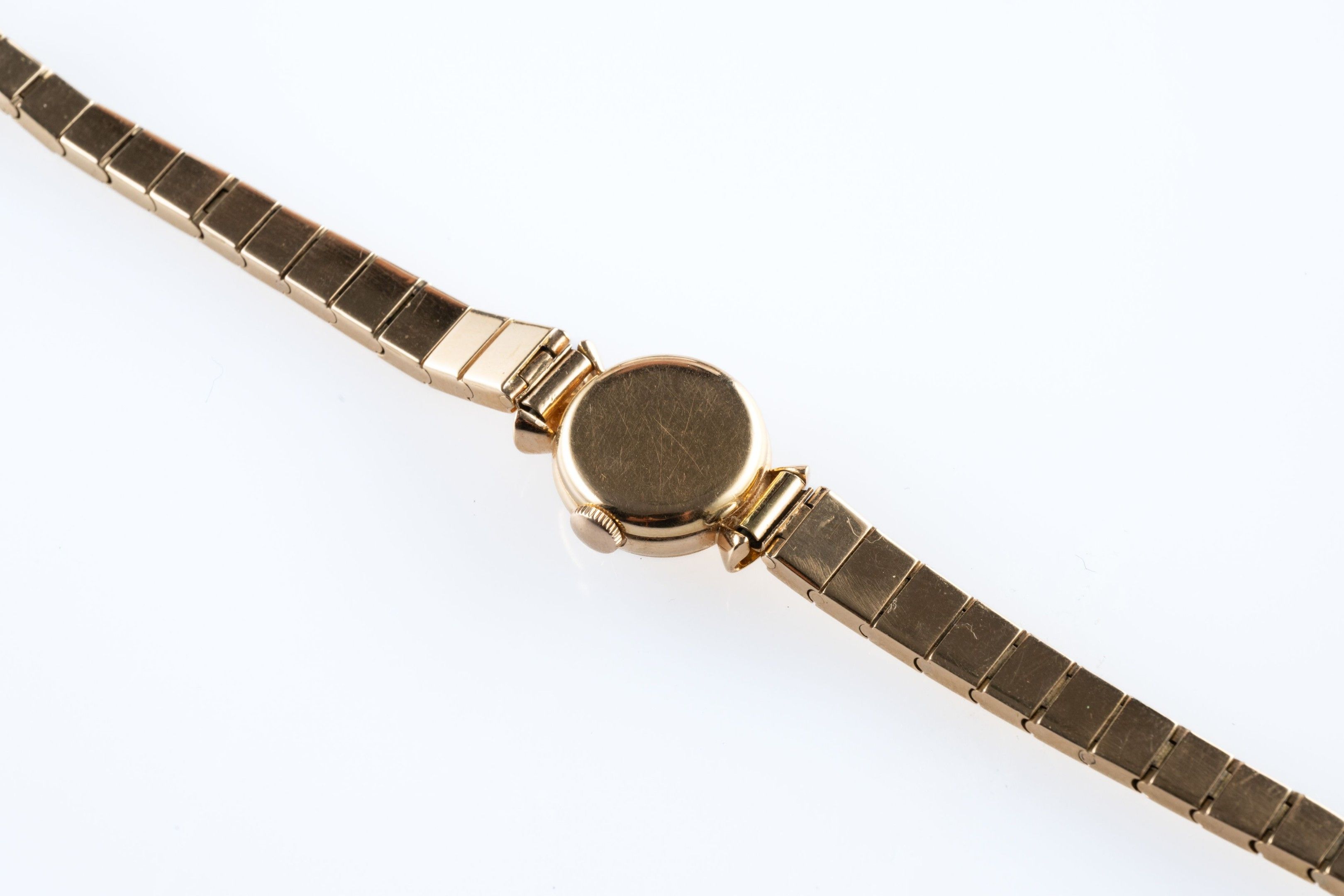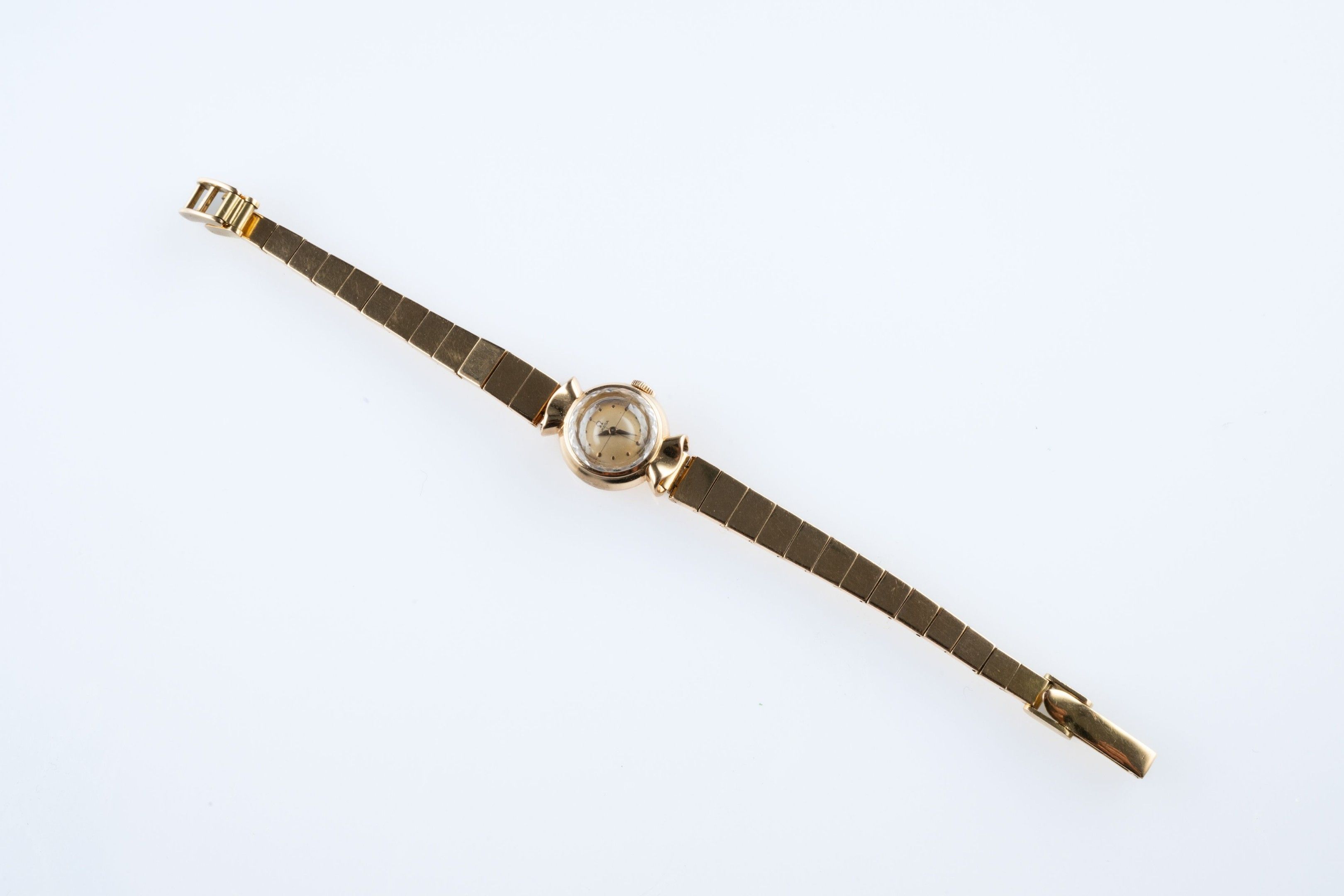 Ladies' wristwatch in 18k (750 thousandths) yellow gold, round case, gilt dial, flat-link bracelet.