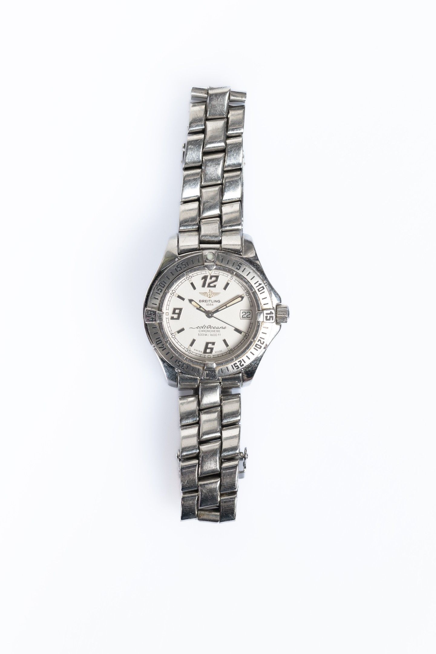 Colt Oceane" ladies' wristwatch in stainless steel, round case with graduated bezel, grey dial with Arabic numerals and baton hour markers, date window at three o'clock. The bracelet is signed and numbered.