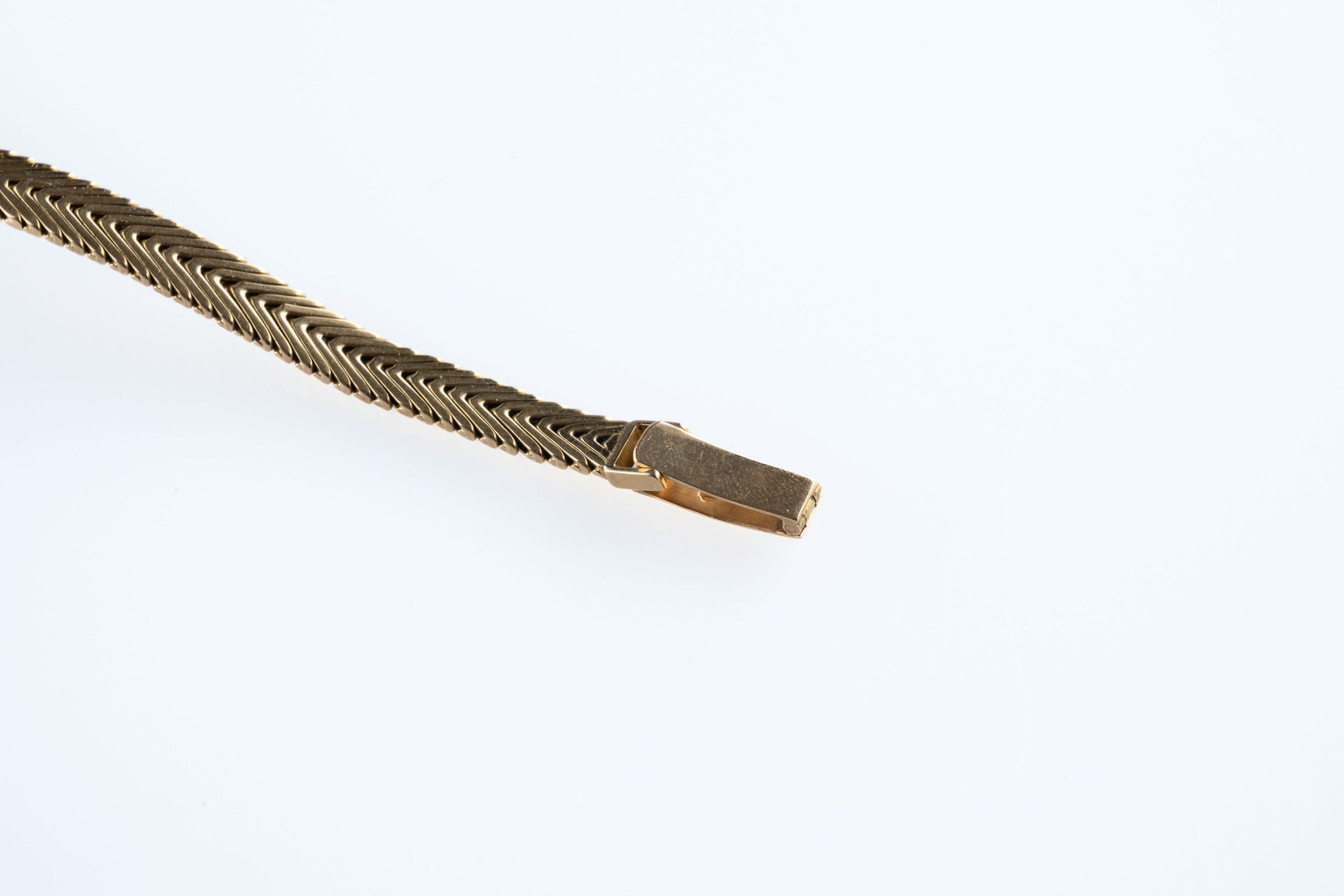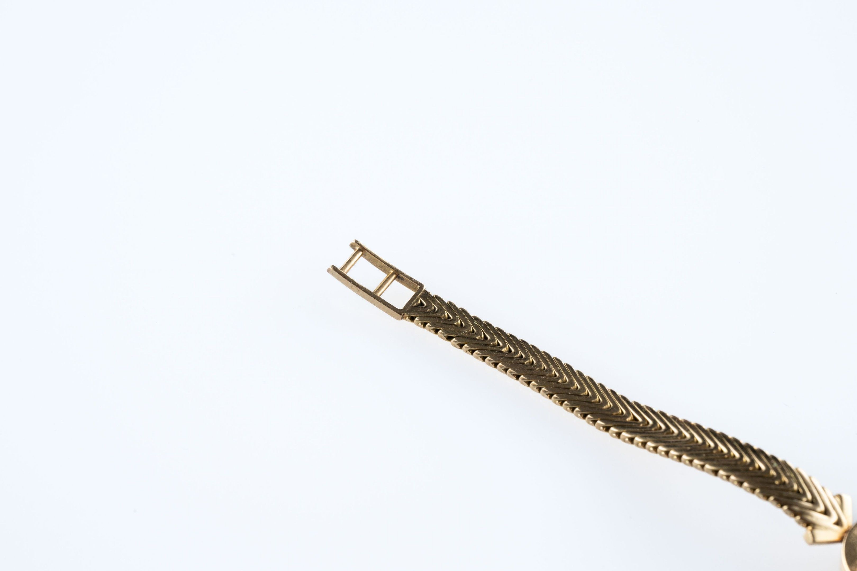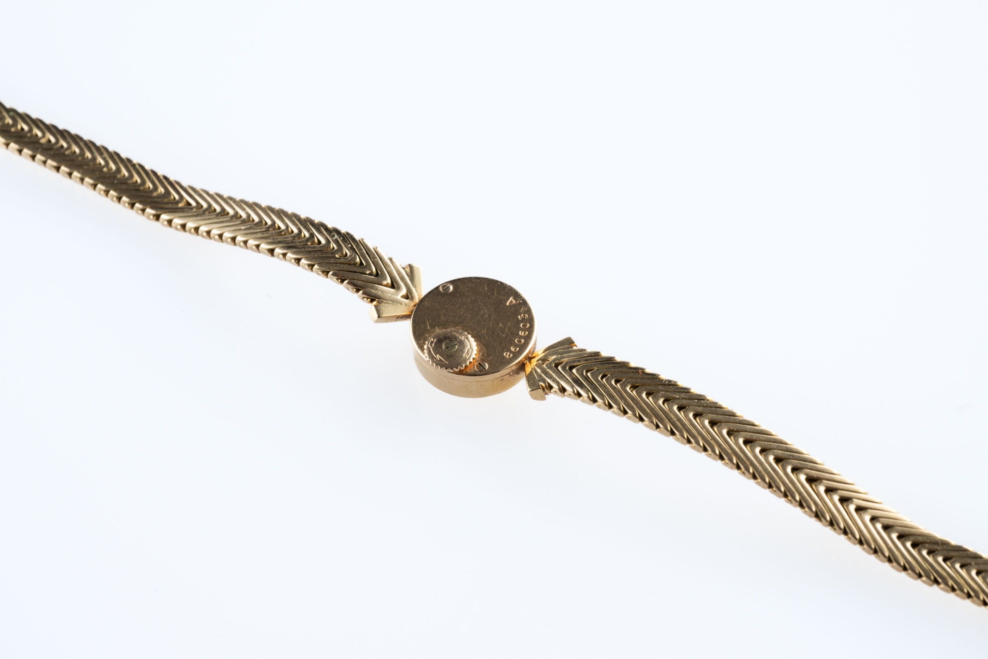 Ladies' wristwatch in 18k (750 thousandths) yellow gold, round case, gilt dial with baton hour-markers, flat-link bracelet.