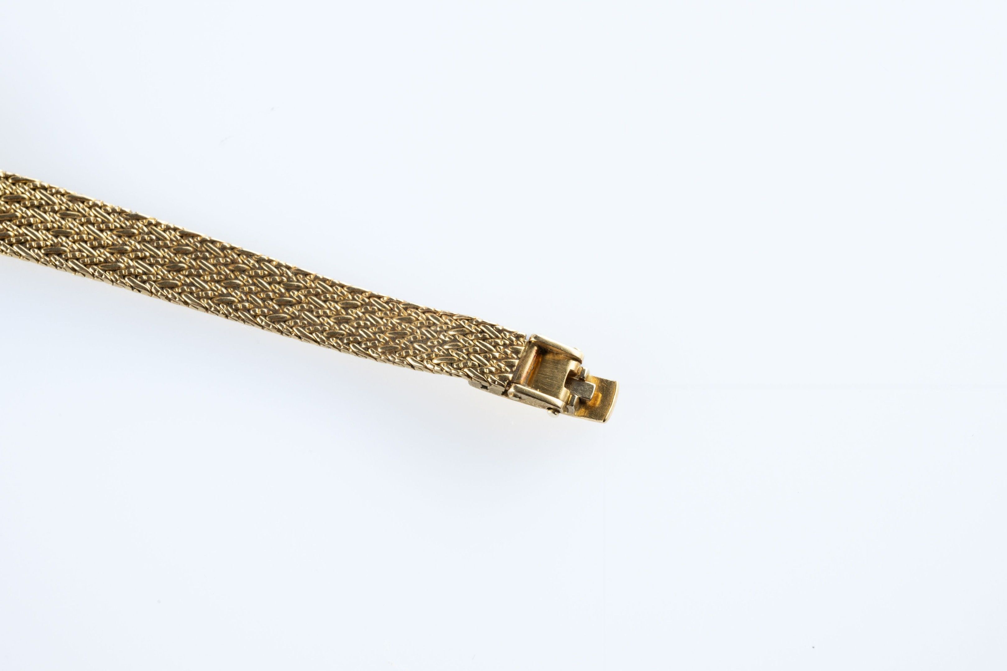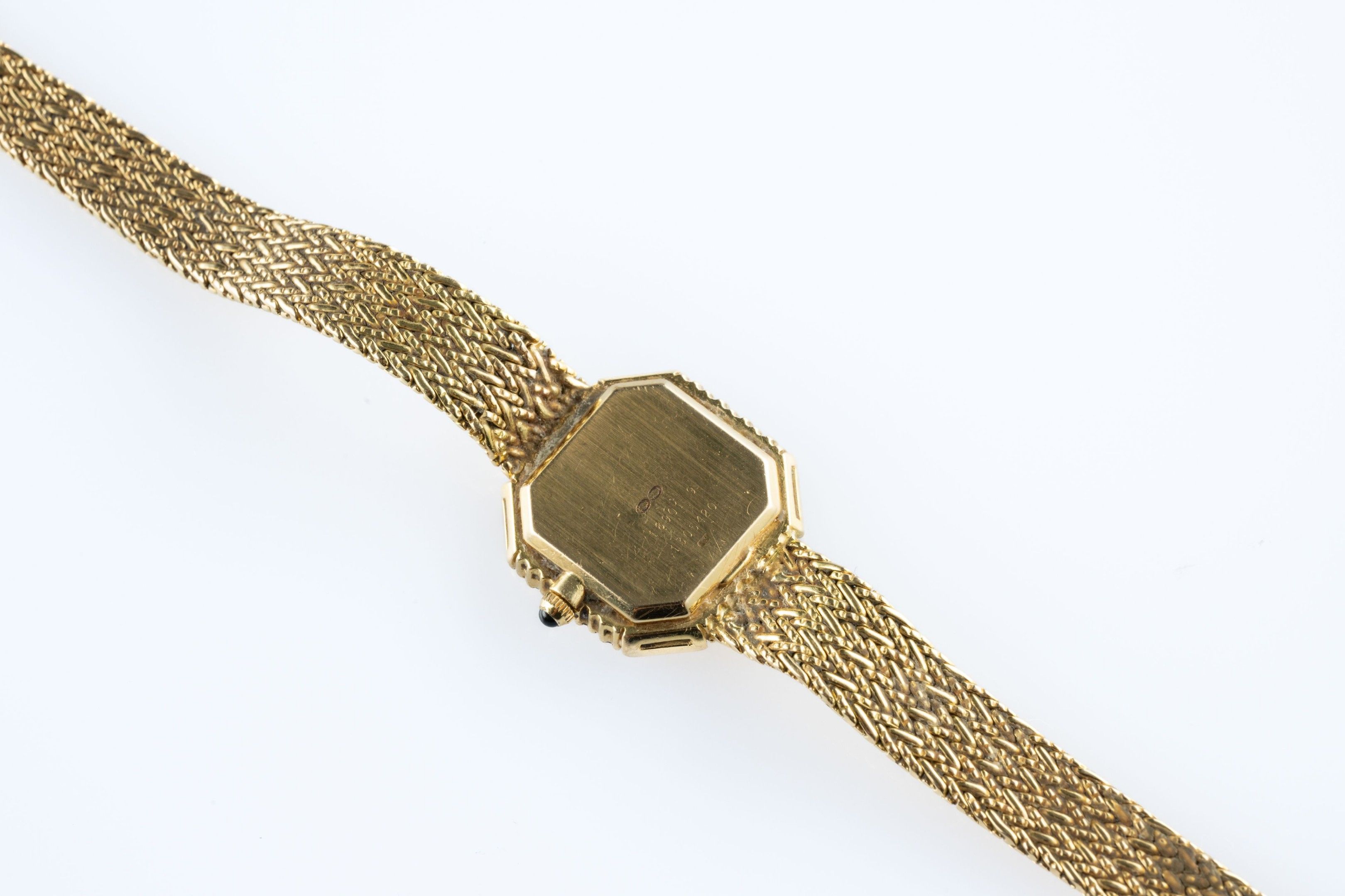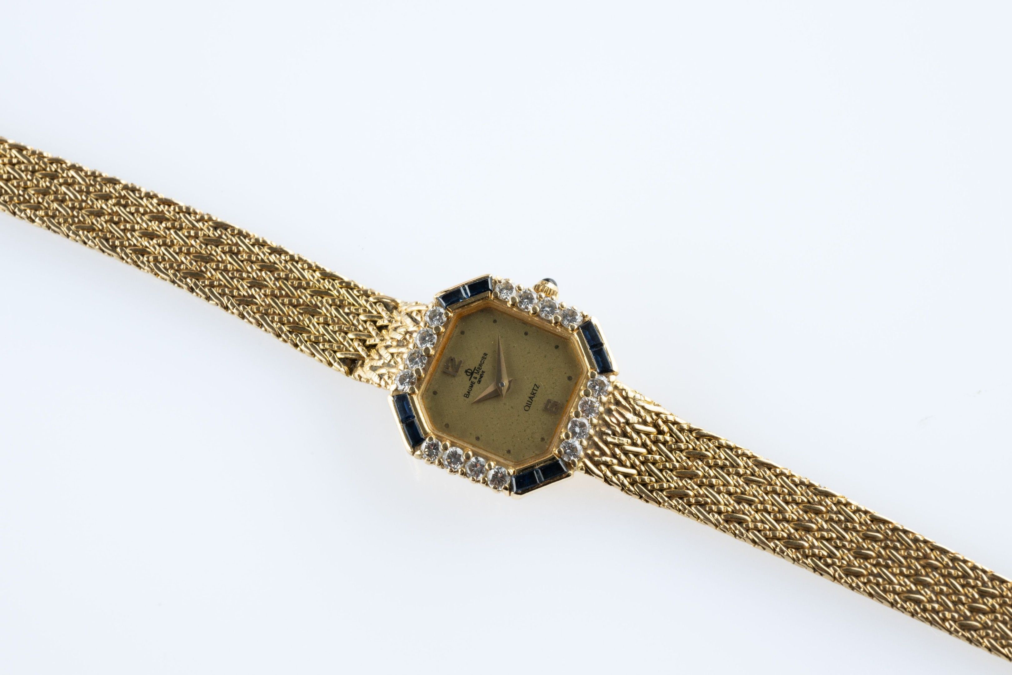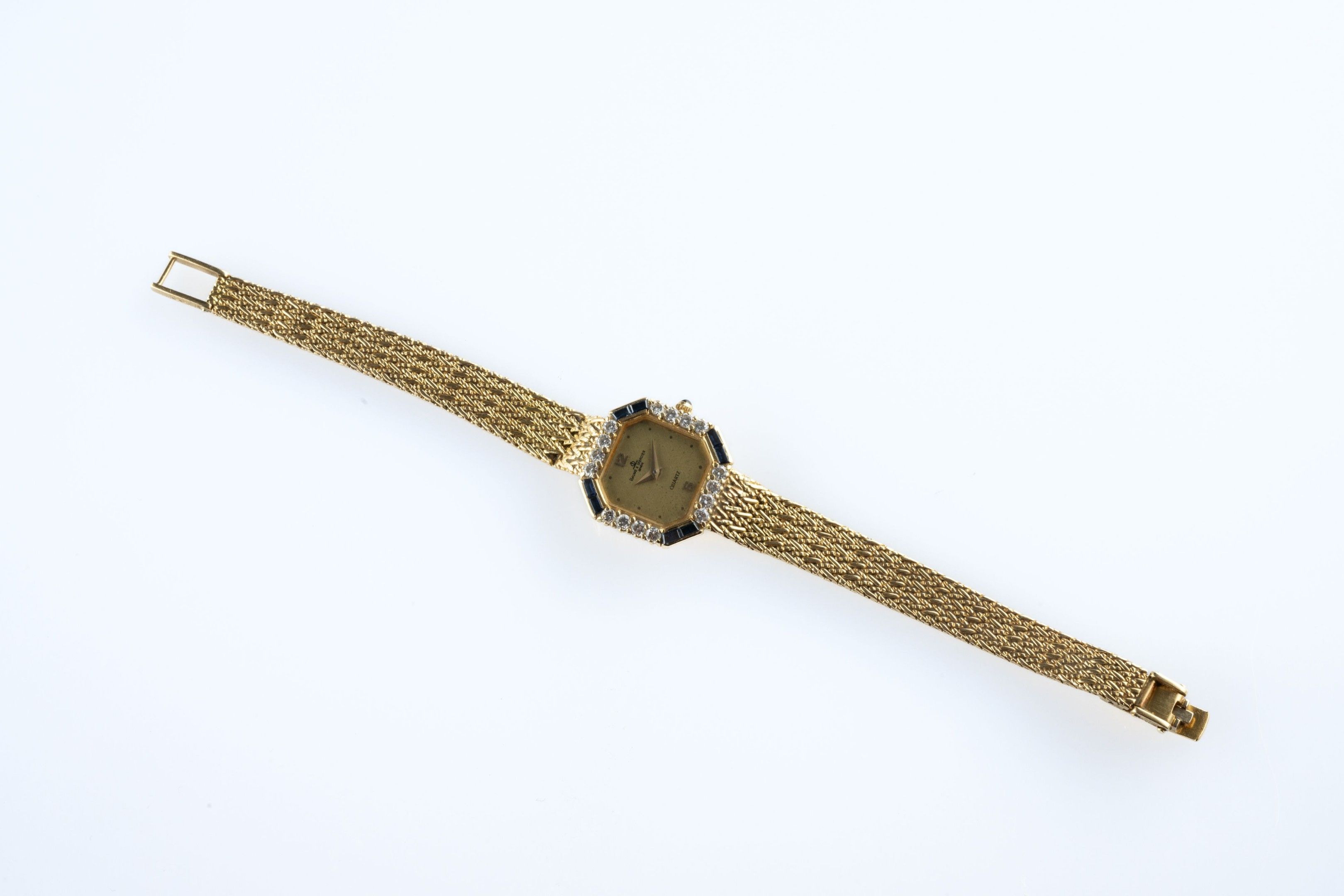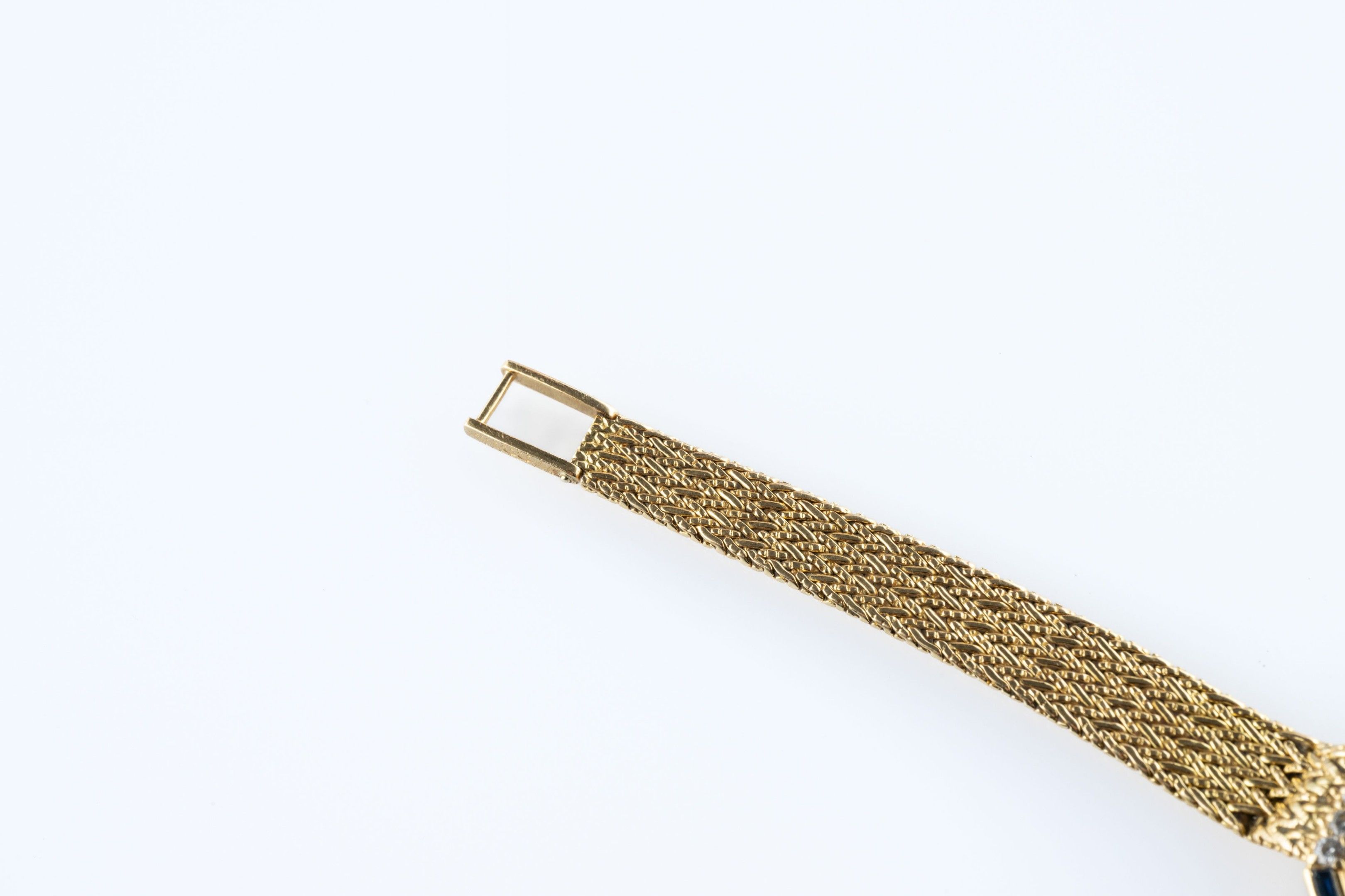 Ladies' wristwatch in 18k (750 thousandths) yellow gold, the octagonal case set with diamonds and calibrated sapphires, the dial champagne. Milanese link bracelet.