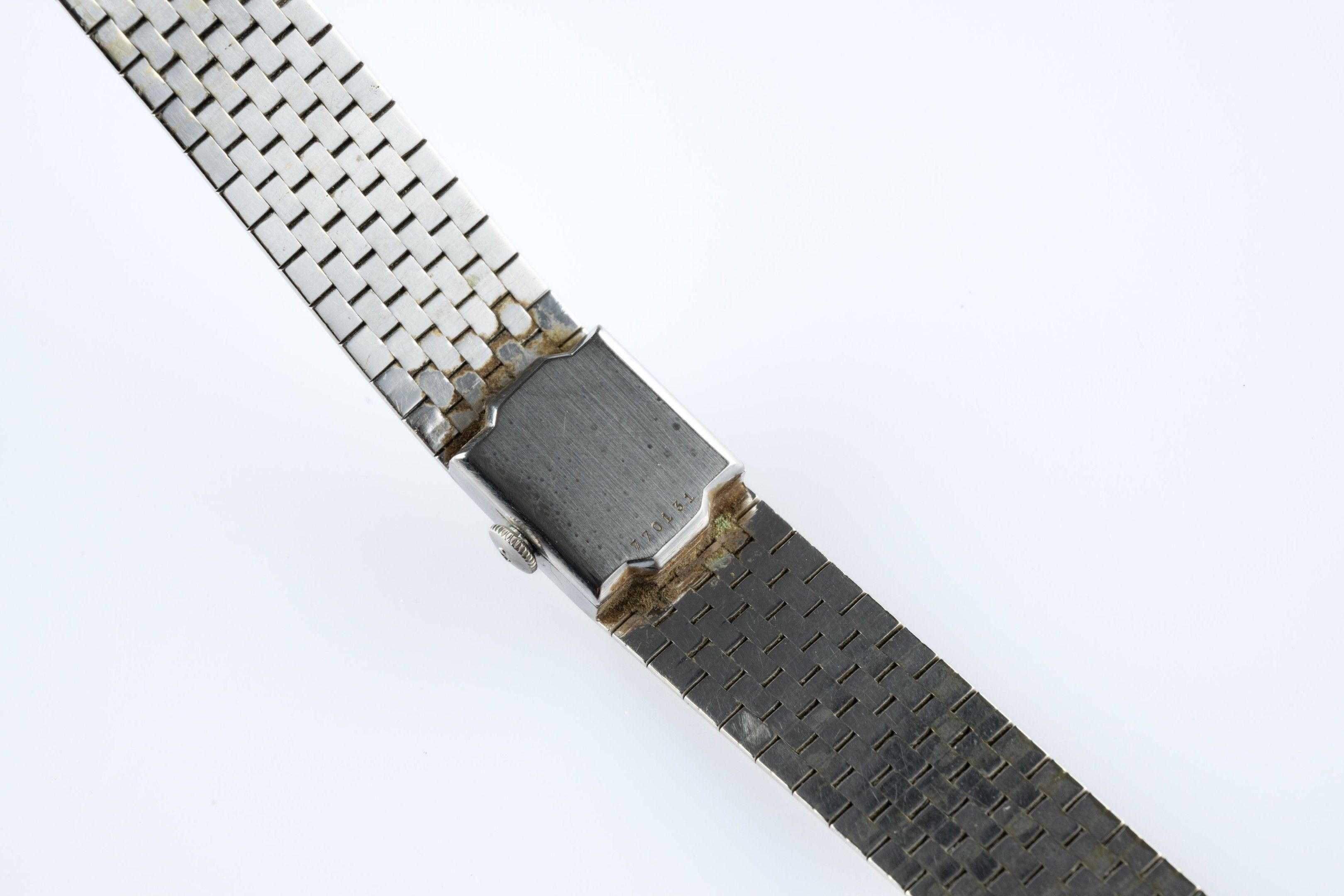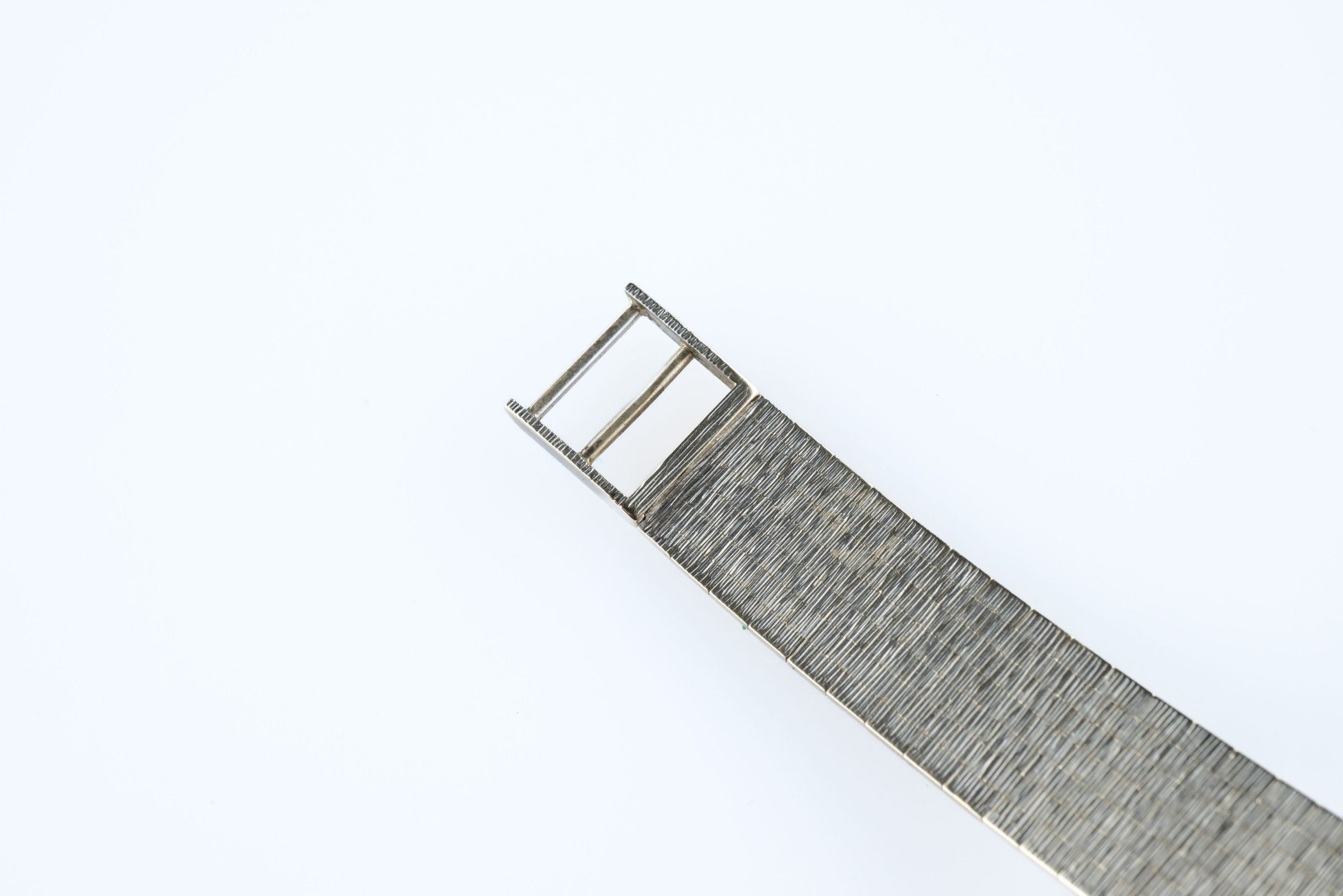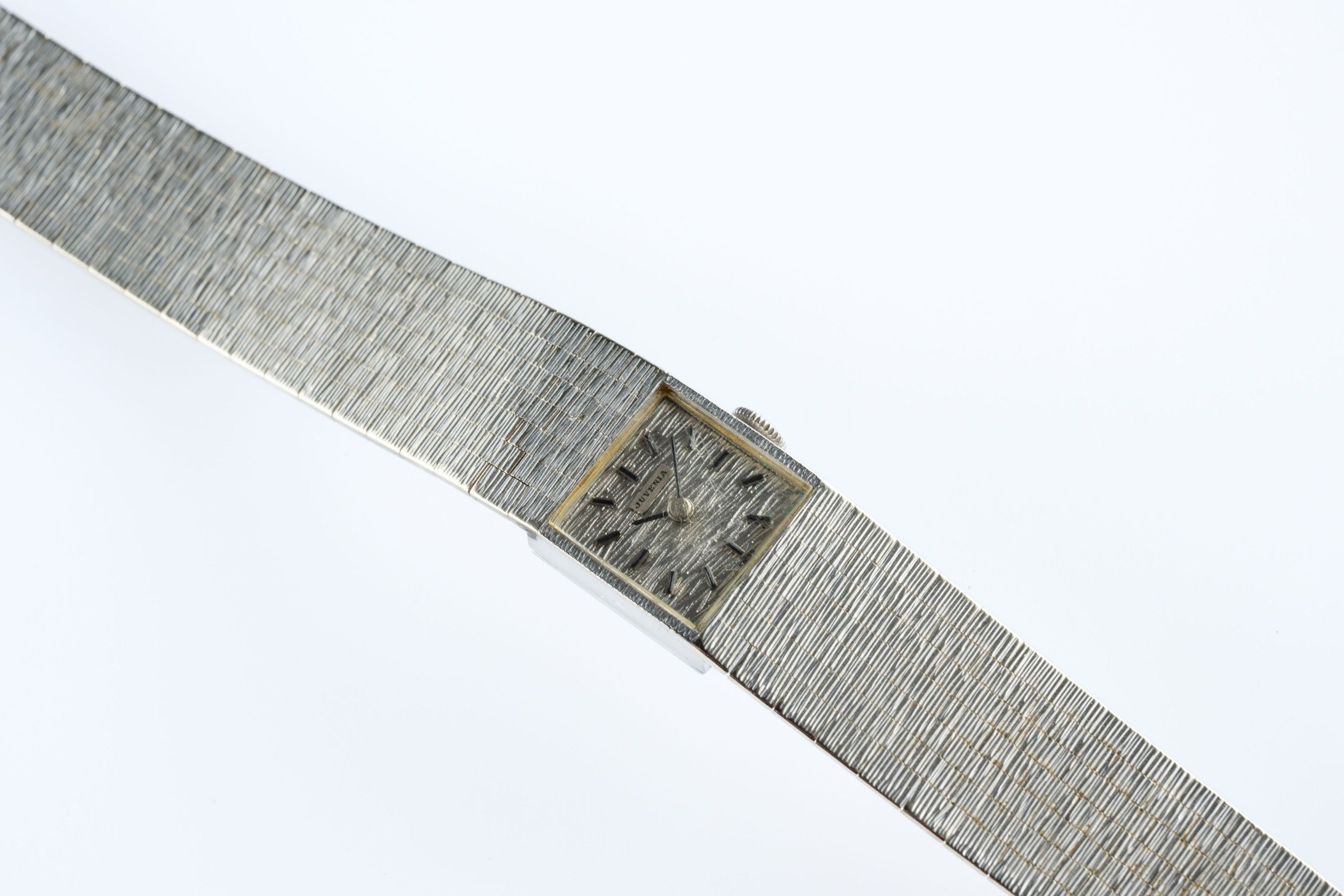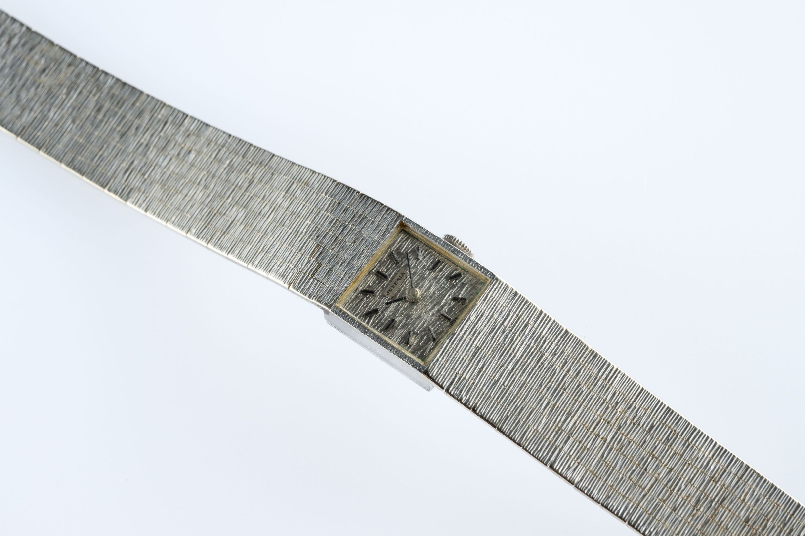 Ladies' wristwatch in 18k (750 thousandths) white gold, square case with grey dial, hours indicated by baton hour-markers. Amati ribbon strap.