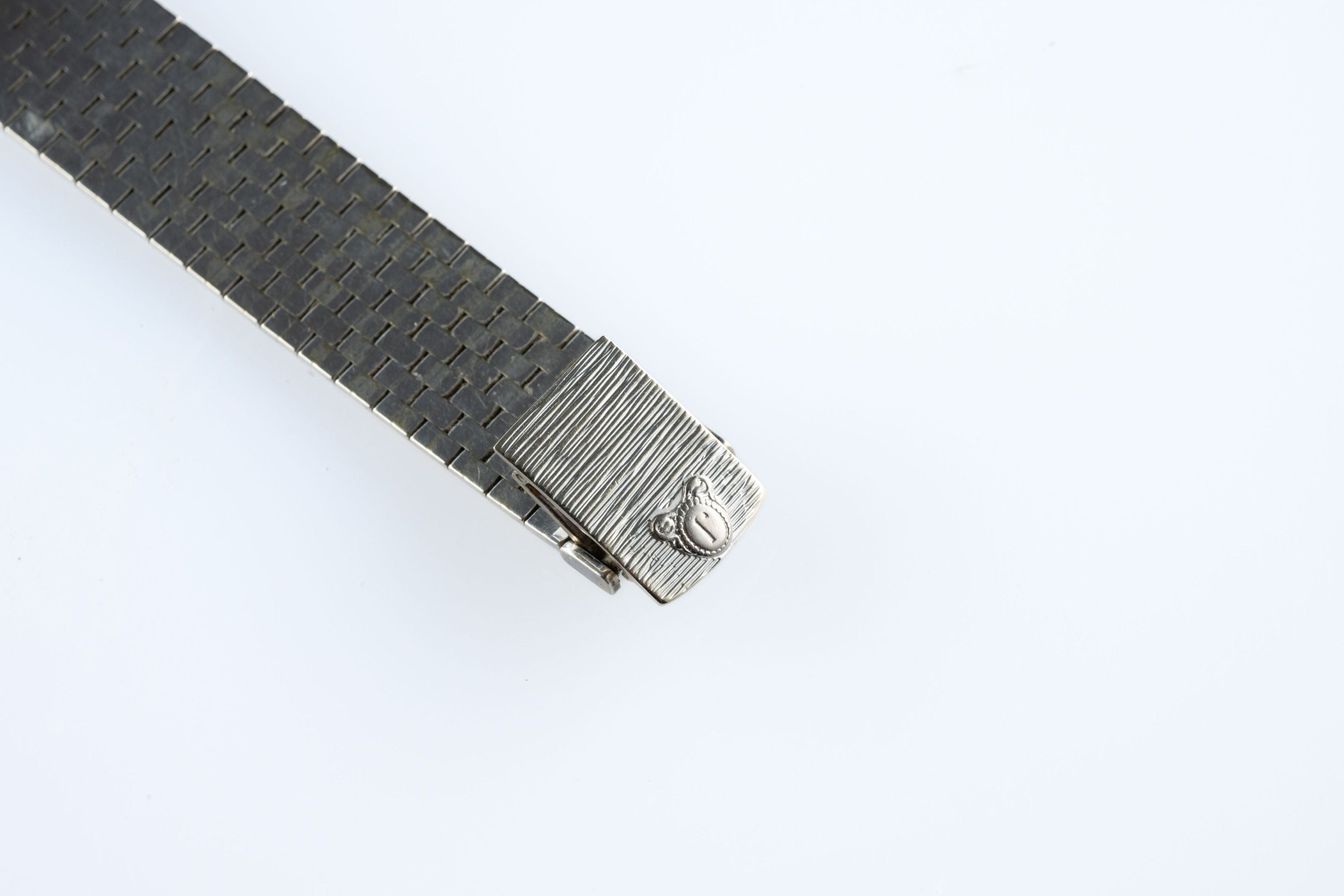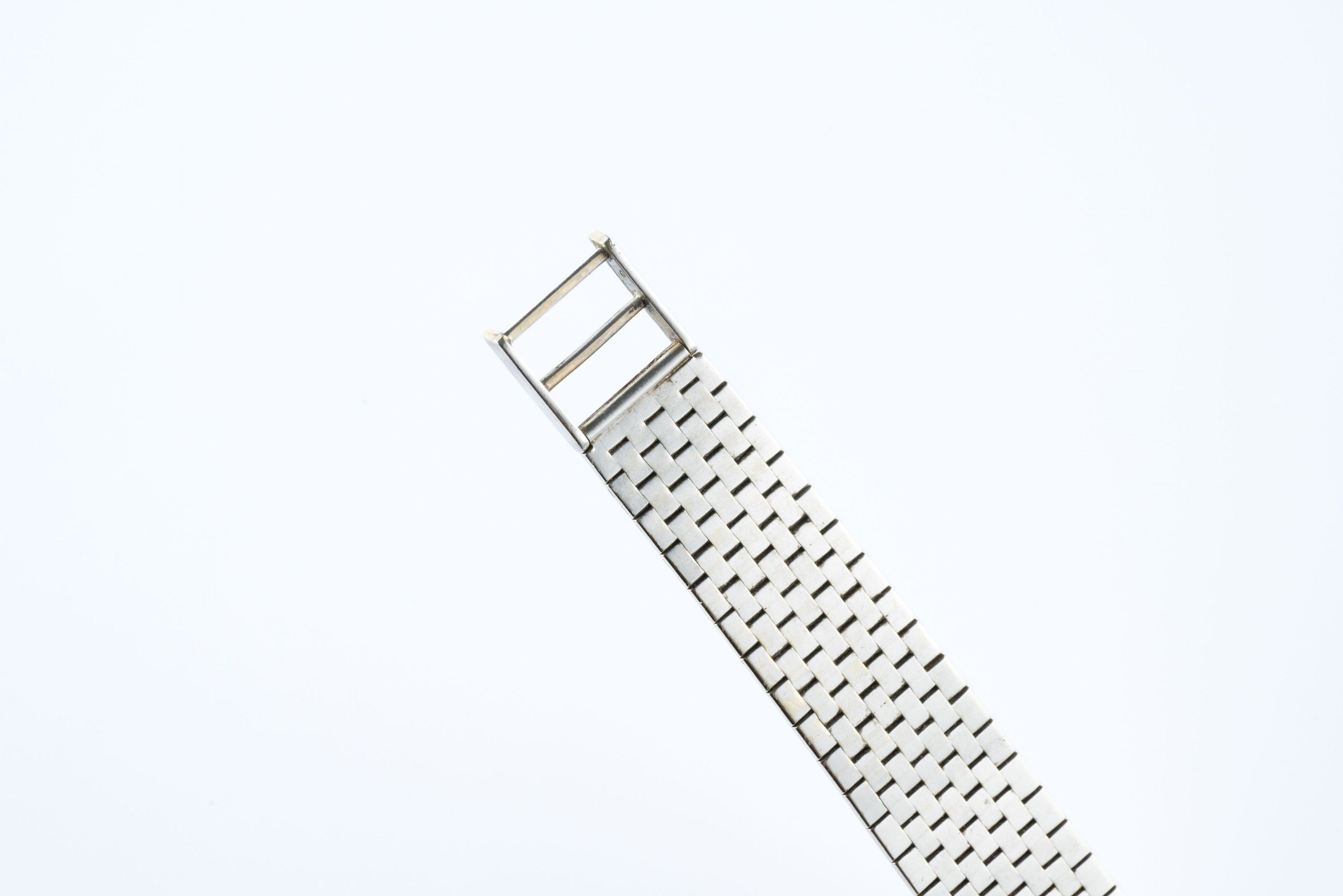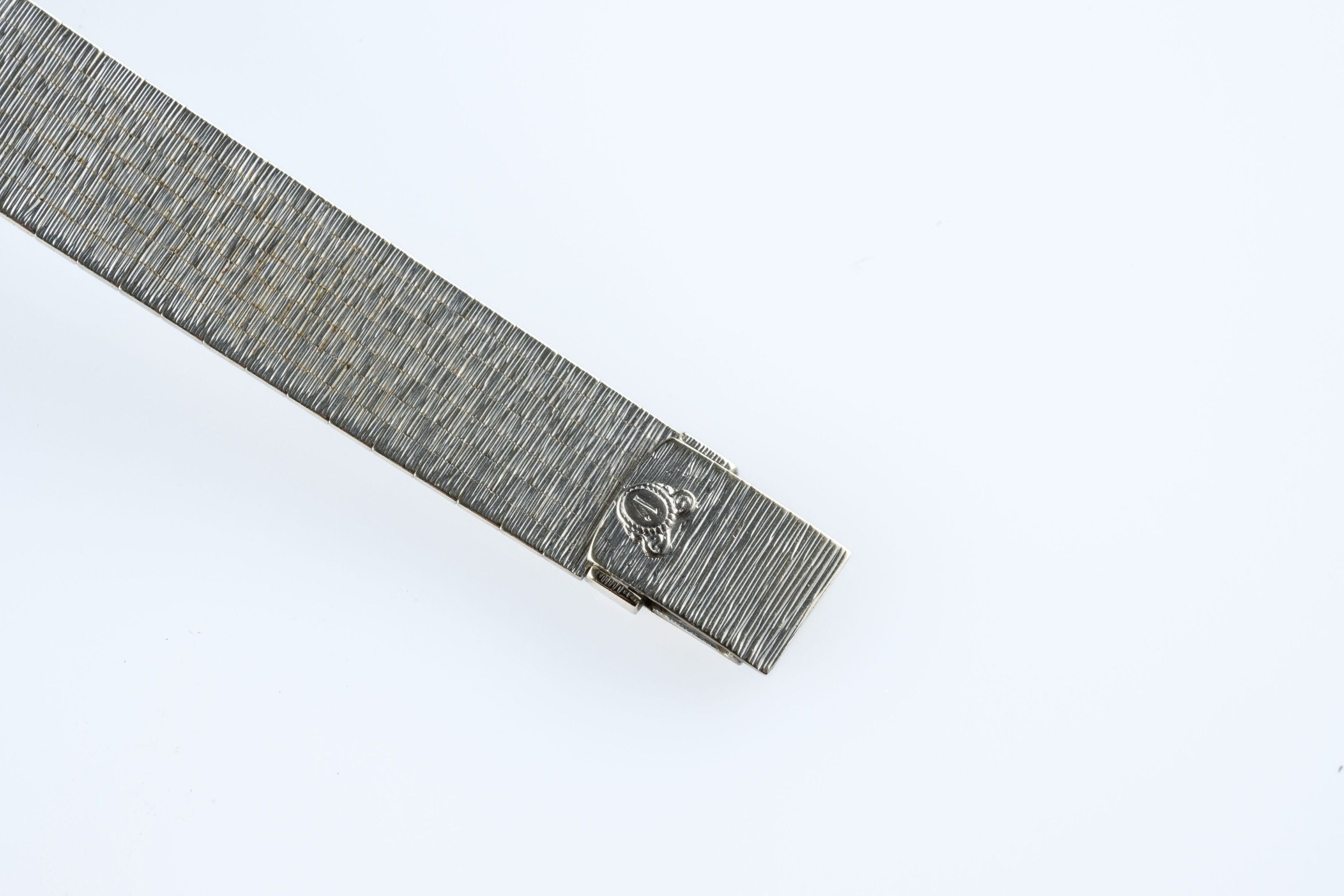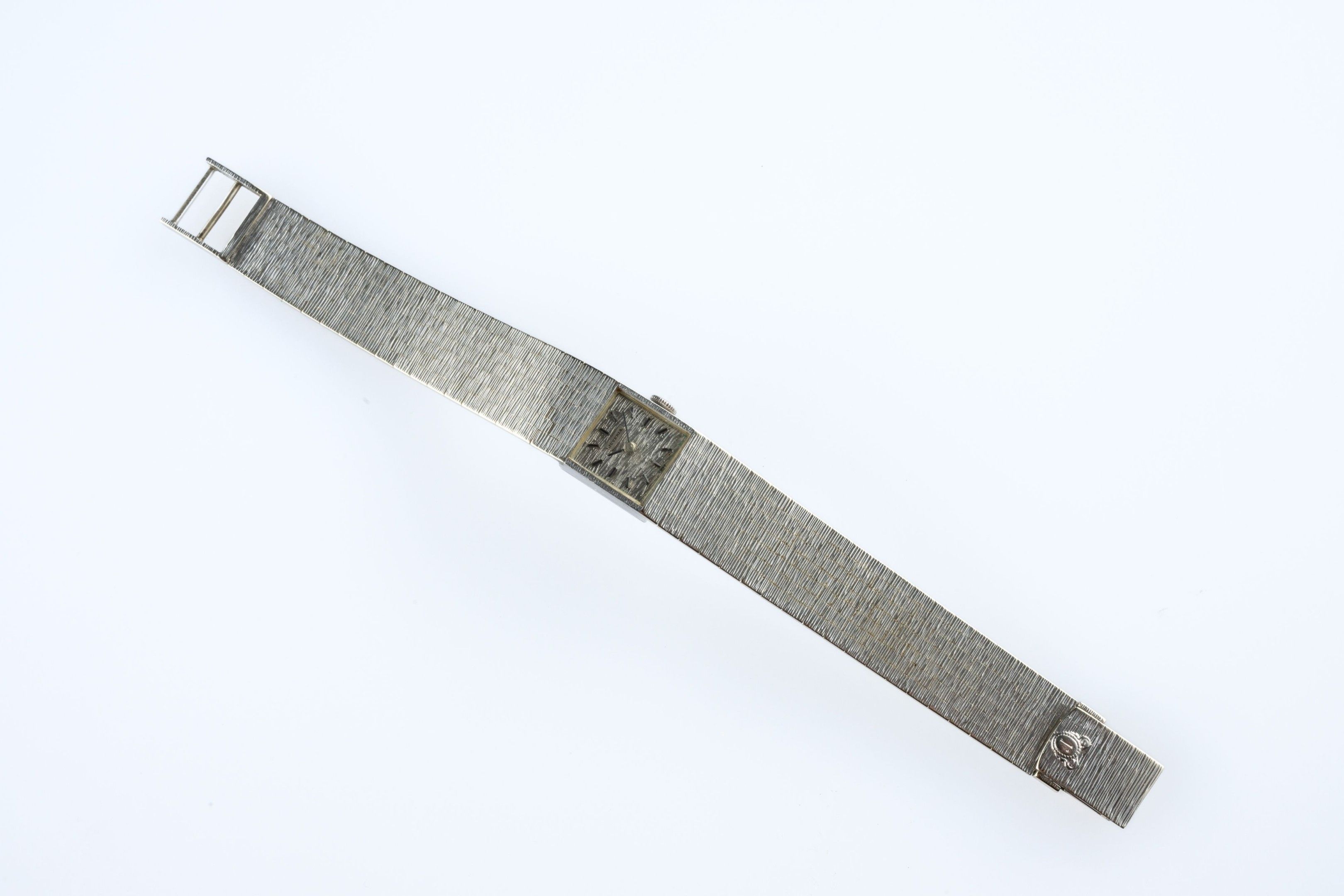 Ladies' wristwatch in 18k (750 thousandths) white gold, square case with grey dial, hours indicated by baton hour-markers. Amati ribbon strap.