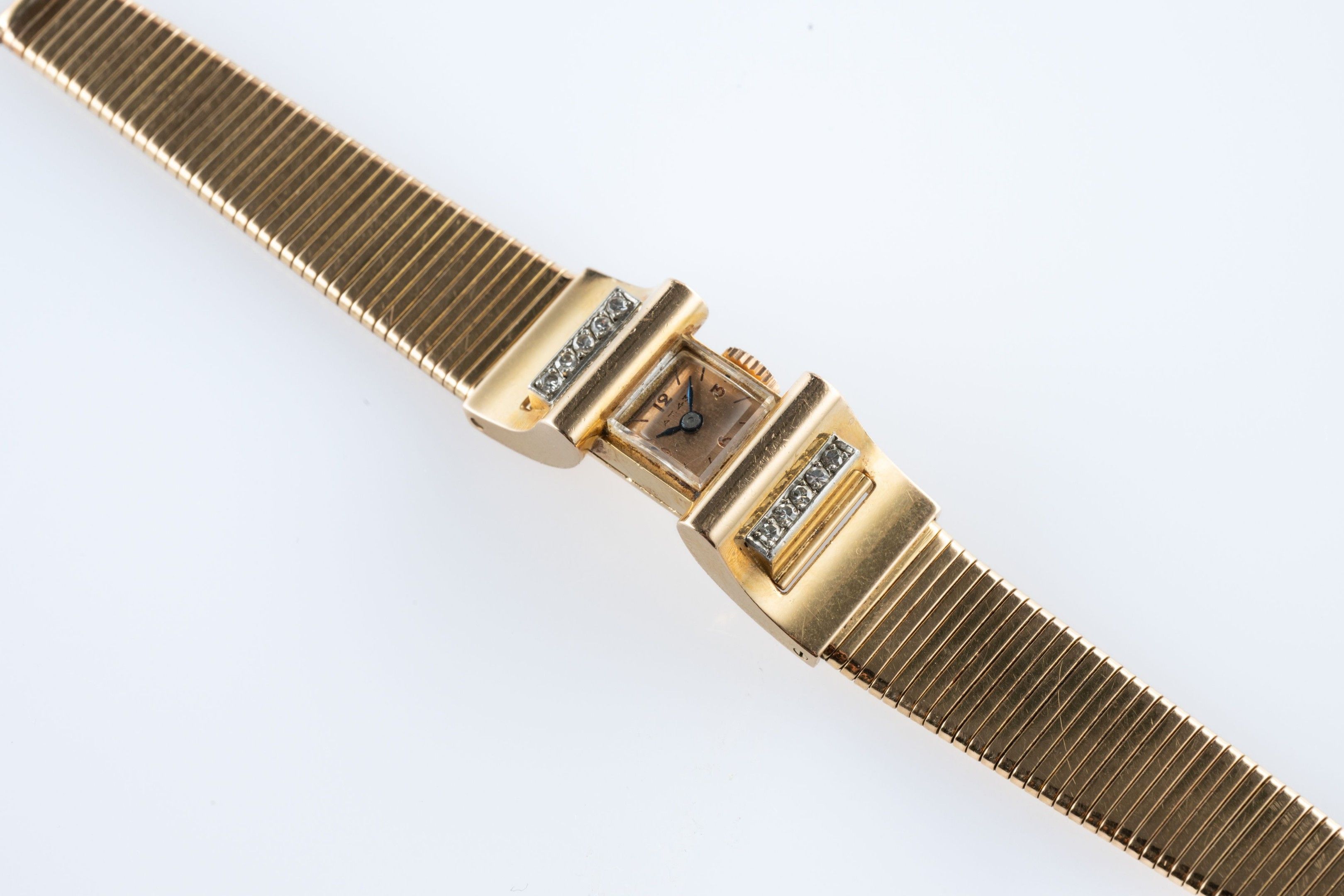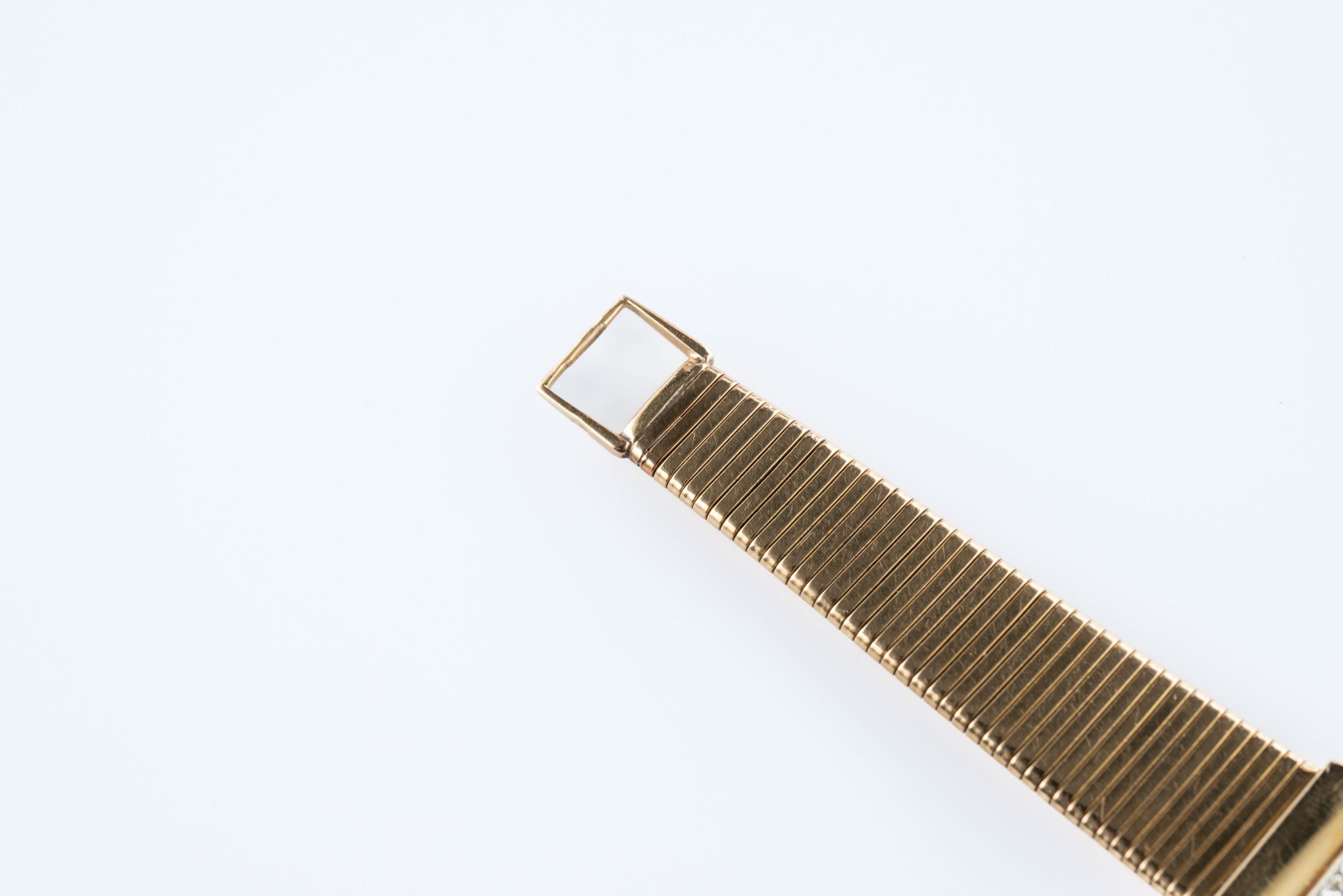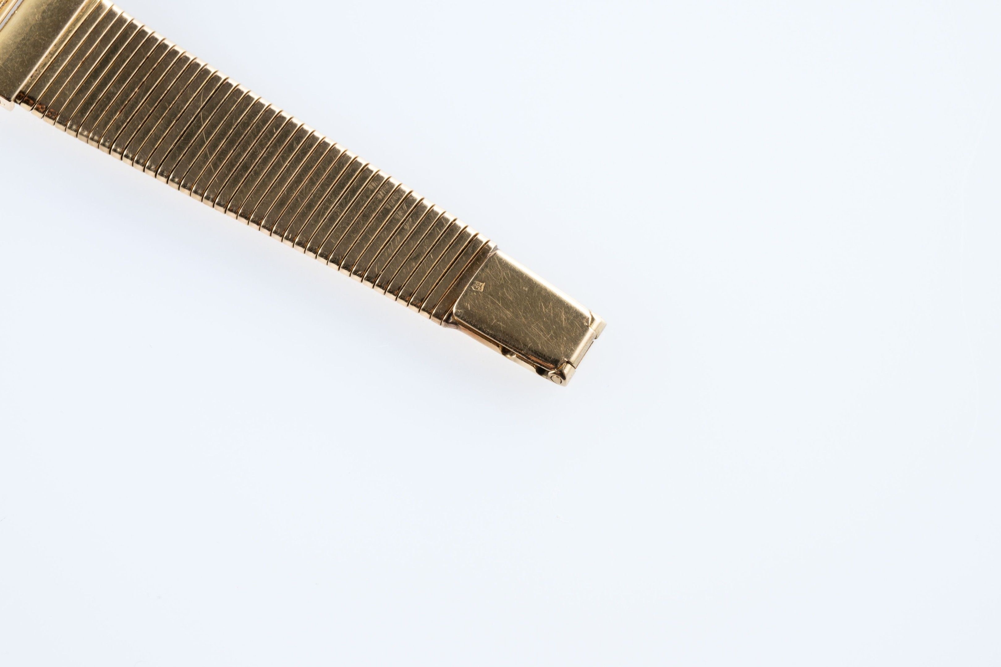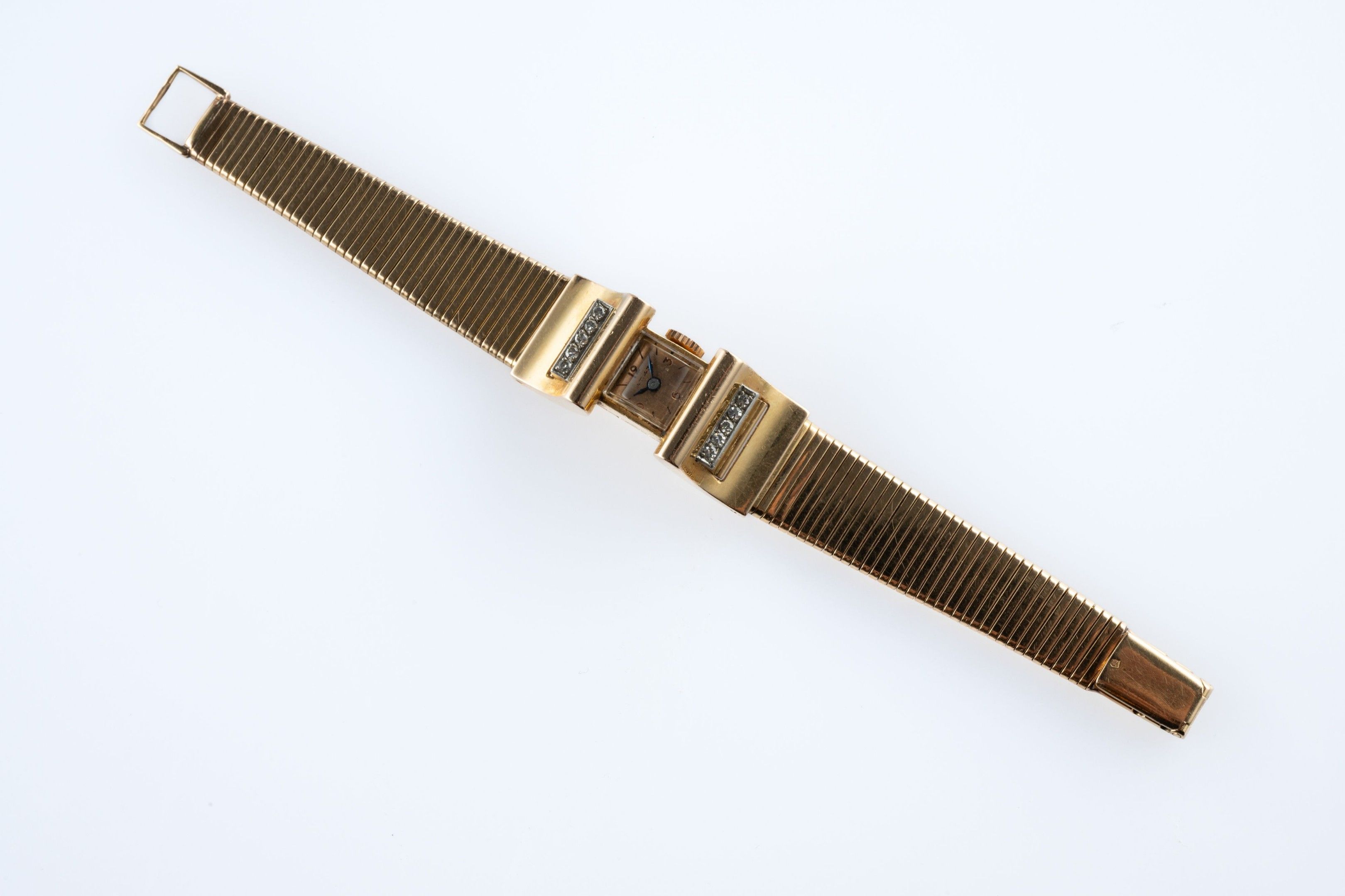 Ladies' "tank" wristwatch in 18k (750 thousandths) yellow gold, the square case with champagne dial held by curved clasps highlighted with small diamonds, the bracelet with tubogaz mesh.