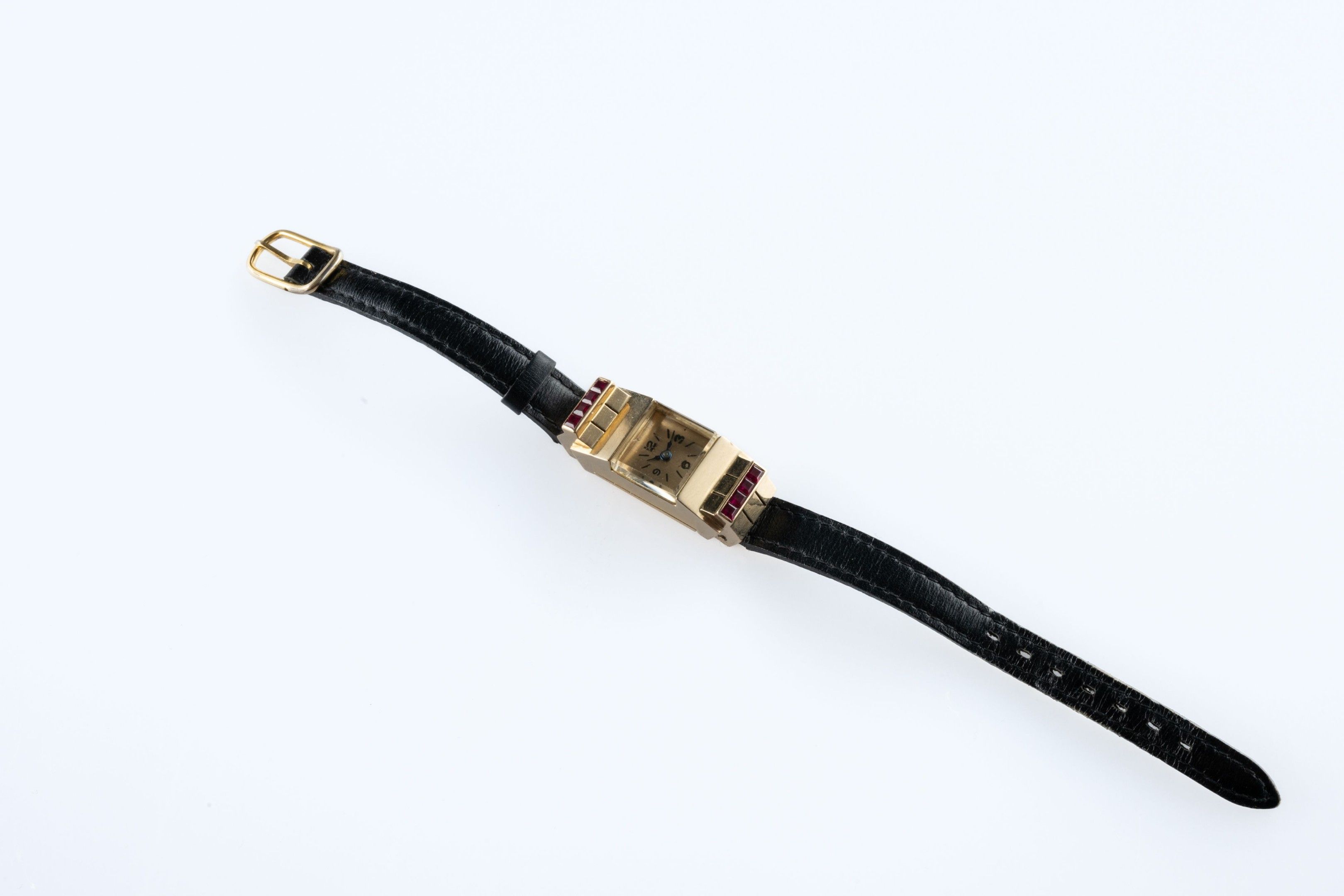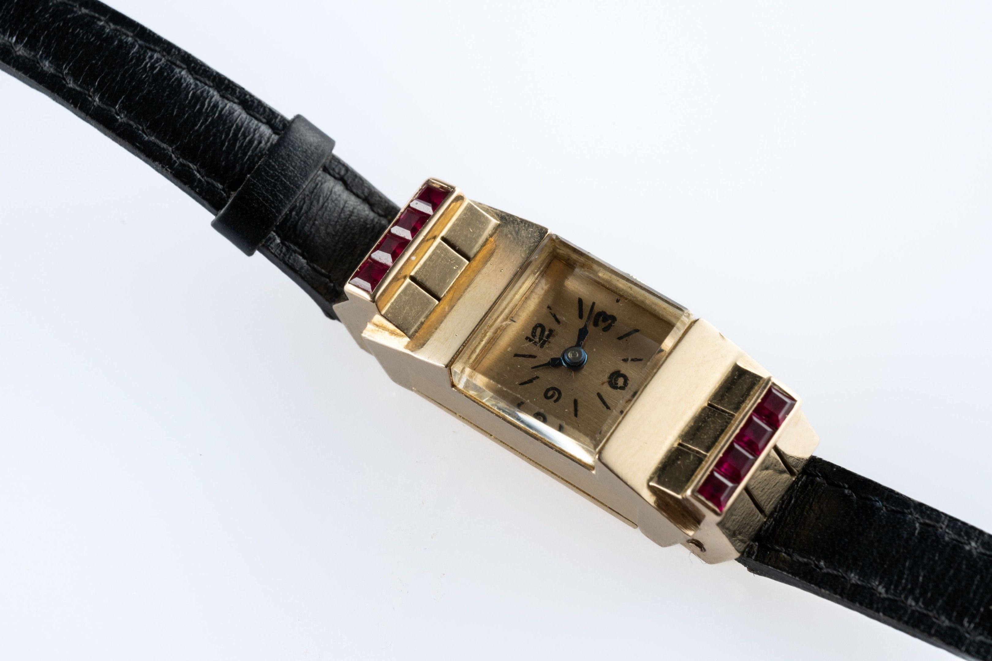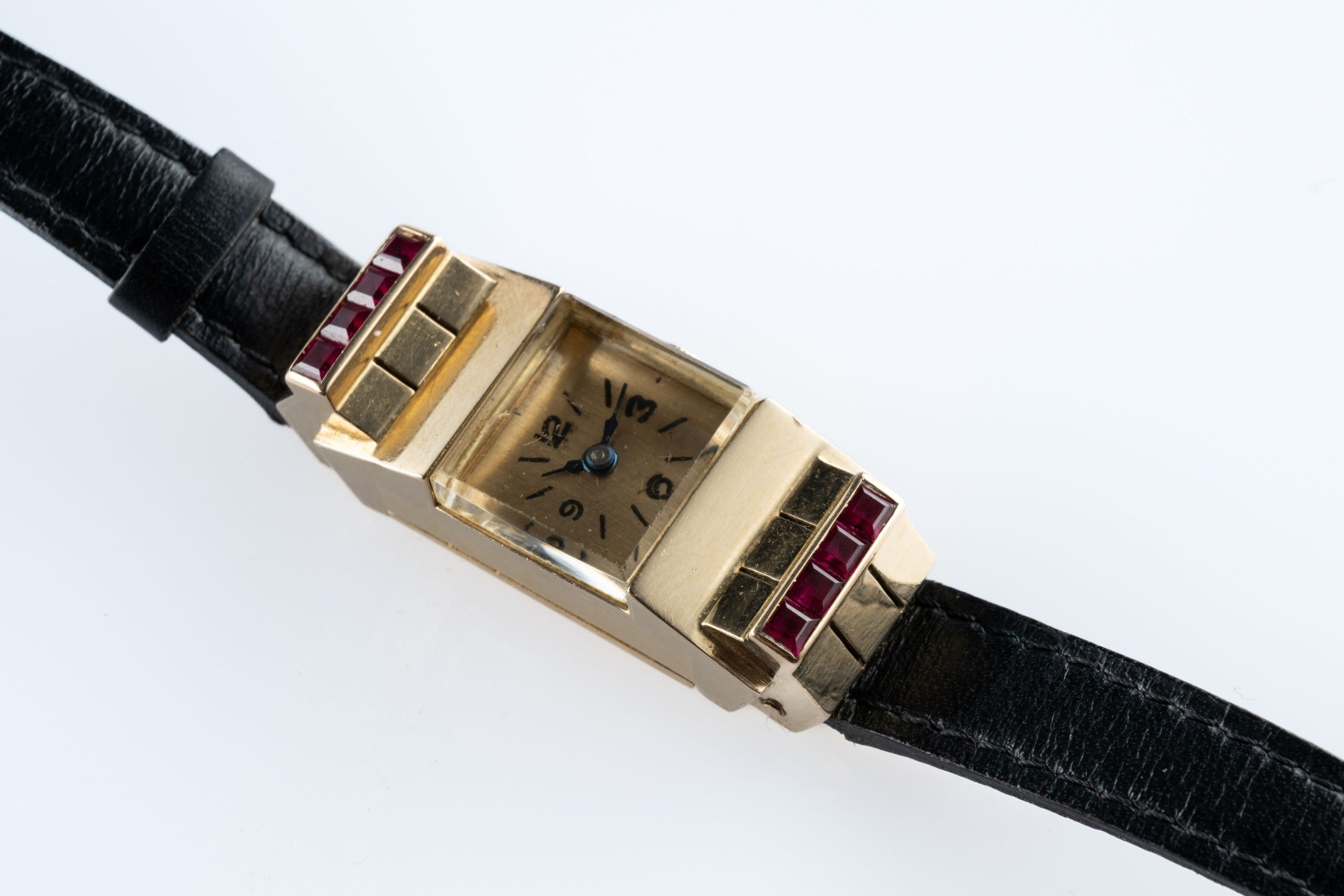 Ladies' "tank" wristwatch Rectangular case in 18k (750 thousandths) yellow gold framed with calibrated rubies, gilt dial with ararbe numerals and baton hour-markers.