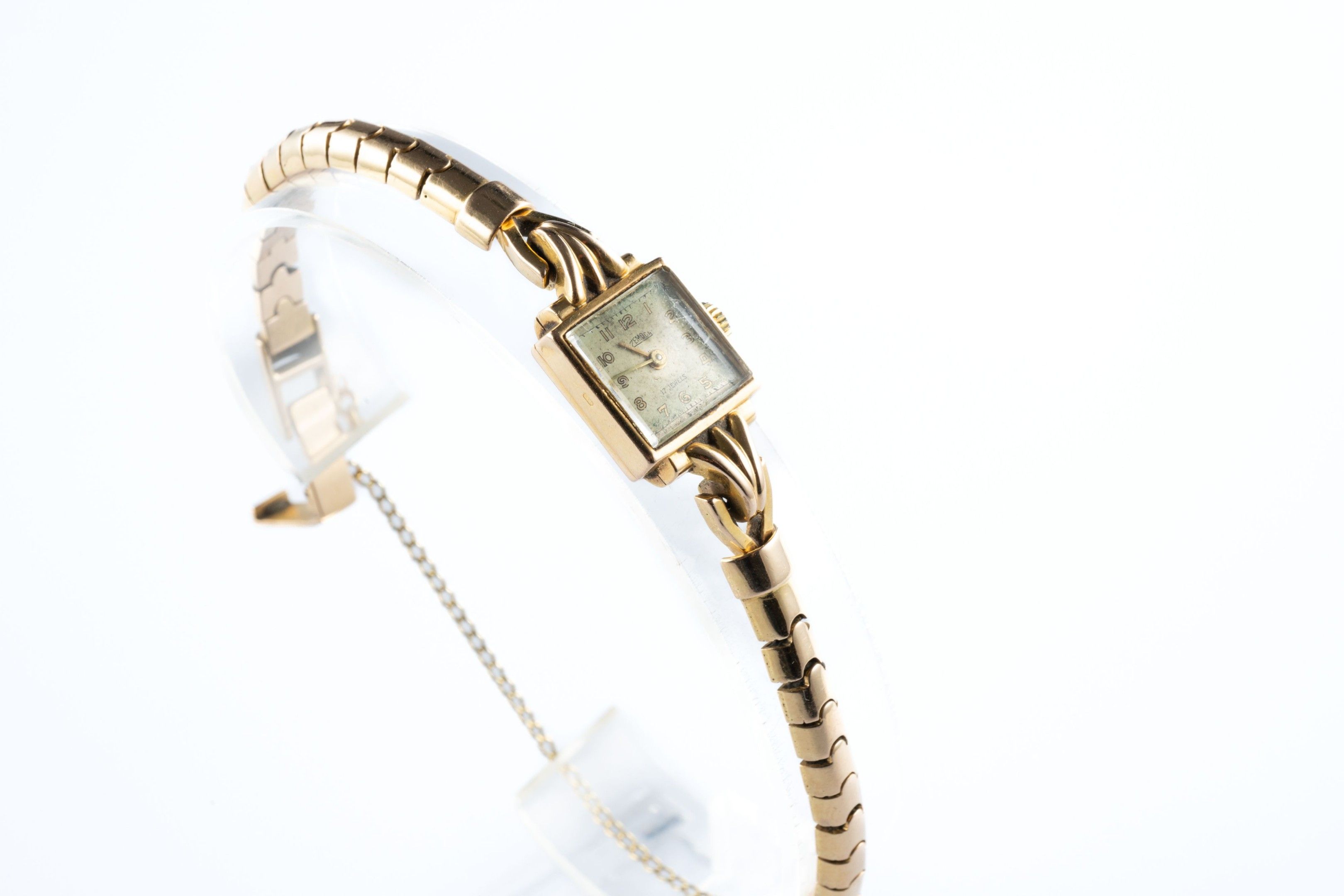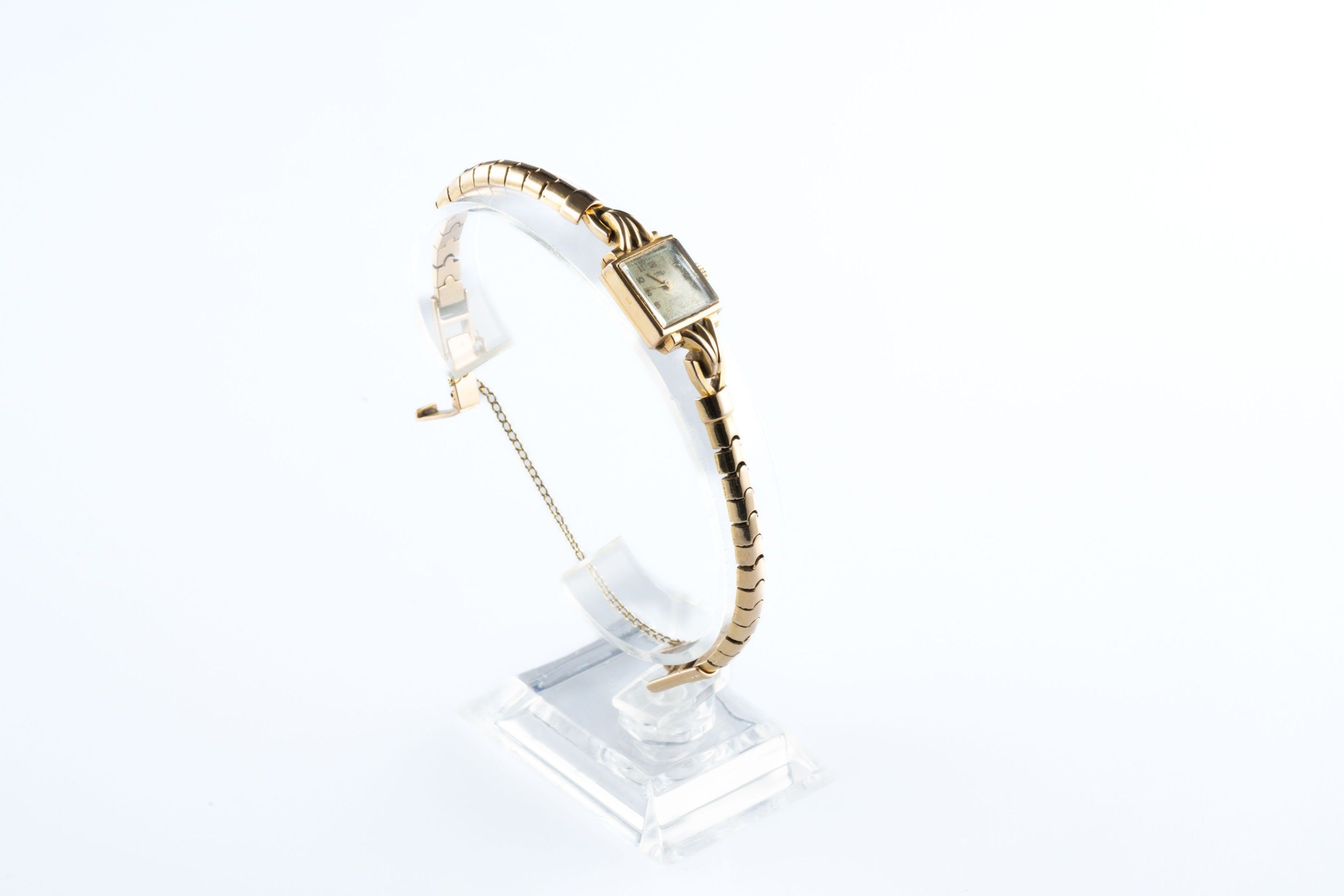 Ladies' wristwatch in 18k (750 thousandths) yellow gold, square case, dial with Arabic numerals. Articulated snake link bracelet.