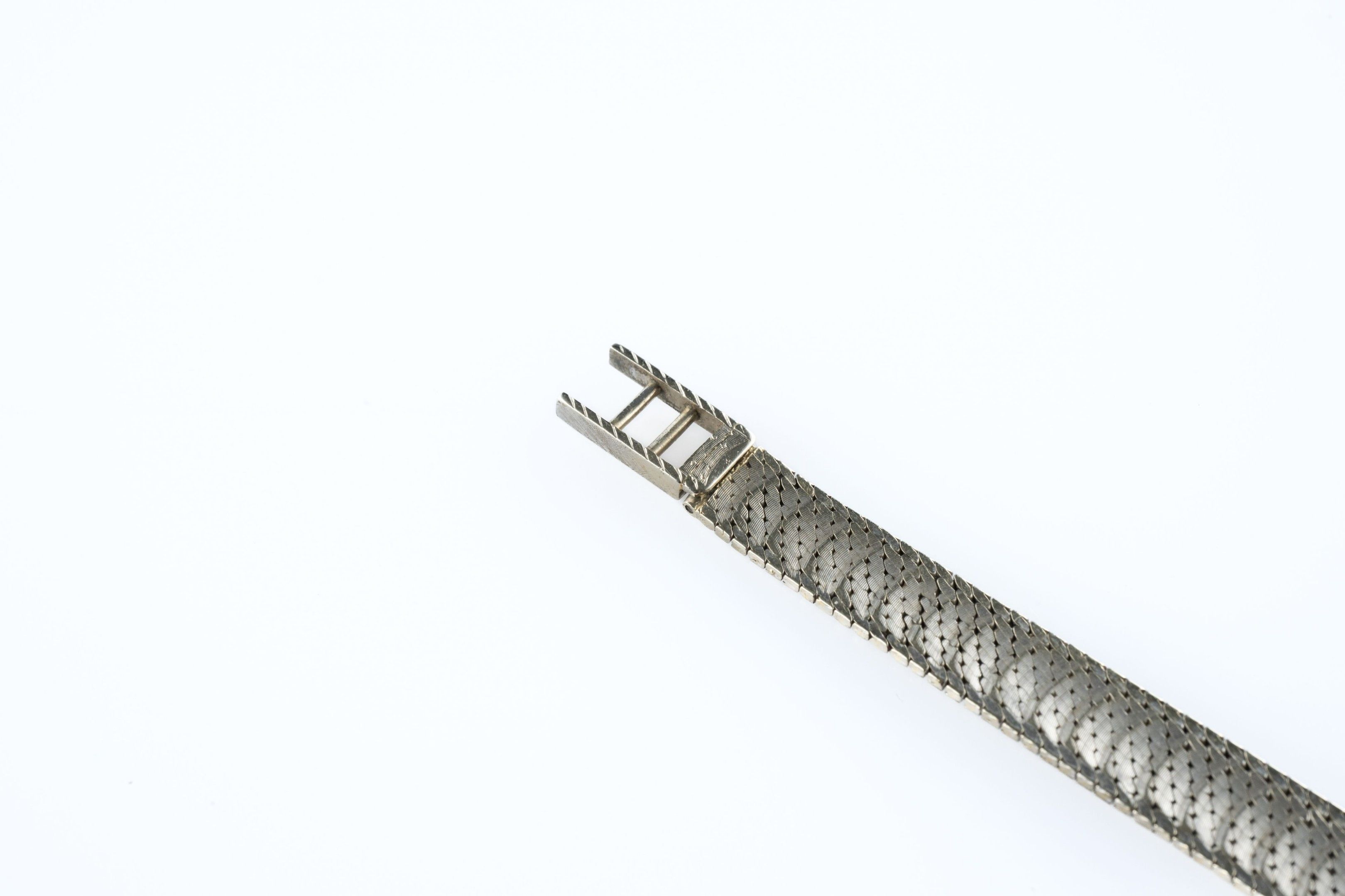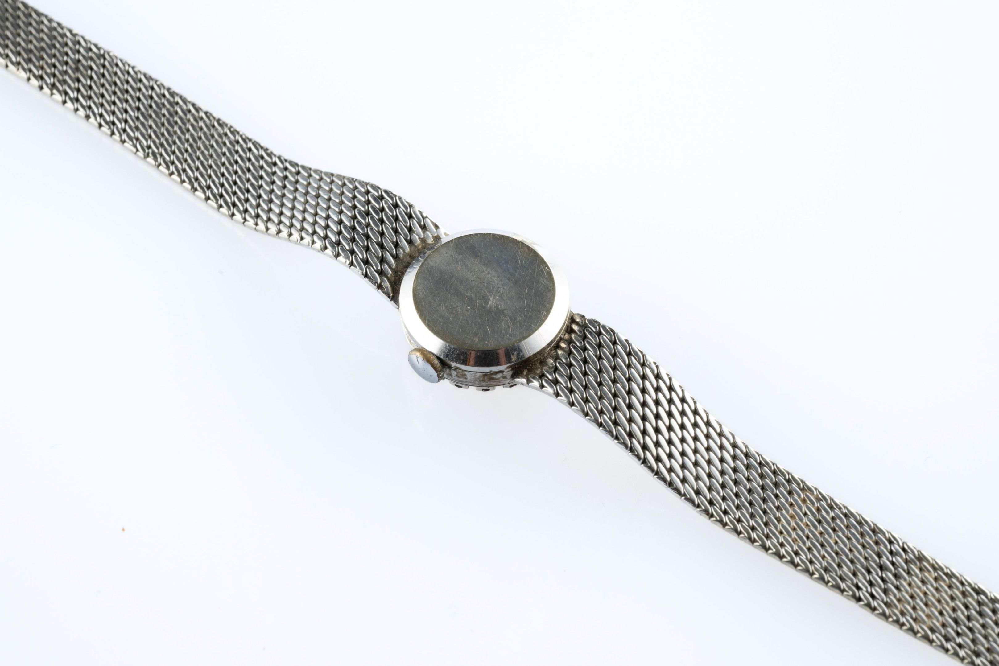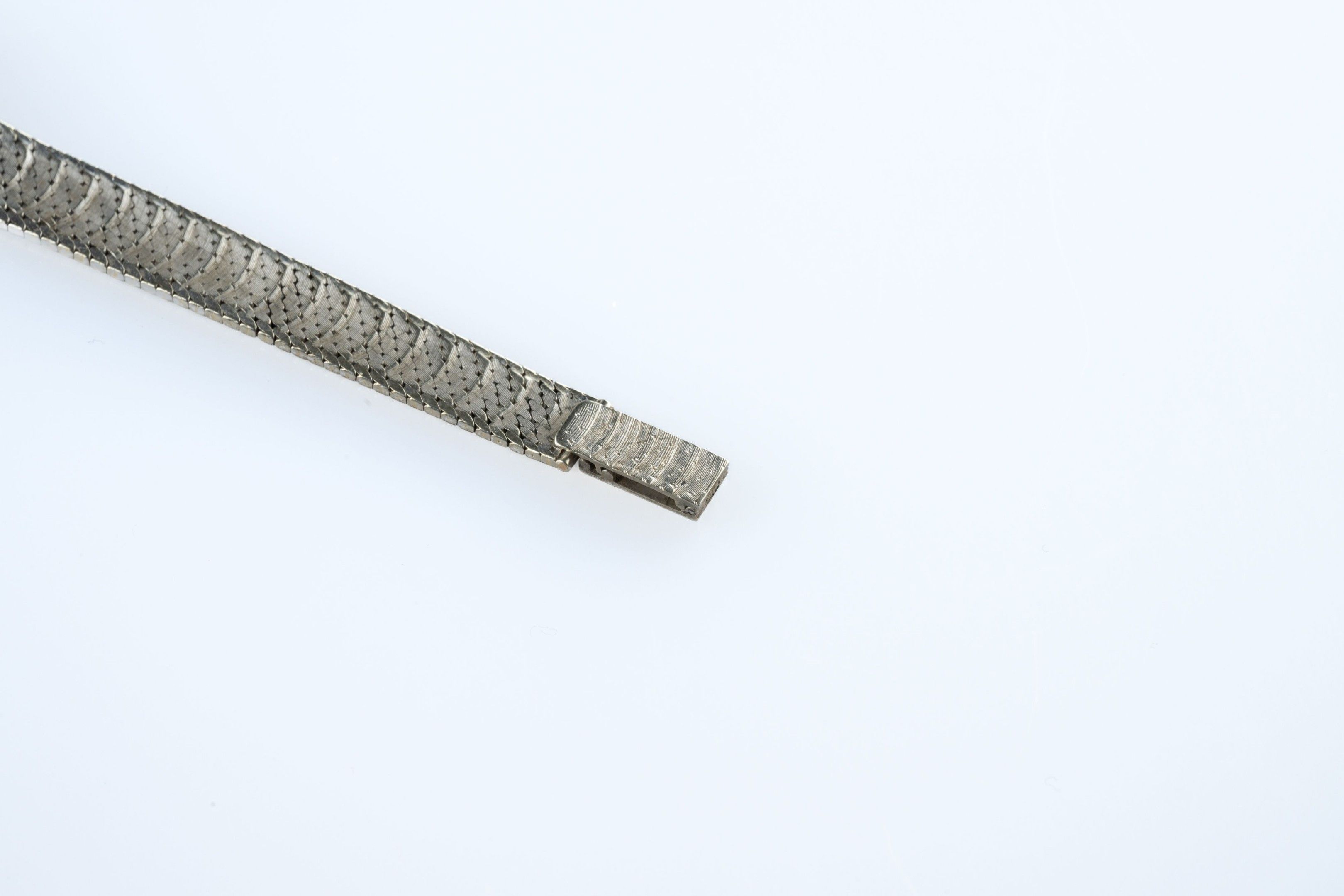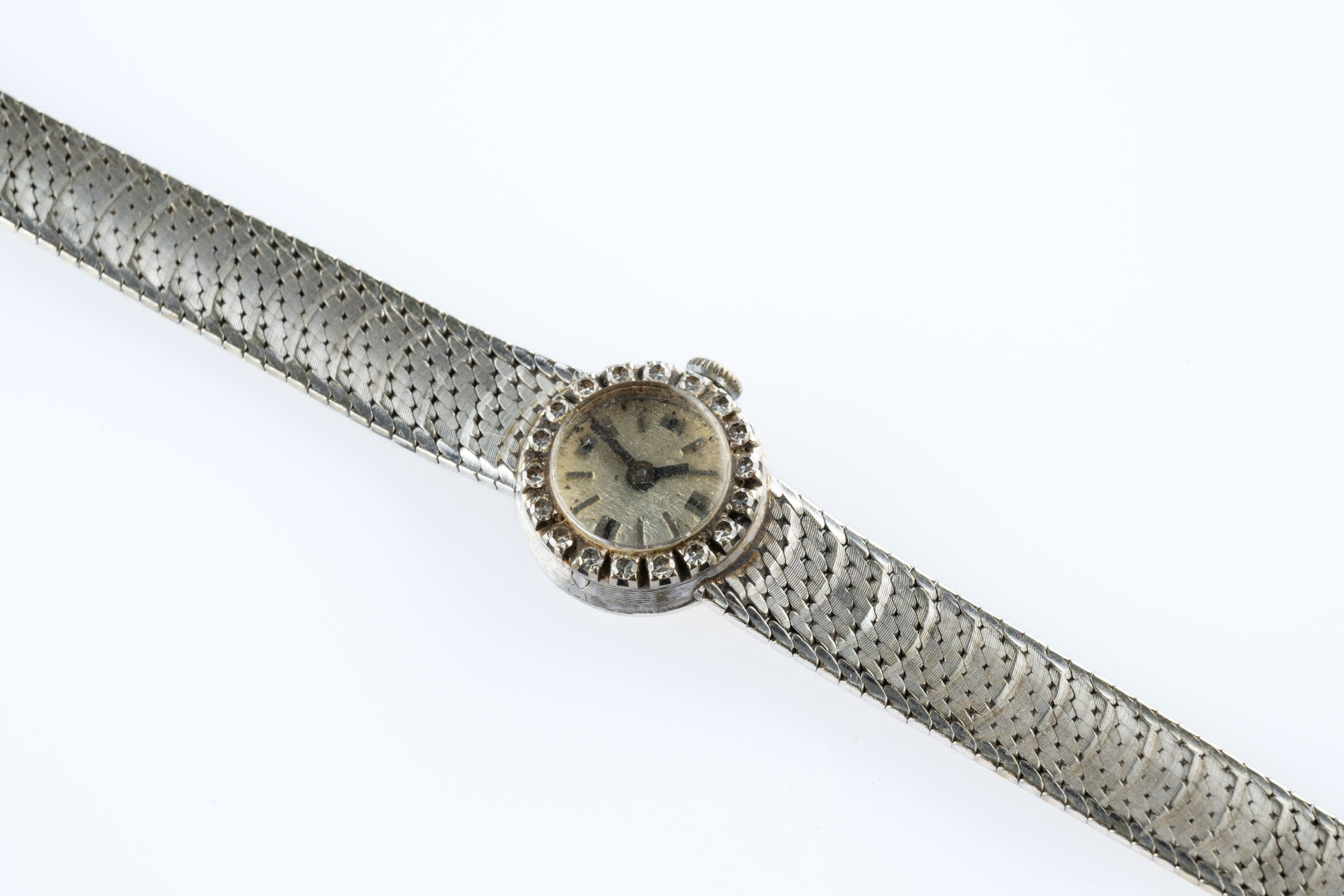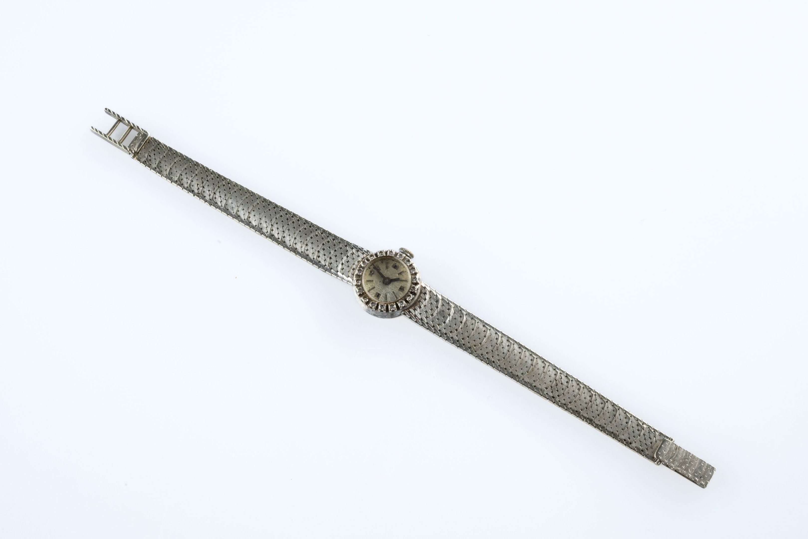 Ladies' wristwatch in 18k (750 thousandths) white gold, round case surrounded by small diamonds, dial with grey background and baton hour markers. Milanese link bracelet with fluted effect.