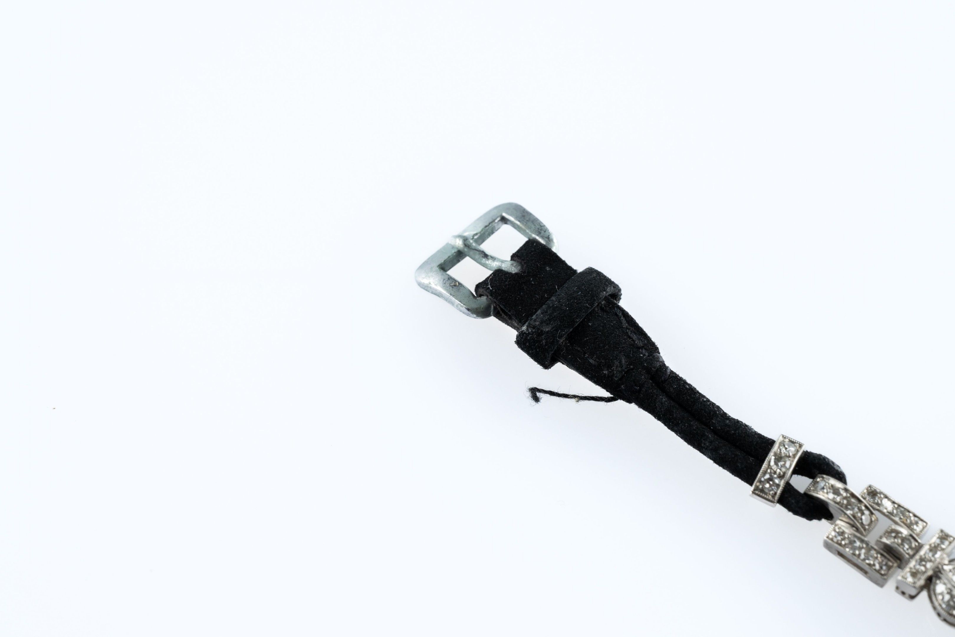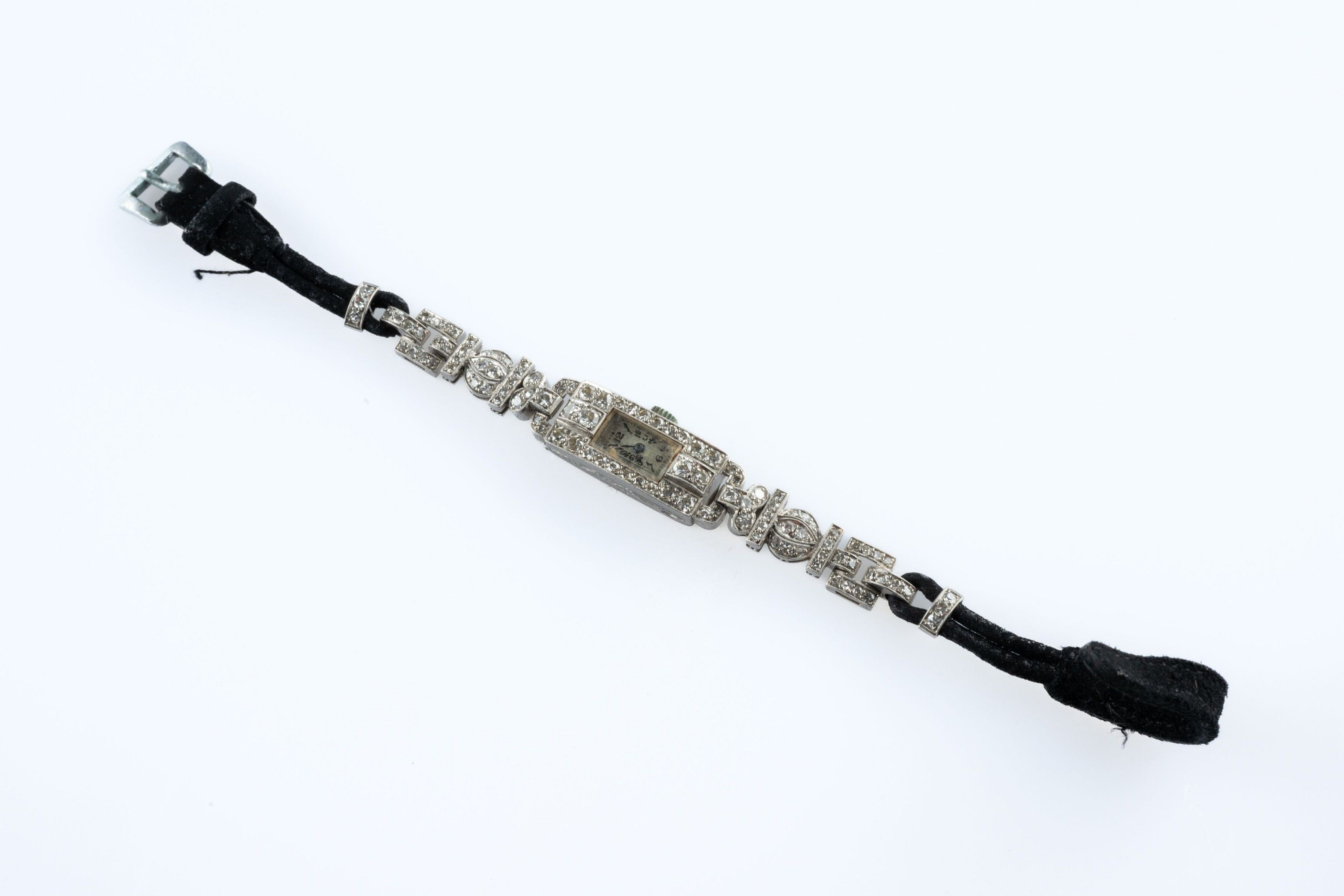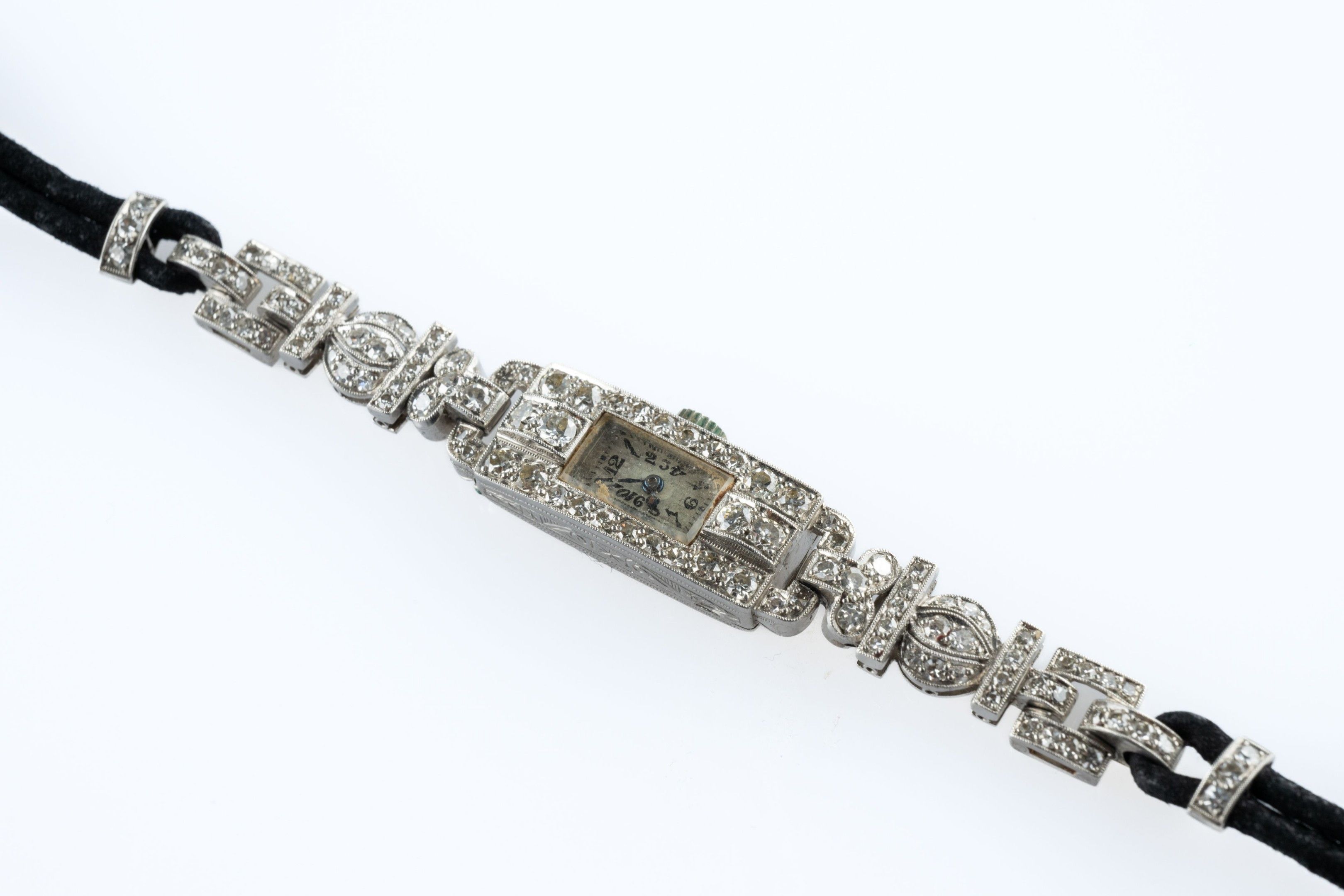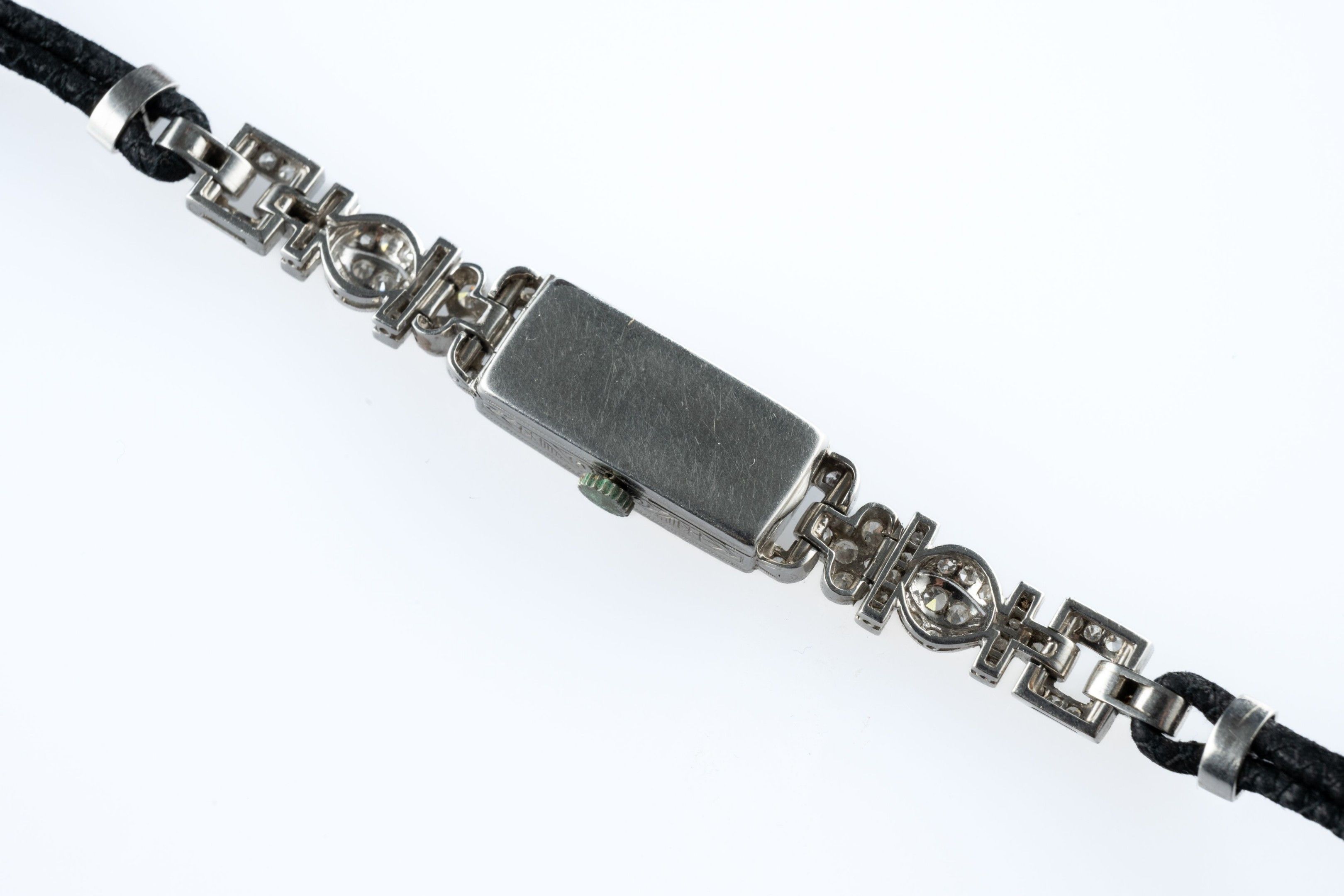 Ladies' wristwatch, case and mounting in 18k (750 thousandths) white gold and platinum (850 thousandths), the clasps and case paved with small round diamonds.