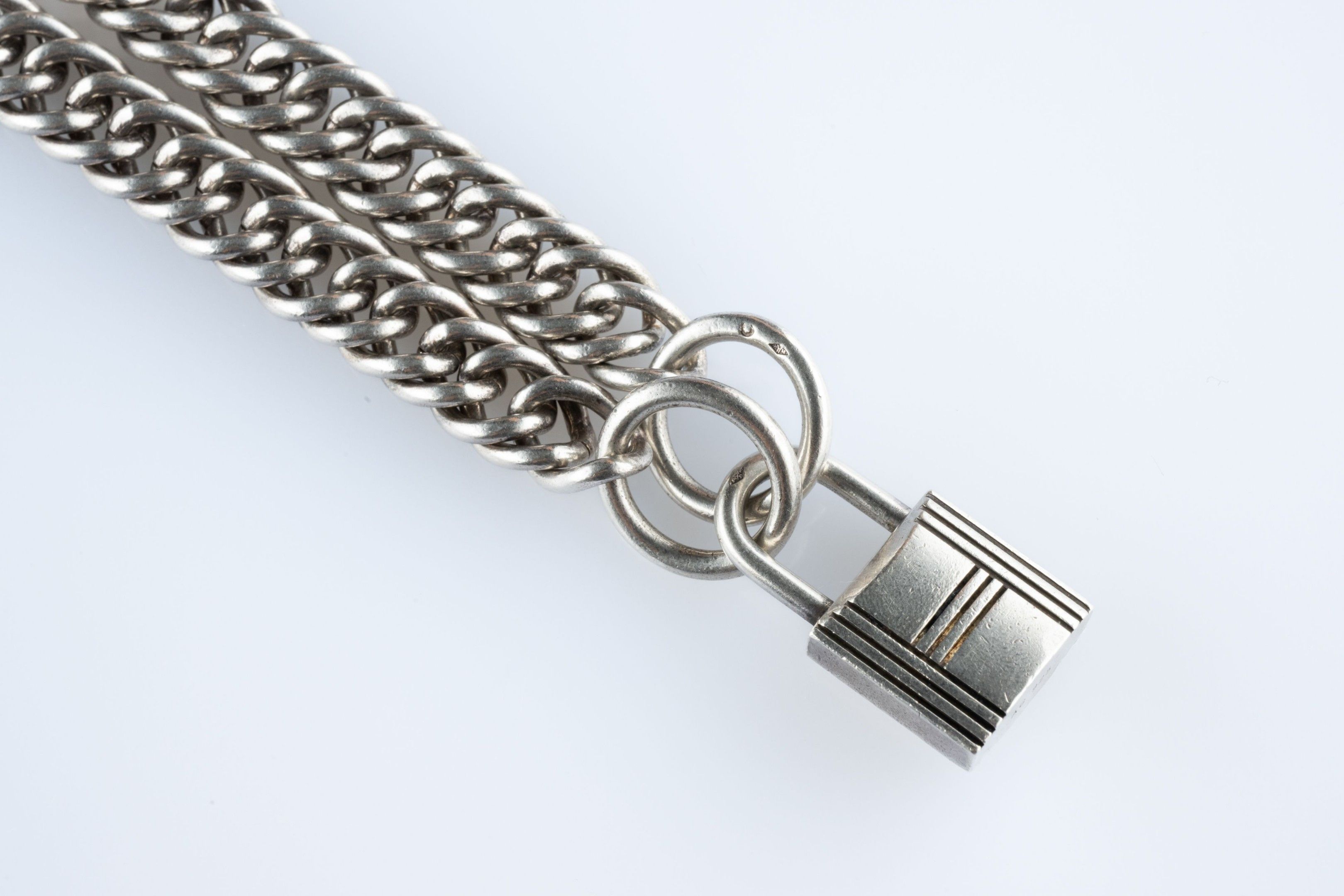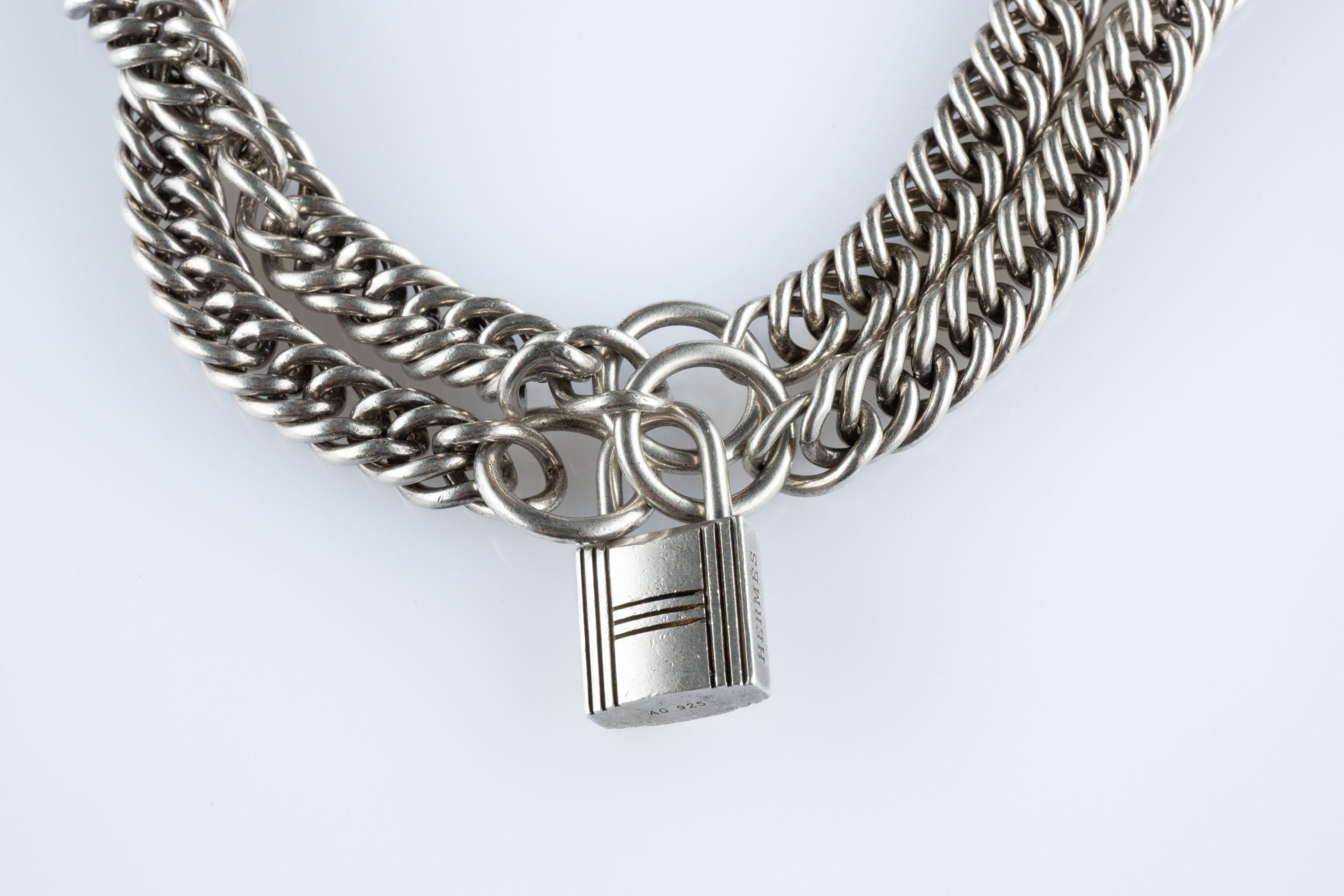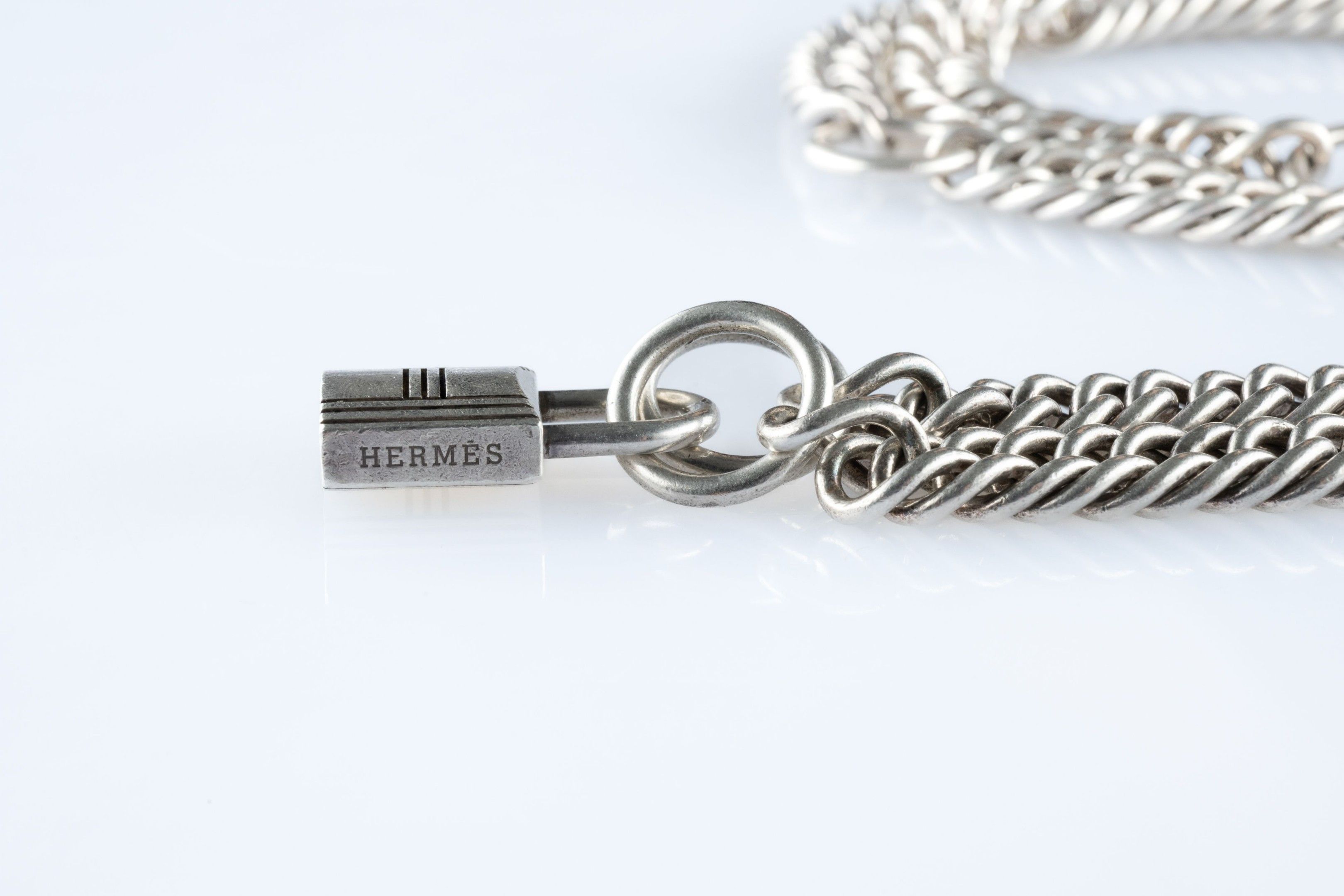 Premium HERMES. Silver long necklace with curb chain and "Kelly" pad…