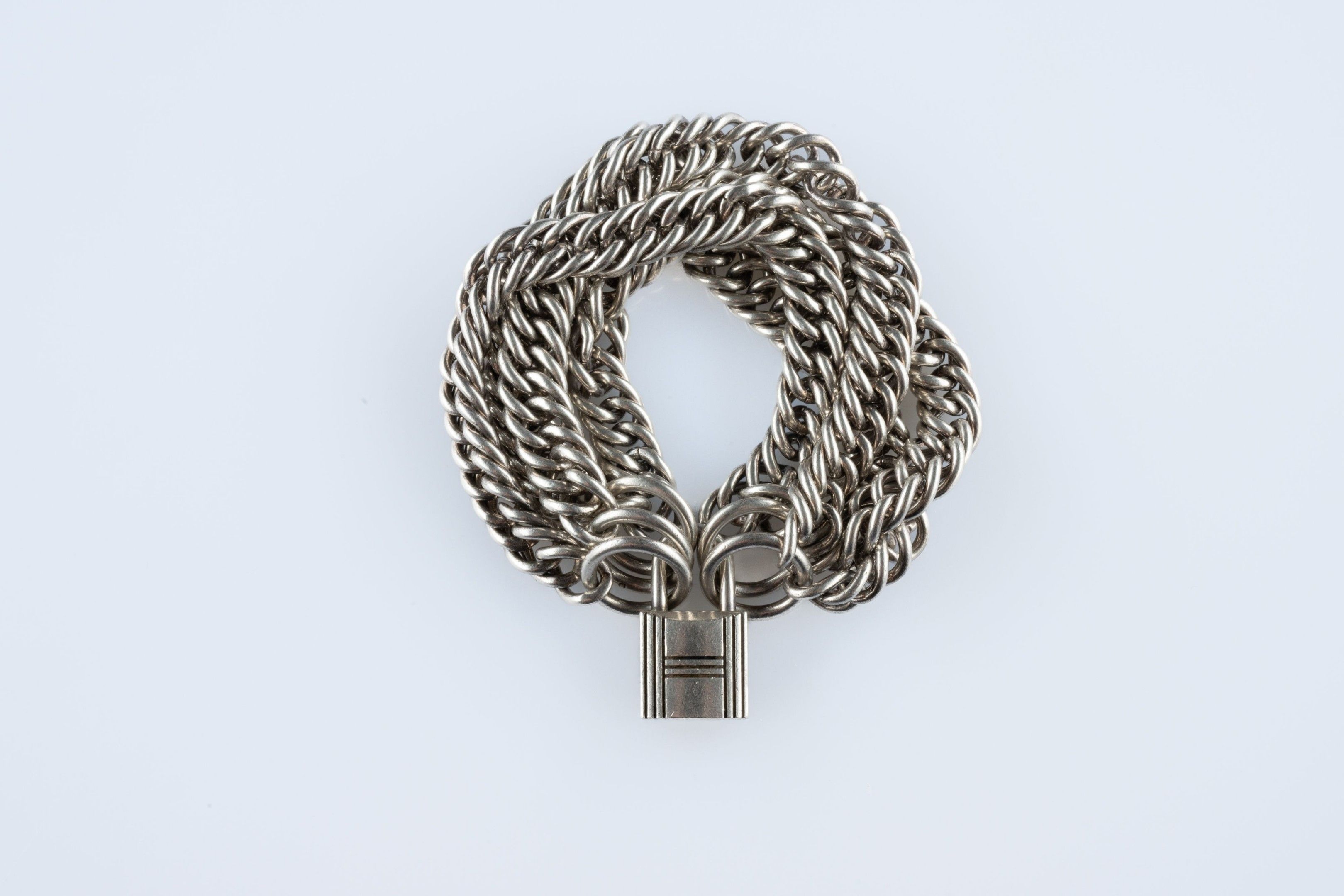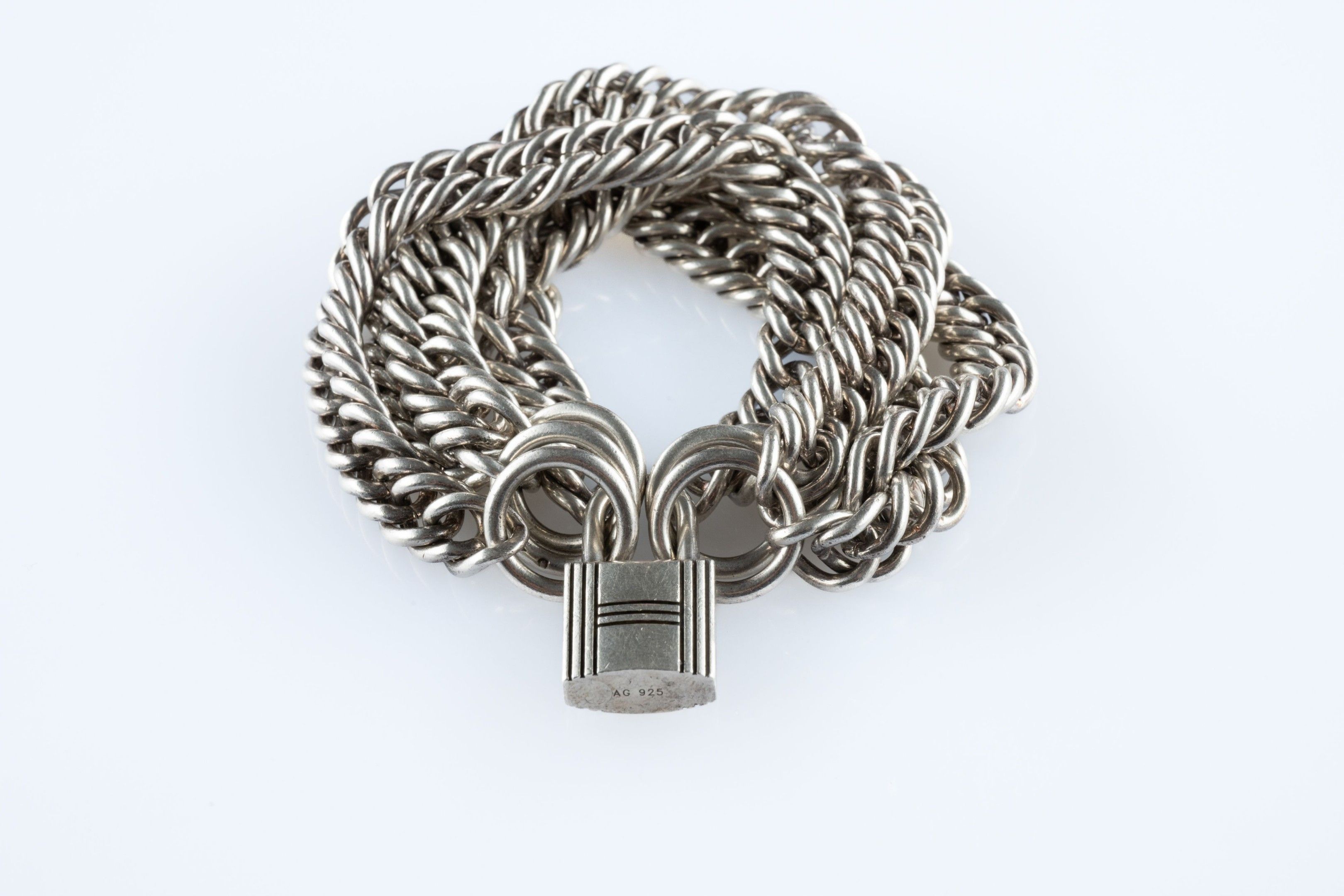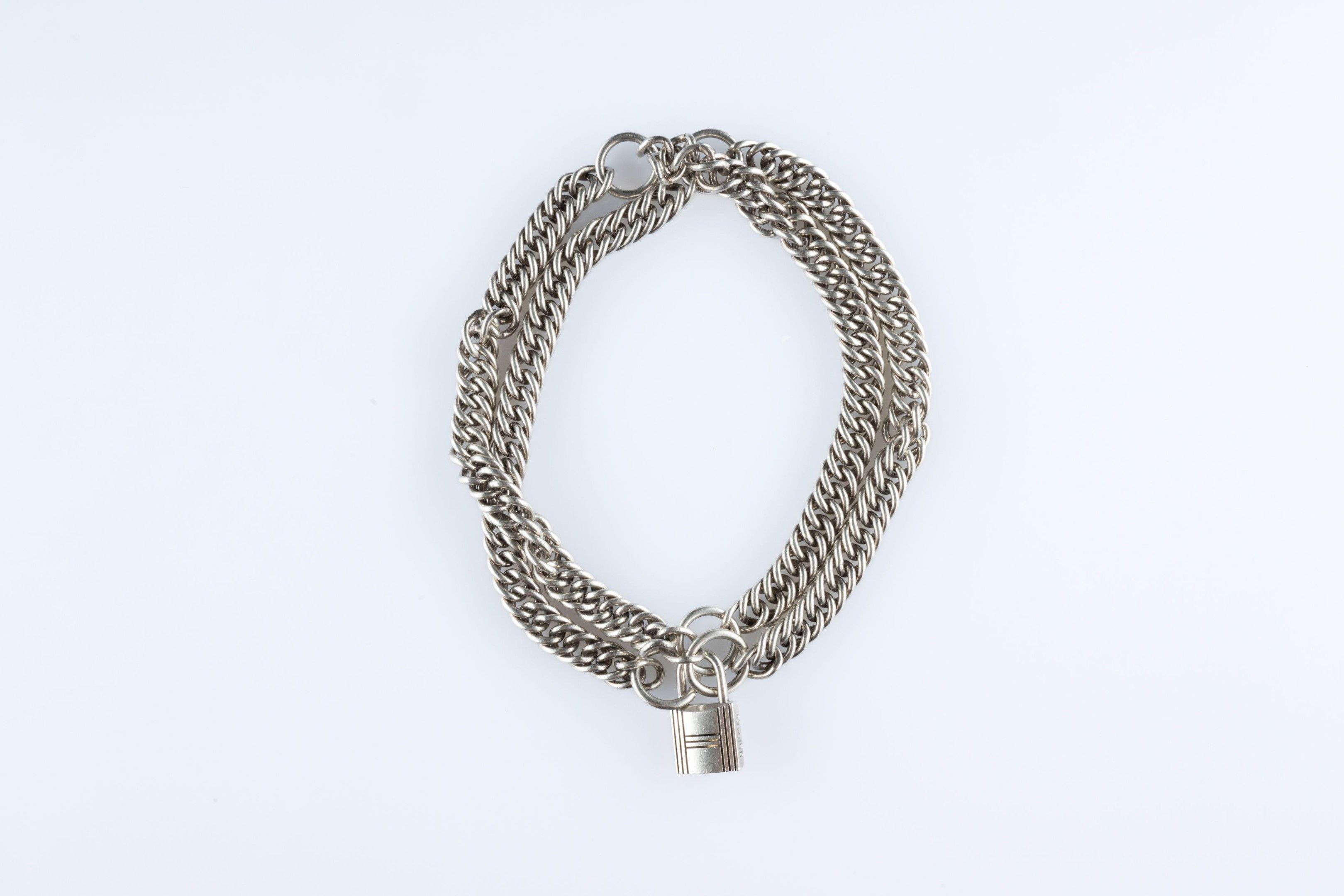 Premium HERMES. Silver long necklace with curb chain and "Kelly" pad…