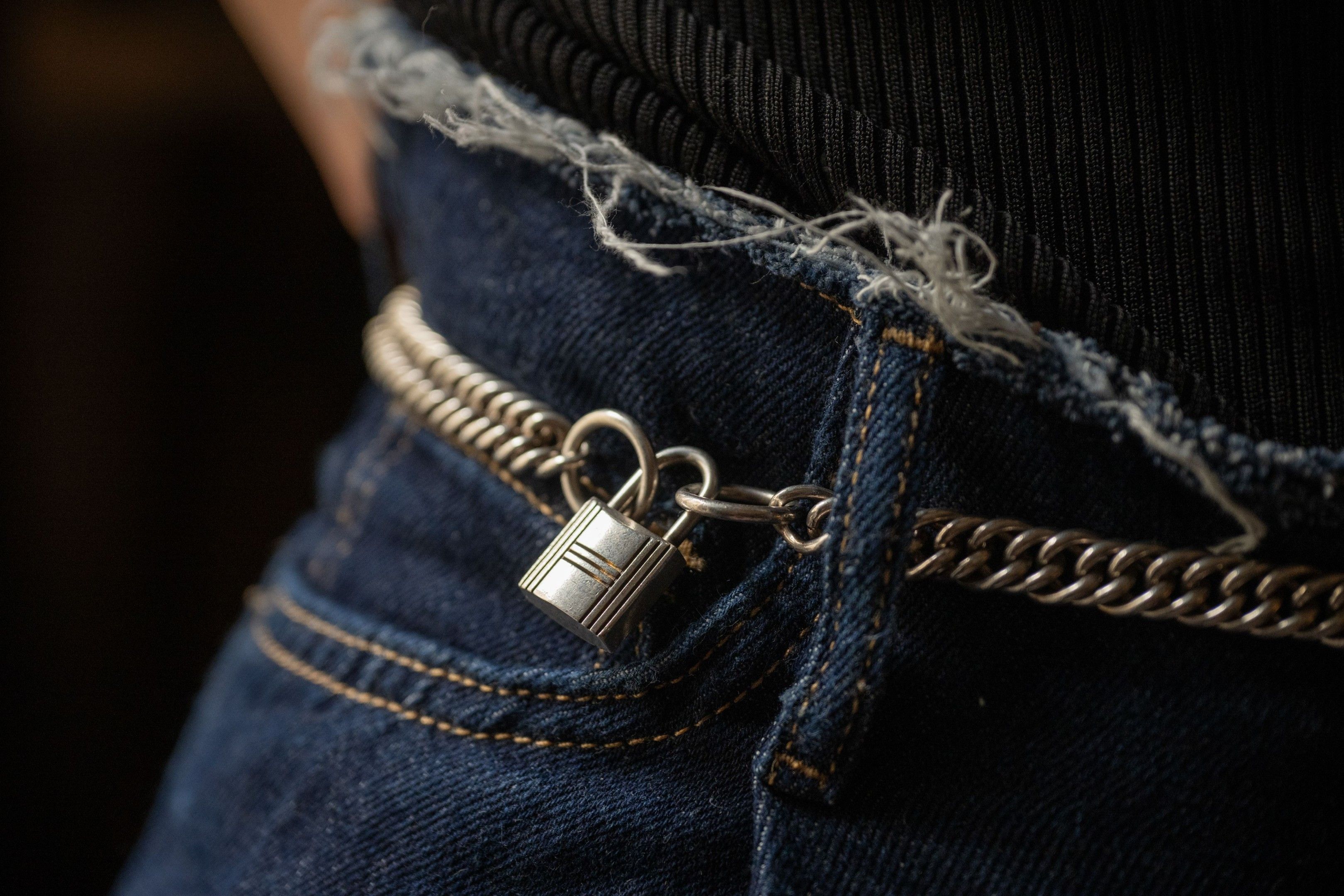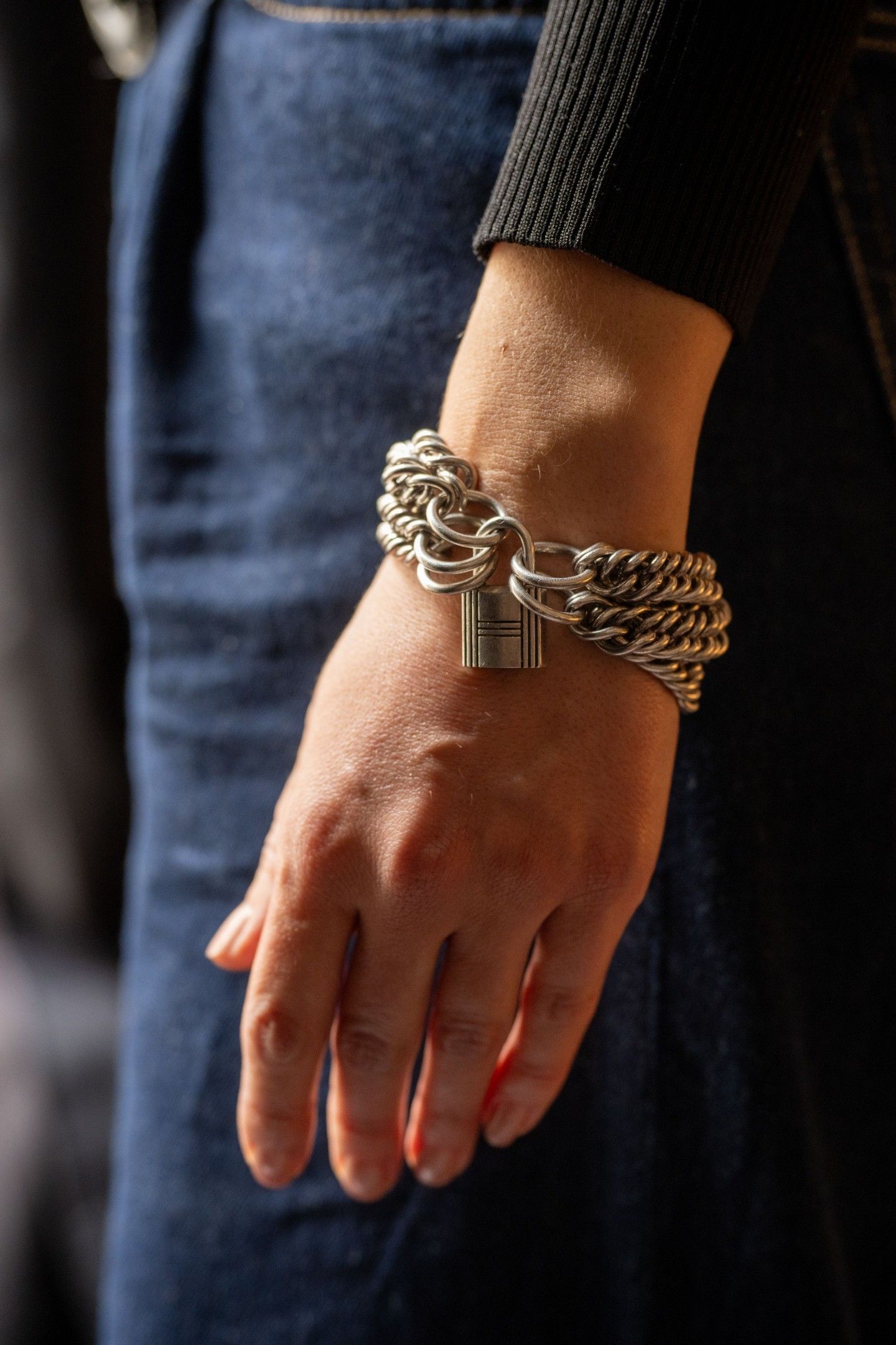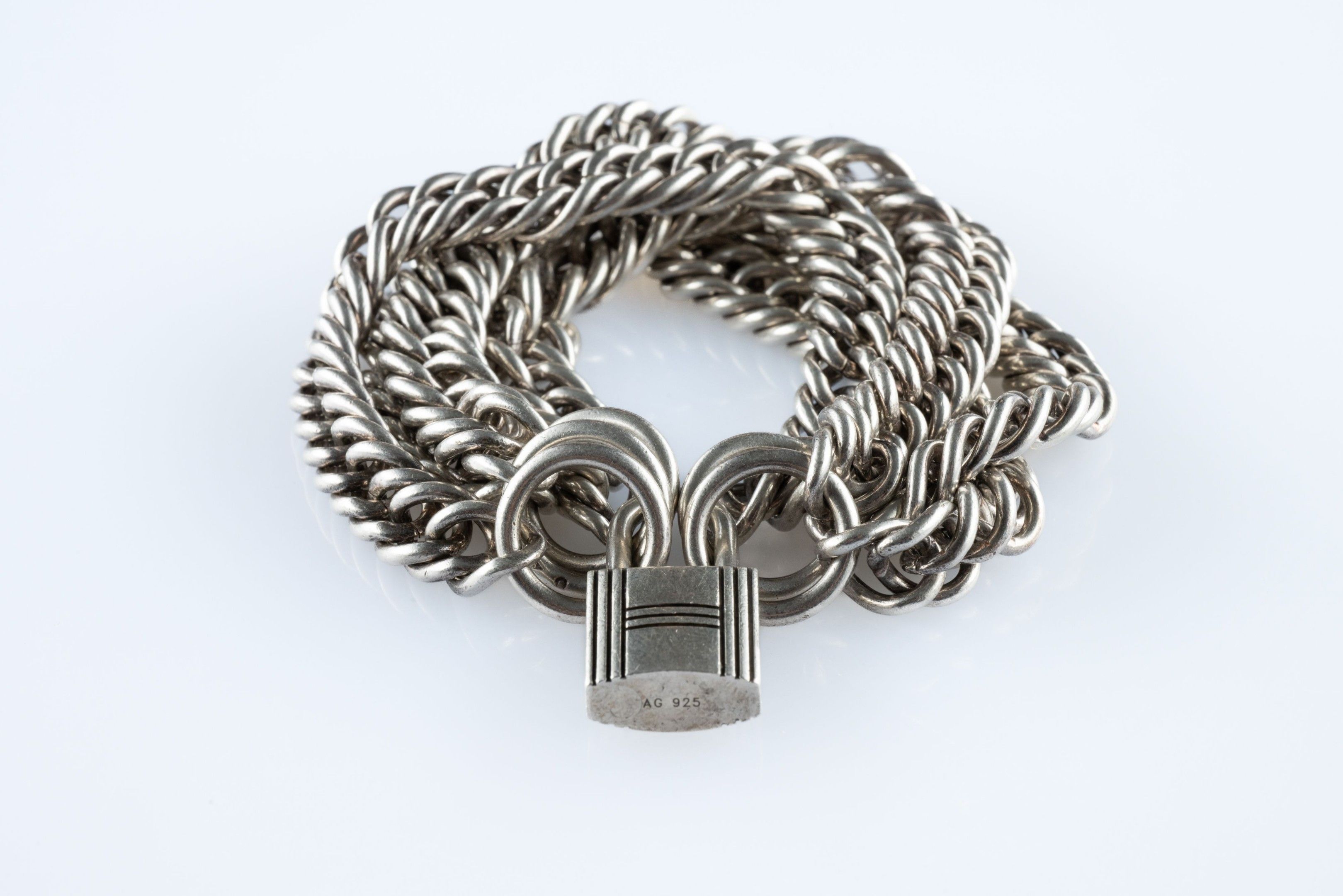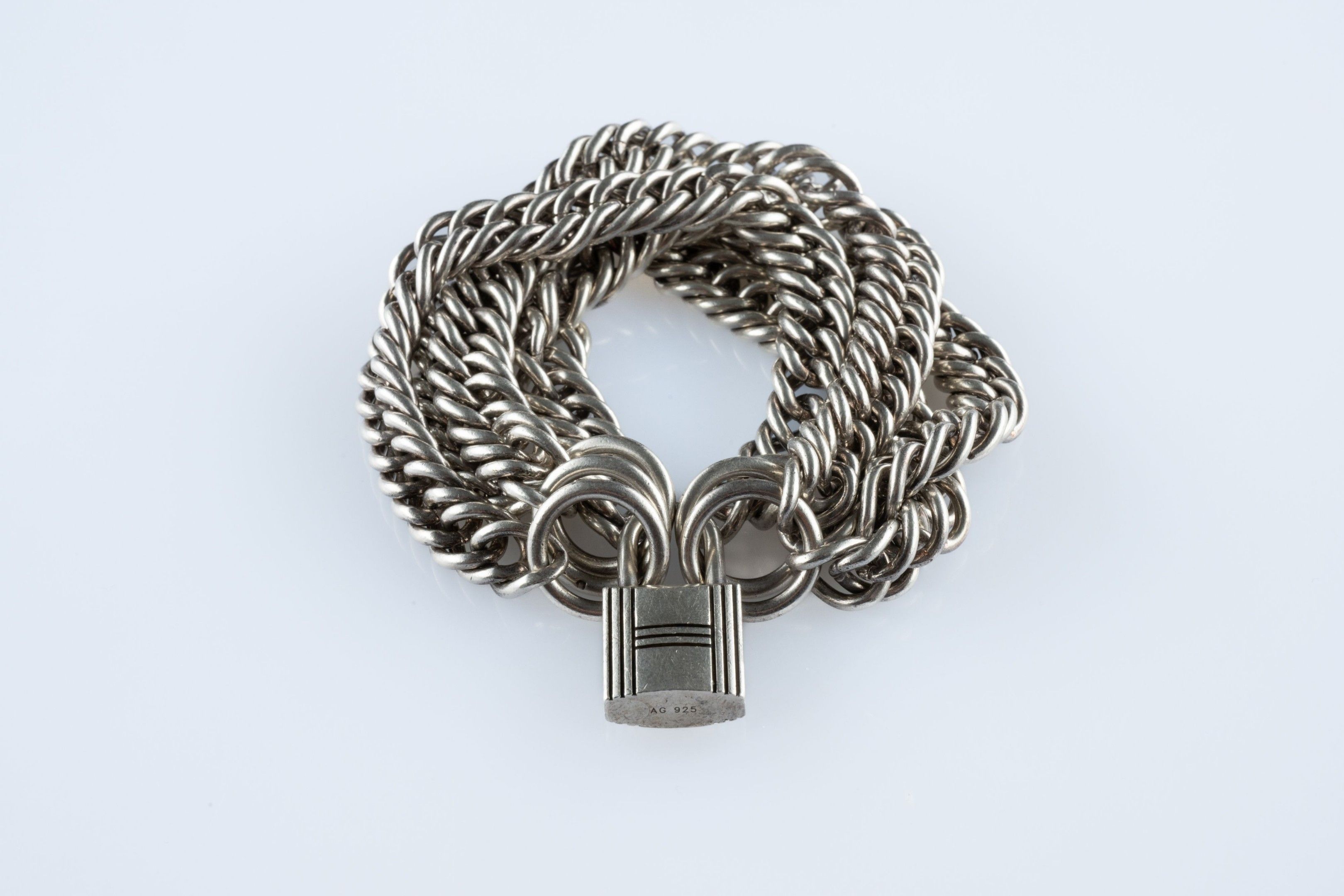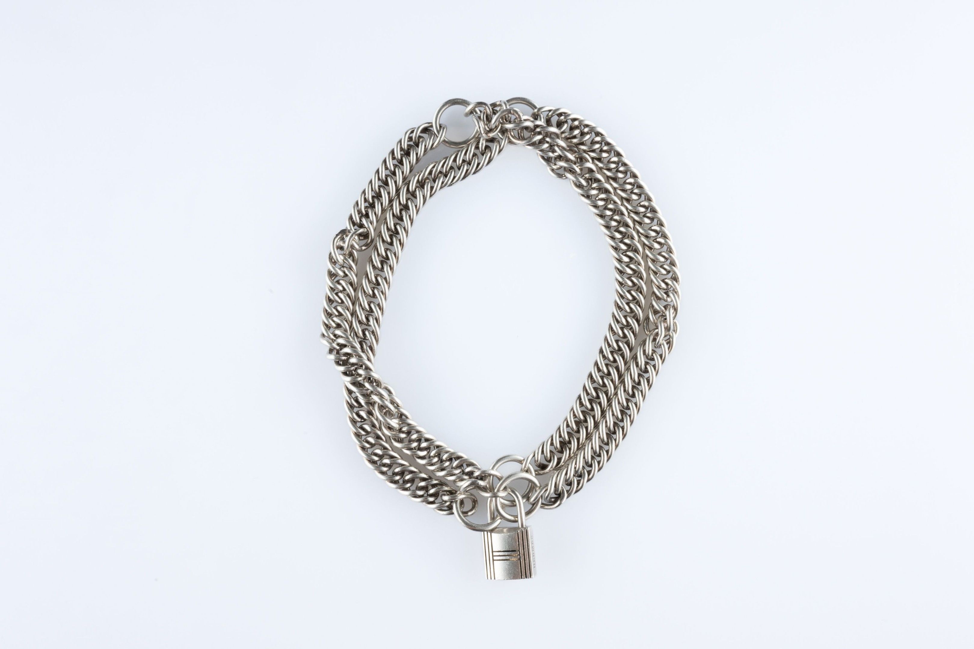 Silver long necklace with curb chain and "Kelly" padlock. Can be worn as a long necklace, chocker or four-row bracelet. Signed.