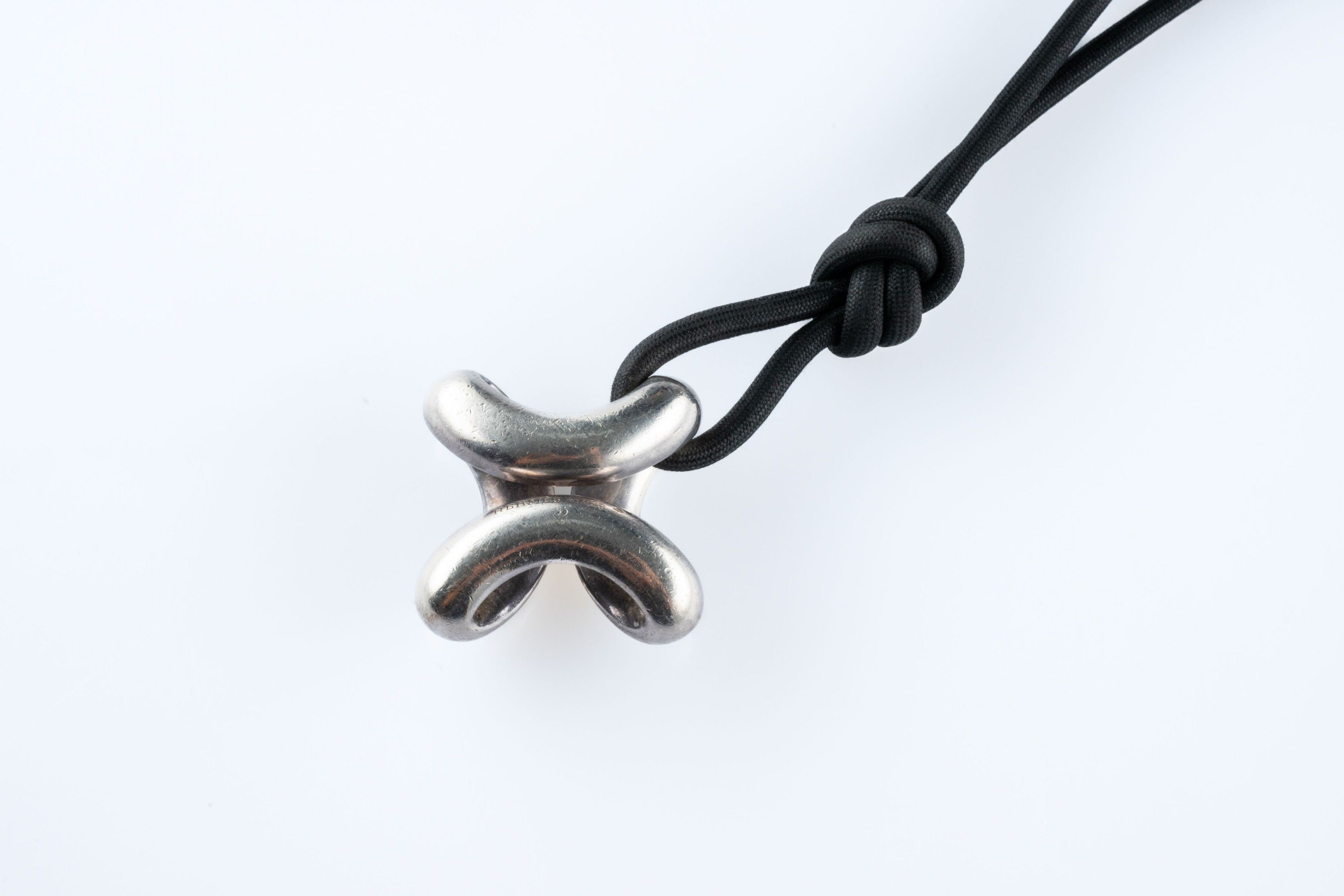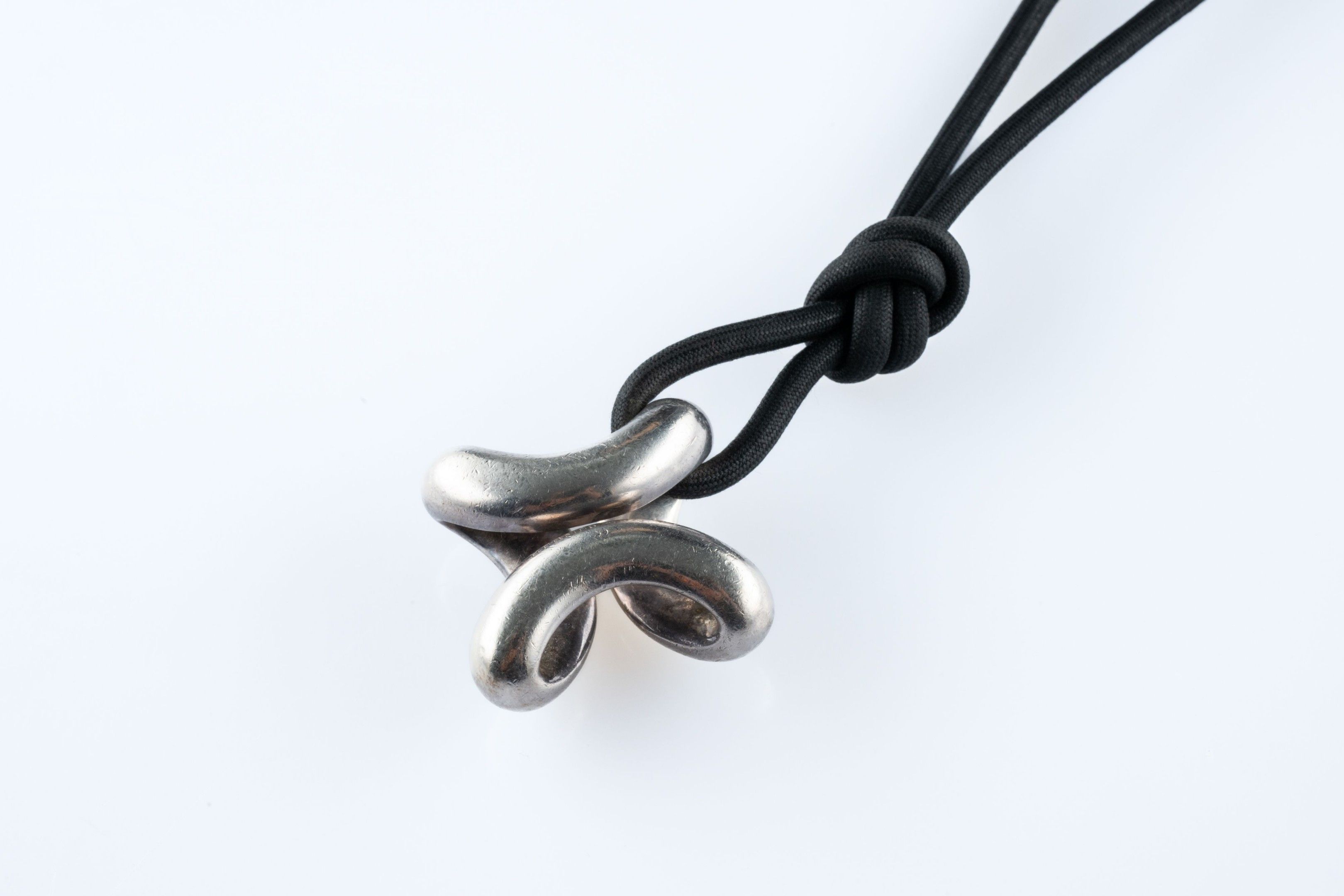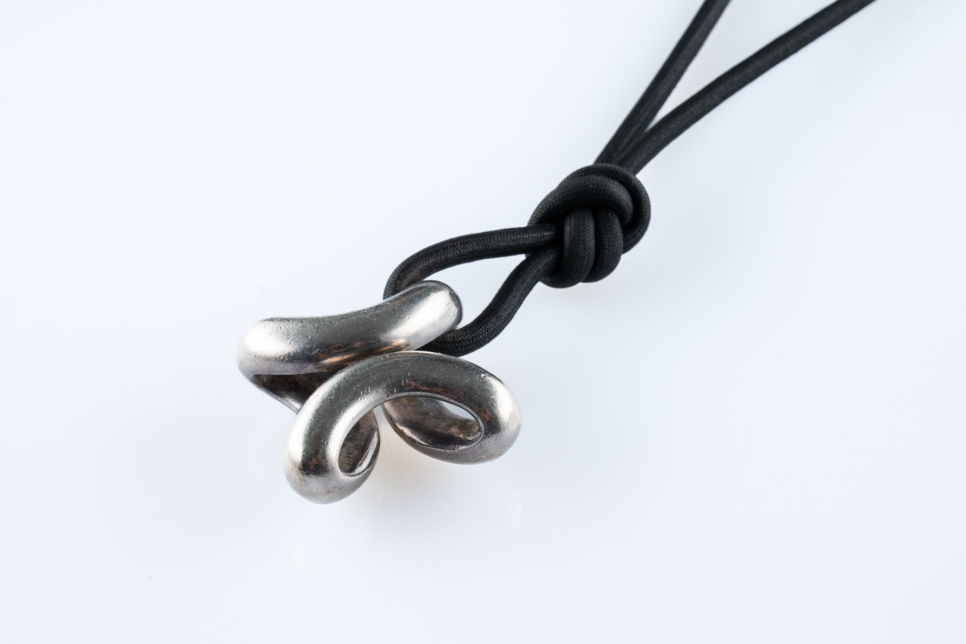 Lima" necklace, silver pendant and clasp on black textile cord. Signed.