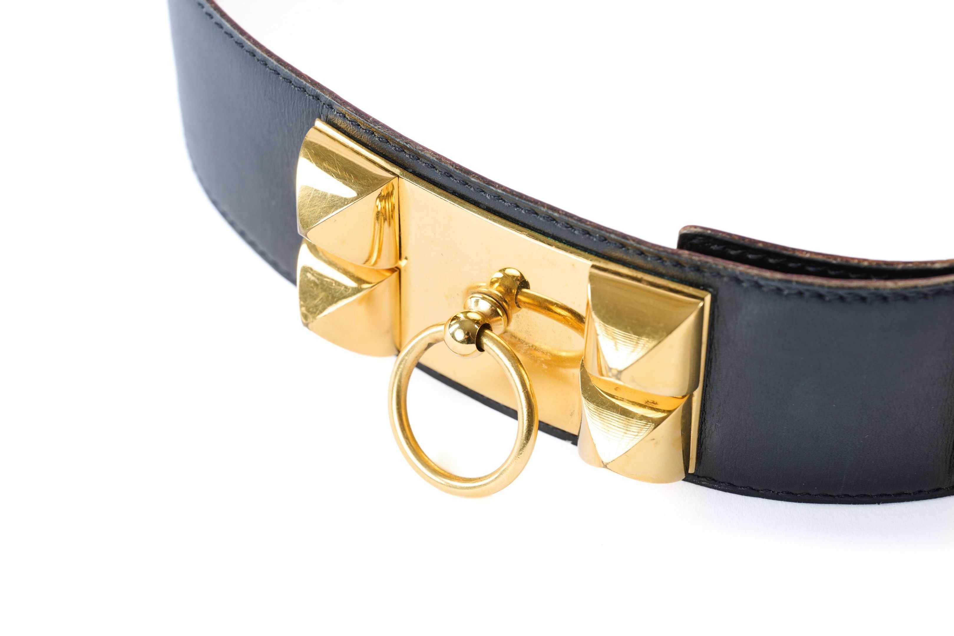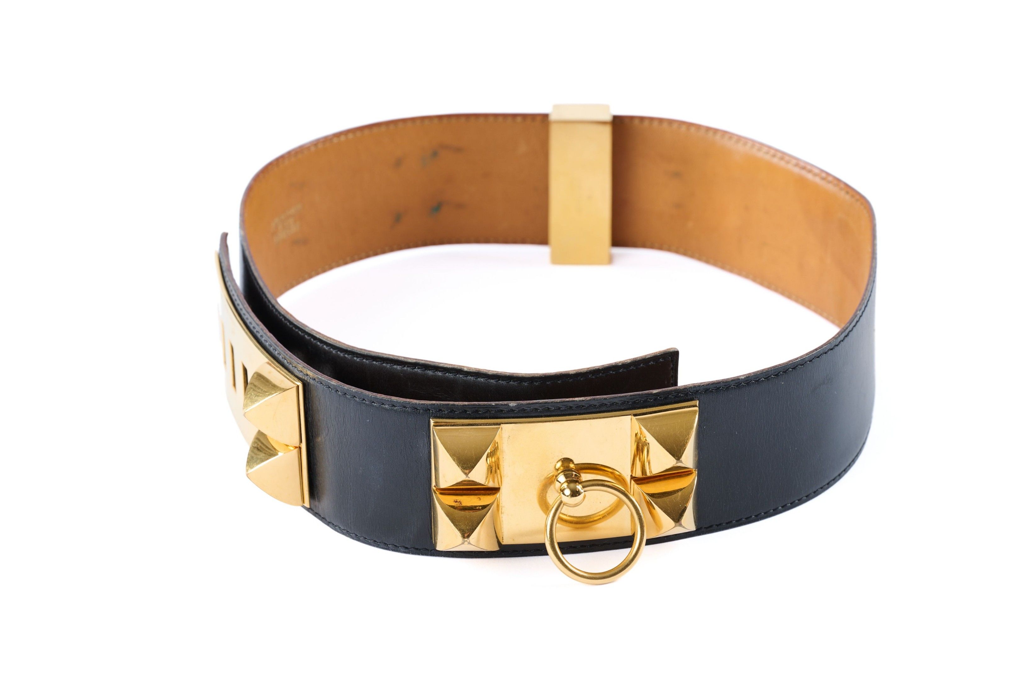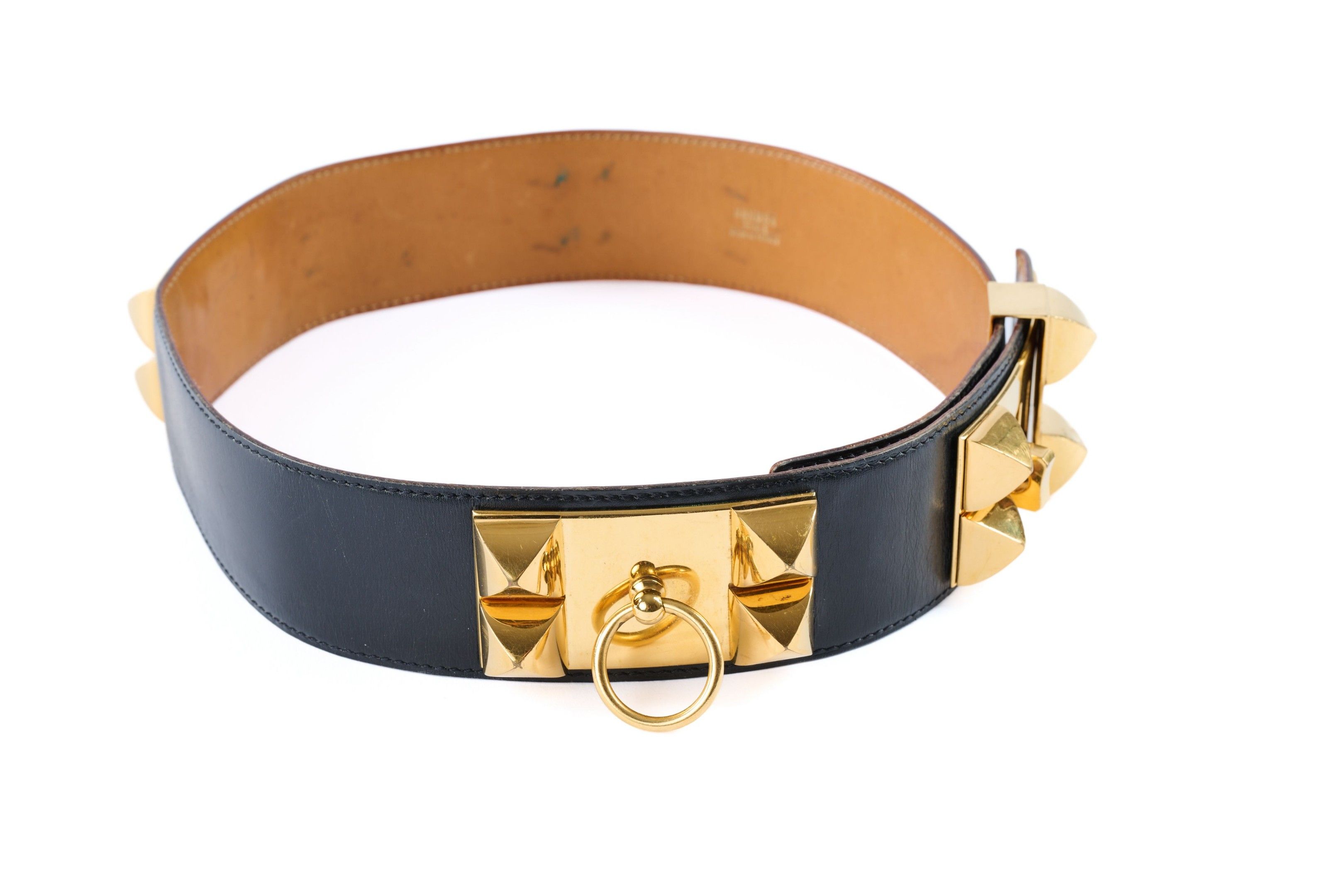 Collier de chien" belt in black box calfskin with gold-plated metal trim. Signed.