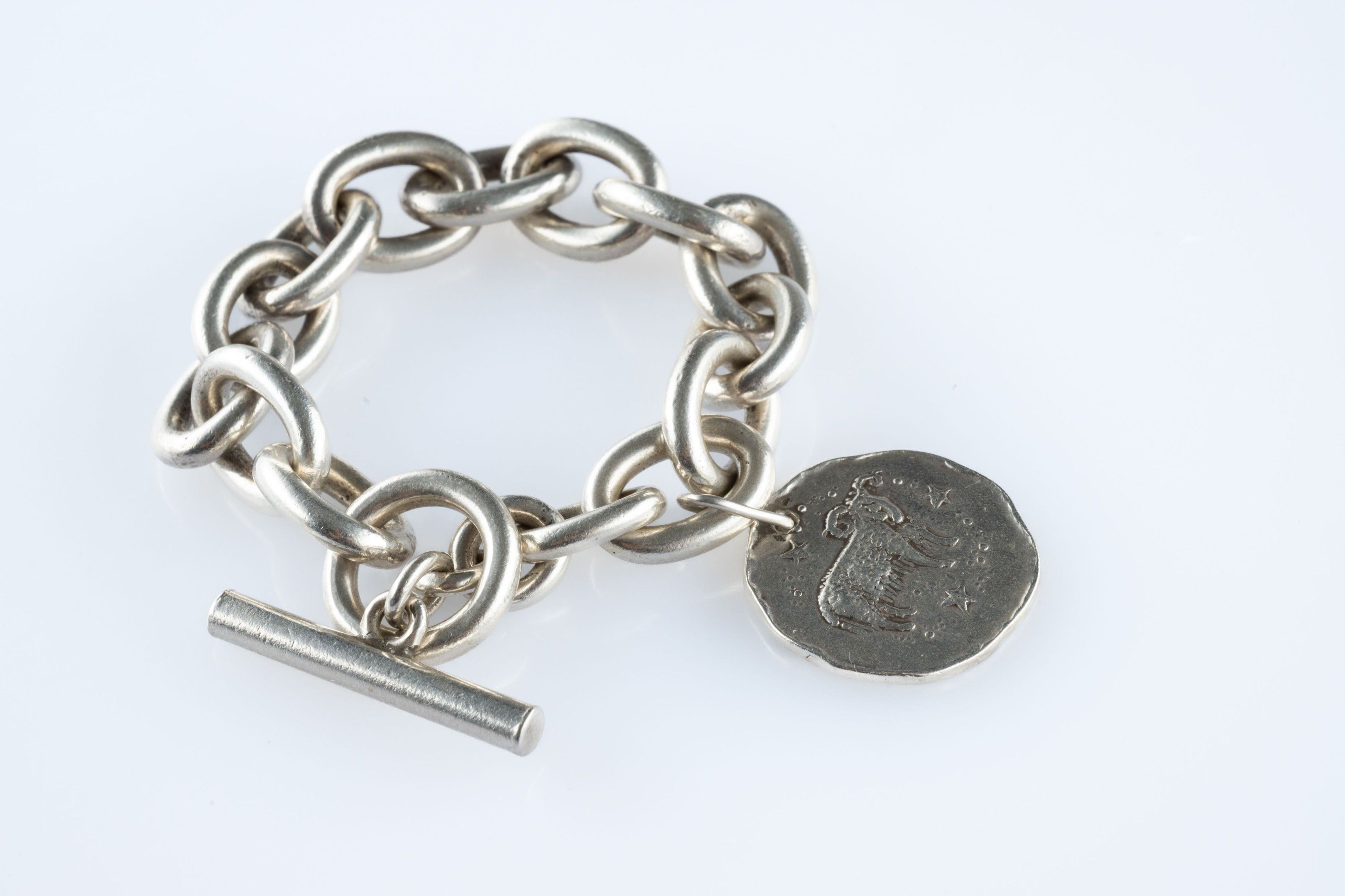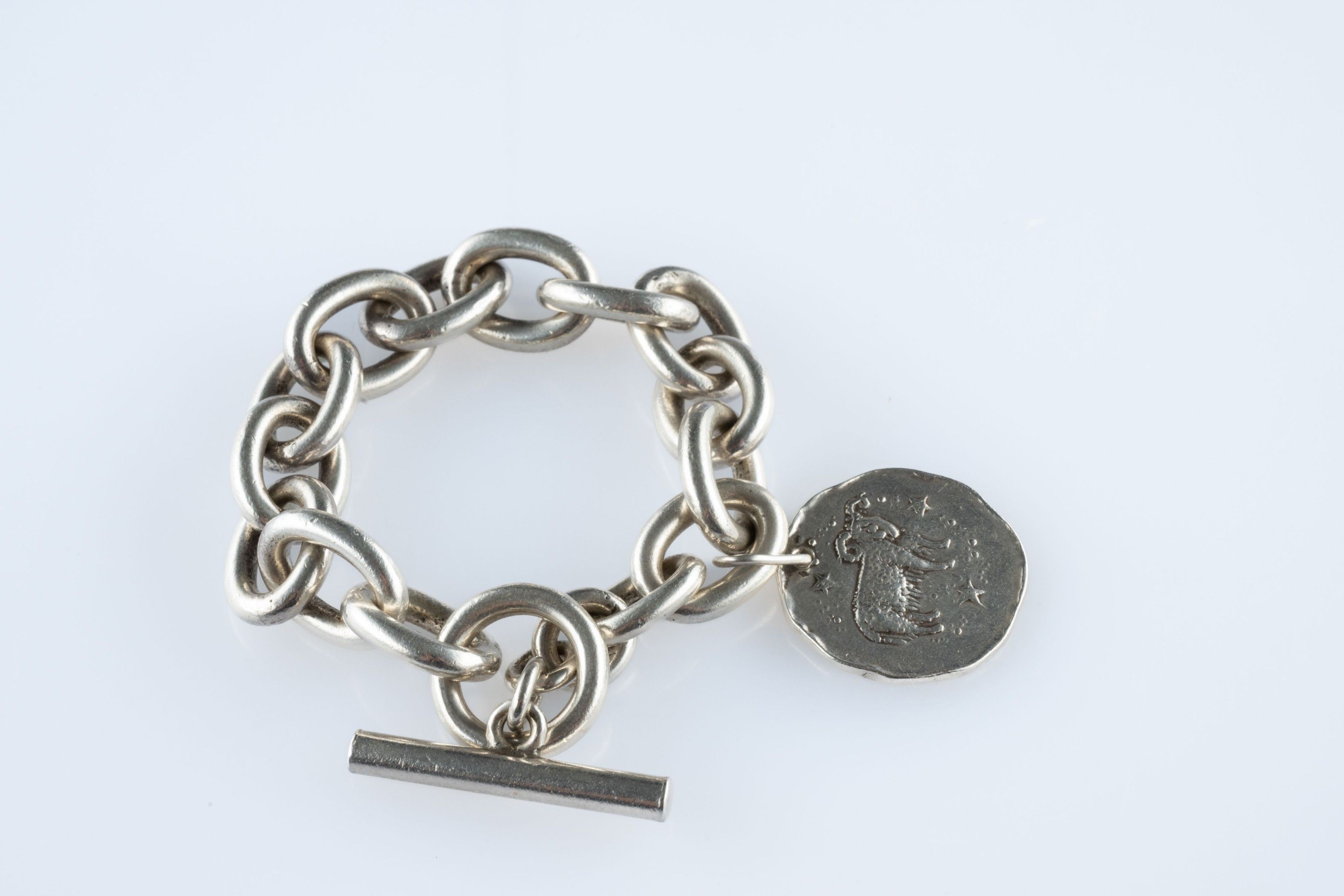 Anchor chain bracelet holding a circular medal engraved with the signs of the zodiac on one side and a ram on the other.