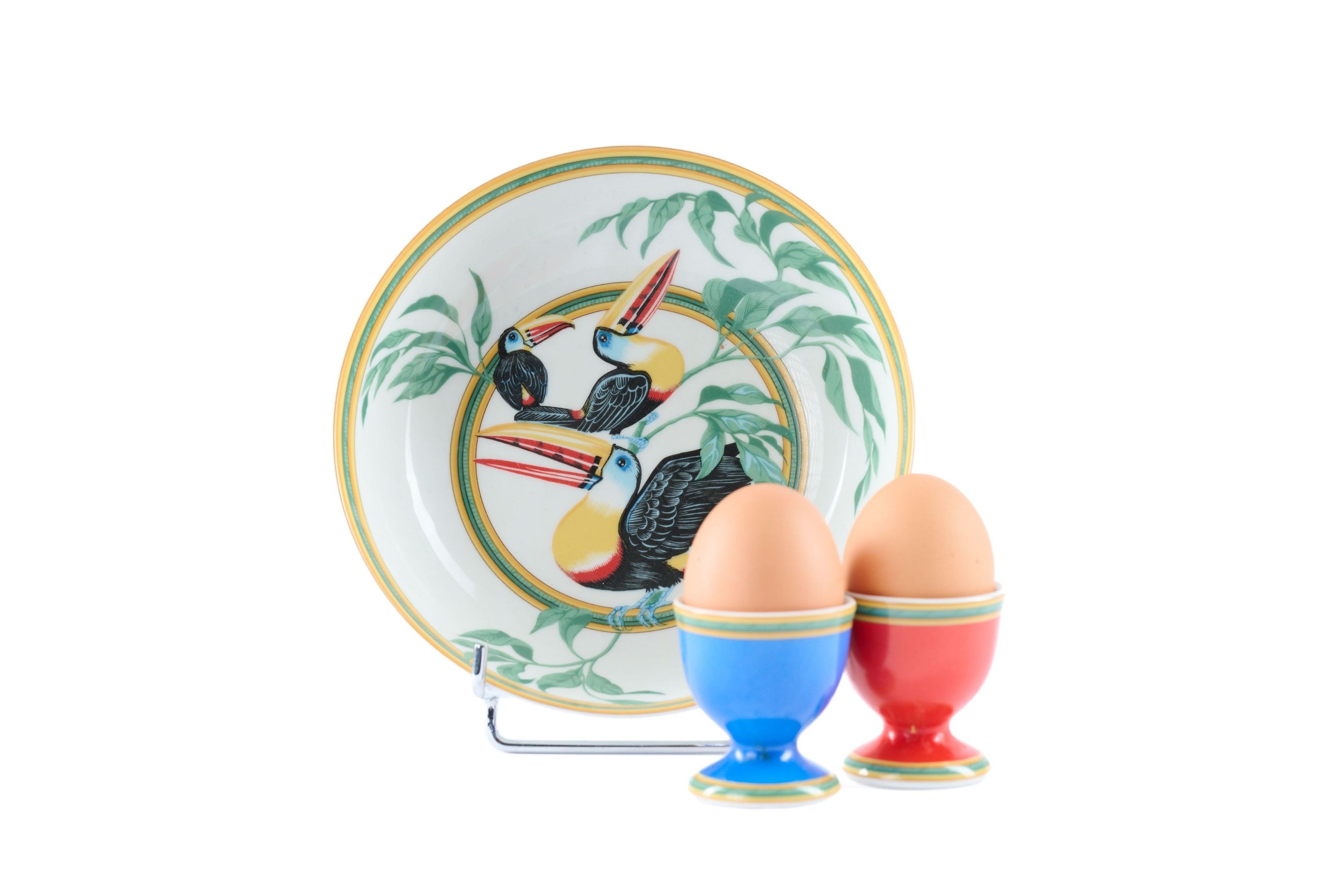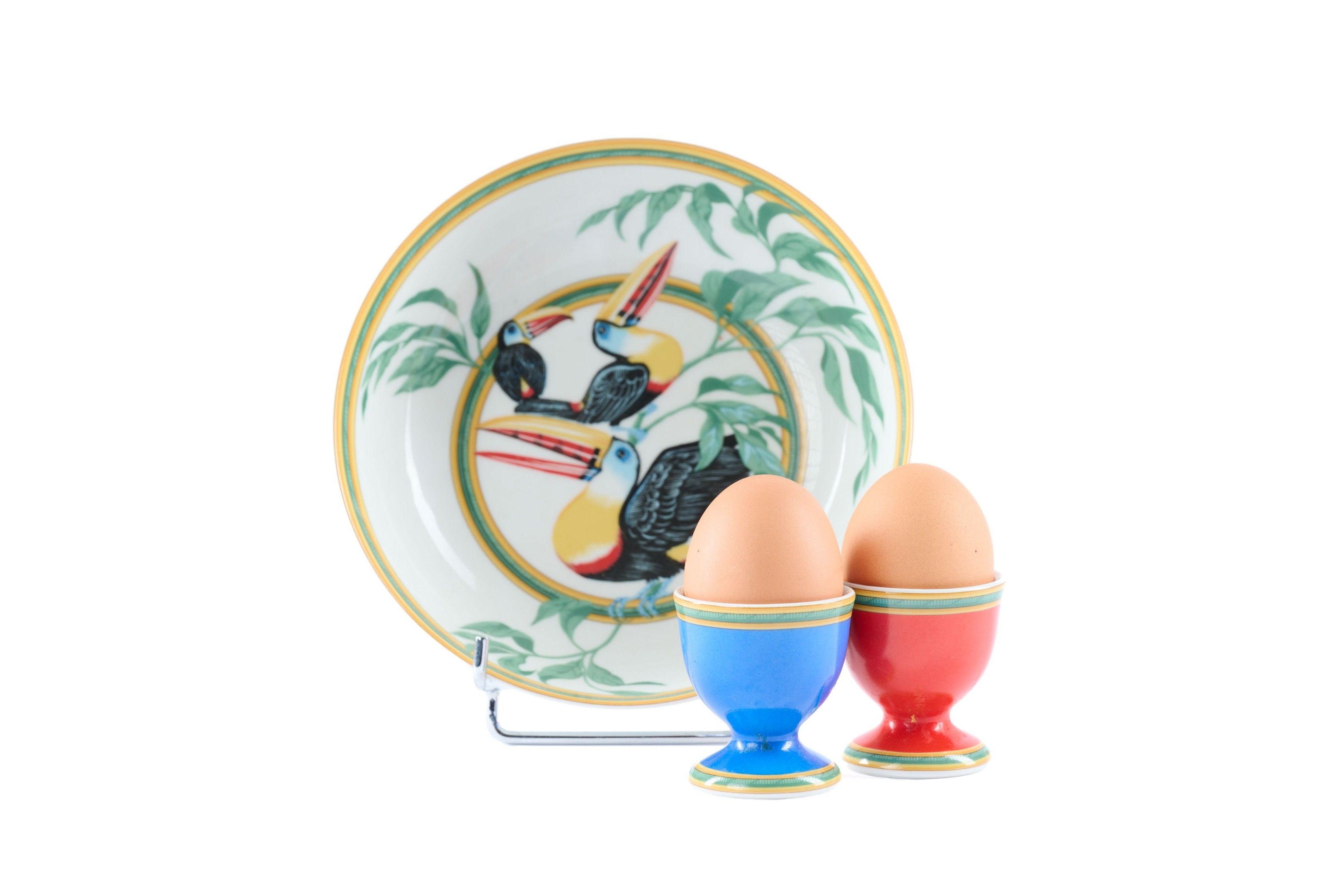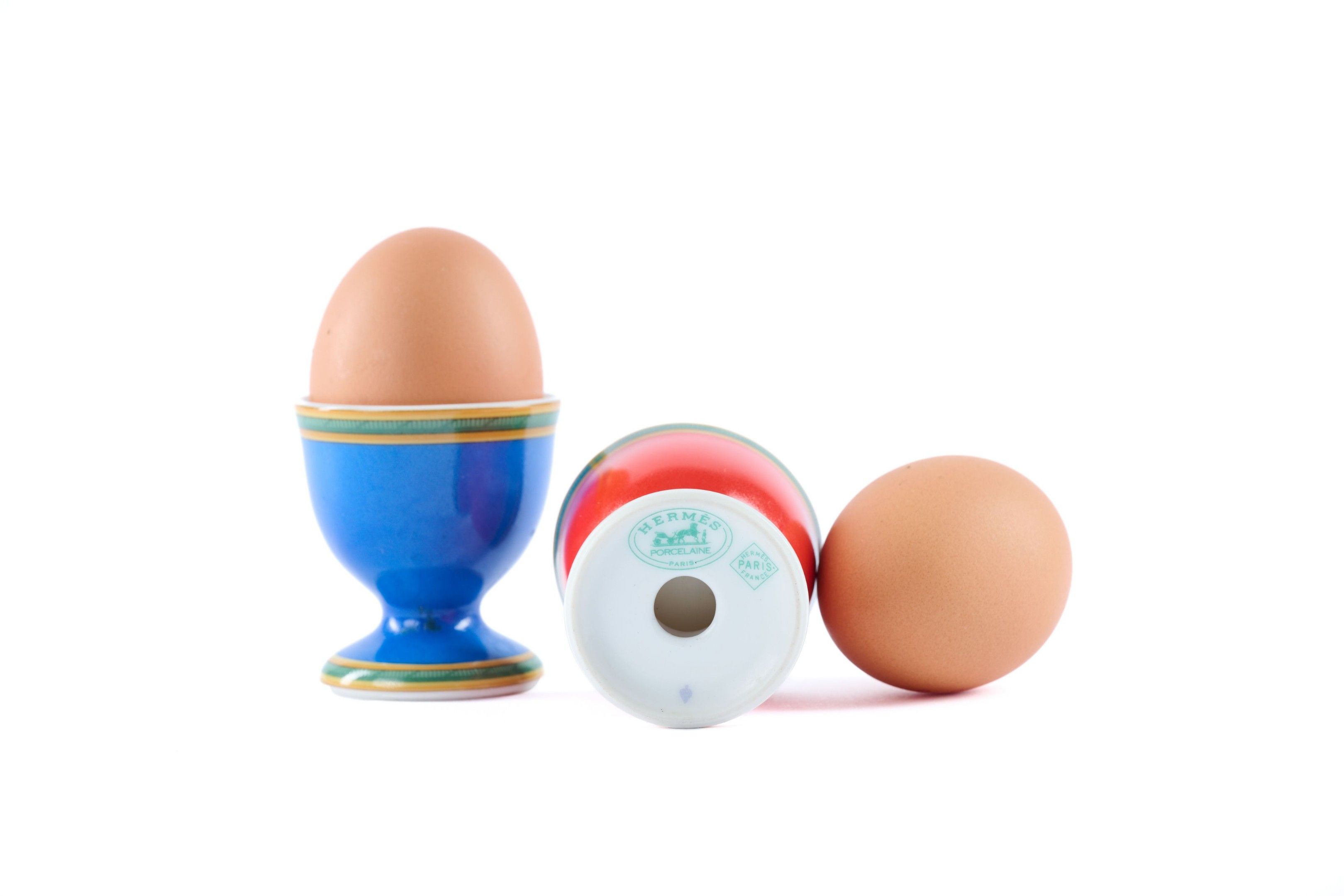 Two Hermès porcelain egg cups, one with a red base and the other with a blue base. Signed.