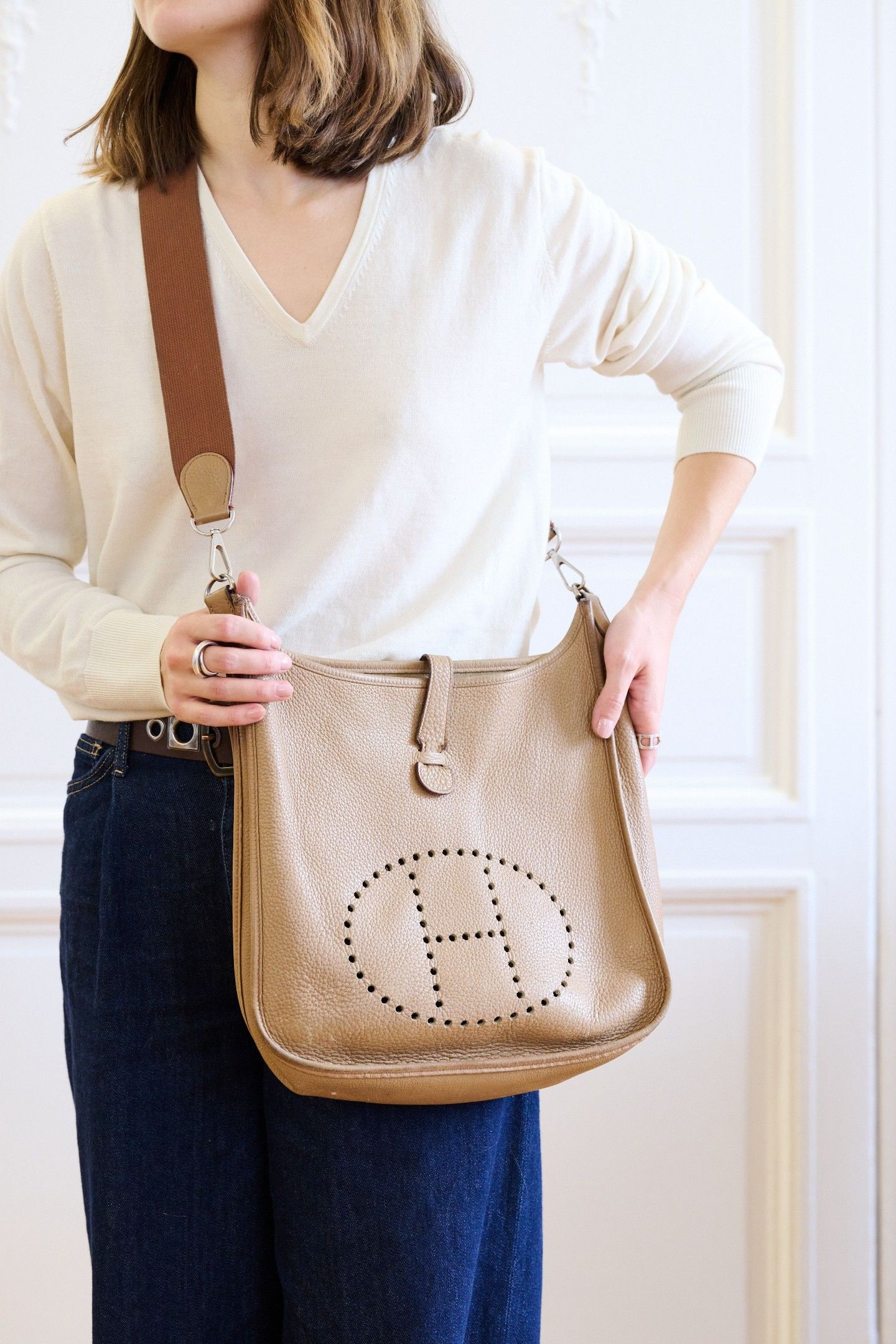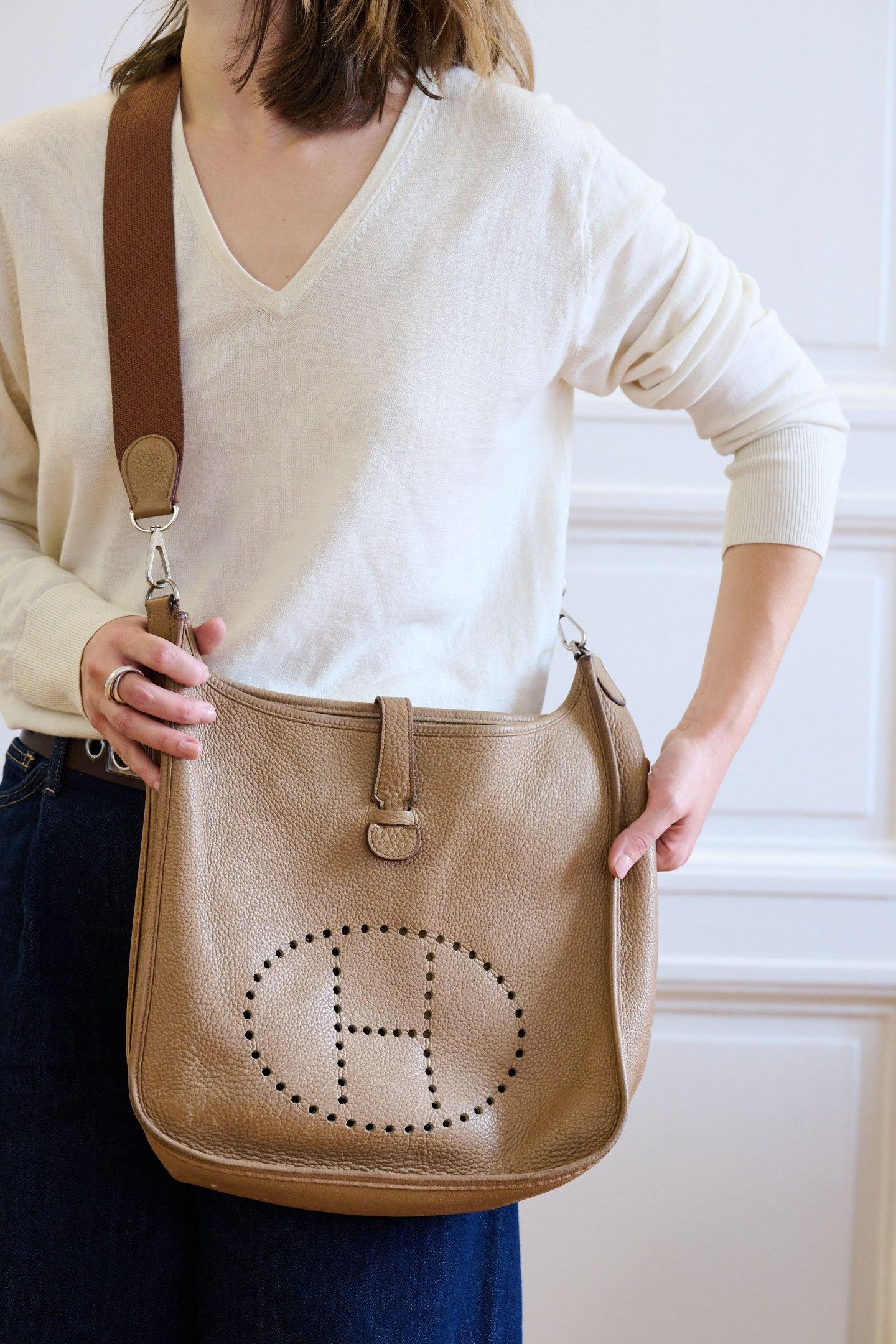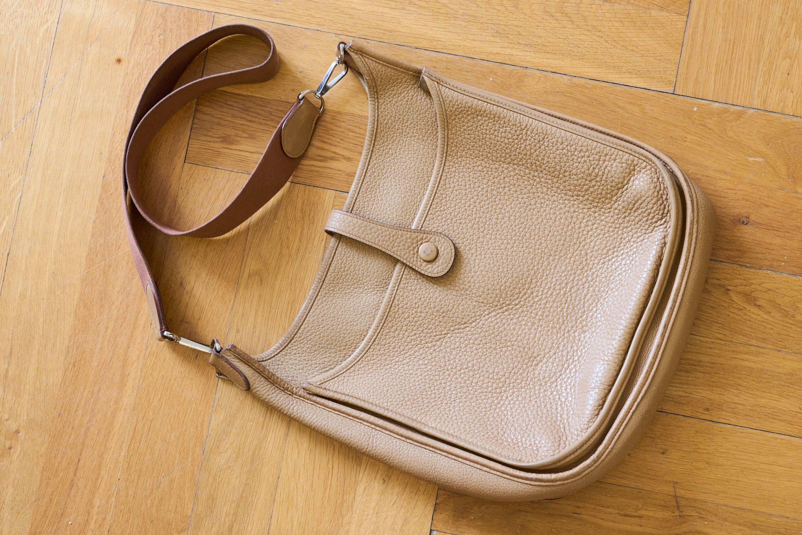Premium HERMES. Evelyne" bag in camel grained leather, silver-tone m…