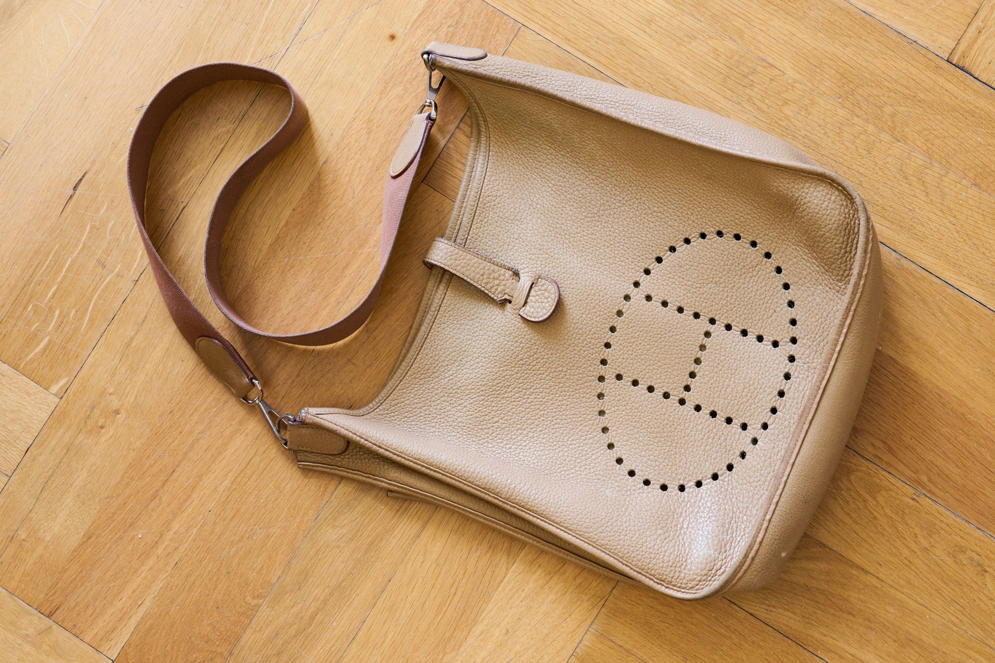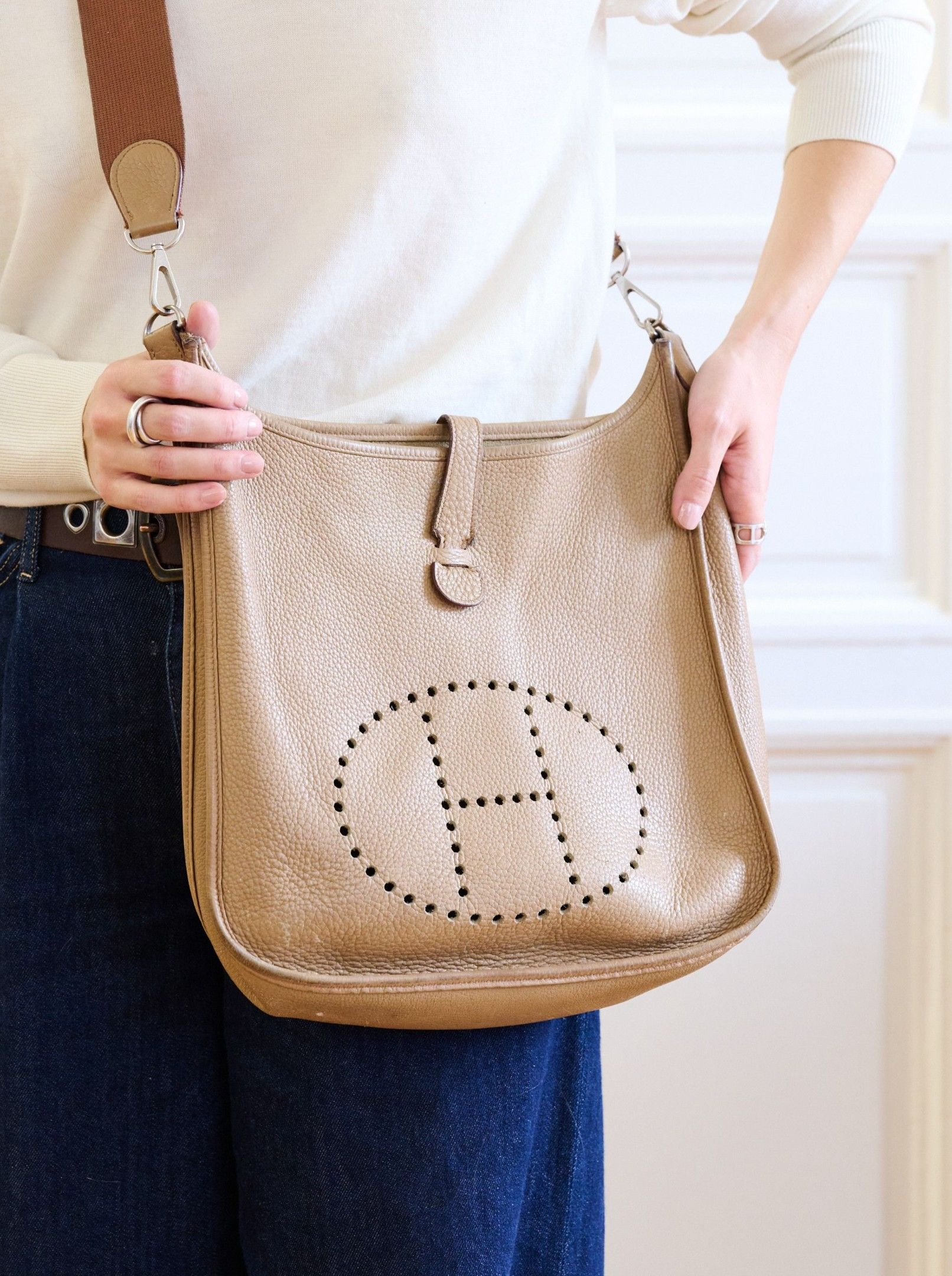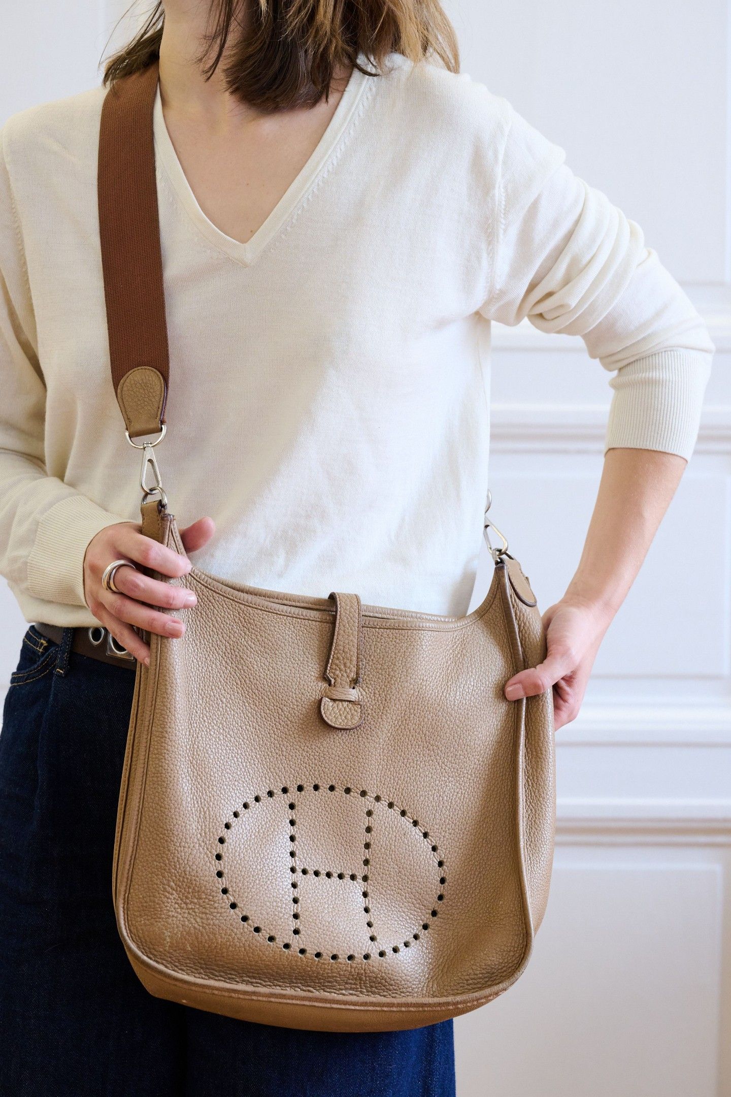Premium HERMES. Evelyne" bag in camel grained leather, silver-tone m…