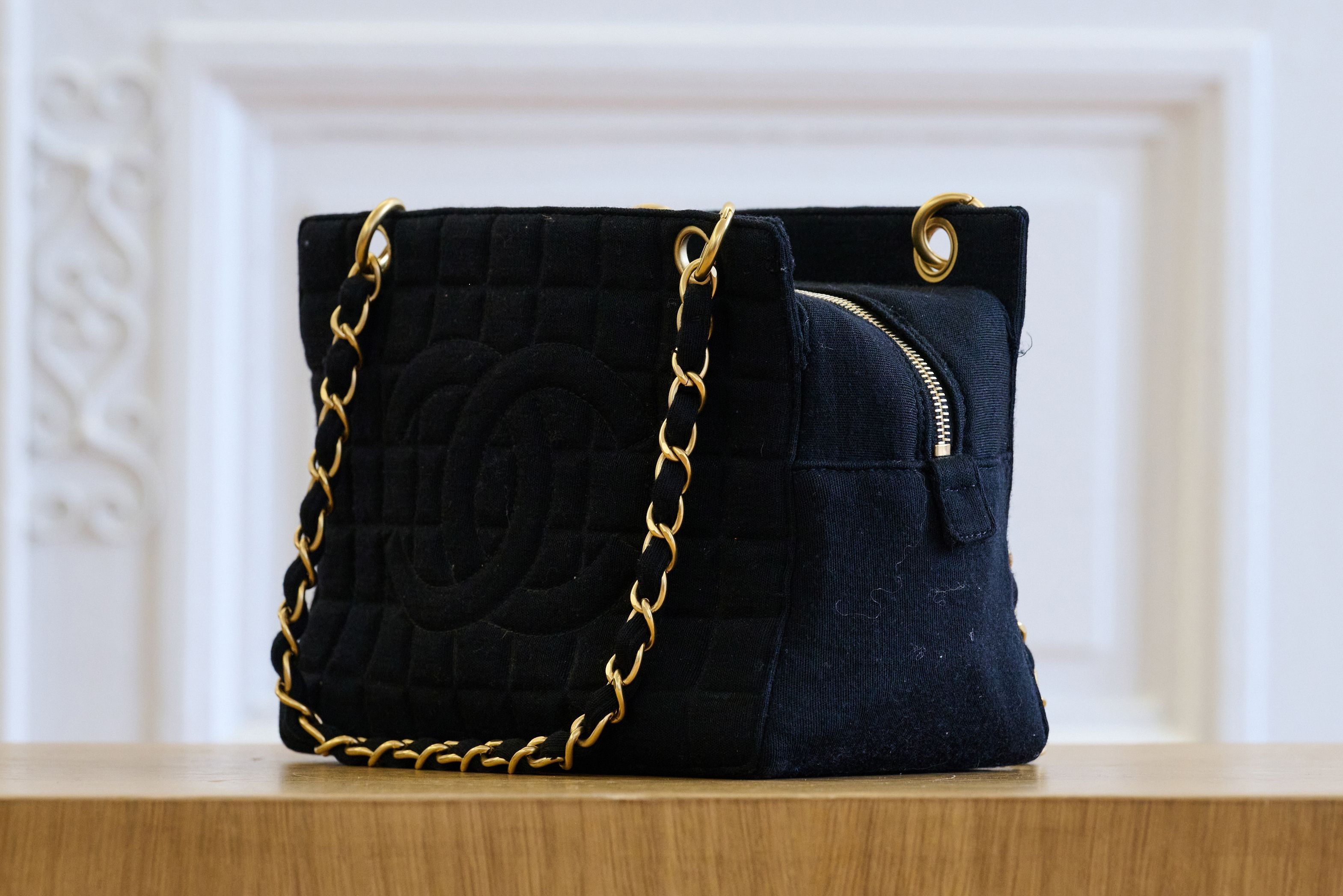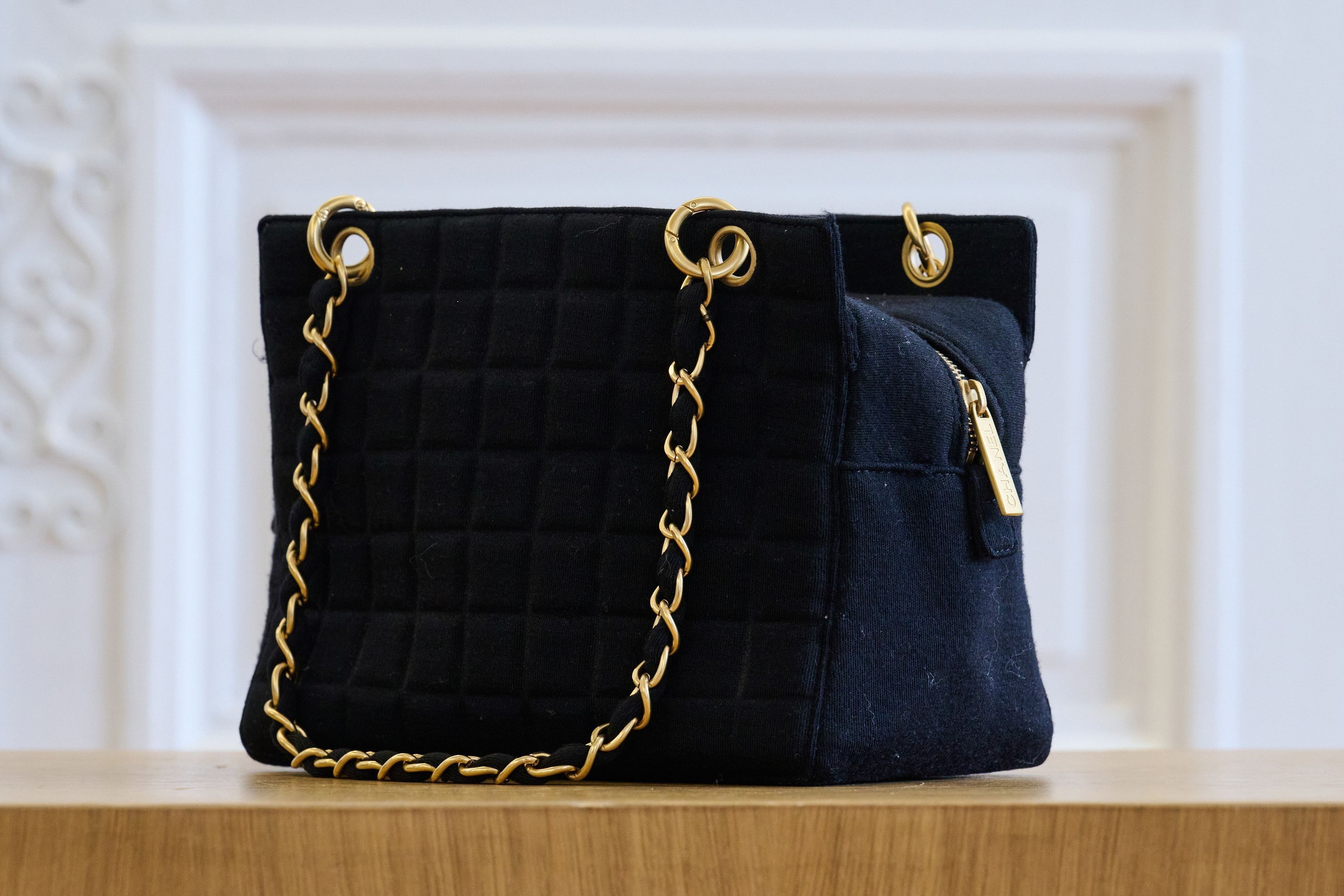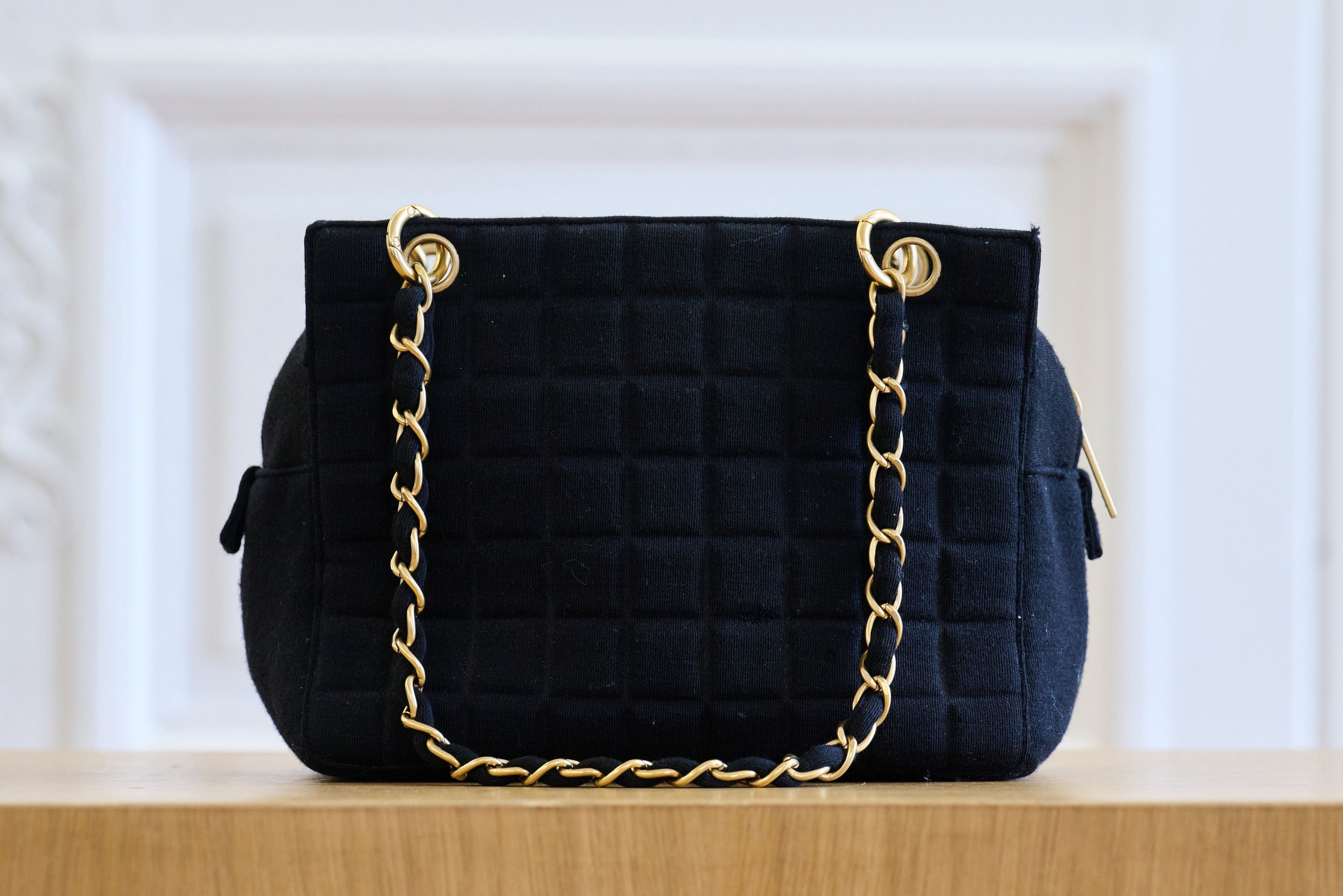CHANEL. Black quilted jersey bag with small checks, opening …
