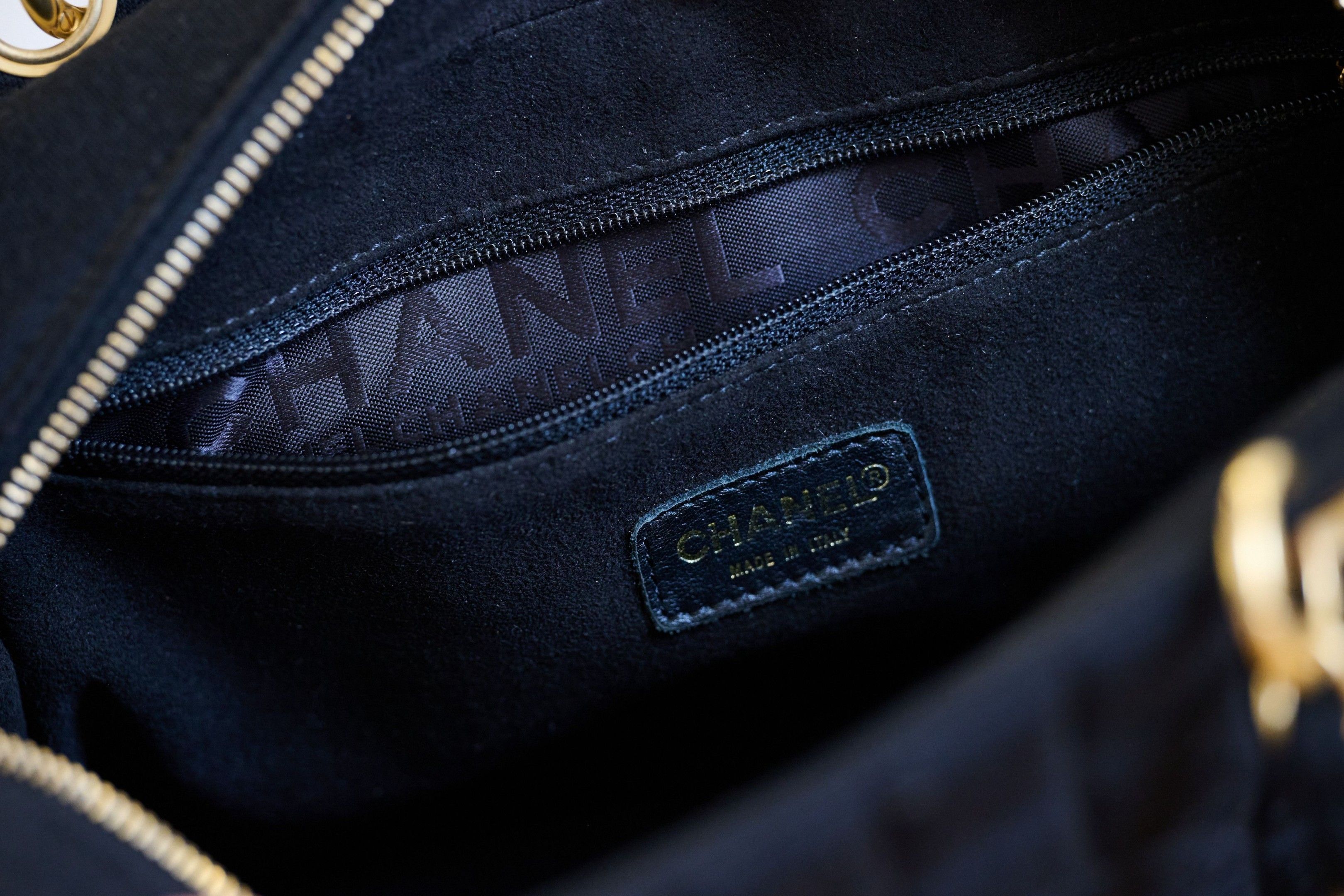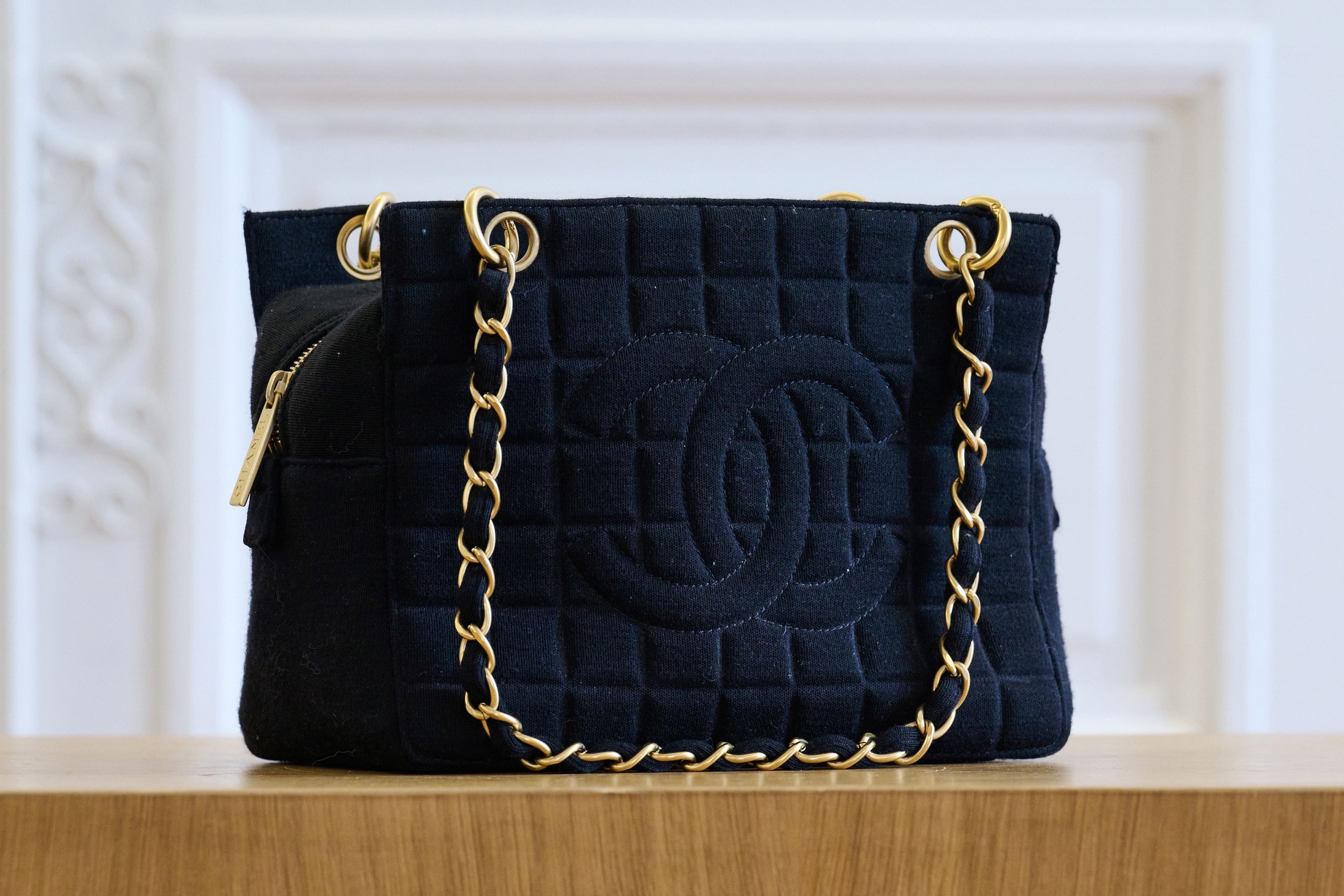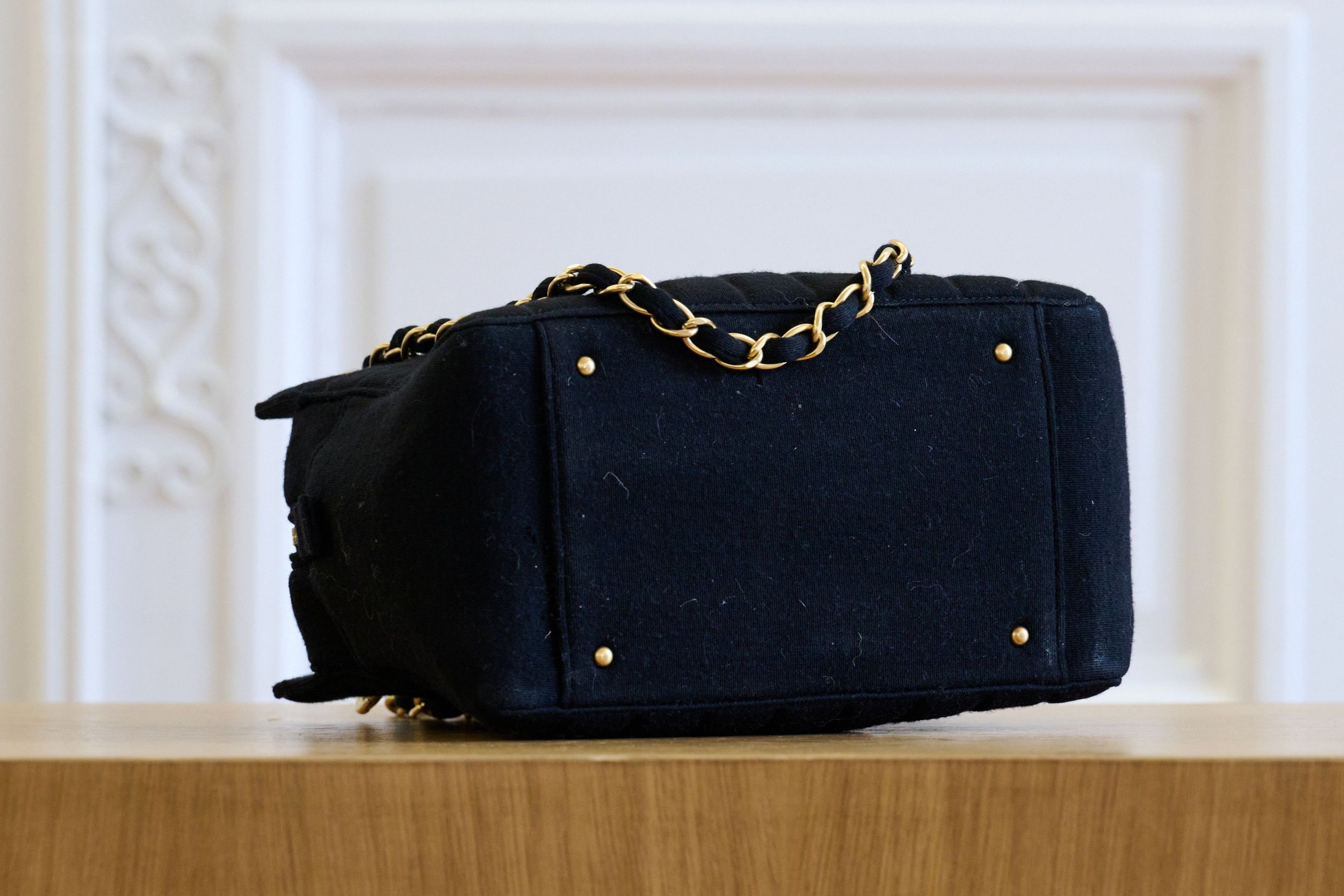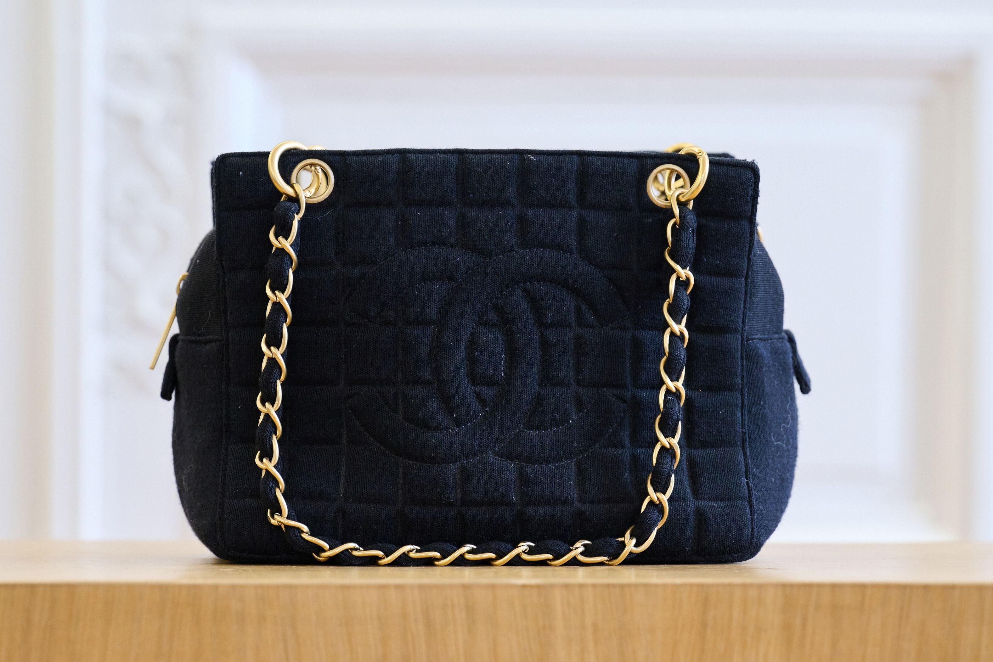 CHANEL. Black quilted jersey bag with small checks, opening …