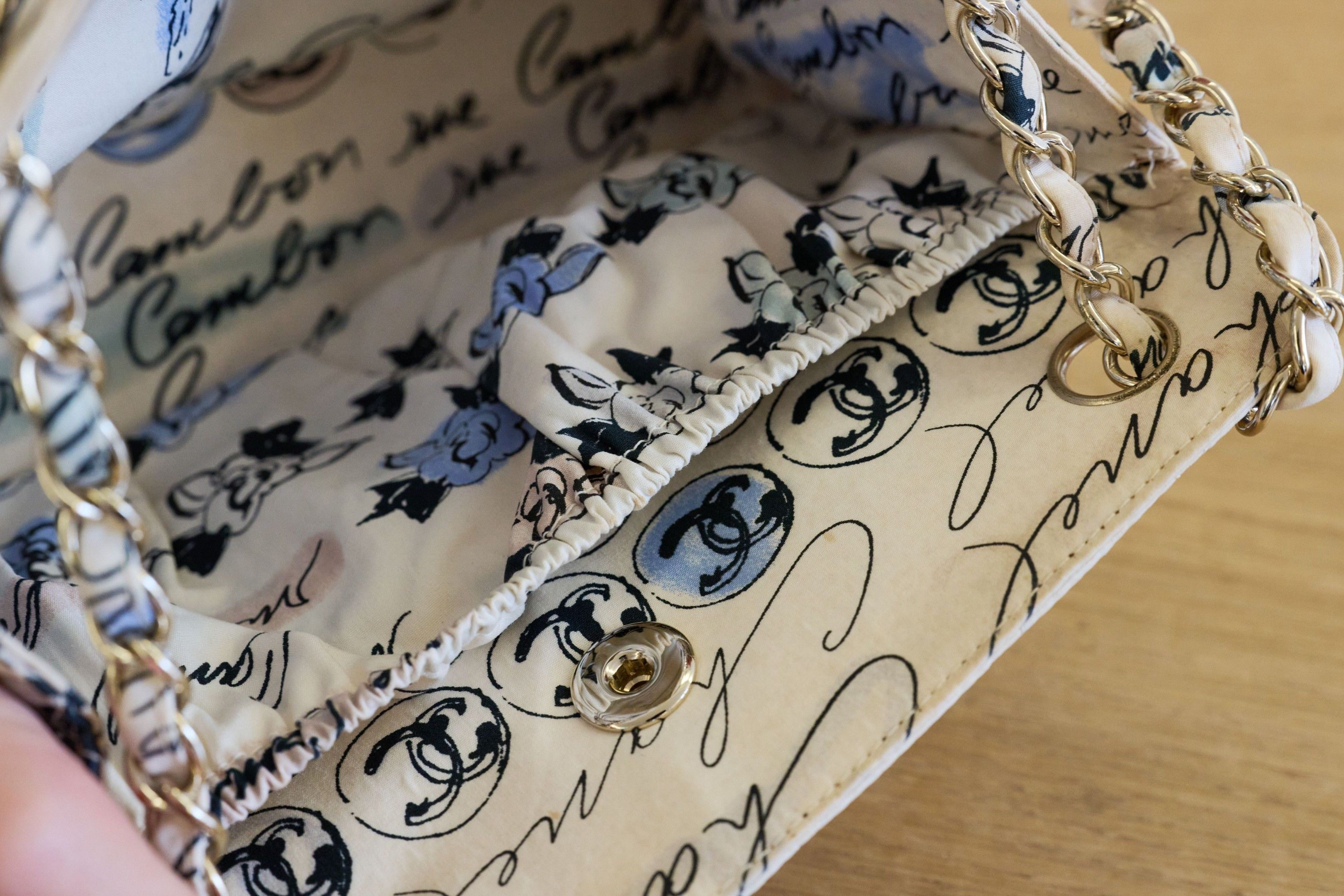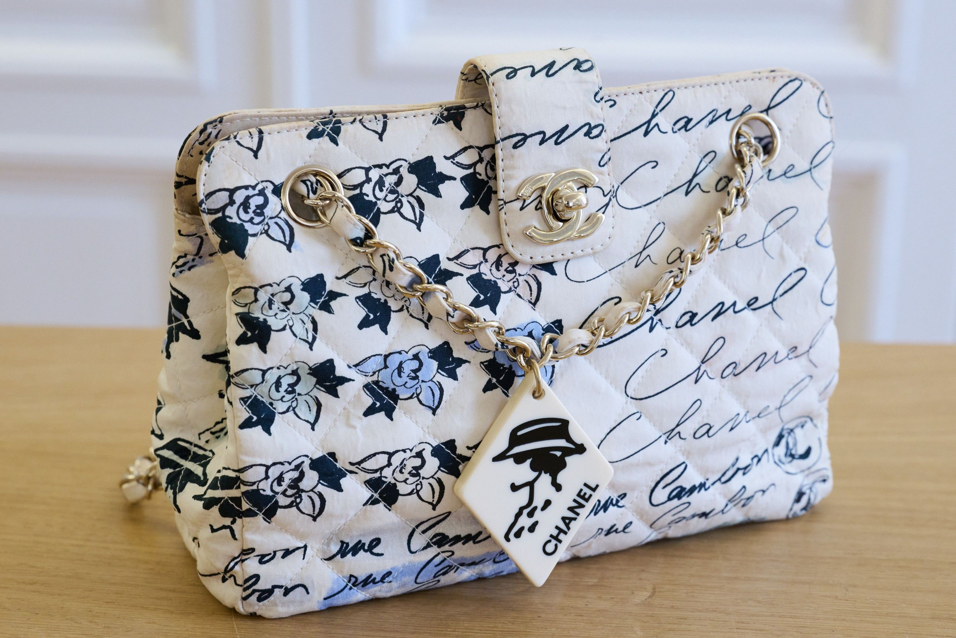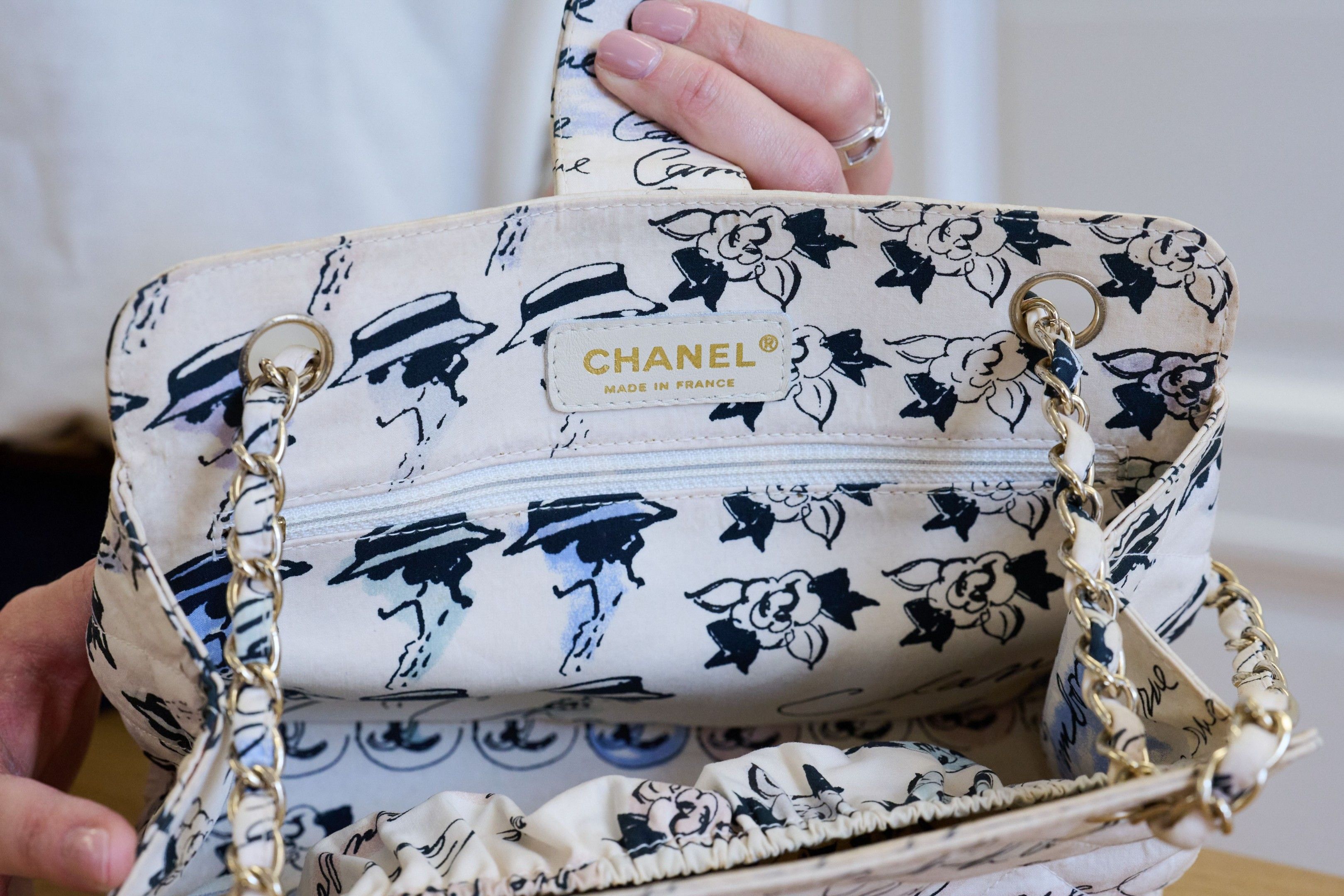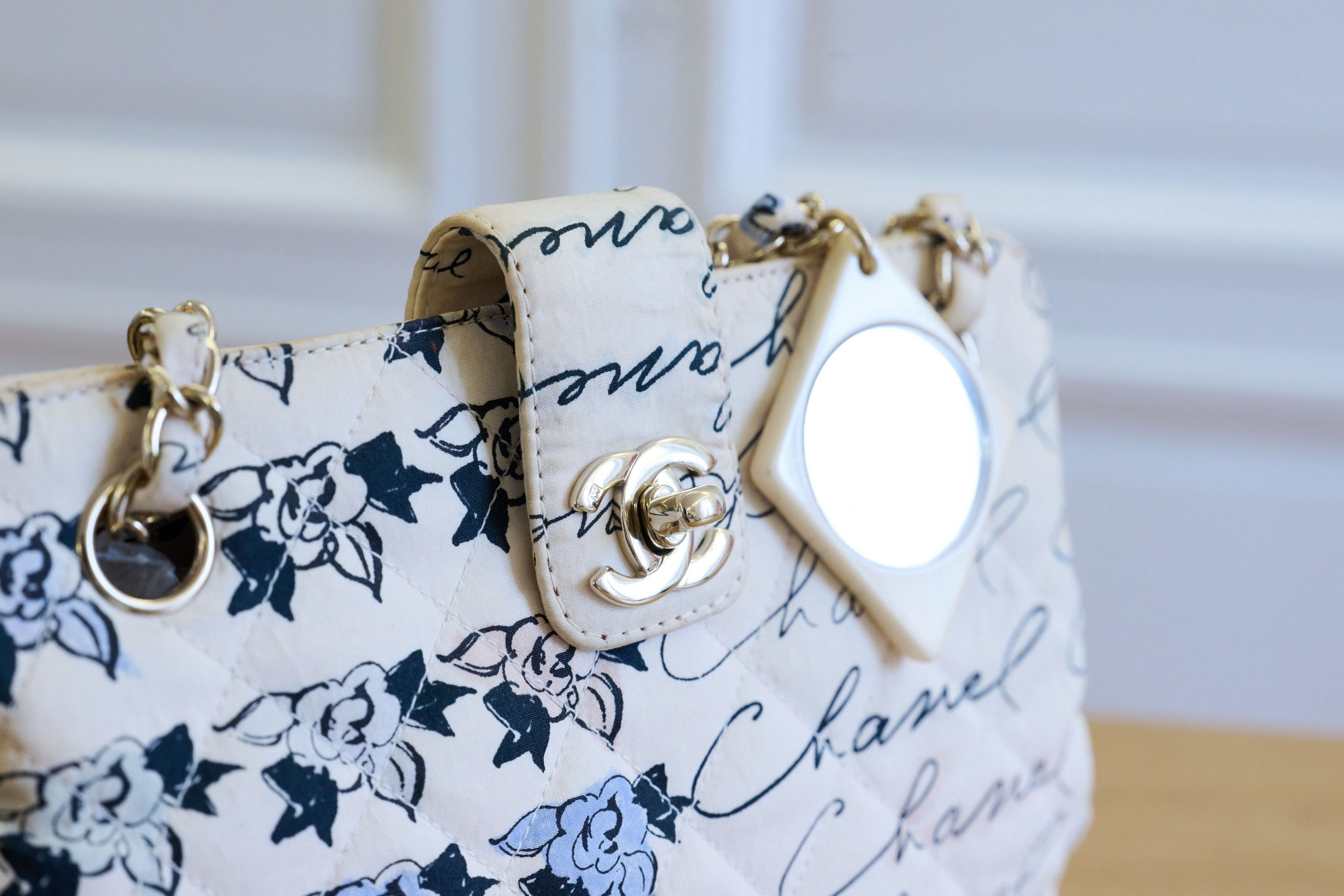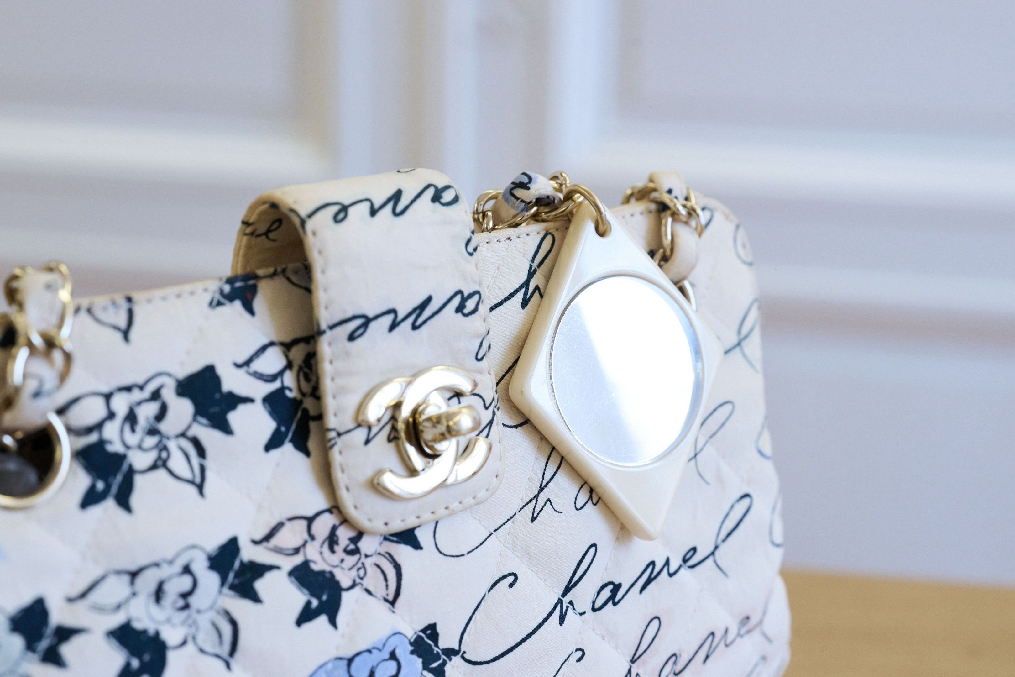 Quilted bag in off-white canvas printed with flowers, graffiti inscriptions Chanel, rue Cambon and double C, double handle embellished with a chain that can form a shoulder strap holding a bakelite tassel adorned with a small mirror.