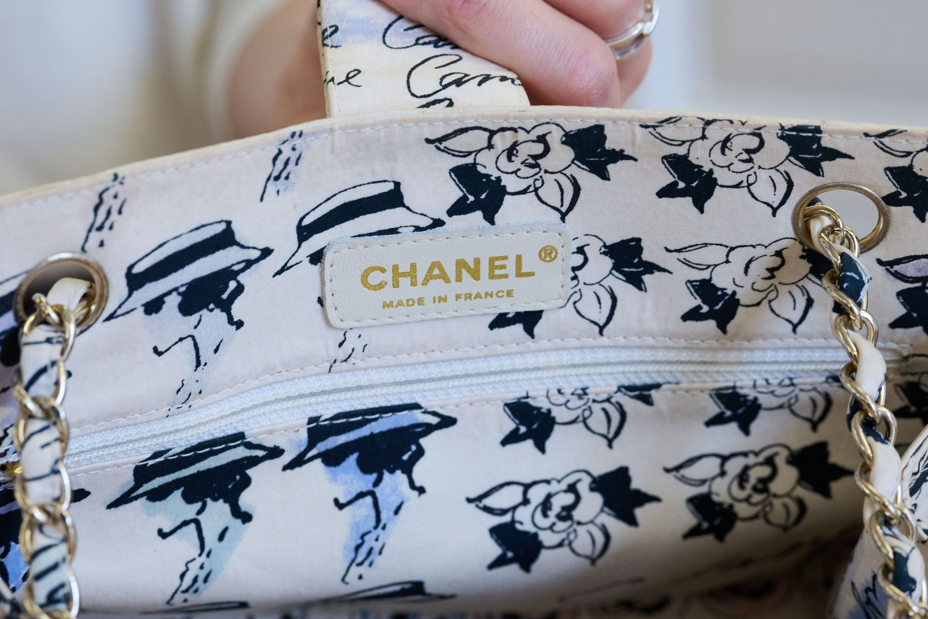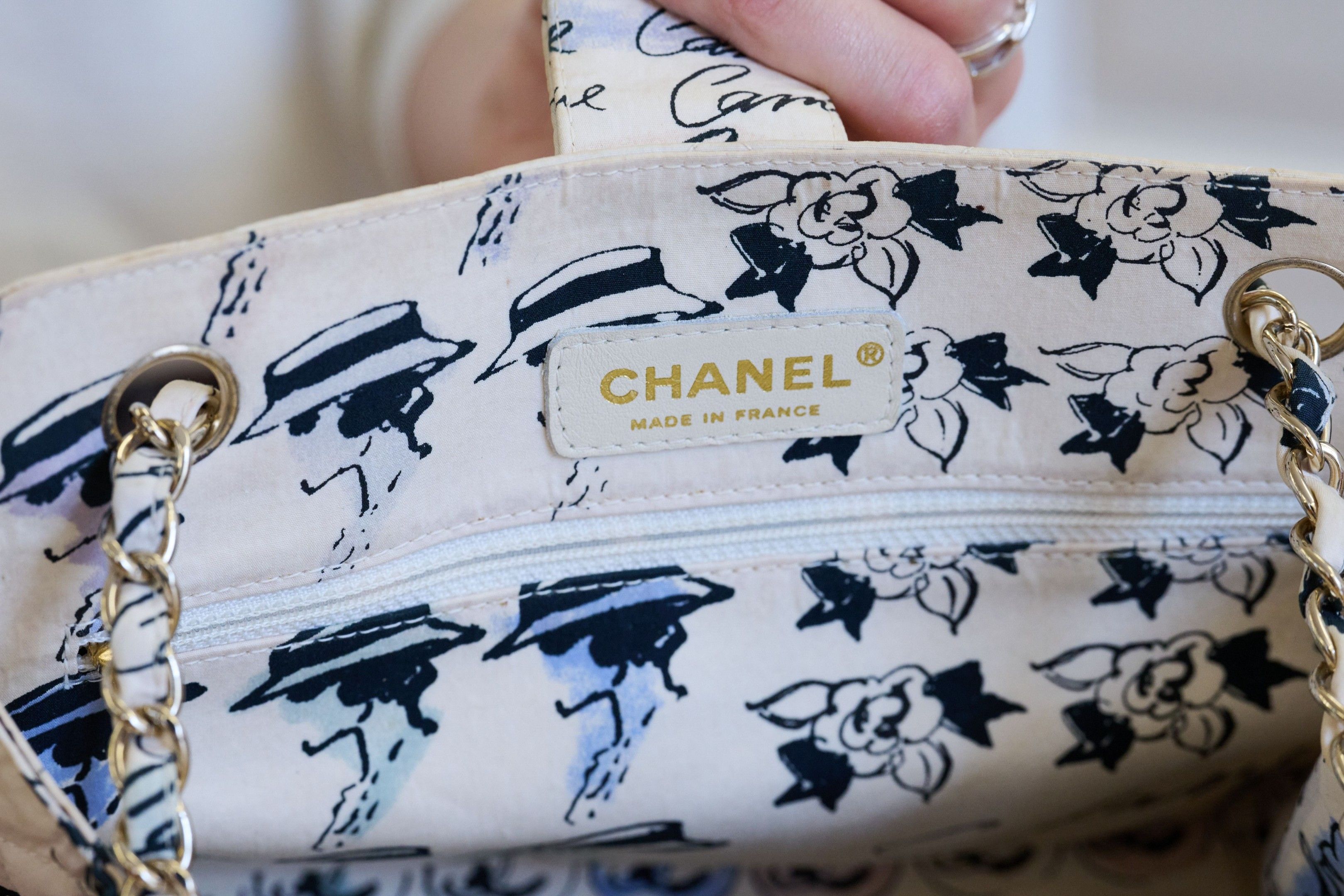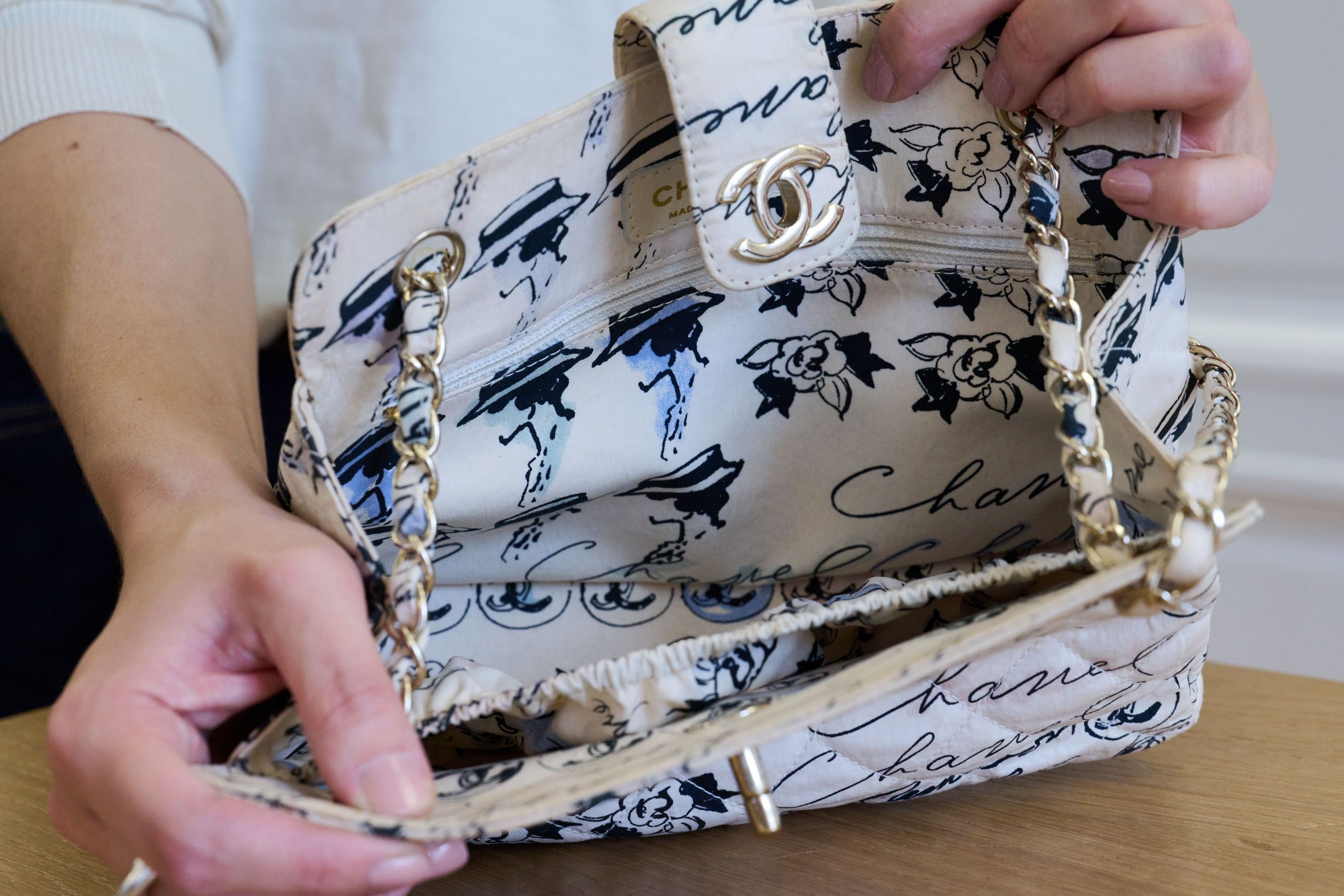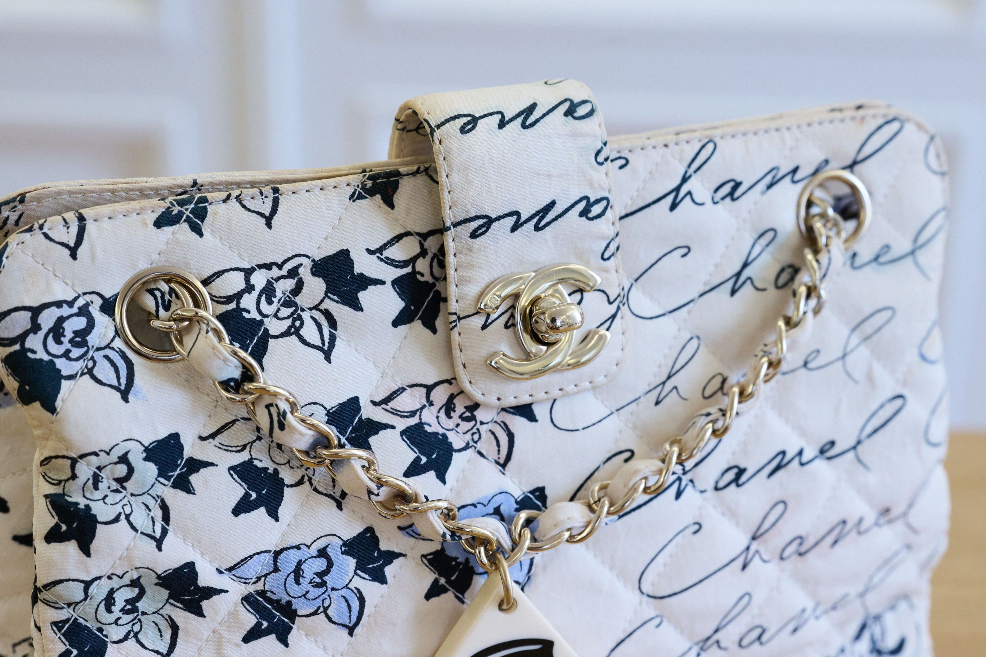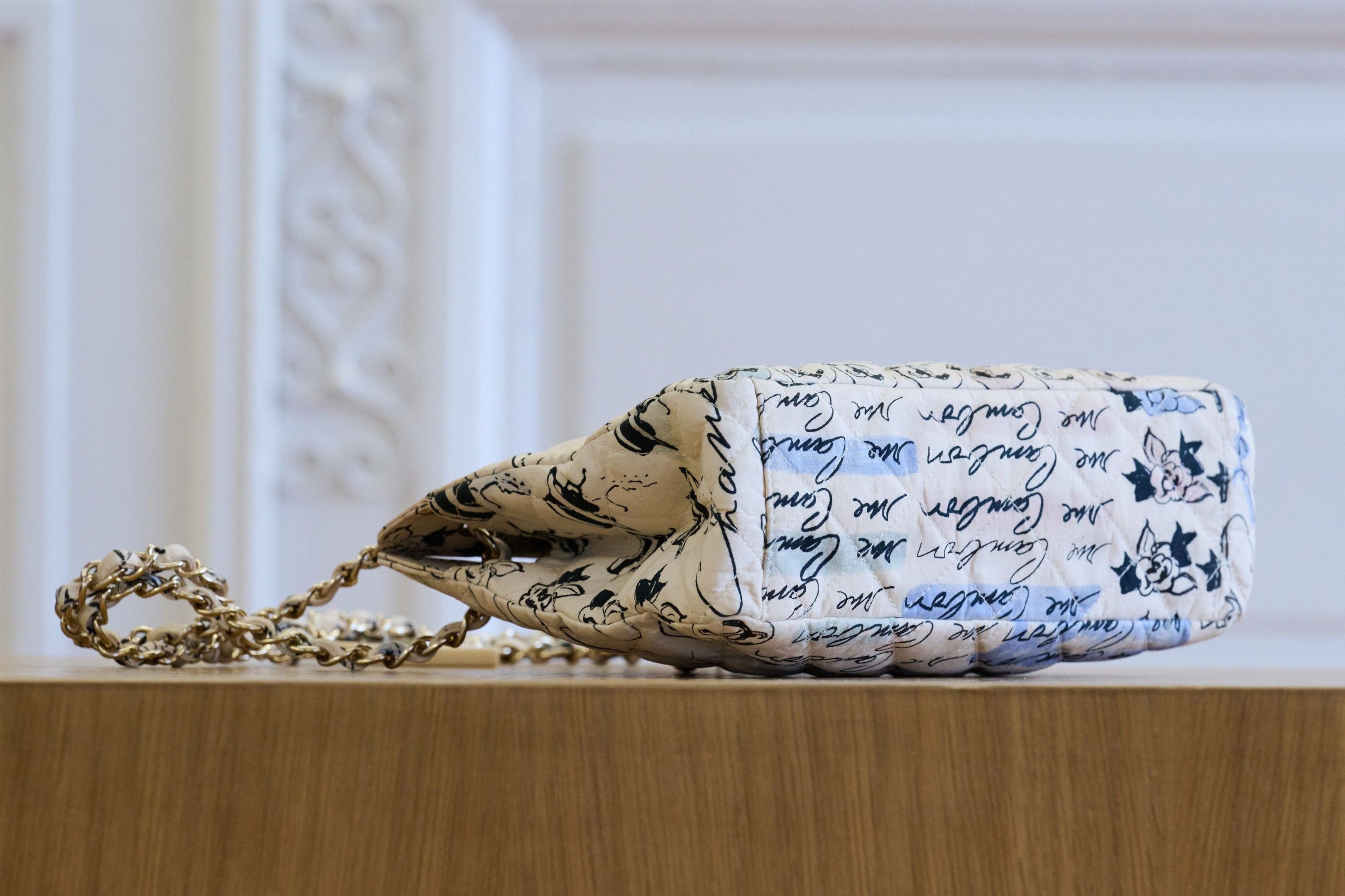 Quilted bag in off-white canvas printed with flowers, graffiti inscriptions Chanel, rue Cambon and double C, double handle embellished with a chain that can form a shoulder strap holding a bakelite tassel adorned with a small mirror.