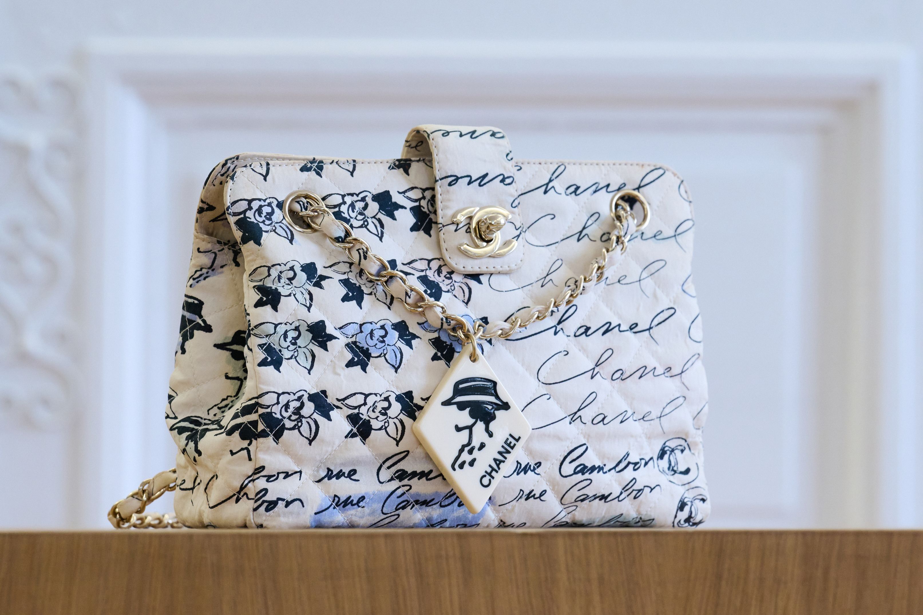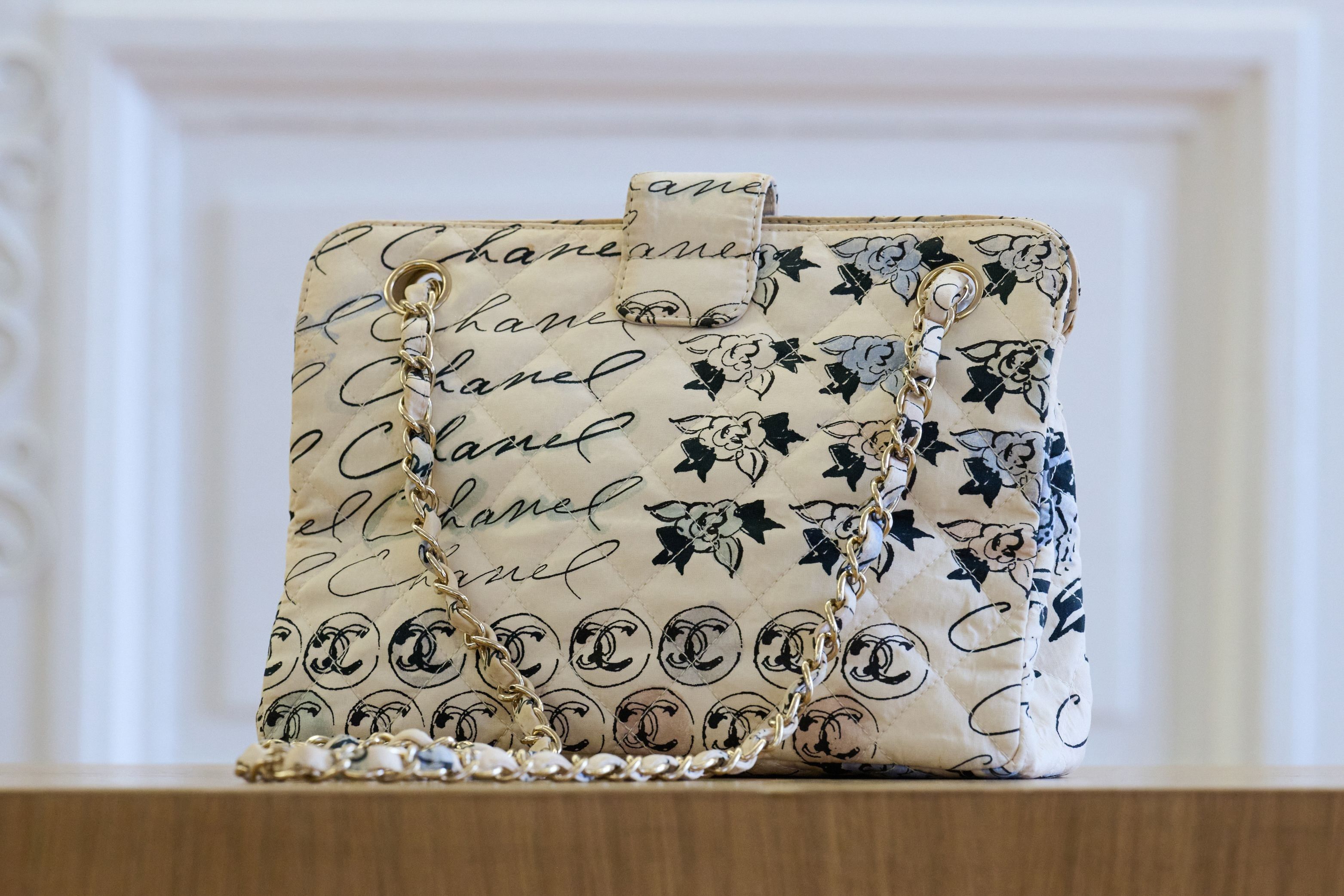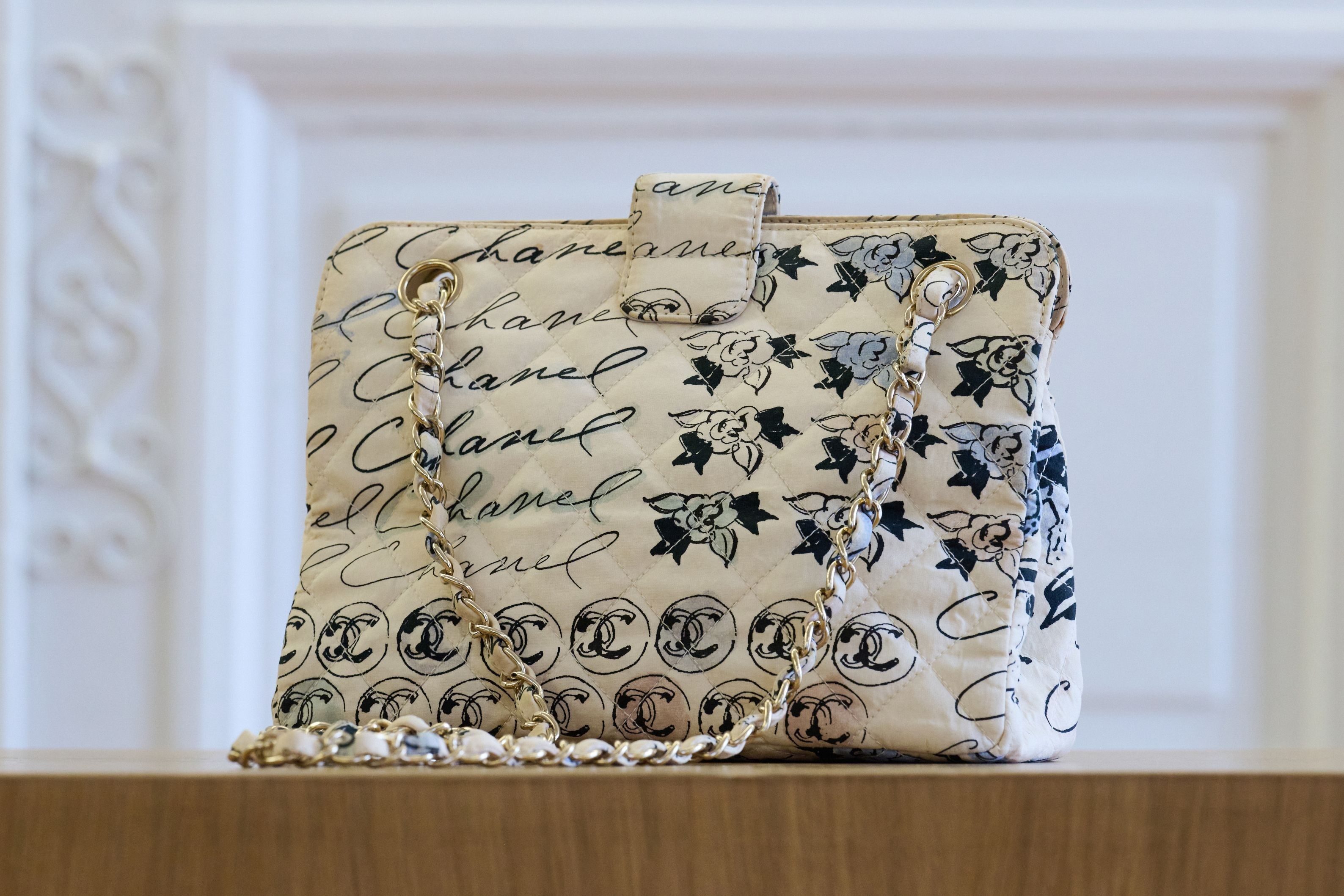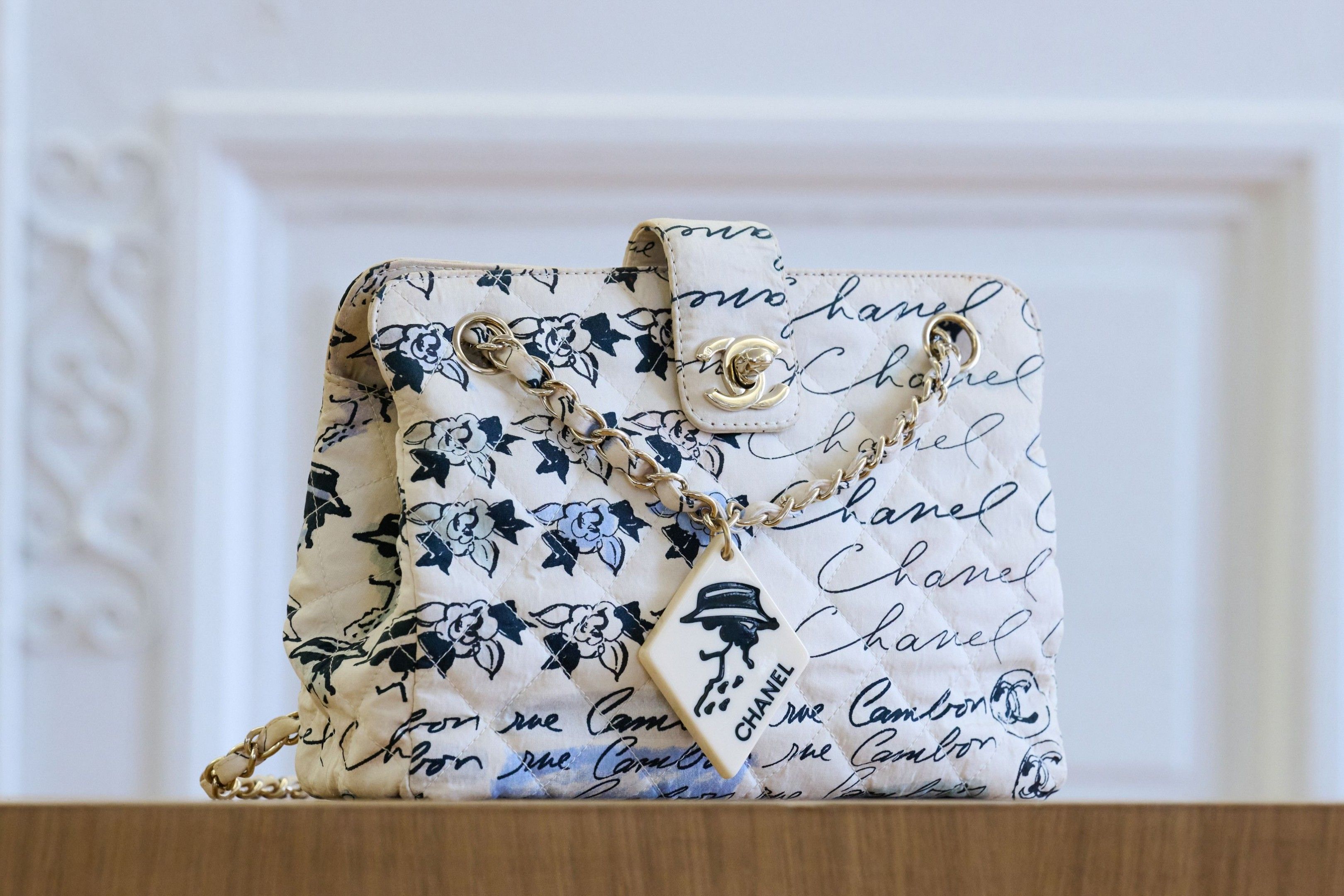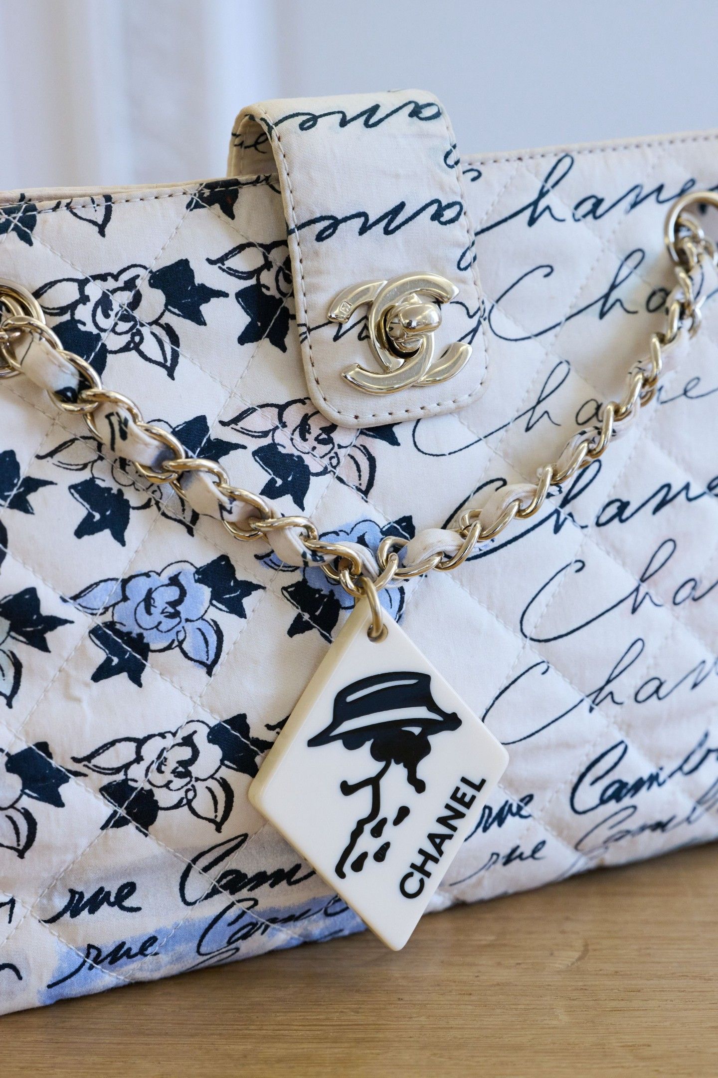 Quilted bag in off-white canvas printed with flowers, graffiti inscriptions Chanel, rue Cambon and double C, double handle embellished with a chain that can form a shoulder strap holding a bakelite tassel adorned with a small mirror.