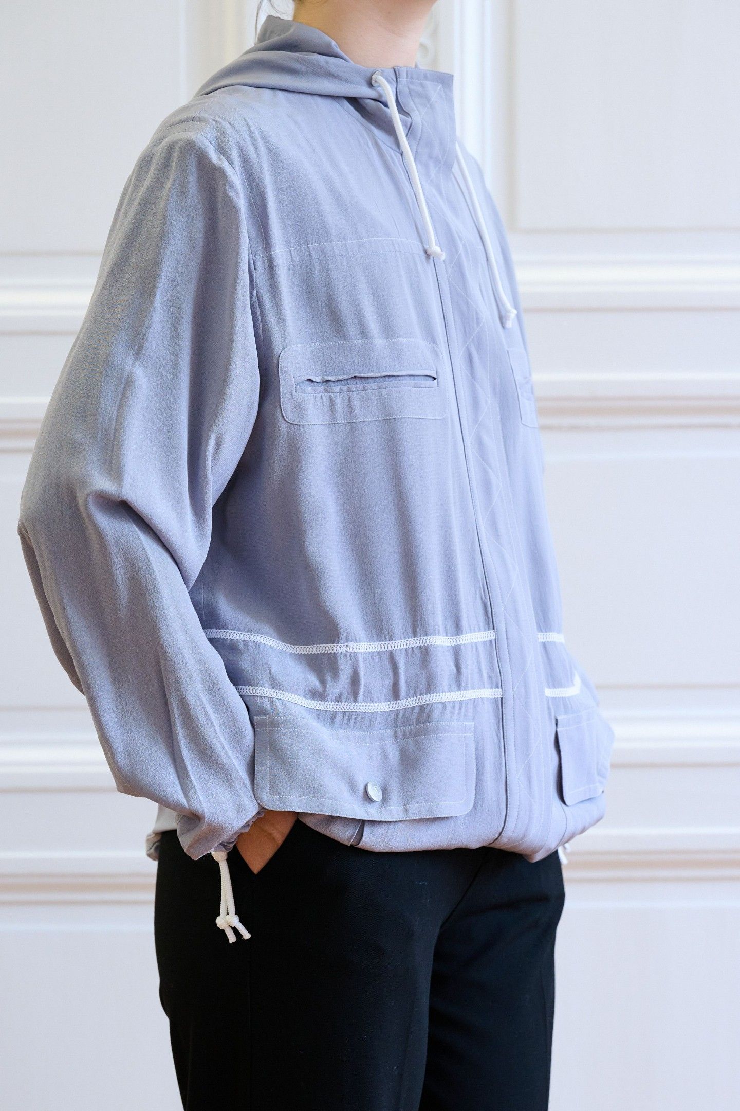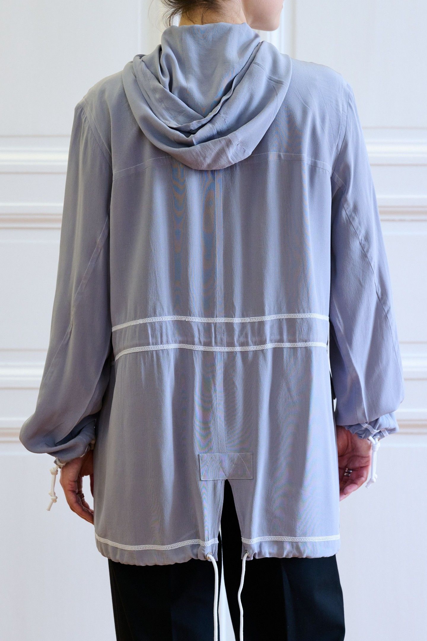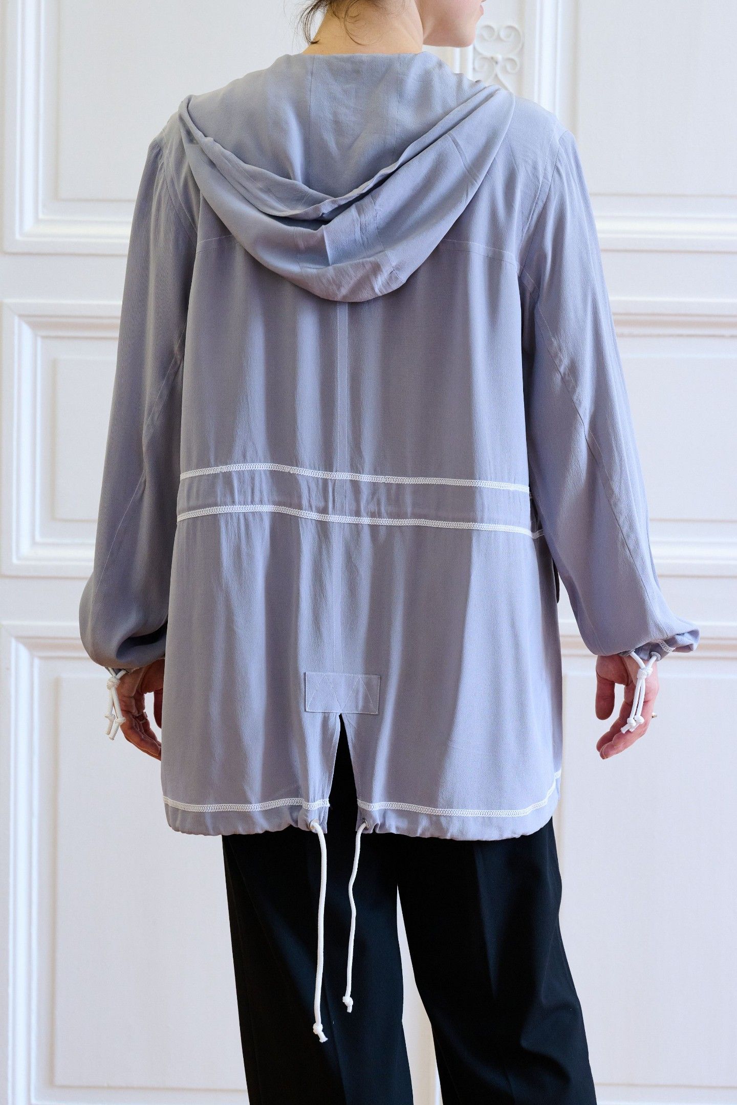 Grey-blue silk hooded zip jacket with white topstitching, four front pockets, drawstring waist, cuffs and hem.