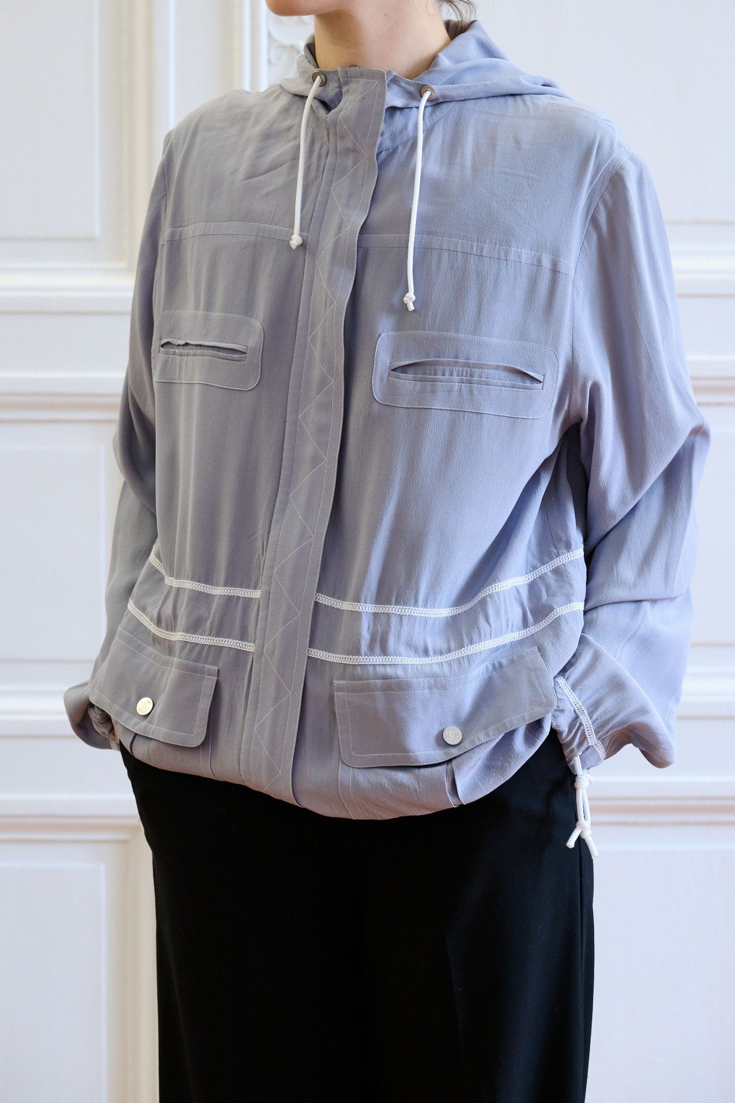 Premium CHANEL. Grey-blue silk hooded zip jacket with white topstitc…