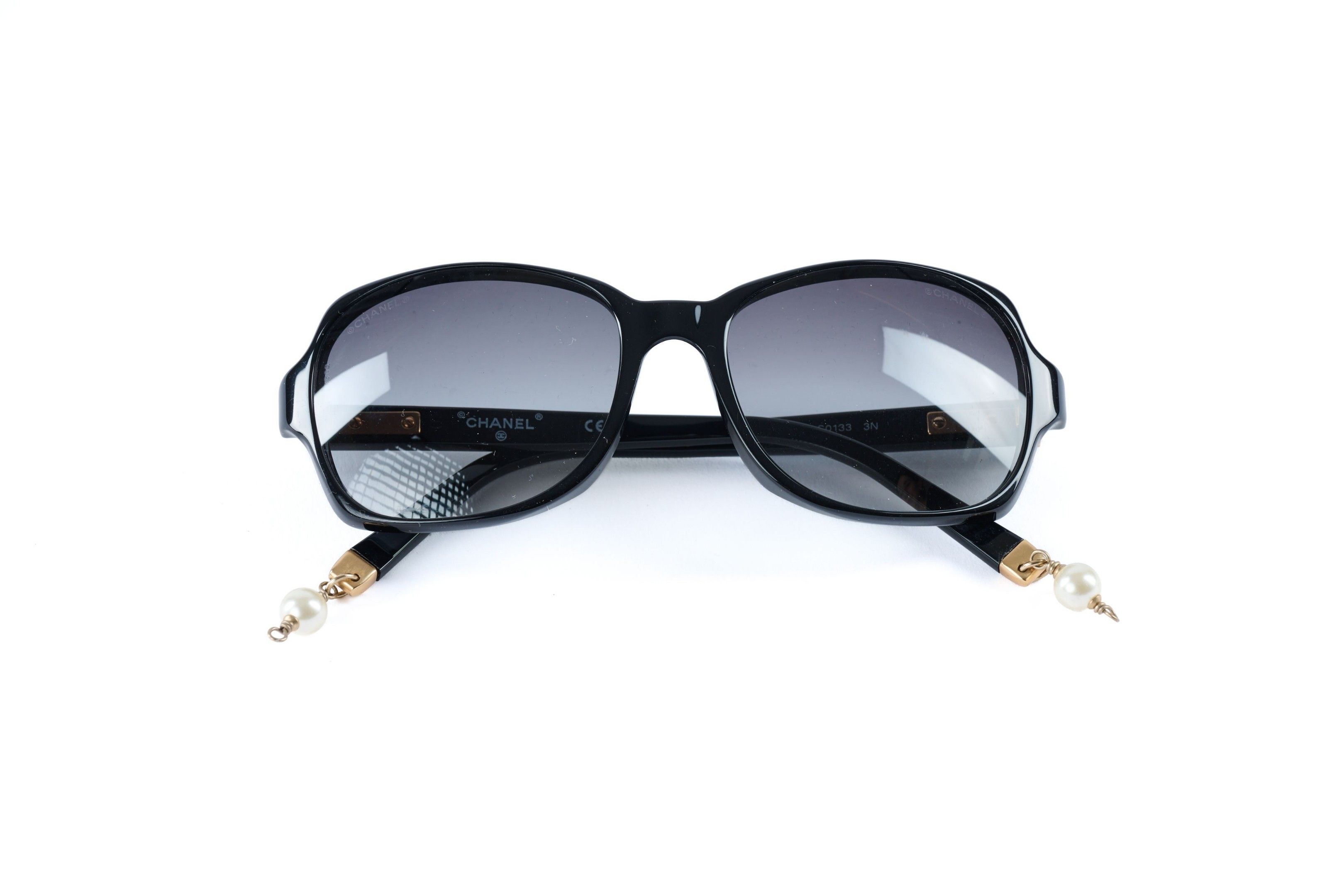 A set of CHANEL sunglasses including a stitched leather case and a pair of black acetate sunglasses with temples ending in imitation pearl pendants (missing and slightly worn).