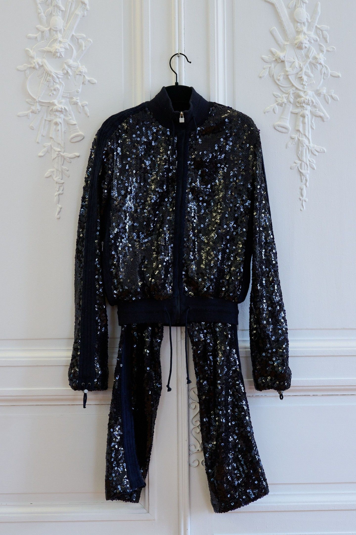Sporty outfit including jacket and trousers in midnight blue knitwear and terry cloth, entirely embroidered with sequins. The jacket has a slightly high collar, zip fastening and two zipped pockets on the sides, and can be tightened at the waist with a tie. The trousers have an elasticated waistband that can be tightened with a drawstring and two zipped pockets.