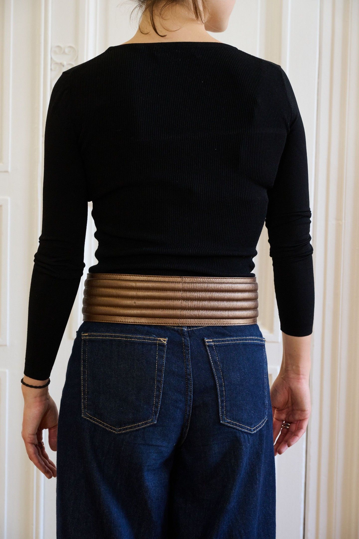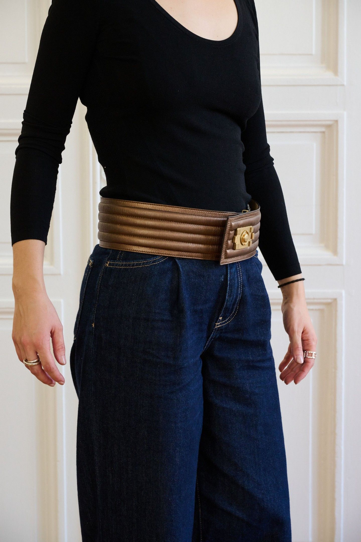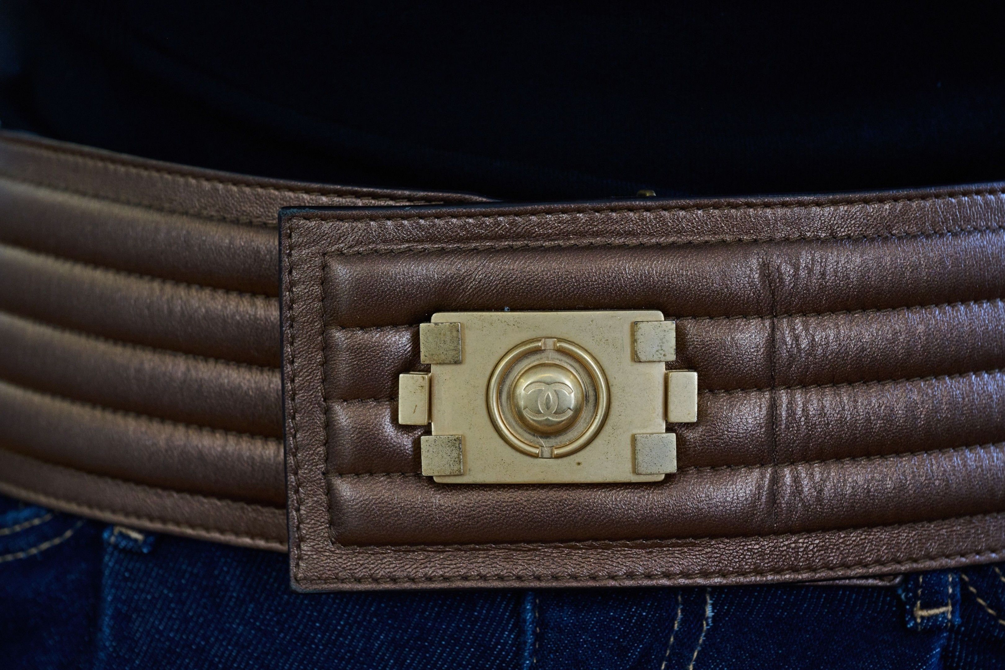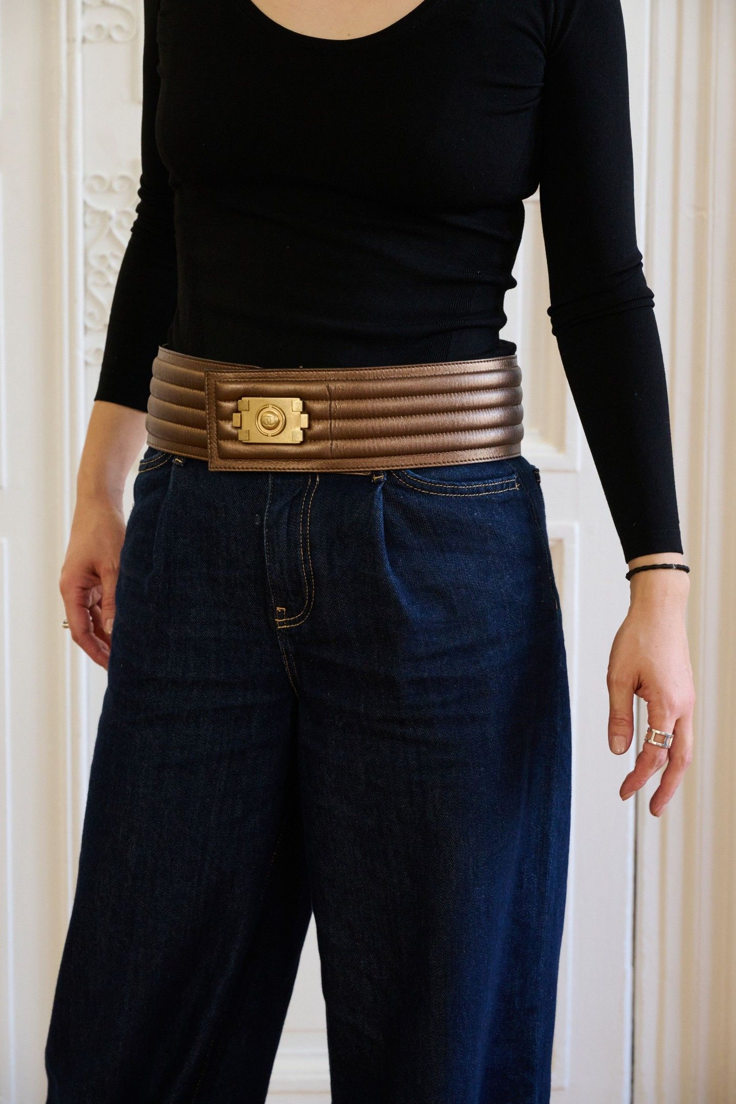 CHANEL. Wide belt in quilted gold-tone leather with gold-ton…