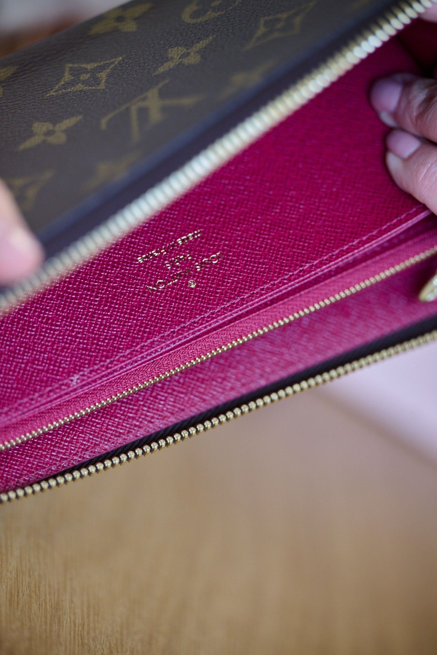 Companion wallet "Zippy" model in Monogram canvas, inside in fuchsia saffiano leather with multiple compartments including one with zip and twelve card slots.
