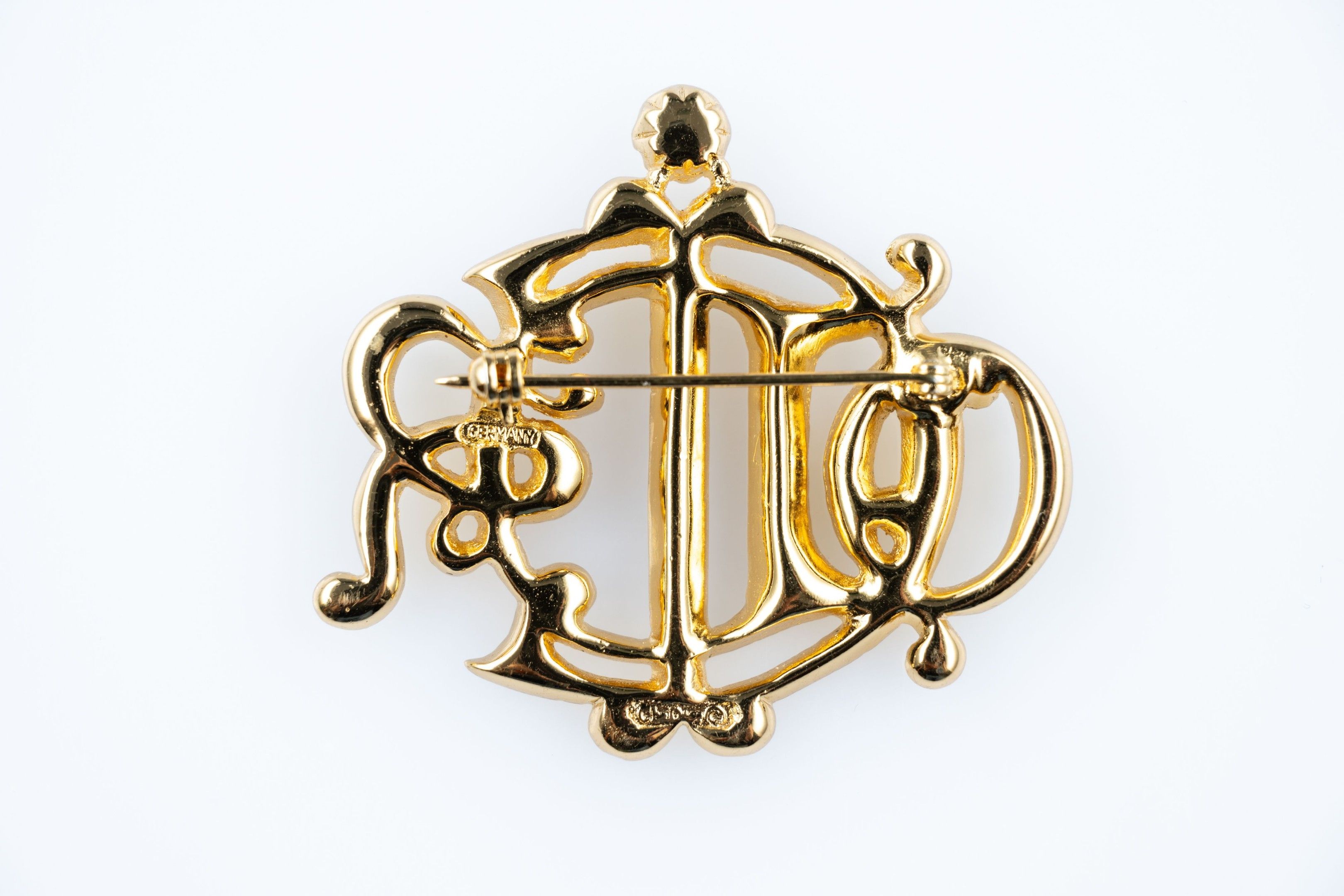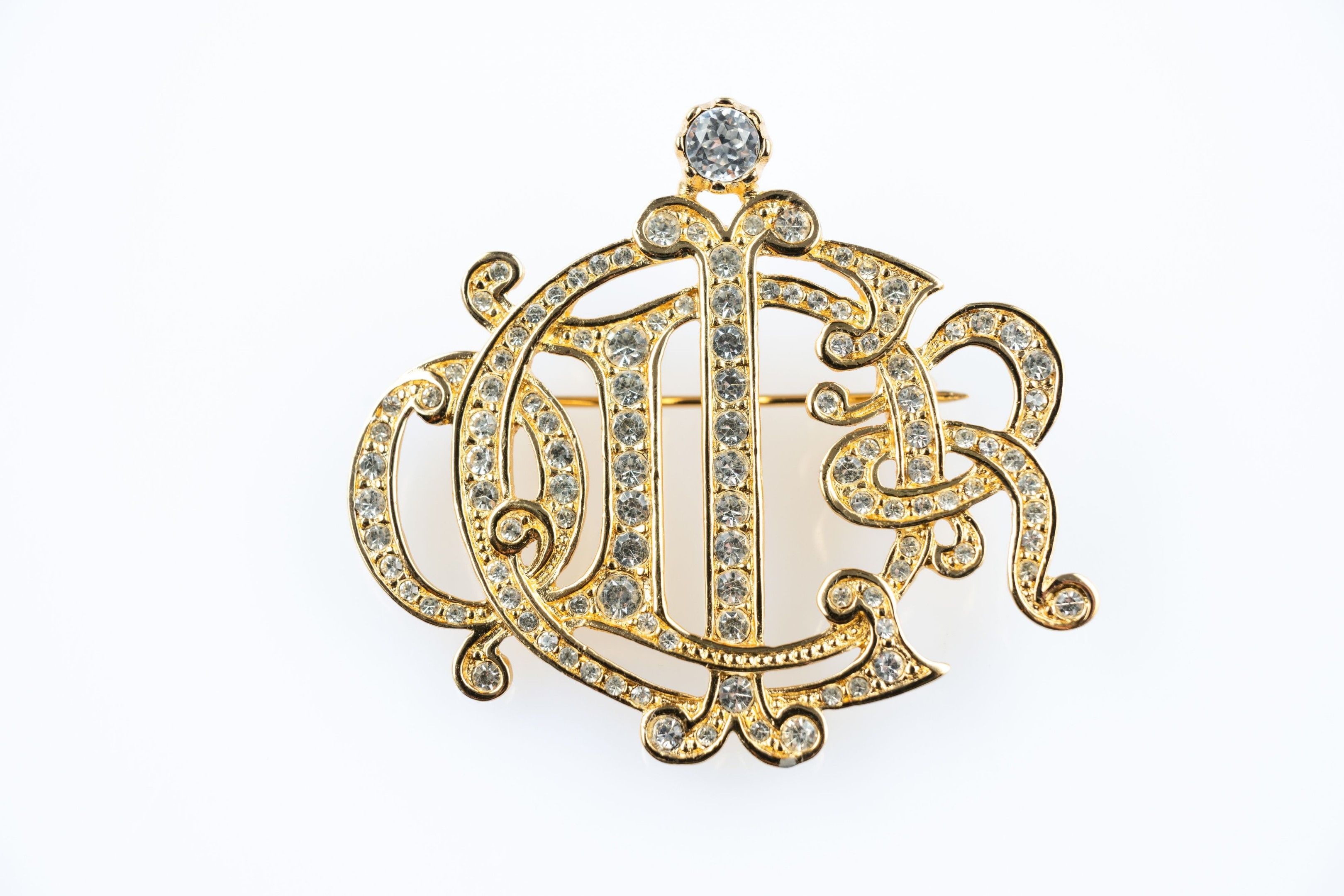 DIOR. Monogrammed gilt metal brooch paved with small rhinest…
