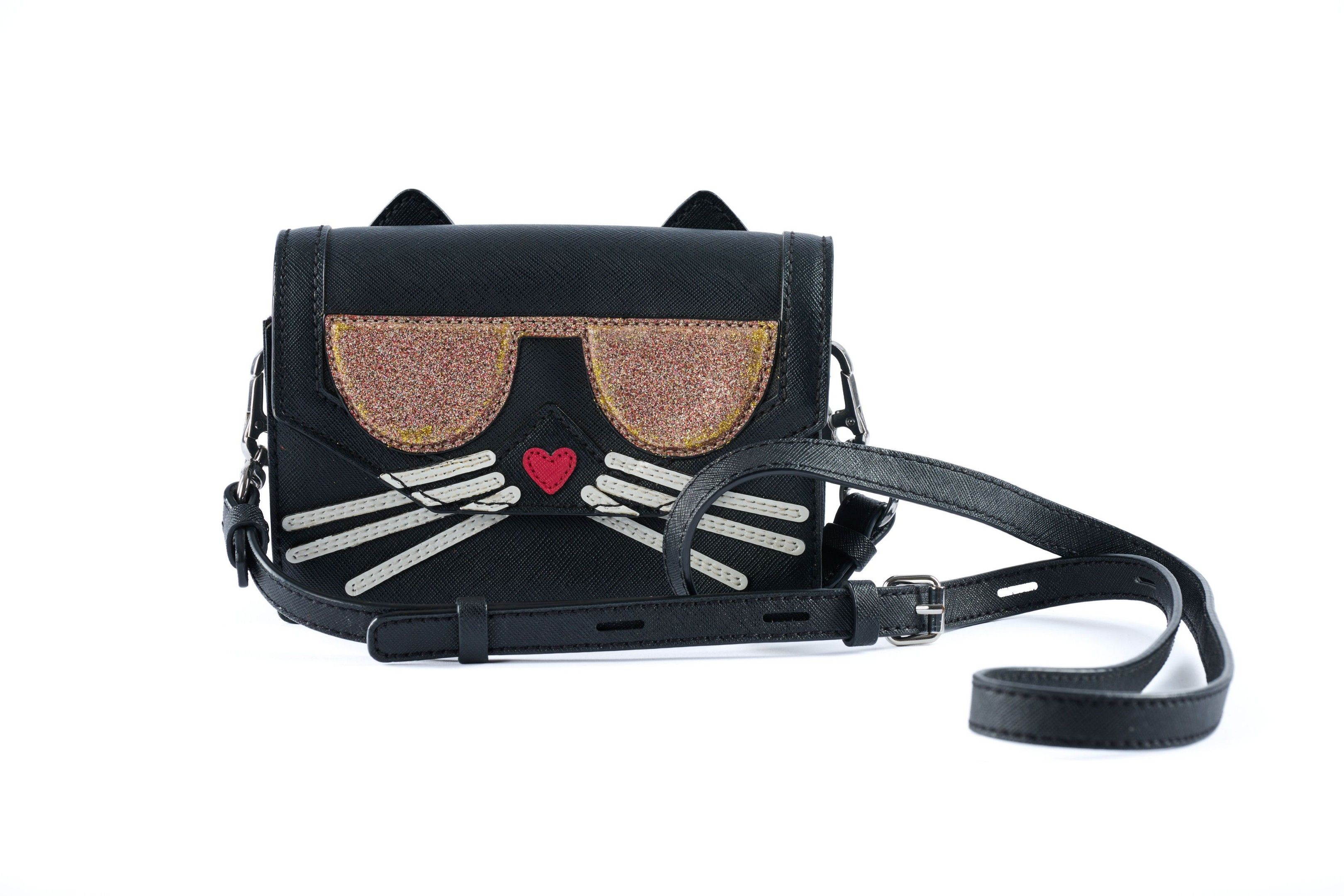 Black saffiano leather and imitation leather shoulder bag featuring a cat wearing sequined sunglasses.