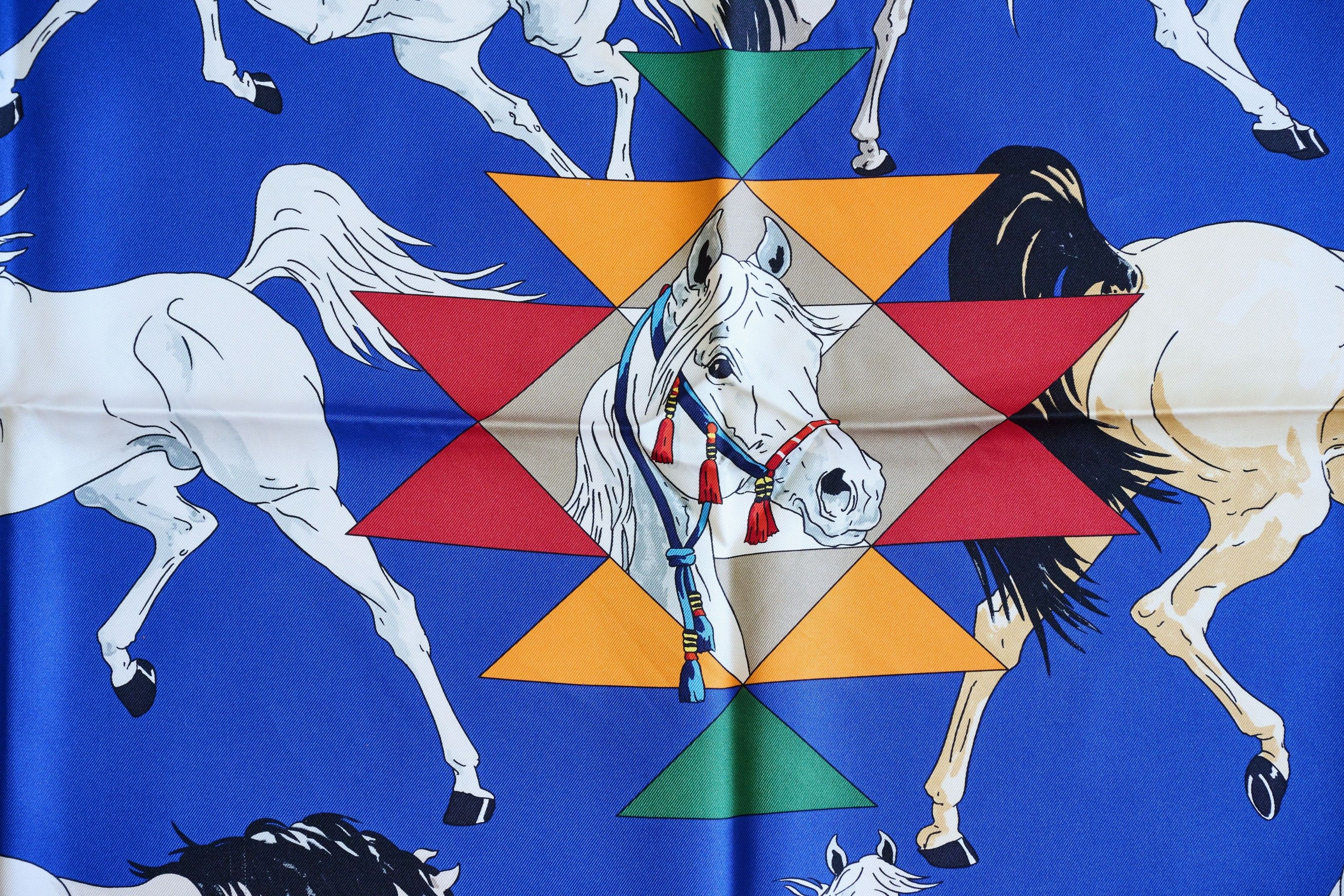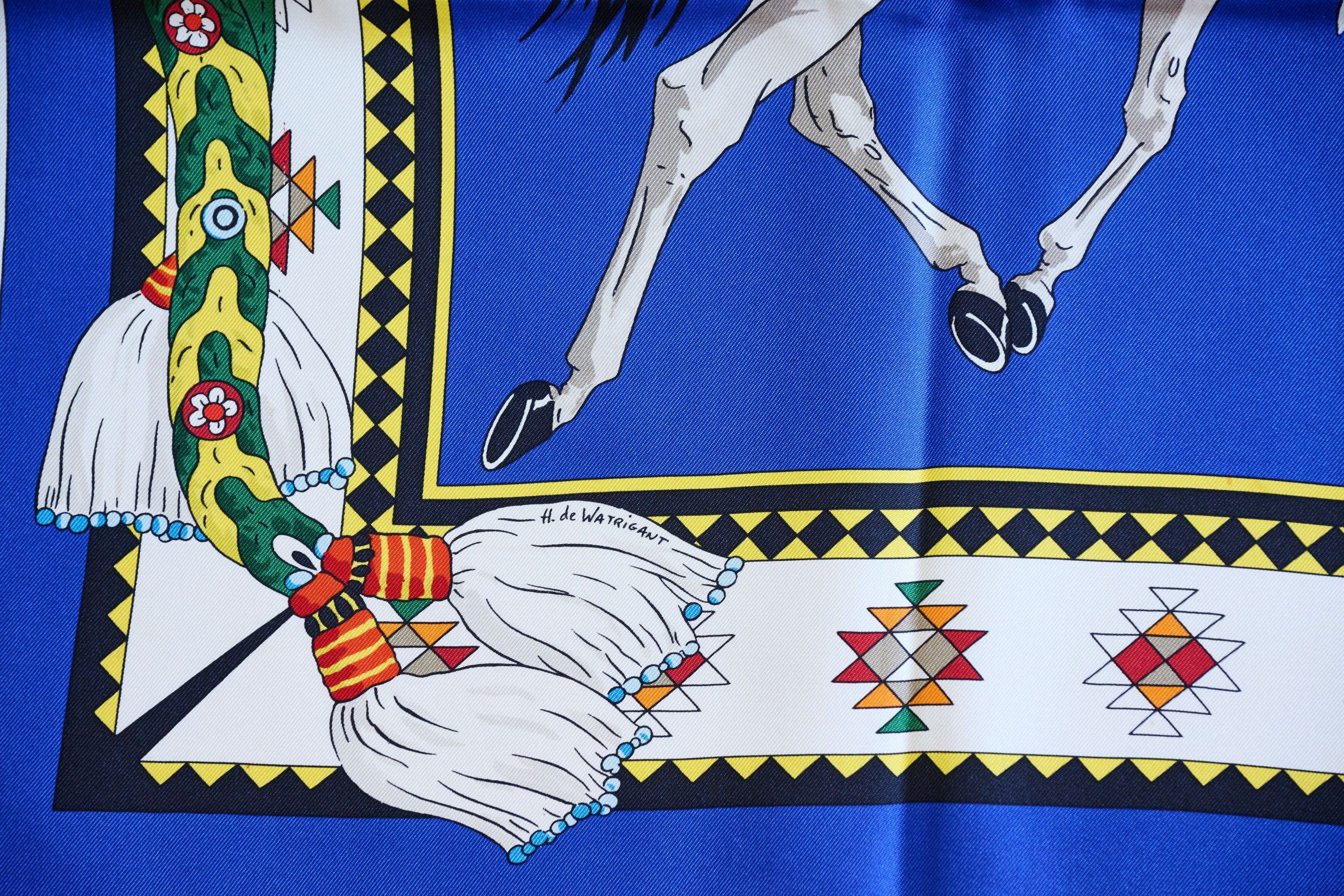 Silk square model "Les chevaux Qataris" decorated in blue and orange tones, signed Henri de Watrigant.