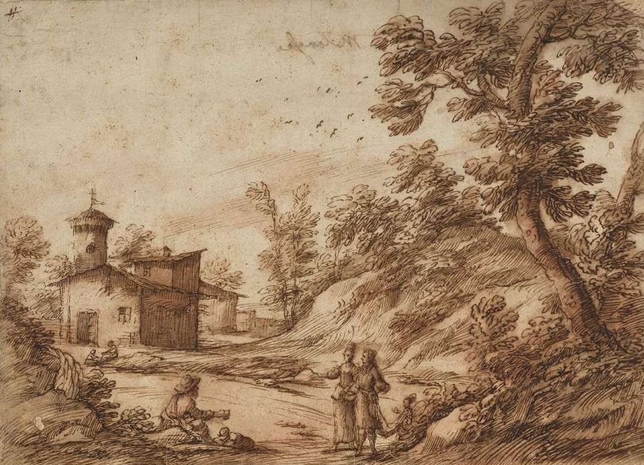 Pier Francesco CITTADINI, known as Le MilanaiS Milan, 1613 - 1681, Bologna Animated landscape Pen and brown ink, brown wash and red chalk wash 19.8 x 27.8 cm - 7 13/16 x 10 15/16 in. (Drawing lined, tears at edges, insolate, stains and small hole lower left) Animated landscape, Pen and brown ink, brown wash and red wash Upper left lettered H, annotated on verso, ink showing through Milanese ? PROVENANCE Private collection.