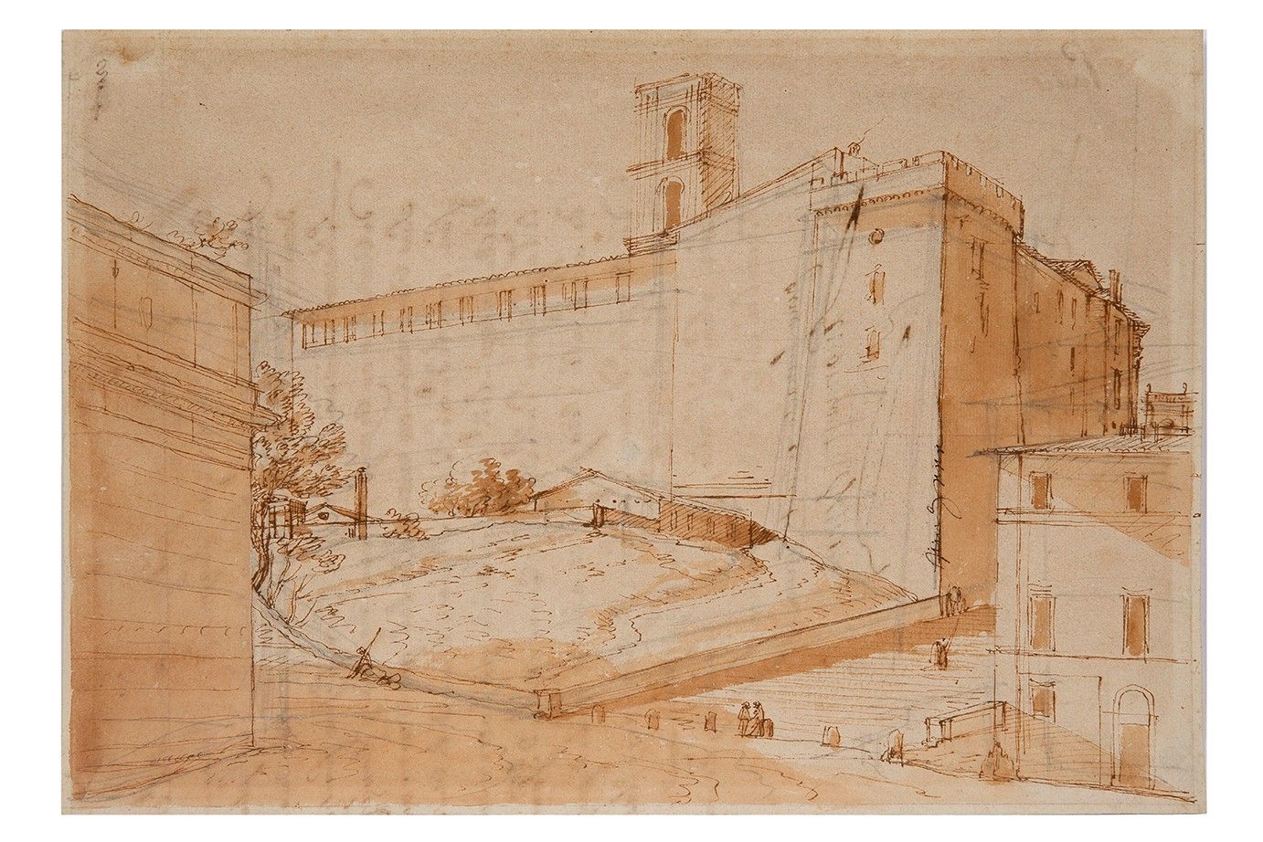 Lively view of the Capitol, pen, brown ink, red chalk wash over black pencil, handwritten text on the reverse